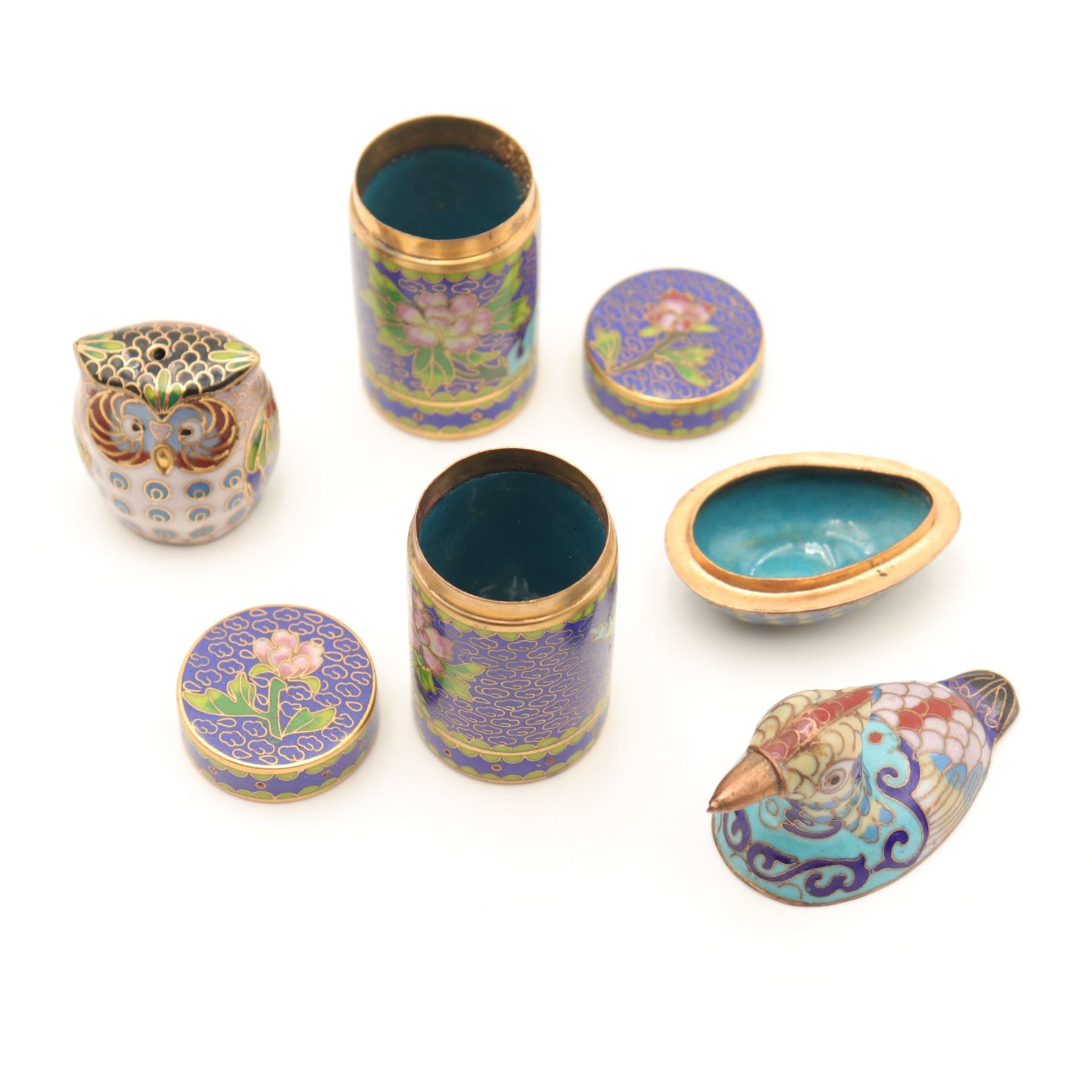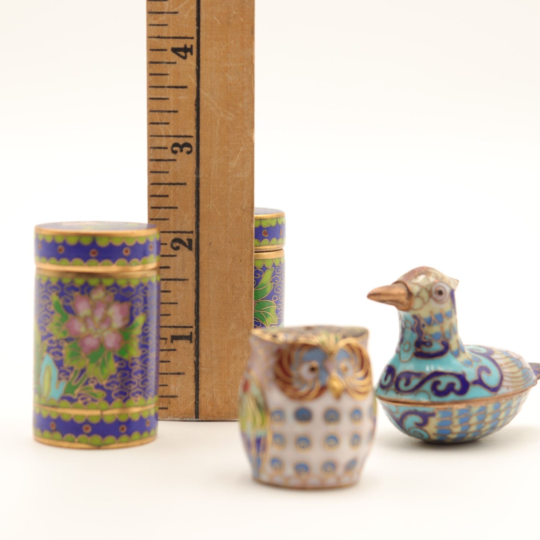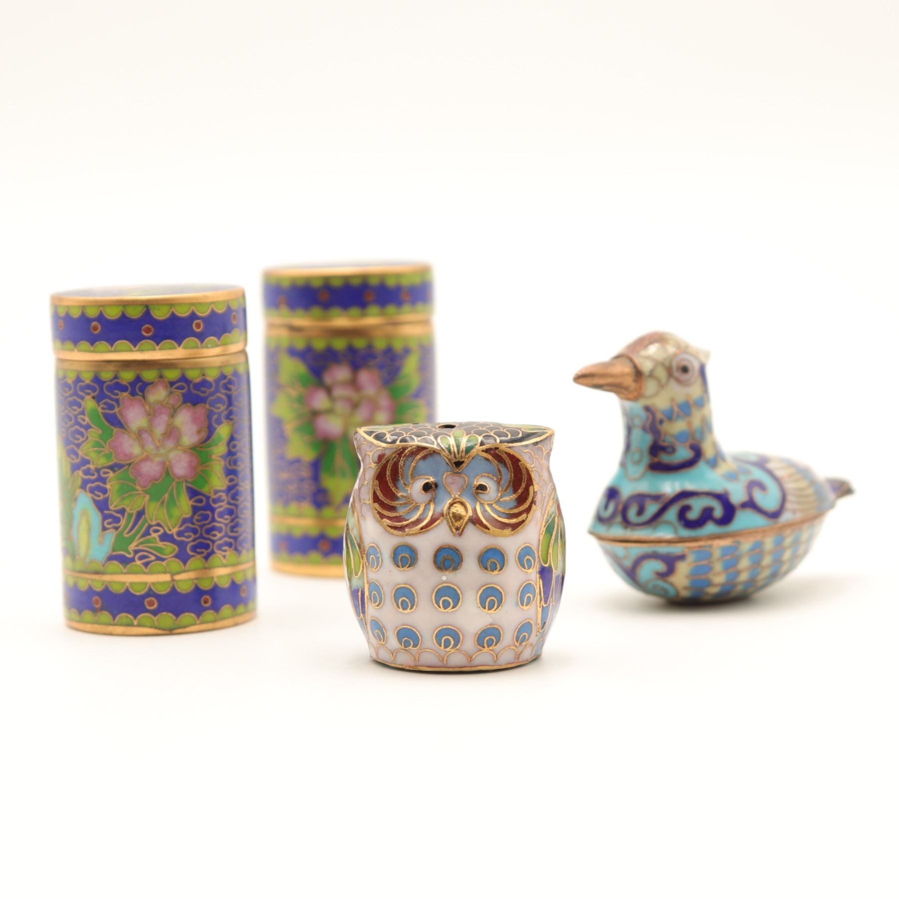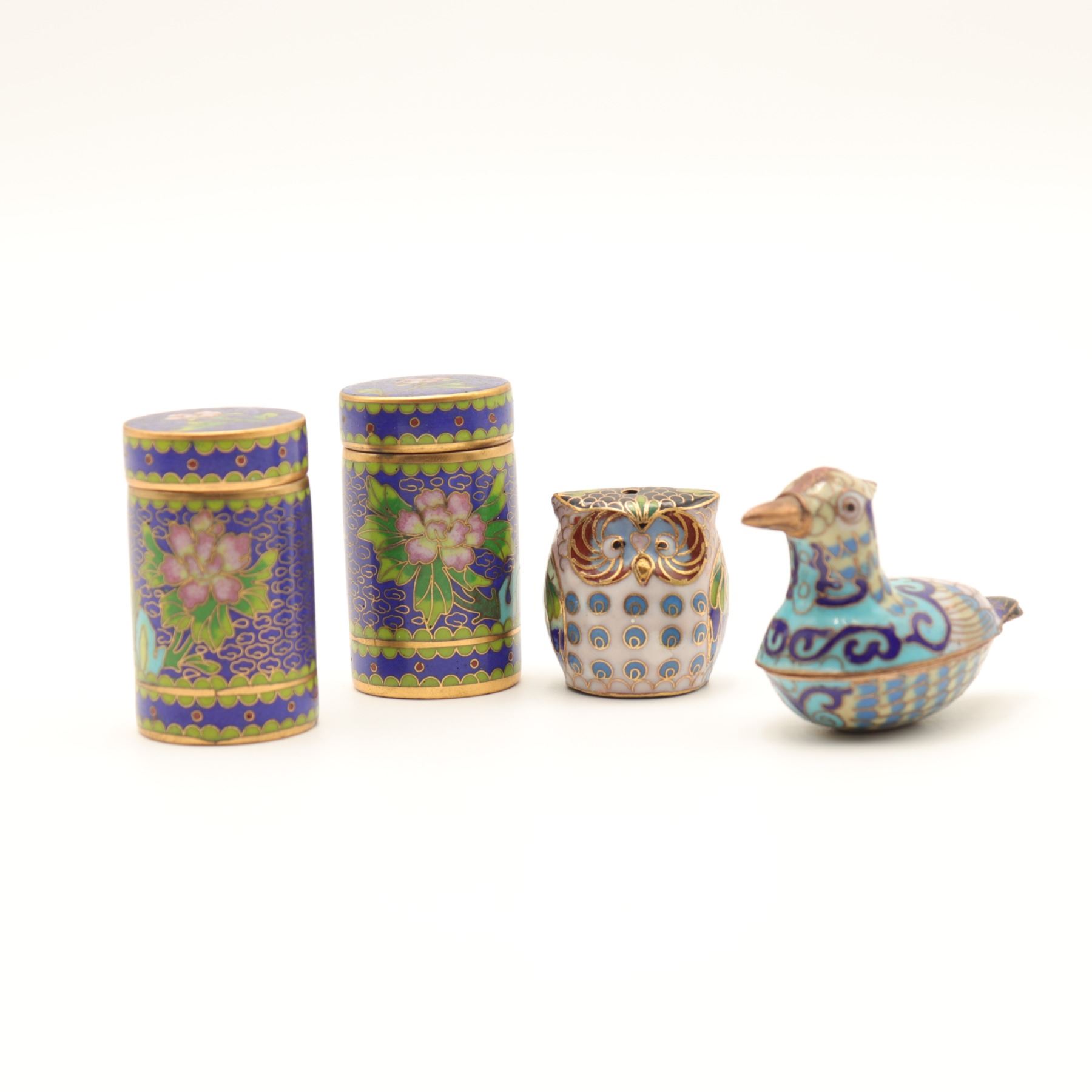 Group of four Chinese cloisonné on copper miniature covered containers, comprising a matching pair of cylindrical lidded canisters decorated with lotus and scrolling clouds on a deep blue ground, together with a small owl-form box and a bird-form box, each with lift-off cover. All with turquoise enamel interiors, fine wirework outlines and bright polychrome enamels in shades of blue, green, pink, yellow and white. The pair of canisters and the bird box likely mid- to late 20th century export pieces; the owl box slightly later but of similar quality. Condition: overall very good, with light surface wear and minor enamel pitting; one or two tiny flea-bite losses to enamel at rims and high points; interiors clean. Heights from approx. 1 3/8 in. (smallest) to 3 3/4 in. (tallest).