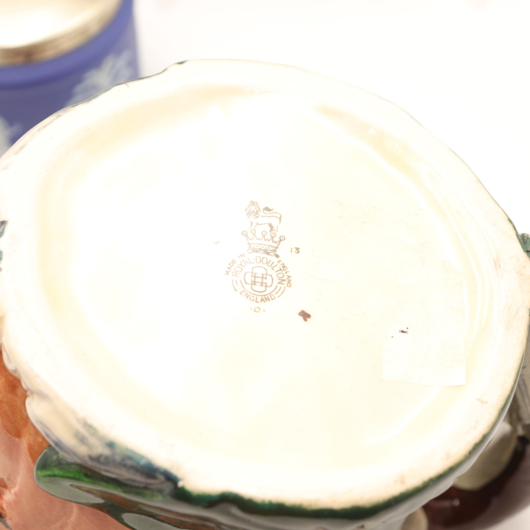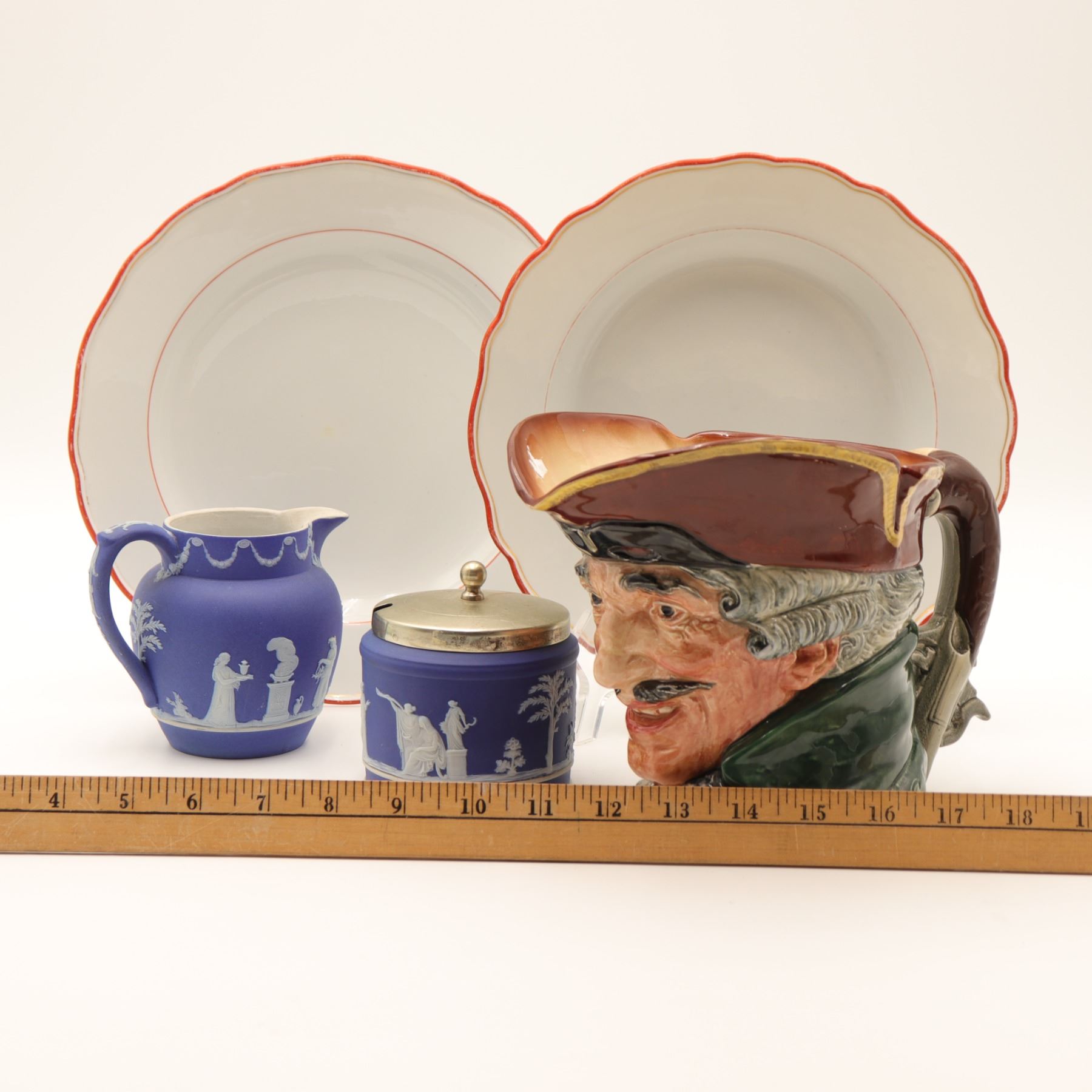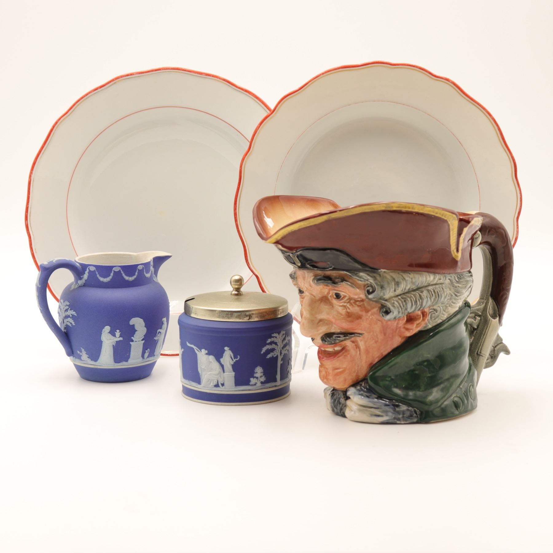 Assorted group of 20th-century European ceramics comprising: a Royal Doulton character jug modelled as a jovial gentleman in tricorn hat, titled to the side “DICK TURPIN,” brightly enamelled in polychrome glazes and marked beneath with printed Royal Doulton lion-and-crown backstamp, “Made in England”; a pair of Meissen porcelain plates with gently lobed rims, each decorated simply with an orange-red line to the rim and inner well and bearing underglaze blue crossed-swords mark; together with two blue jasperware-style pieces, including a small jug and a cylindrical pot with metal cover, each applied in white relief with classical figures and foliate borders, in the manner of Wedgwood.
