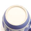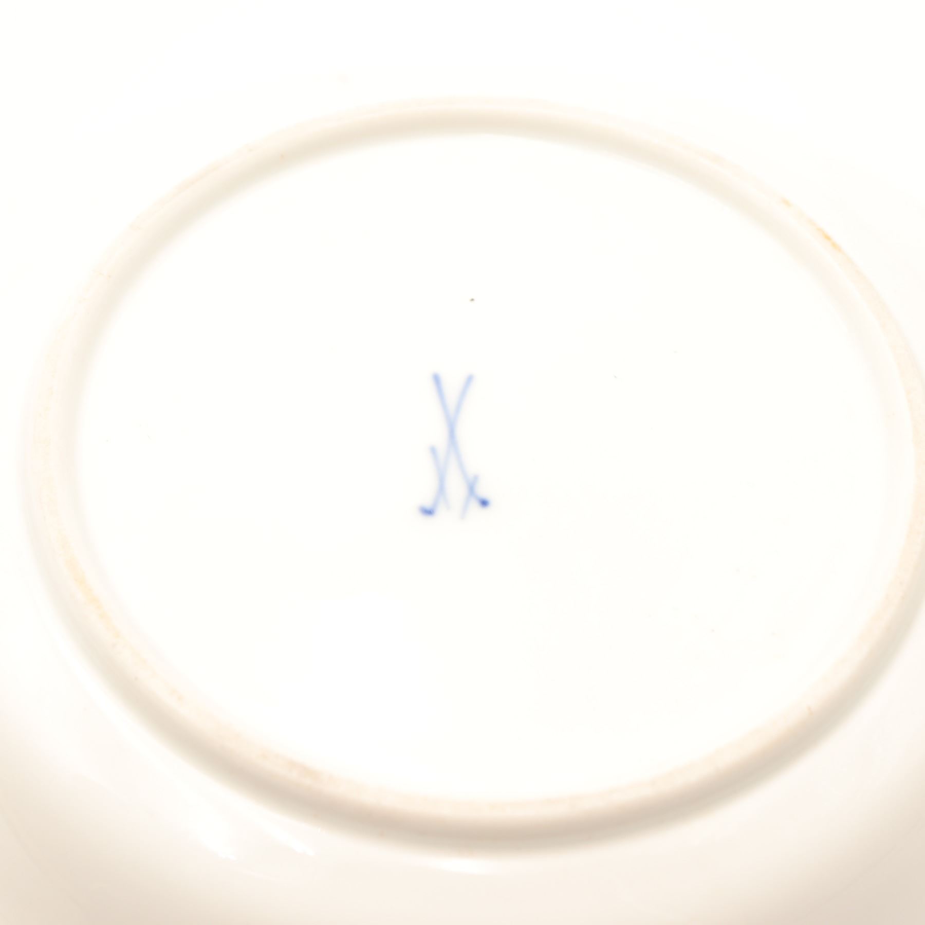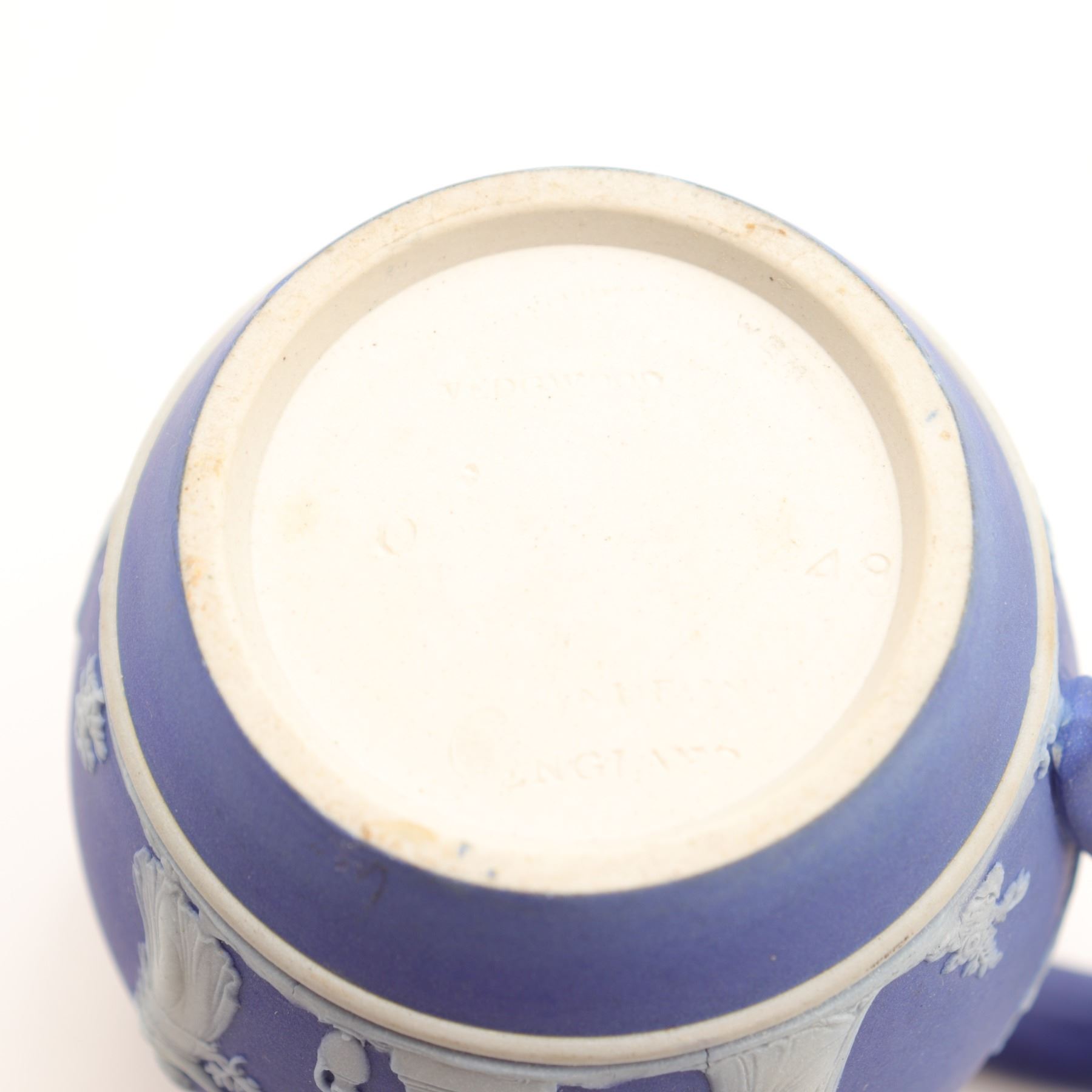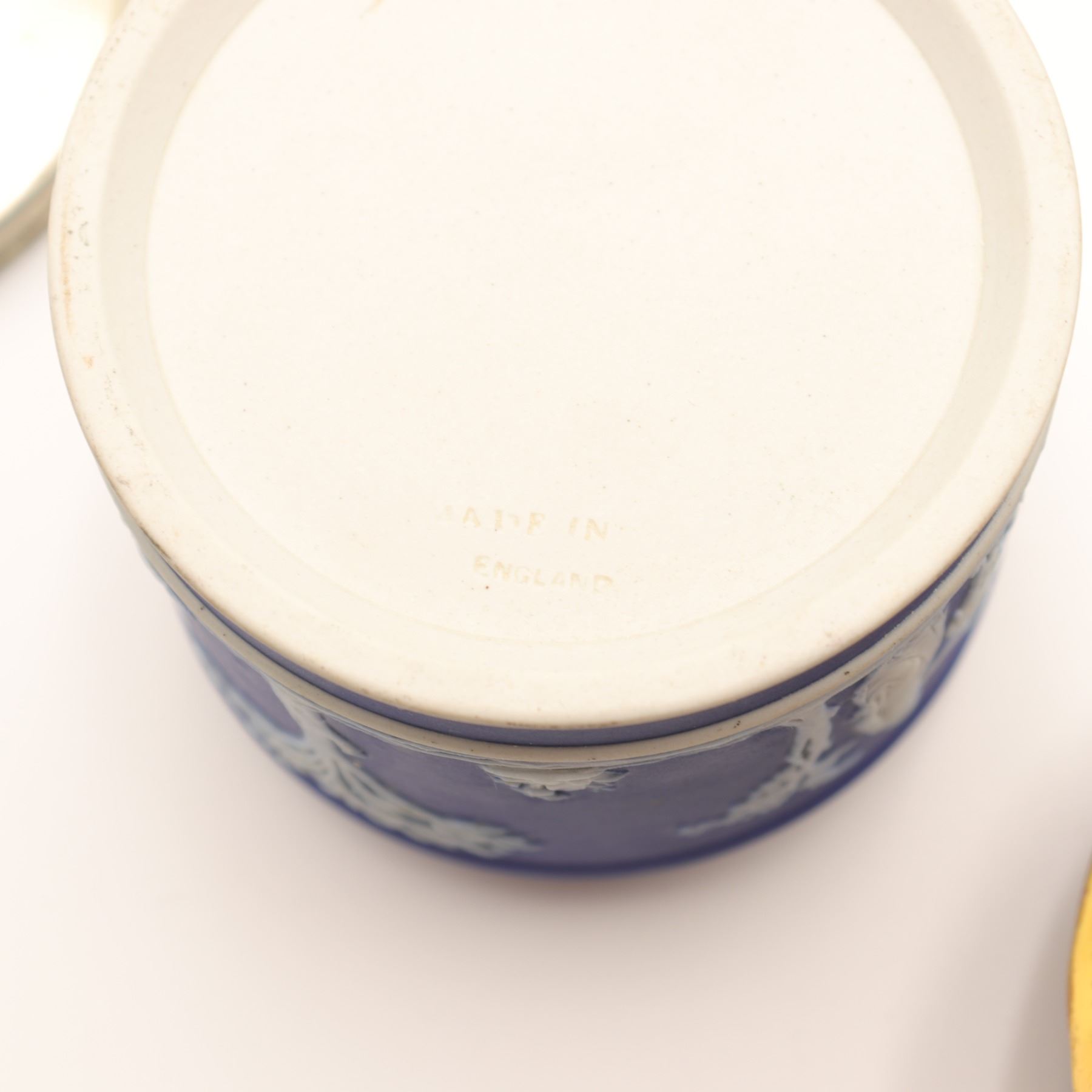 Assorted group of 20th-century European ceramics comprising: a Royal Doulton character jug modelled as a jovial gentleman in tricorn hat, titled to the side “DICK TURPIN,” brightly enamelled in polychrome glazes and marked beneath with printed Royal Doulton lion-and-crown backstamp, “Made in England”; a pair of Meissen porcelain plates with gently lobed rims, each decorated simply with an orange-red line to the rim and inner well and bearing underglaze blue crossed-swords mark; together with two blue jasperware-style pieces, including a small jug and a cylindrical pot with metal cover, each applied in white relief with classical figures and foliate borders, in the manner of Wedgwood.