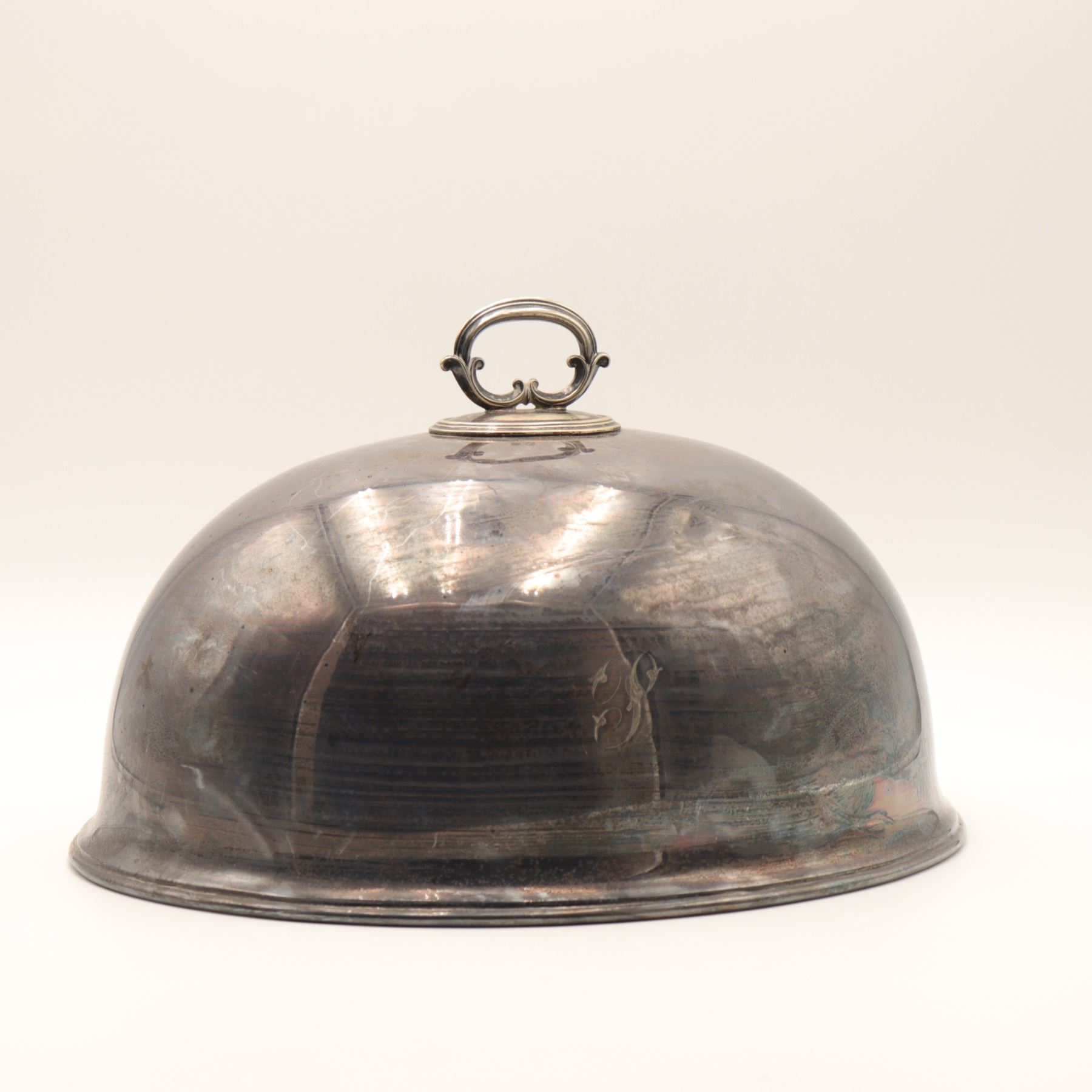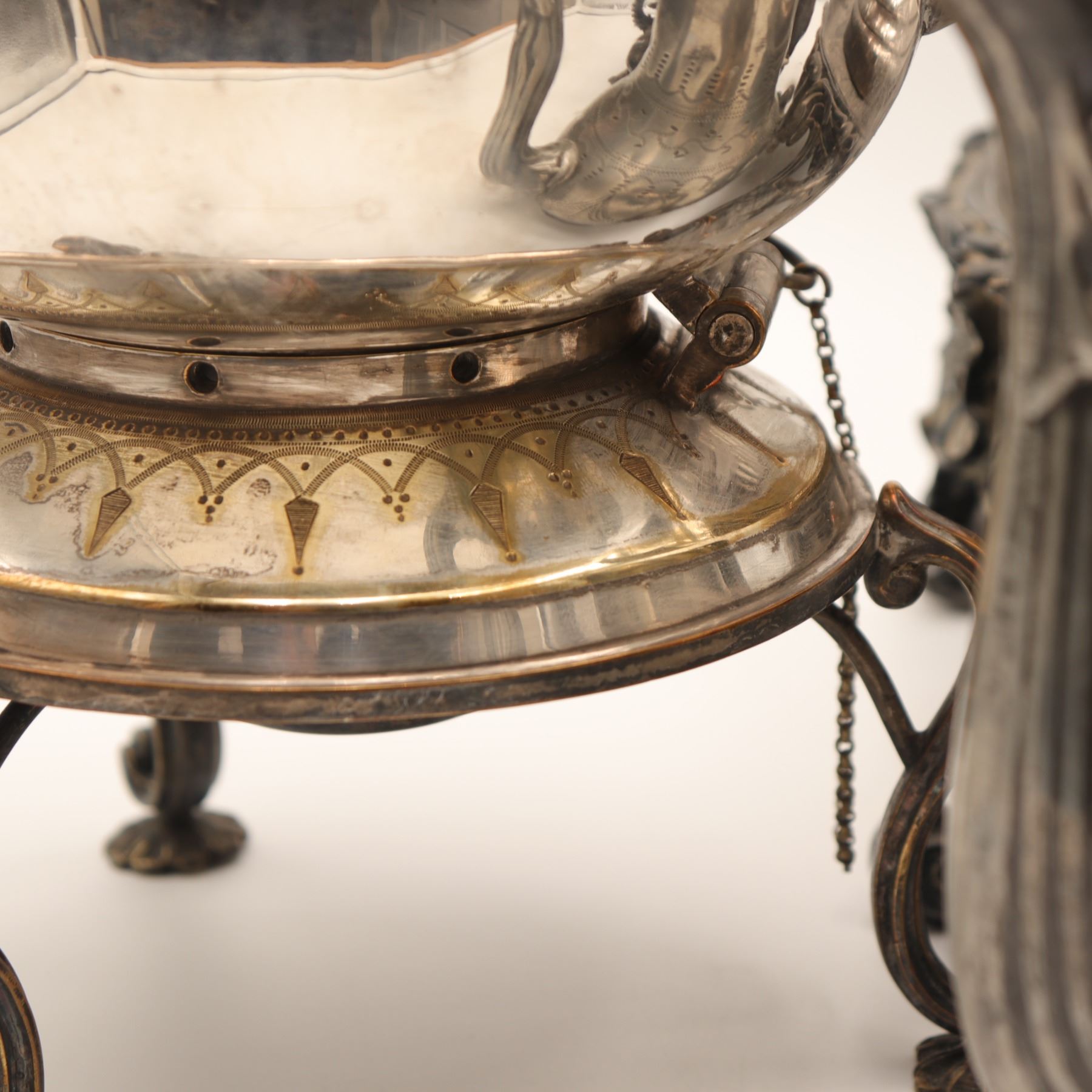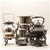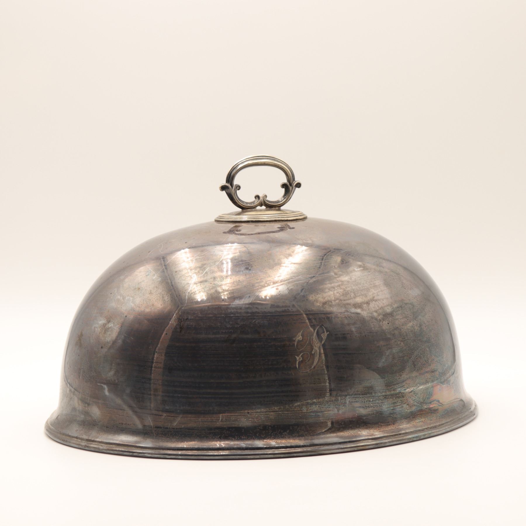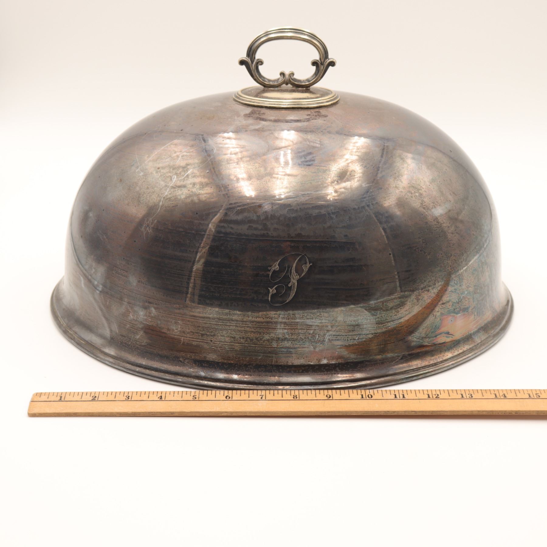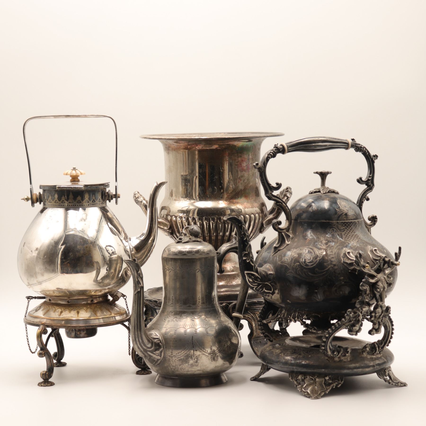 A mixed collection of silver-plated table and serving wares, comprising: a large Victorian/Edwardian champagne bucket with lobed lower body; a rounded kettle-on-stand with burner; an ornate Rococo Revival teapot on cast stand with warmer (one side of stand broken, requiring repair); a tall engraved hot-water jug; a small tripod burner base; and a substantial Victorian meat dome engraved with the initial “J.” Executed in various English and American silverplate traditions between c. 1880 and 1915. A substantial group suitable for restoration or decorative display.