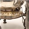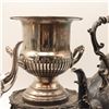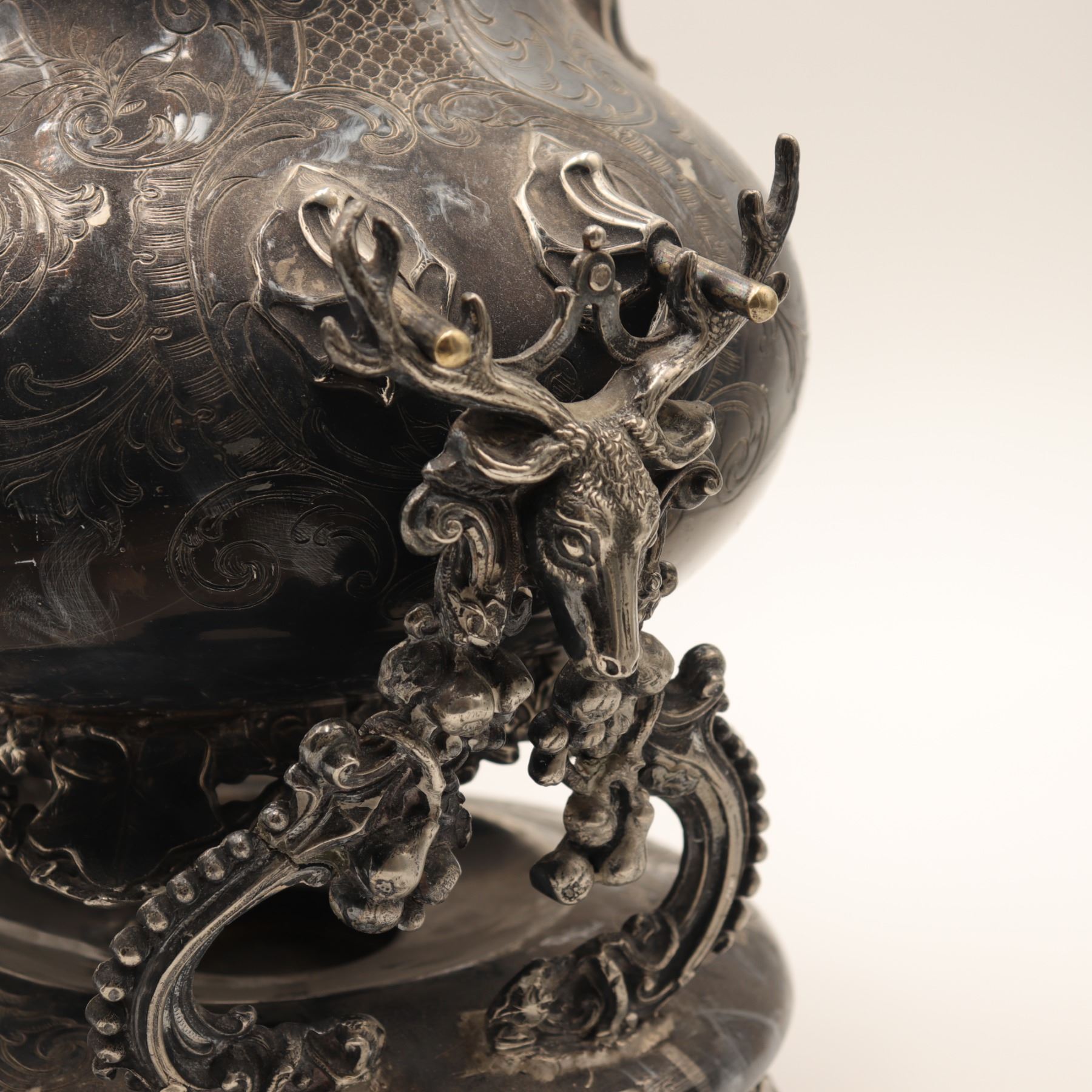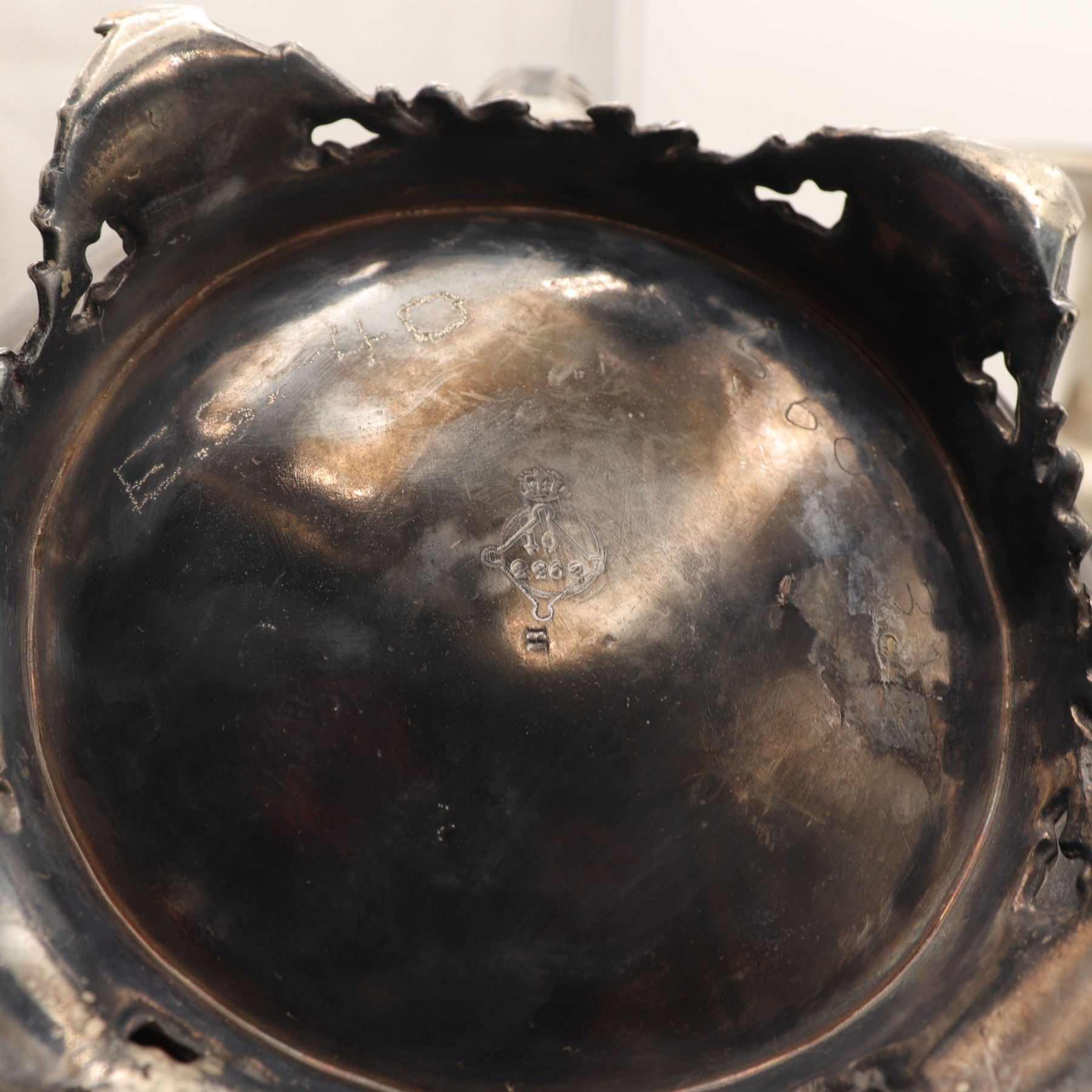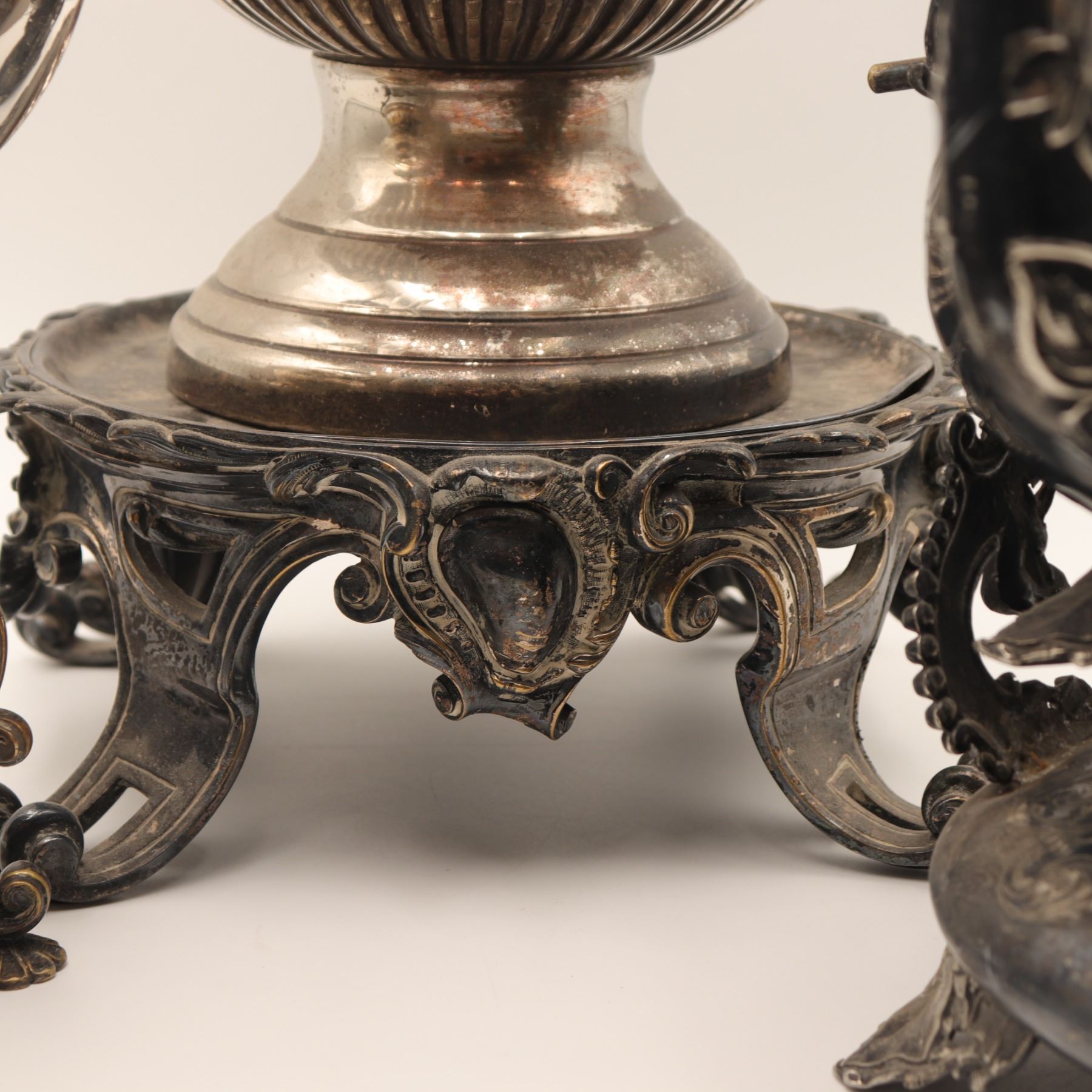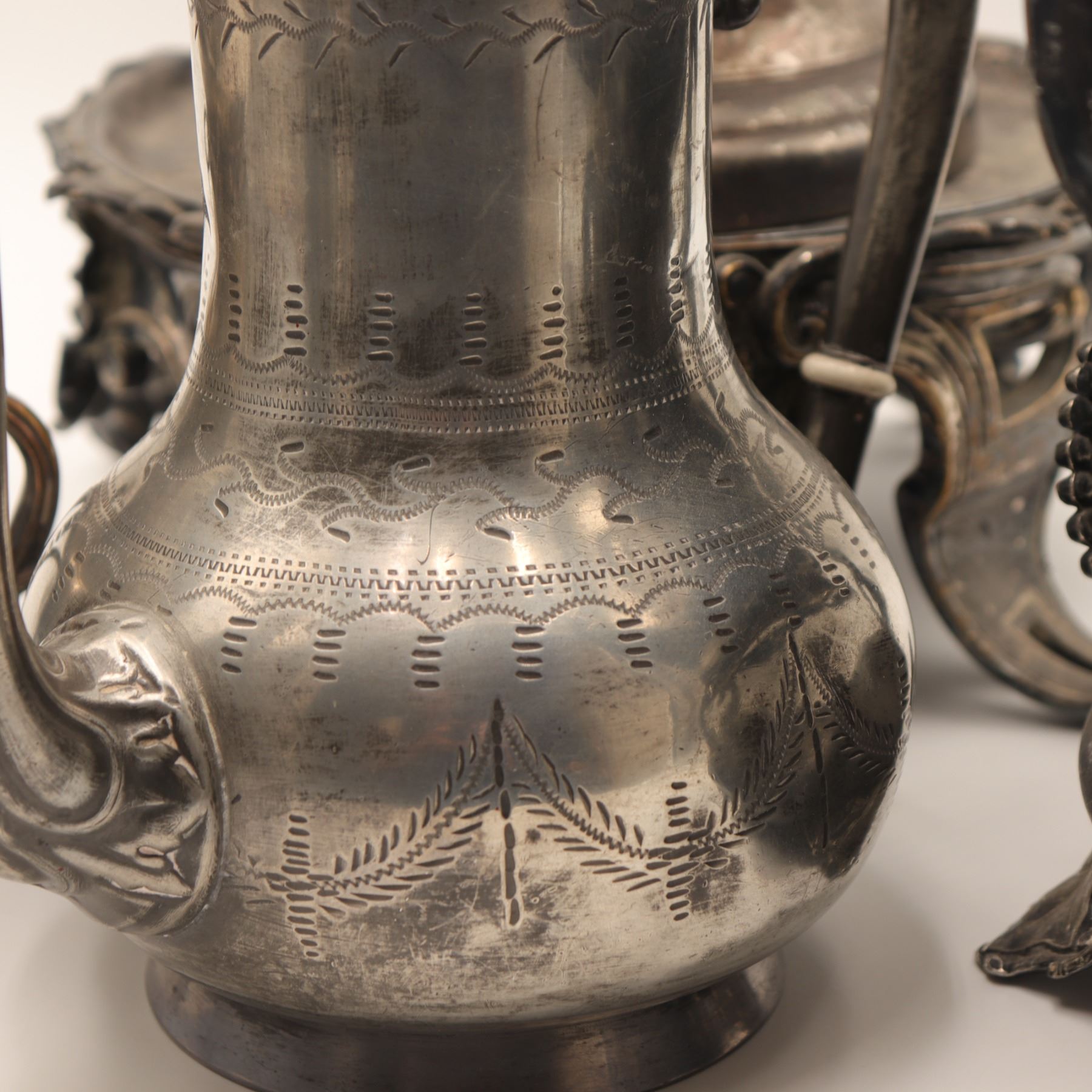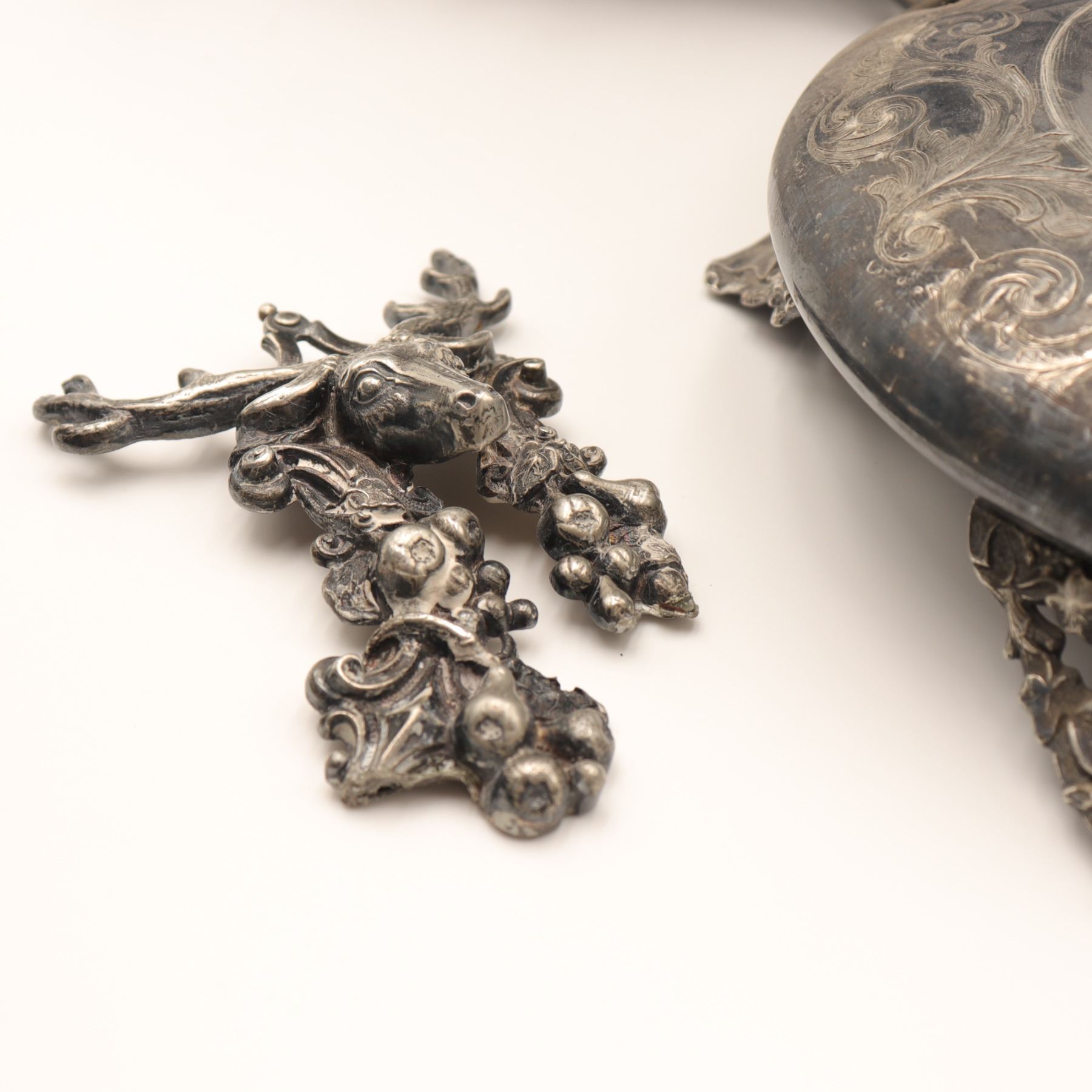 A mixed collection of silver-plated table and serving wares, comprising: a large Victorian/Edwardian champagne bucket with lobed lower body; a rounded kettle-on-stand with burner; an ornate Rococo Revival teapot on cast stand with warmer (one side of stand broken, requiring repair); a tall engraved hot-water jug; a small tripod burner base; and a substantial Victorian meat dome engraved with the initial “J.” Executed in various English and American silverplate traditions between c. 1880 and 1915. A substantial group suitable for restoration or decorative display.