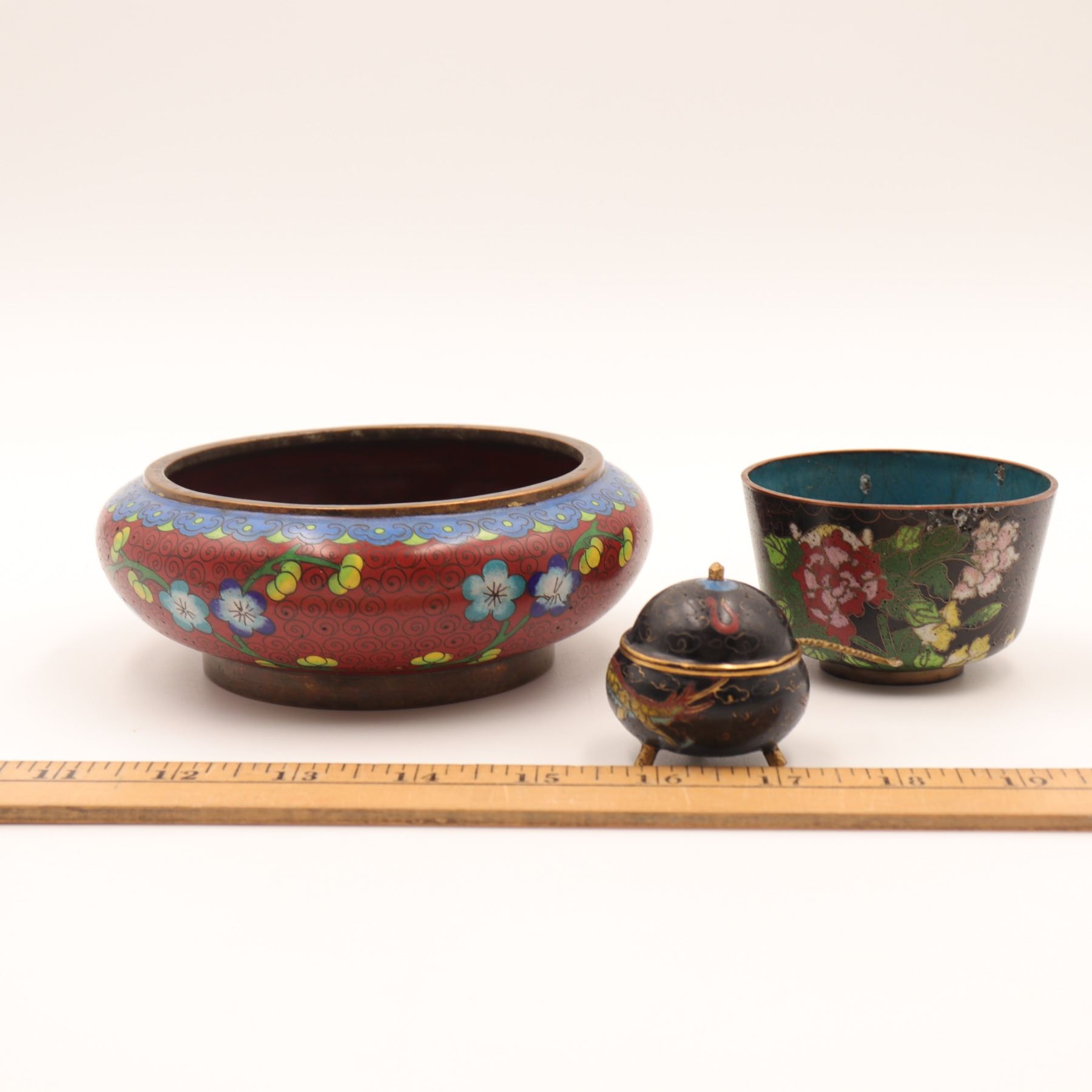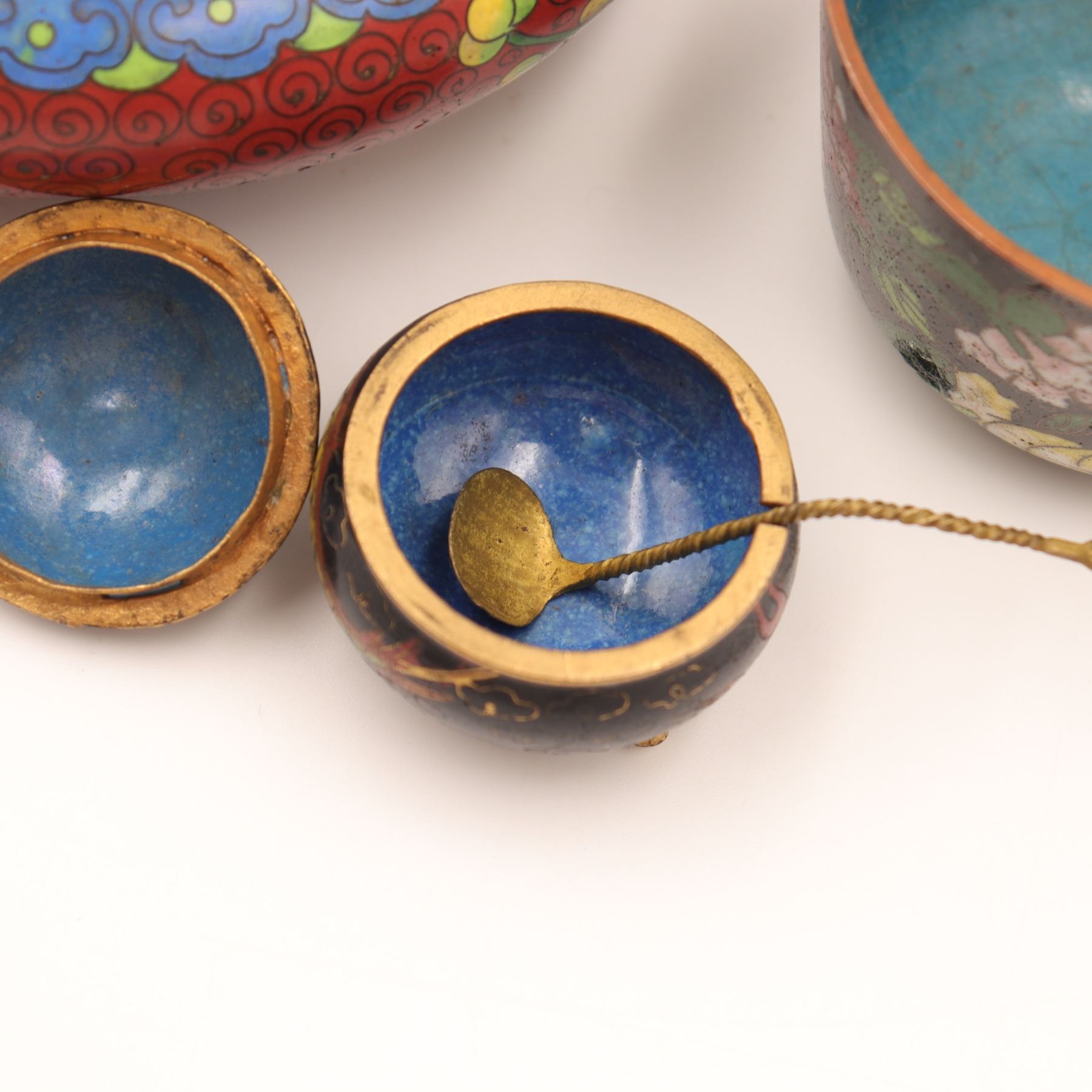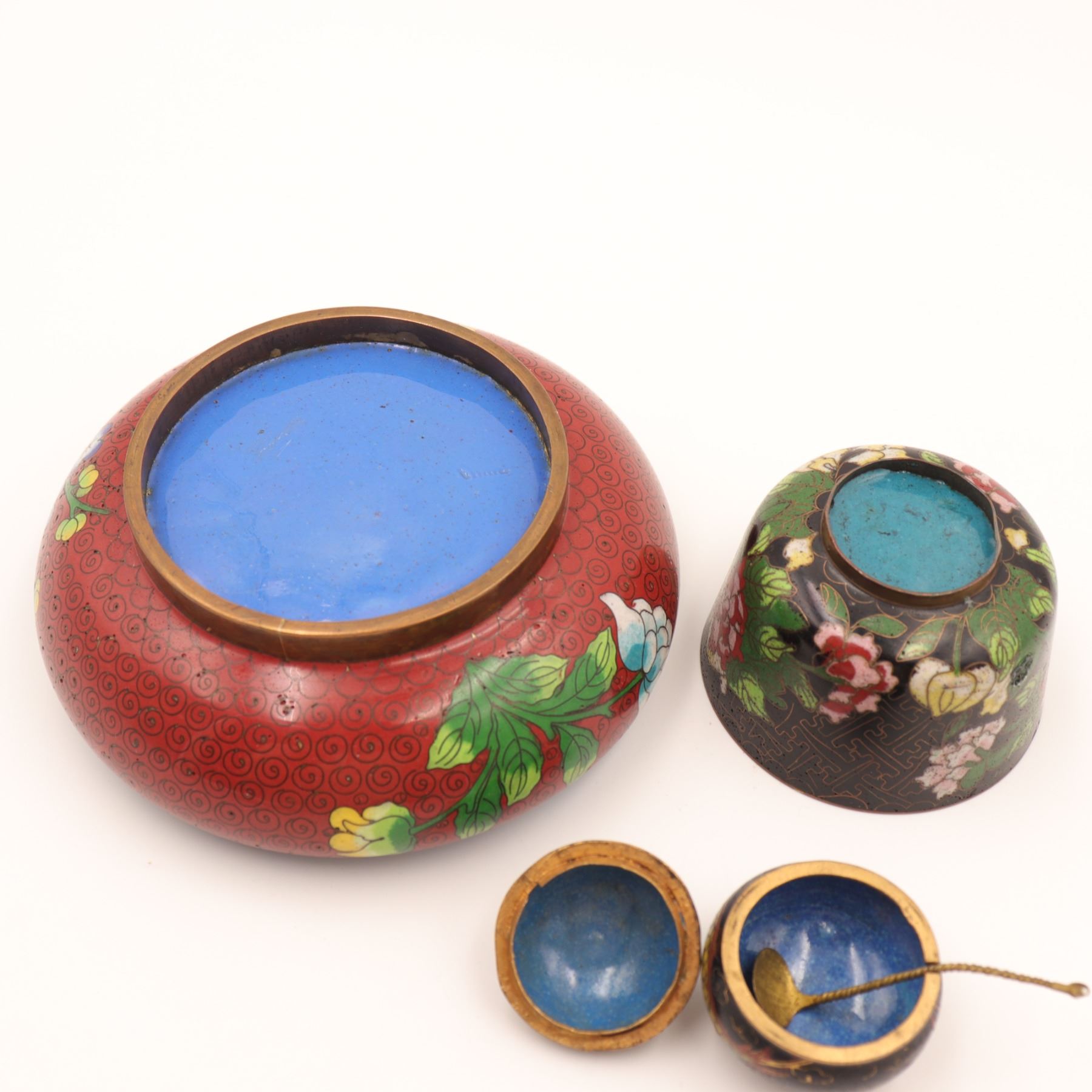 Group of three Chinese cloisonné enamel wares, early–mid 20th century, comprising a large low circular bowl with red ground and scrolling floral decoration to interior and exterior, a smaller straight-sided bowl with black ground and polychrome peony and foliate design, and a diminutive spherical covered salt or condiment with tripod feet and matching spoon, decorated with dragons on a black ground; all with turquoise or blue enamel bases. Largest bowl approx. 7 in. diameter. All with typical pitting, minor enamel losses, surface scratching, and patination to exposed brass edges; small salt with light wear to gilt interior.