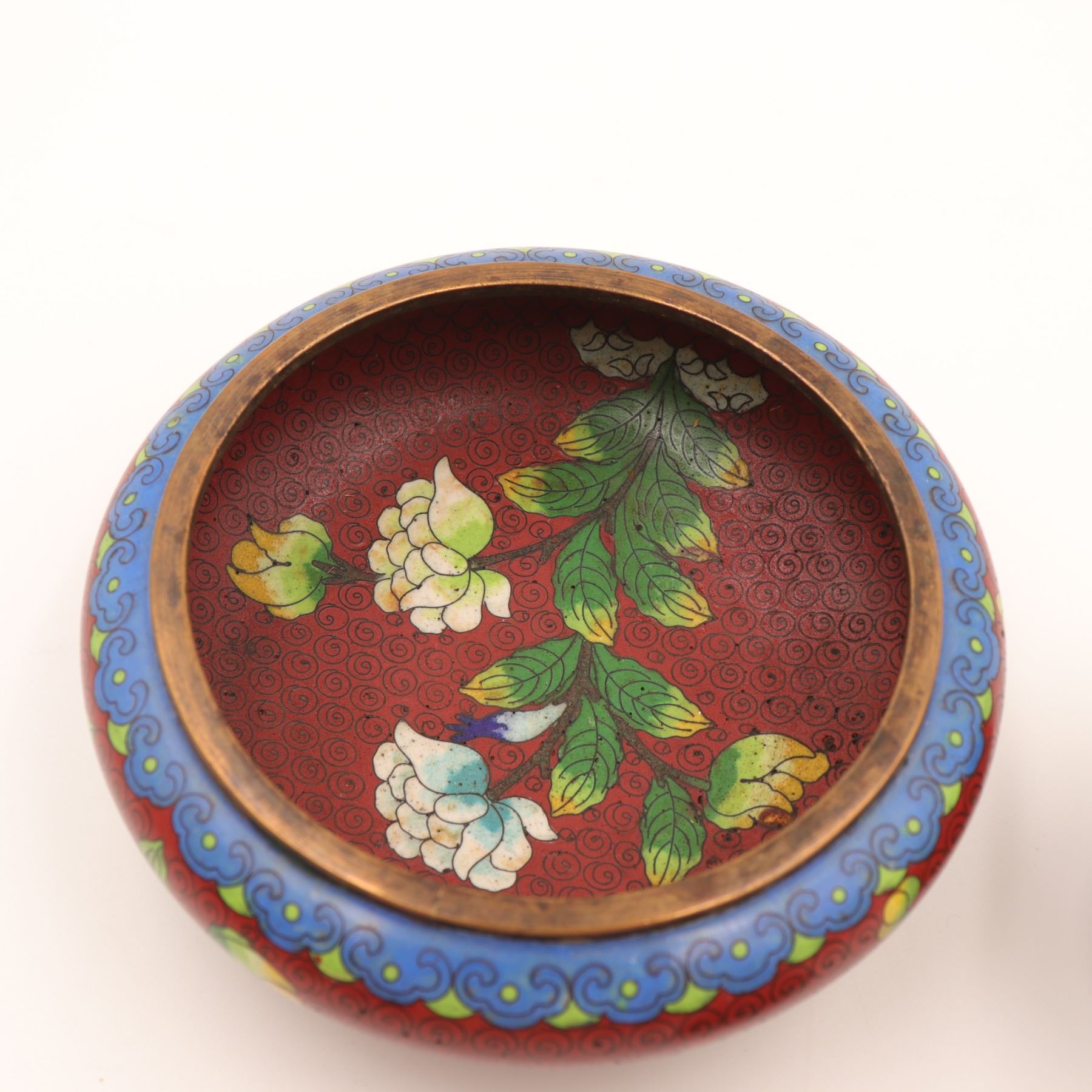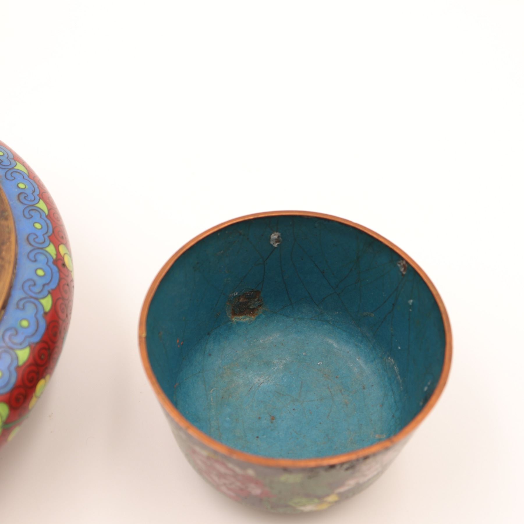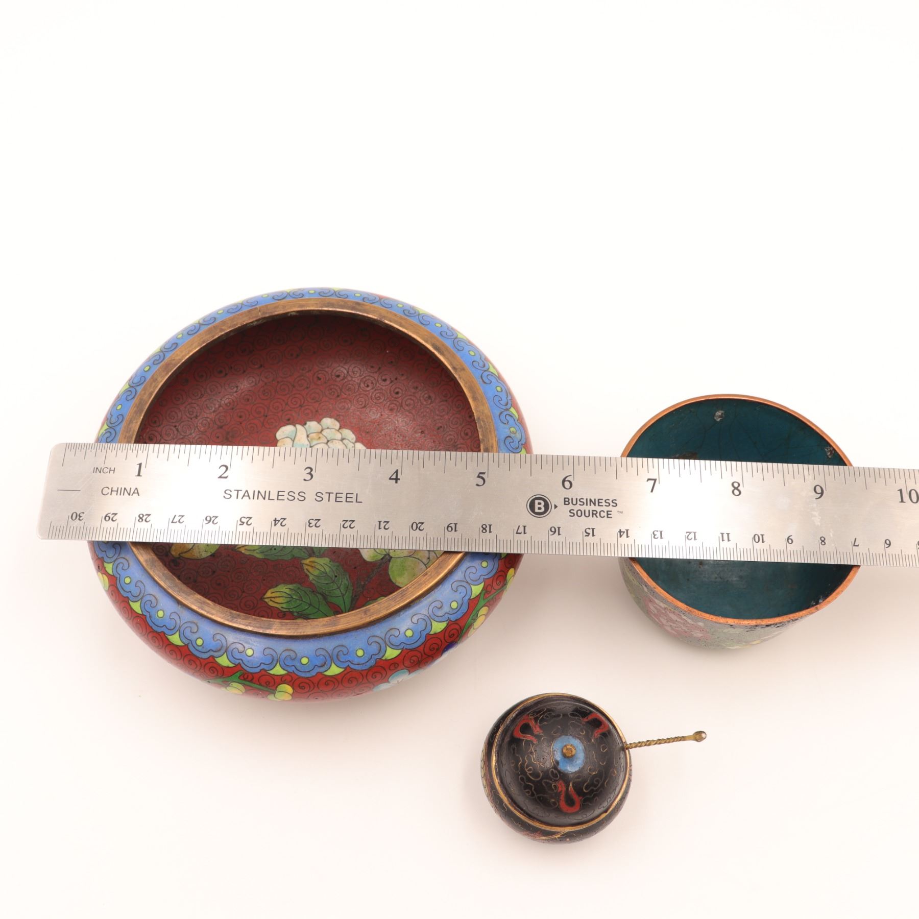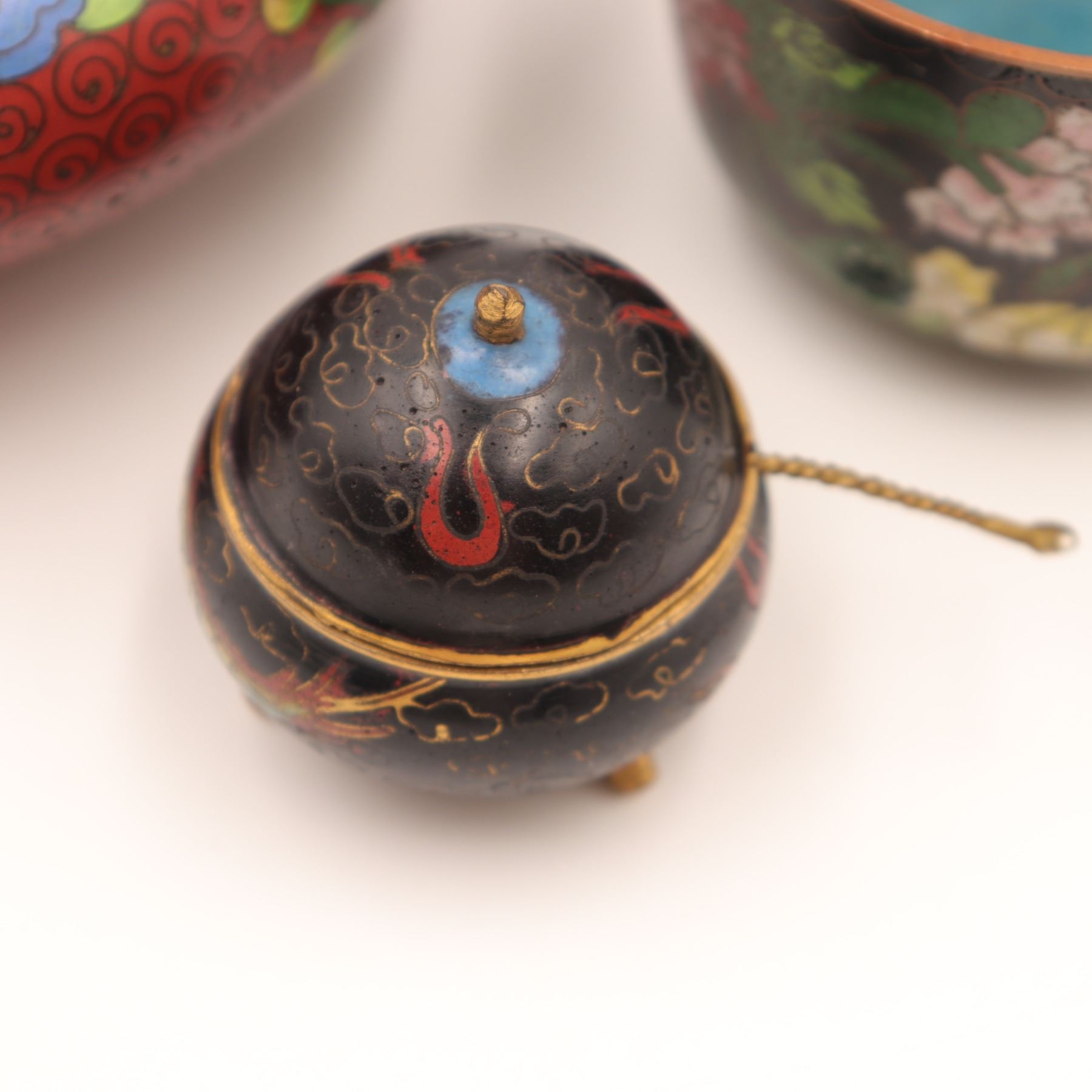 Group of three Chinese cloisonné enamel wares, early–mid 20th century, comprising a large low circular bowl with red ground and scrolling floral decoration to interior and exterior, a smaller straight-sided bowl with black ground and polychrome peony and foliate design, and a diminutive spherical covered salt or condiment with tripod feet and matching spoon, decorated with dragons on a black ground; all with turquoise or blue enamel bases. Largest bowl approx. 7 in. diameter. All with typical pitting, minor enamel losses, surface scratching, and patination to exposed brass edges; small salt with light wear to gilt interior.