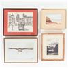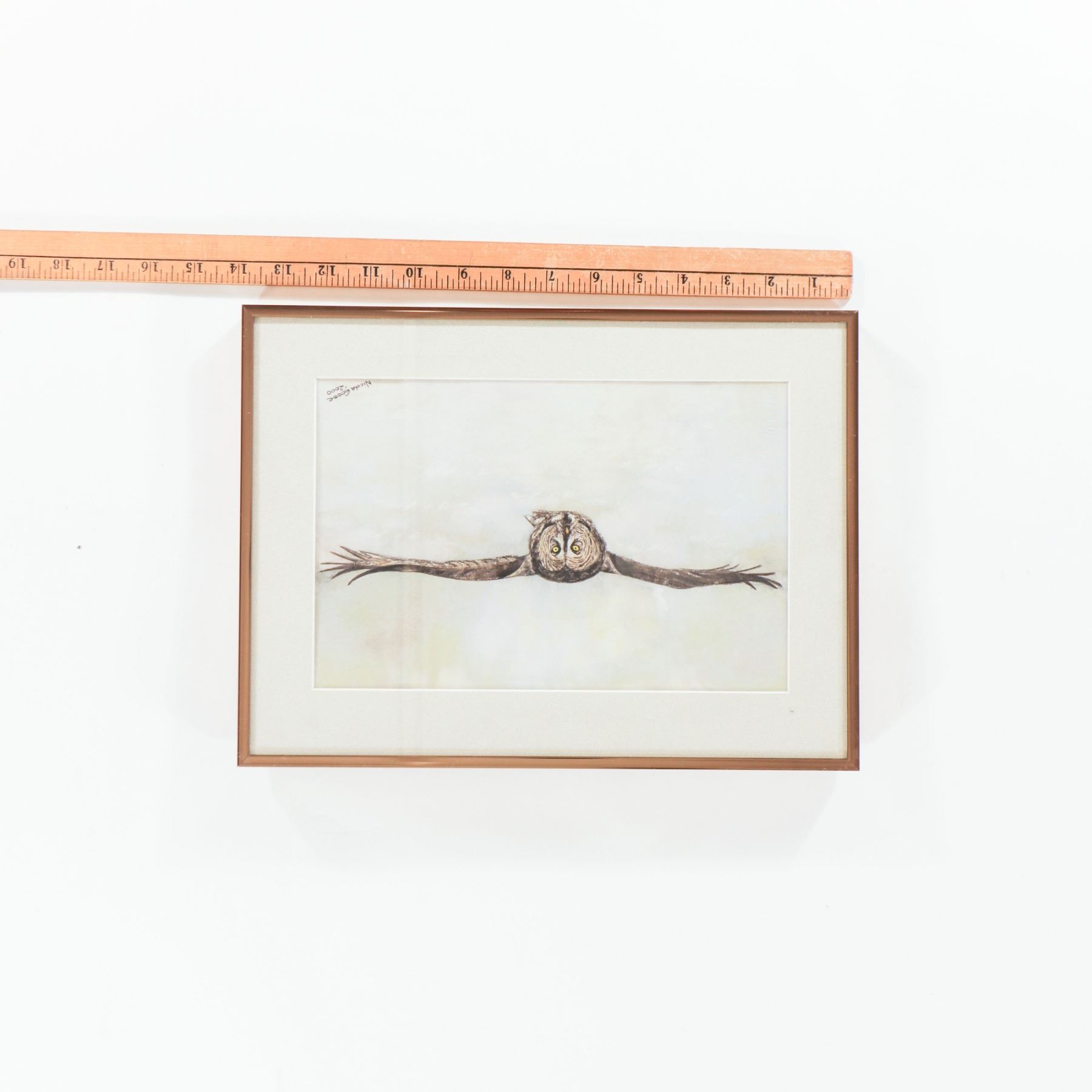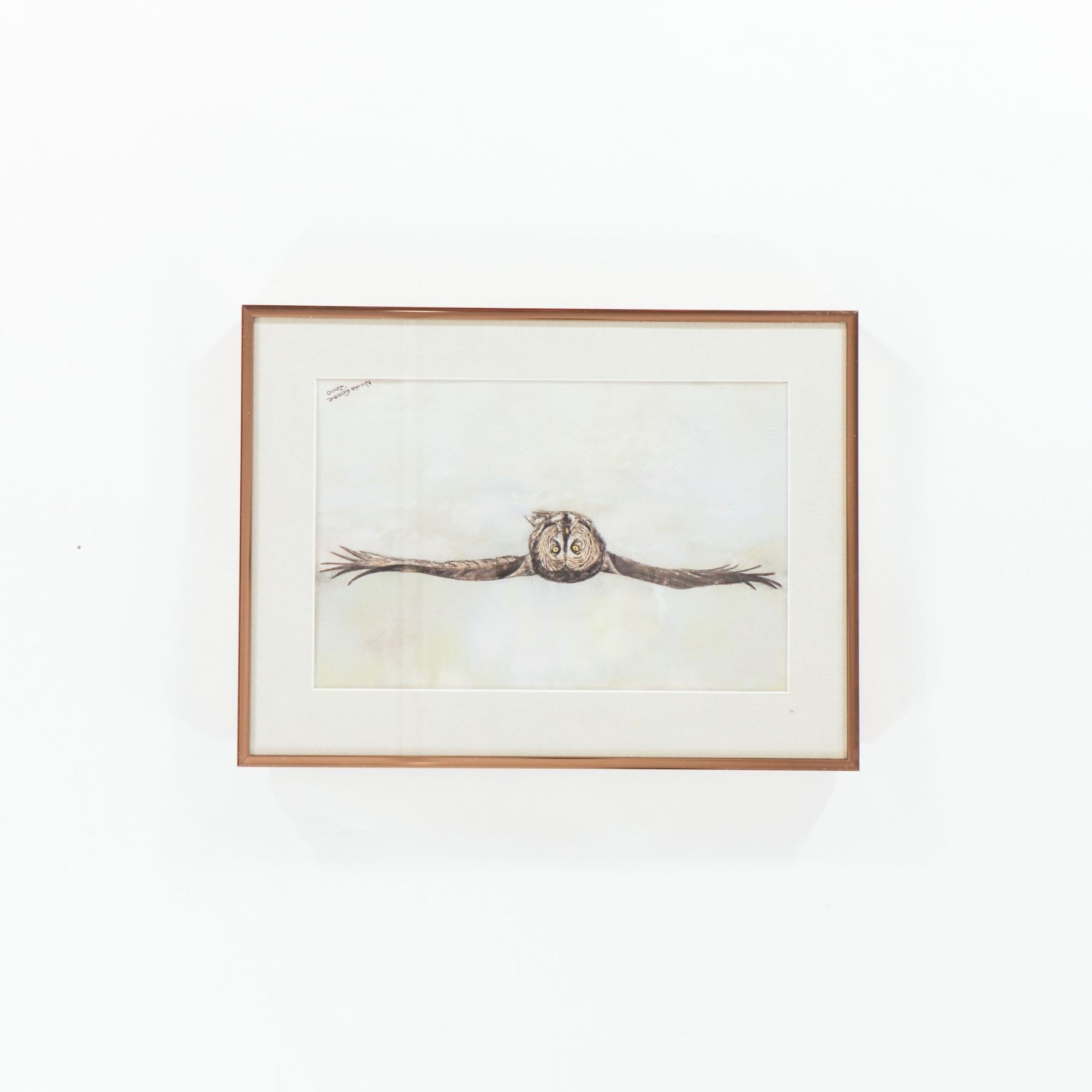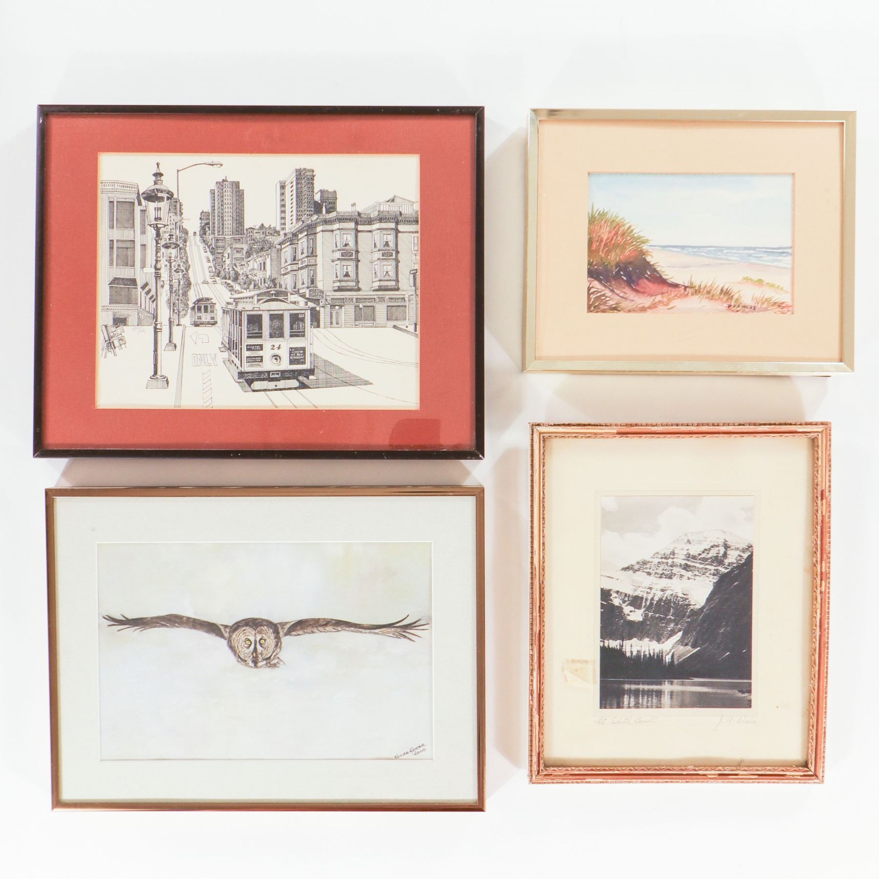 Group of four framed contemporary artworks, comprising: 1. Owl in flight – Large watercolour or gouache on paper depicting an owl flying head-on towards the viewer against a pale sky, wings fully outstretched. Signed and dated in the upper left (illegible in photo), double-mounted in a cream mat and slim bronze-tone metal frame. 2. City street scene – Pen-and-ink architectural drawing of an urban street with tram or streetcar, tall buildings and streetlamps, executed in a precise, almost technical style. Image mounted on a red mat and housed in a narrow dark metal frame. 3. Beach landscape – Small watercolour on paper of dunes and beach grasses leading to the sea under a bright sky, signed lower right, in a champagne-tone metal frame with pale mat. 4. Mountain photograph – Black-and-white photographic print of a snow-capped peak reflected in a lake, titled in pencil to the mount (indistinct in photo, likely a Canadian Rockies view) and signed lower right, in a gilt-composition frame with cream mat. Together a varied decorative ensemble of later 20th-century original works and prints.