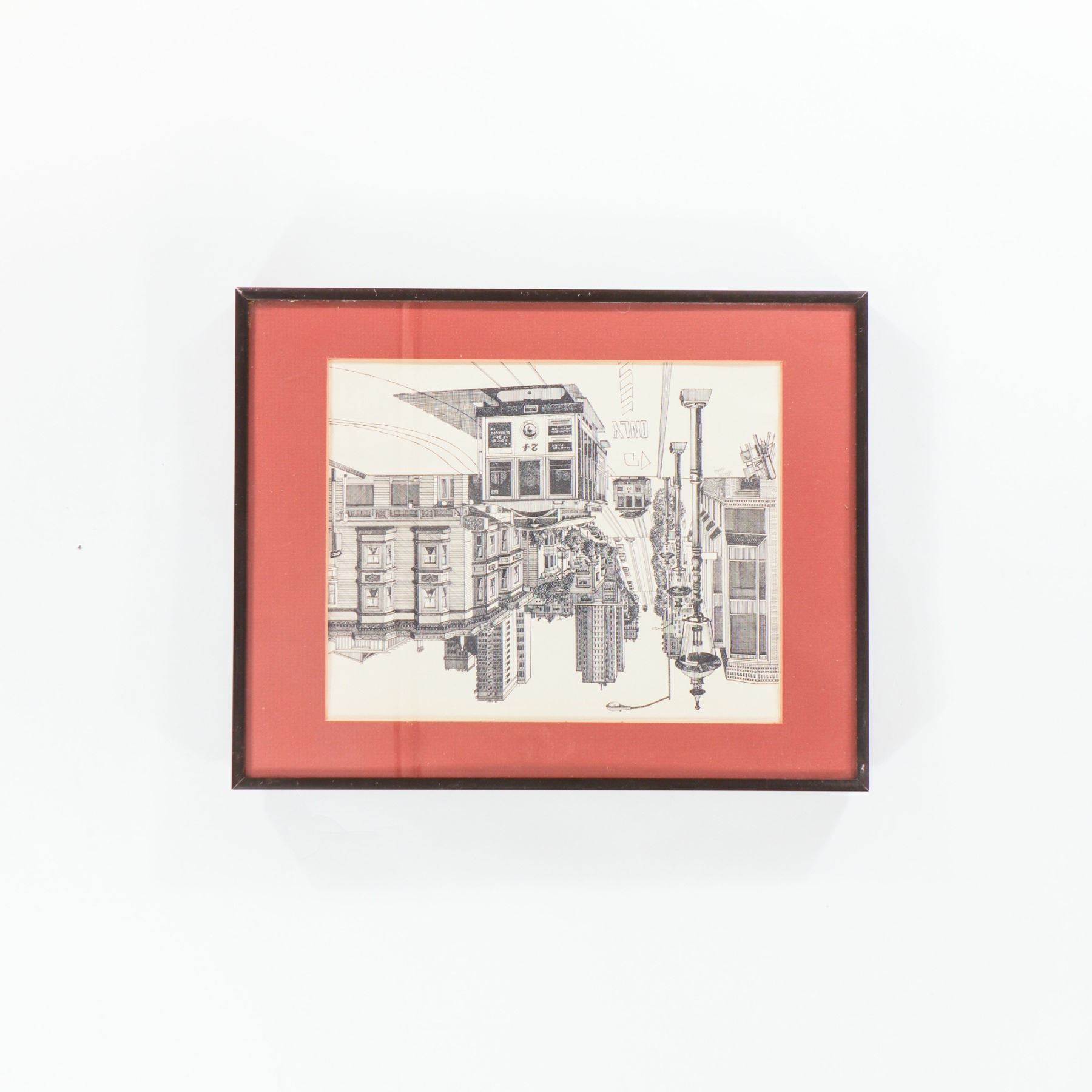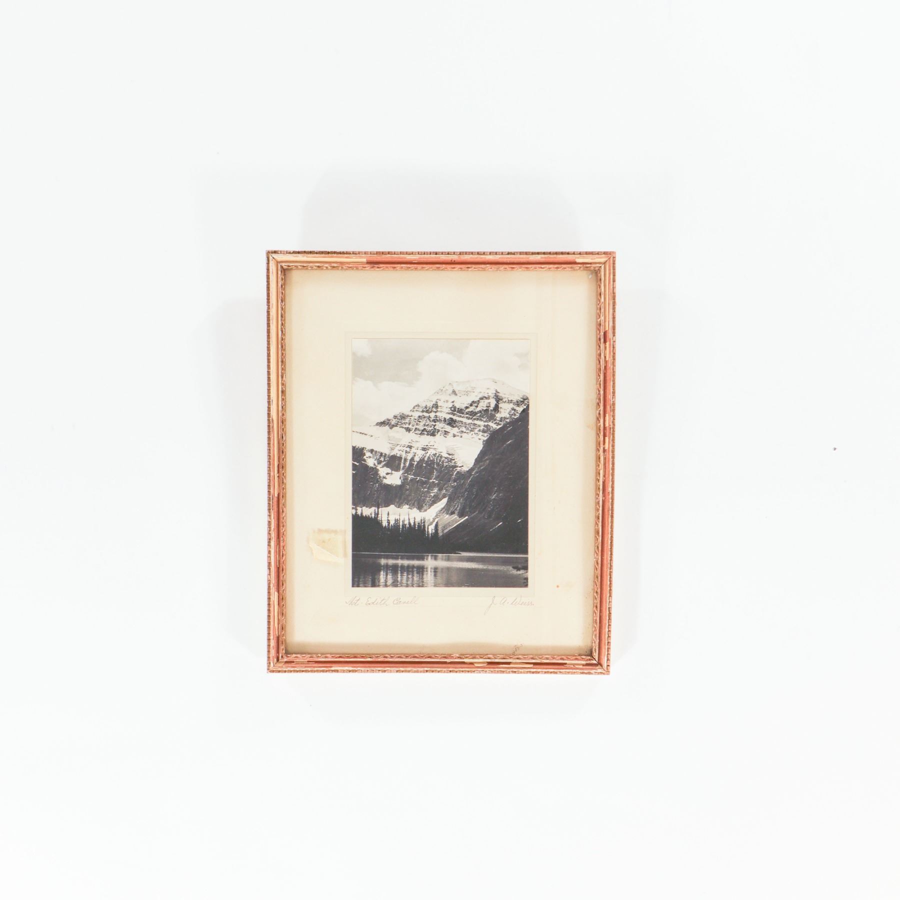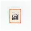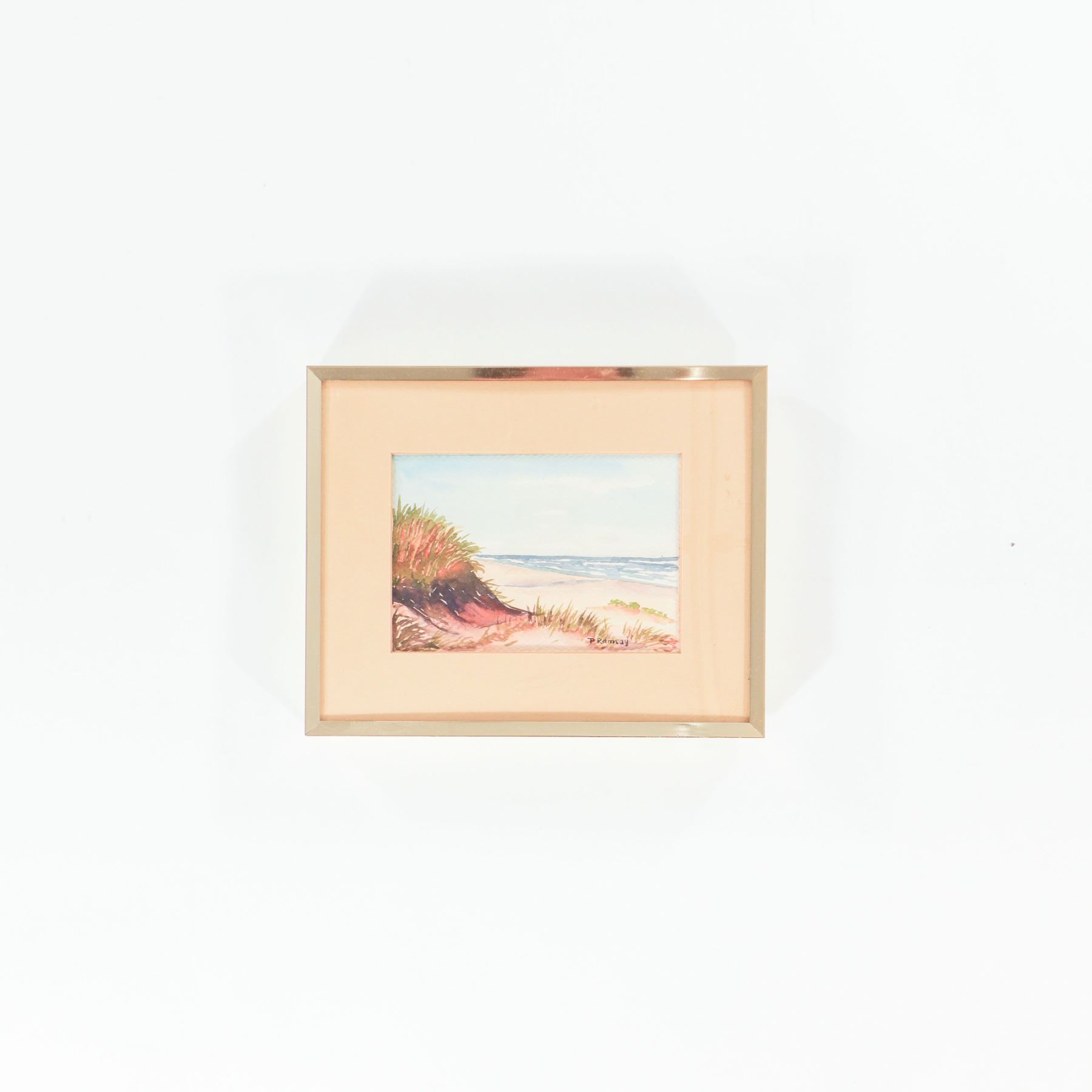 Group of four framed contemporary artworks, comprising: 1. Owl in flight – Large watercolour or gouache on paper depicting an owl flying head-on towards the viewer against a pale sky, wings fully outstretched. Signed and dated in the upper left (illegible in photo), double-mounted in a cream mat and slim bronze-tone metal frame. 2. City street scene – Pen-and-ink architectural drawing of an urban street with tram or streetcar, tall buildings and streetlamps, executed in a precise, almost technical style. Image mounted on a red mat and housed in a narrow dark metal frame. 3. Beach landscape – Small watercolour on paper of dunes and beach grasses leading to the sea under a bright sky, signed lower right, in a champagne-tone metal frame with pale mat. 4. Mountain photograph – Black-and-white photographic print of a snow-capped peak reflected in a lake, titled in pencil to the mount (indistinct in photo, likely a Canadian Rockies view) and signed lower right, in a gilt-composition frame with cream mat. Together a varied decorative ensemble of later 20th-century original works and prints.