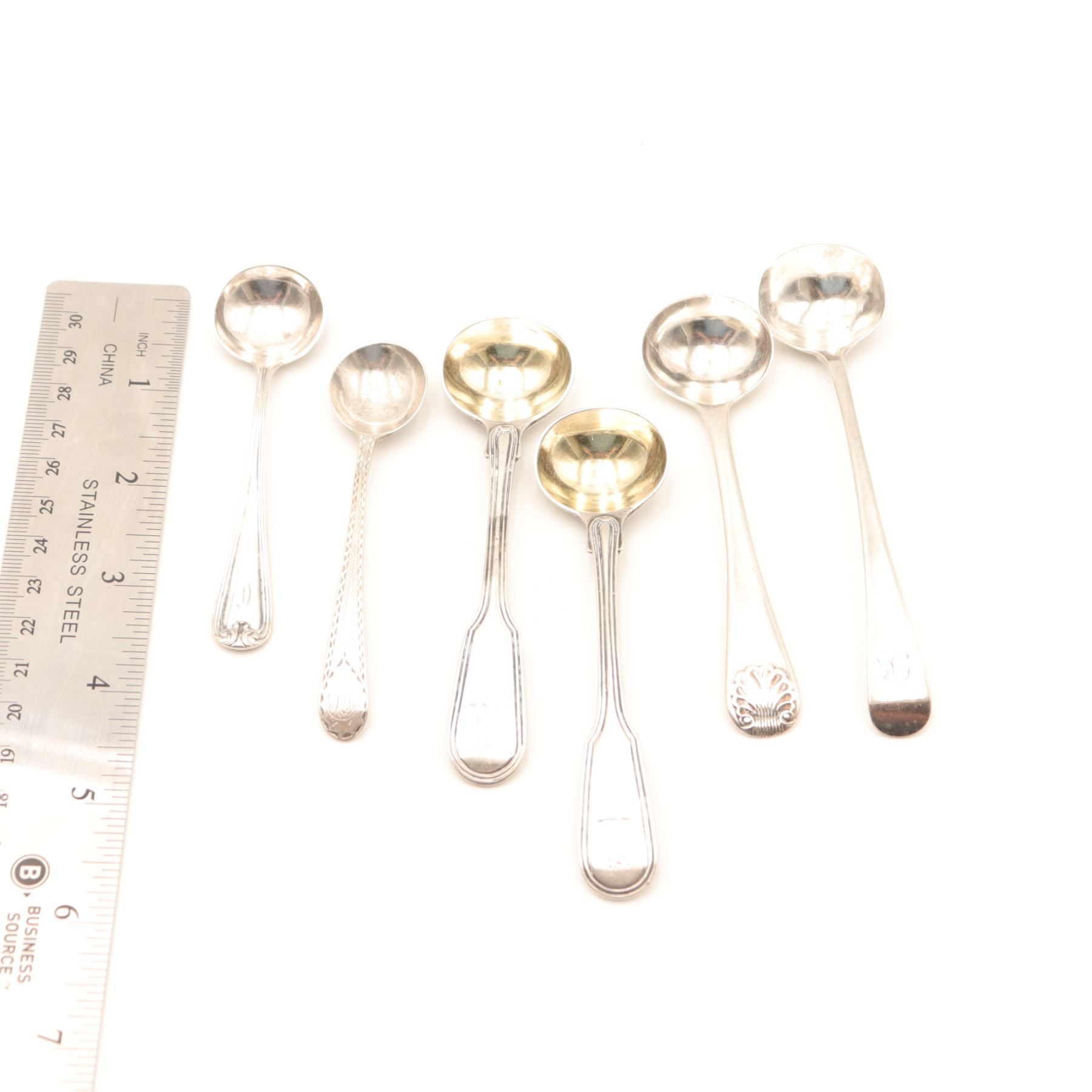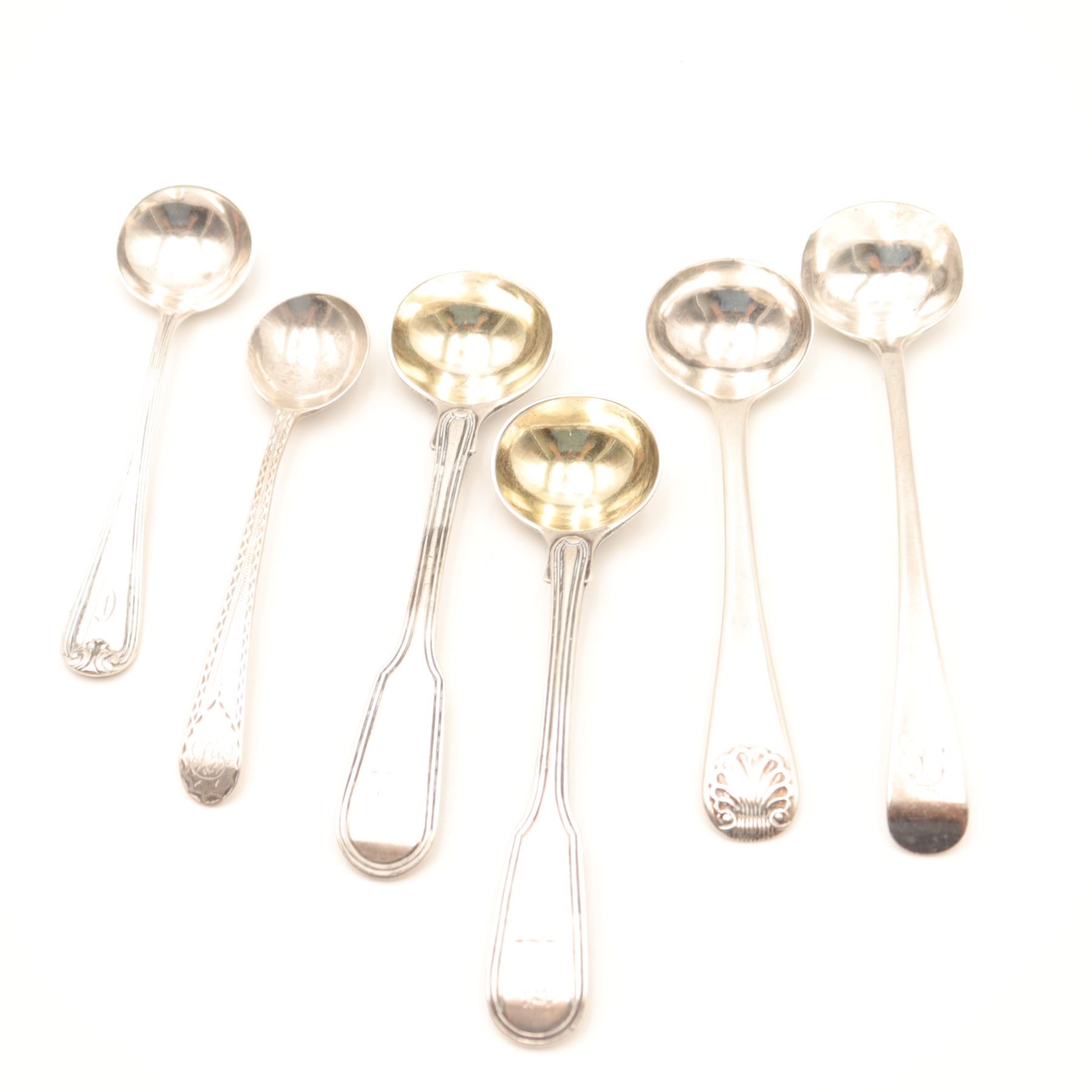 Group of six sterling silver condiment and sauce ladles, late 19th–mid-20th century, comprising a variety of forms and patterns including two matching panel-handled ladles with gilt circular bowls, a shell-terminal ladle, and three further examples with engraved or molded borders and plain round bowls. Assorted makers, some with British sterling hallmarks and others stamped *STERLING*. Total combined weight approx. 91.93 g.