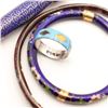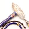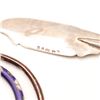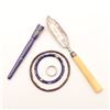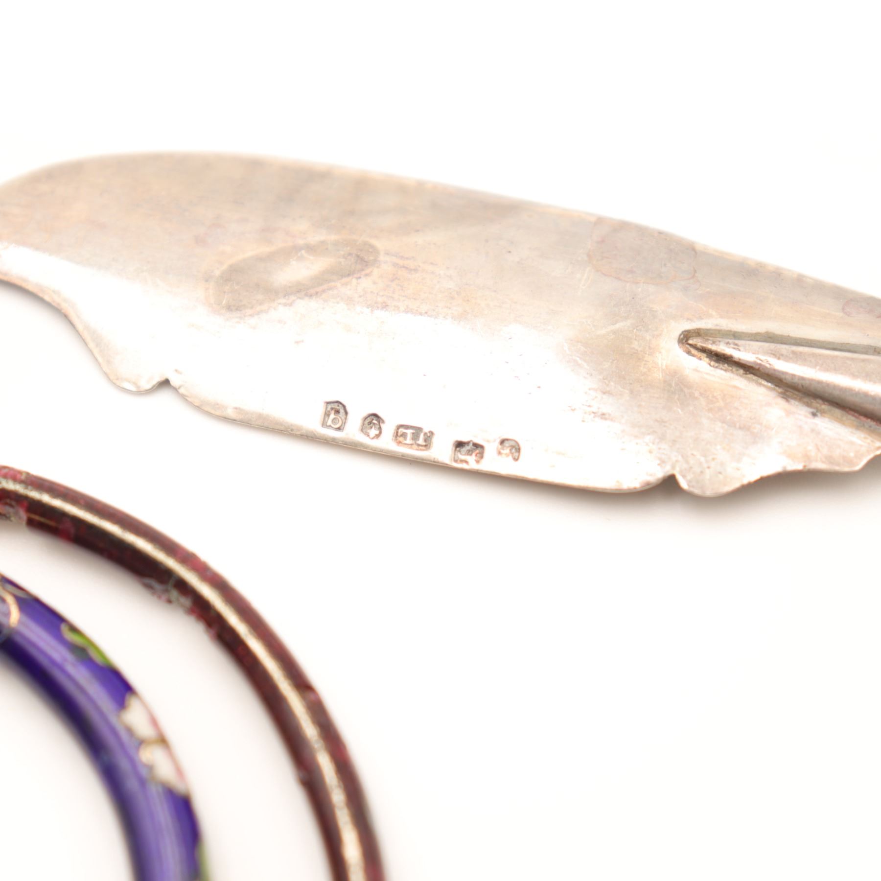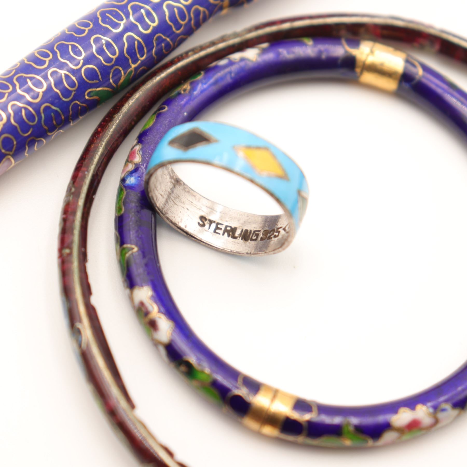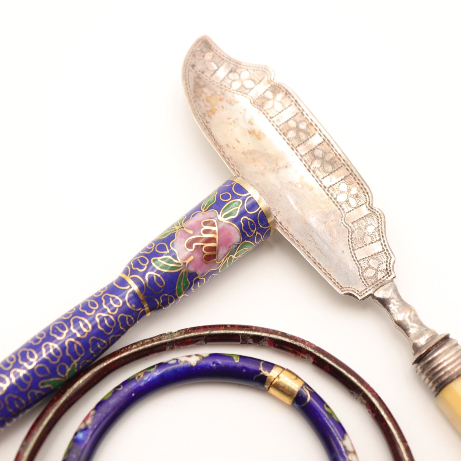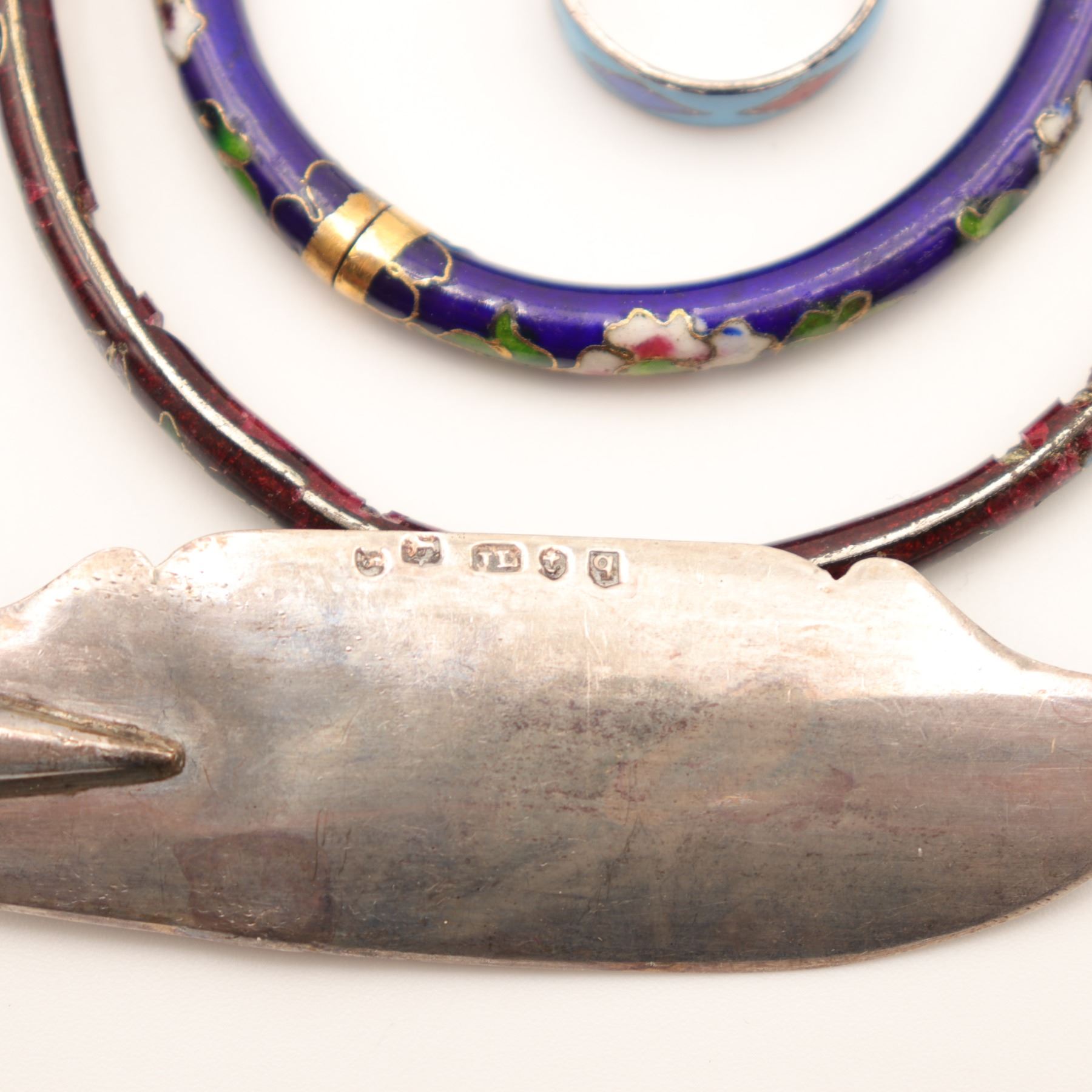 Group of sterling silver and enamel items, including an English sterling silver dessert or butter knife with scalloped, bright-cut blade and cream composition handle, bearing British sterling hallmarks to the blade; a modern turquoise-blue enamel and sterling silver band ring stamped STERLING 925; two floral cloisonné enamel bangles with gilt metal mounts; and a blue-ground cloisonné enamel cigarette holder or similar tapering tube with repeating floral motifs. 5 pieces total.
