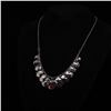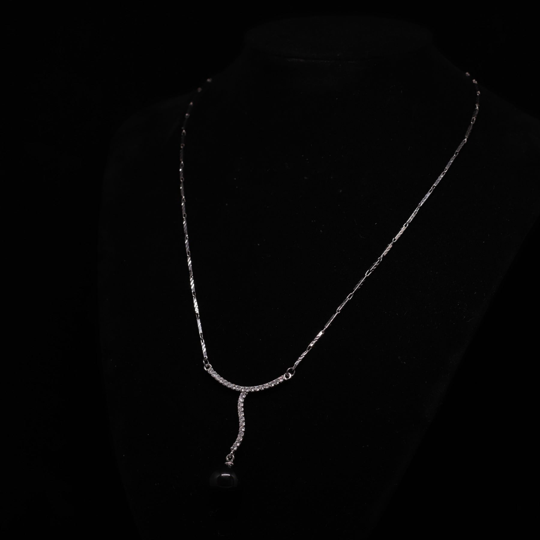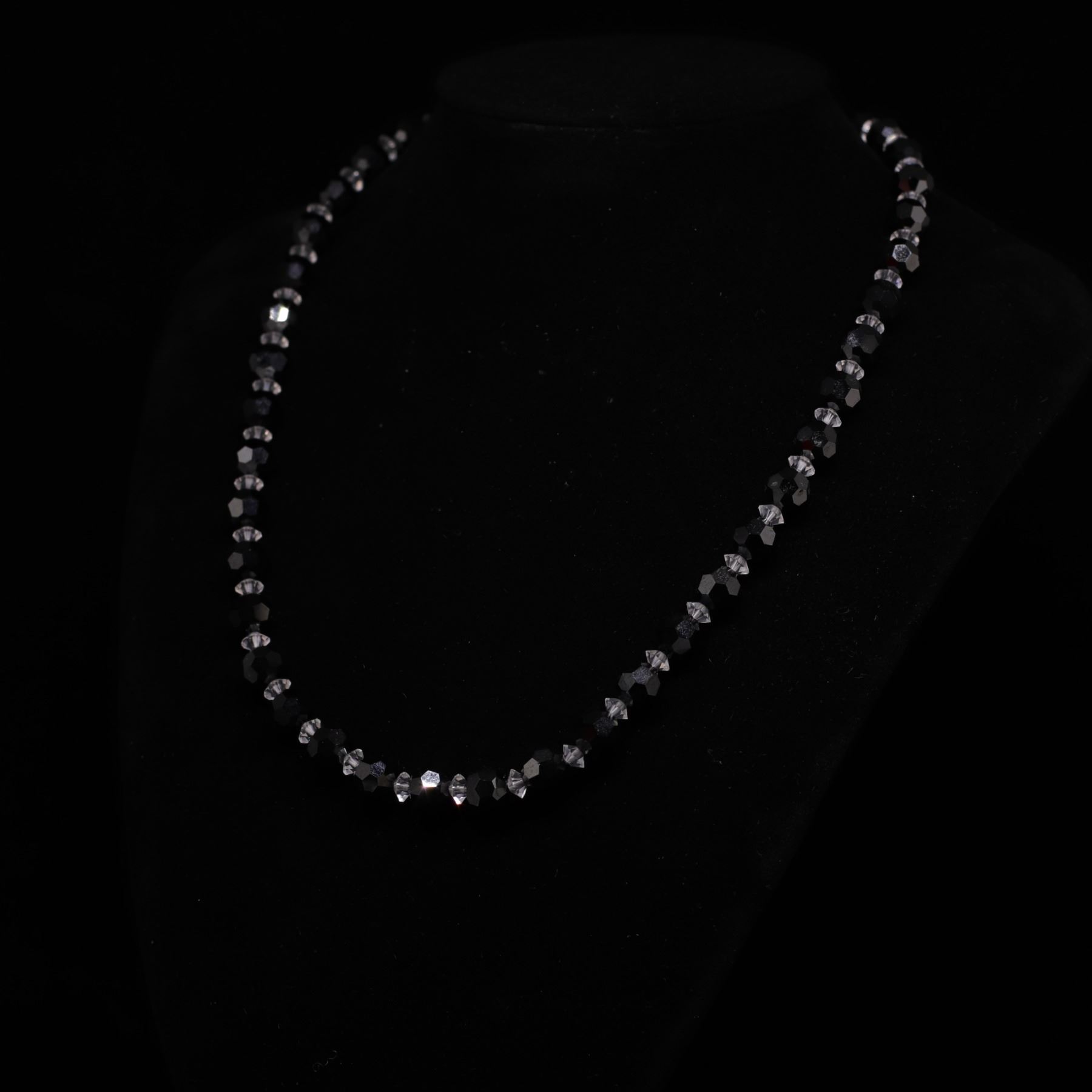 Group of three contemporary necklaces, including a silver-tone bib necklace hung with overlapping polished domed discs on a fine chain; a delicate strand of faceted black and grey glass or crystal beads; and a silver-tone Y-drop necklace with curved pavé-set bar and suspended faceted black bead. All unmarked and presumed costume jewellery.