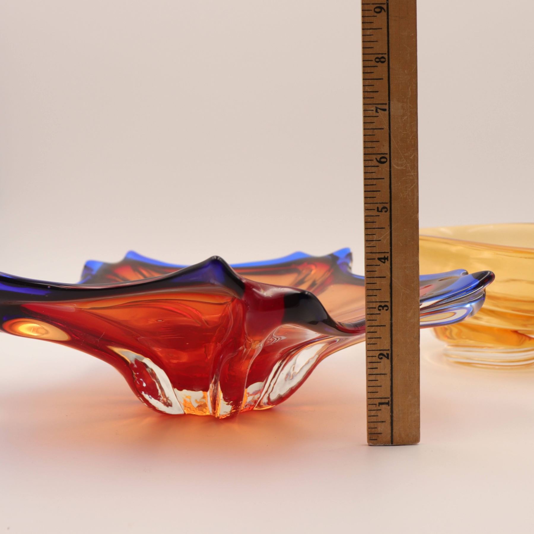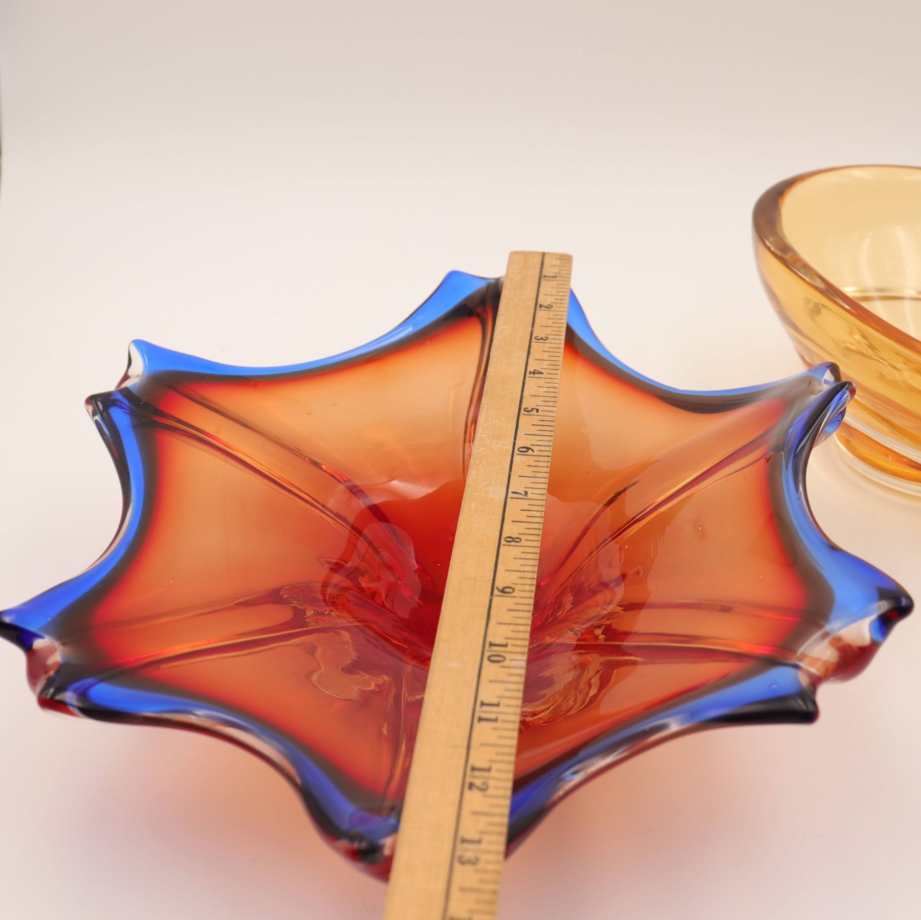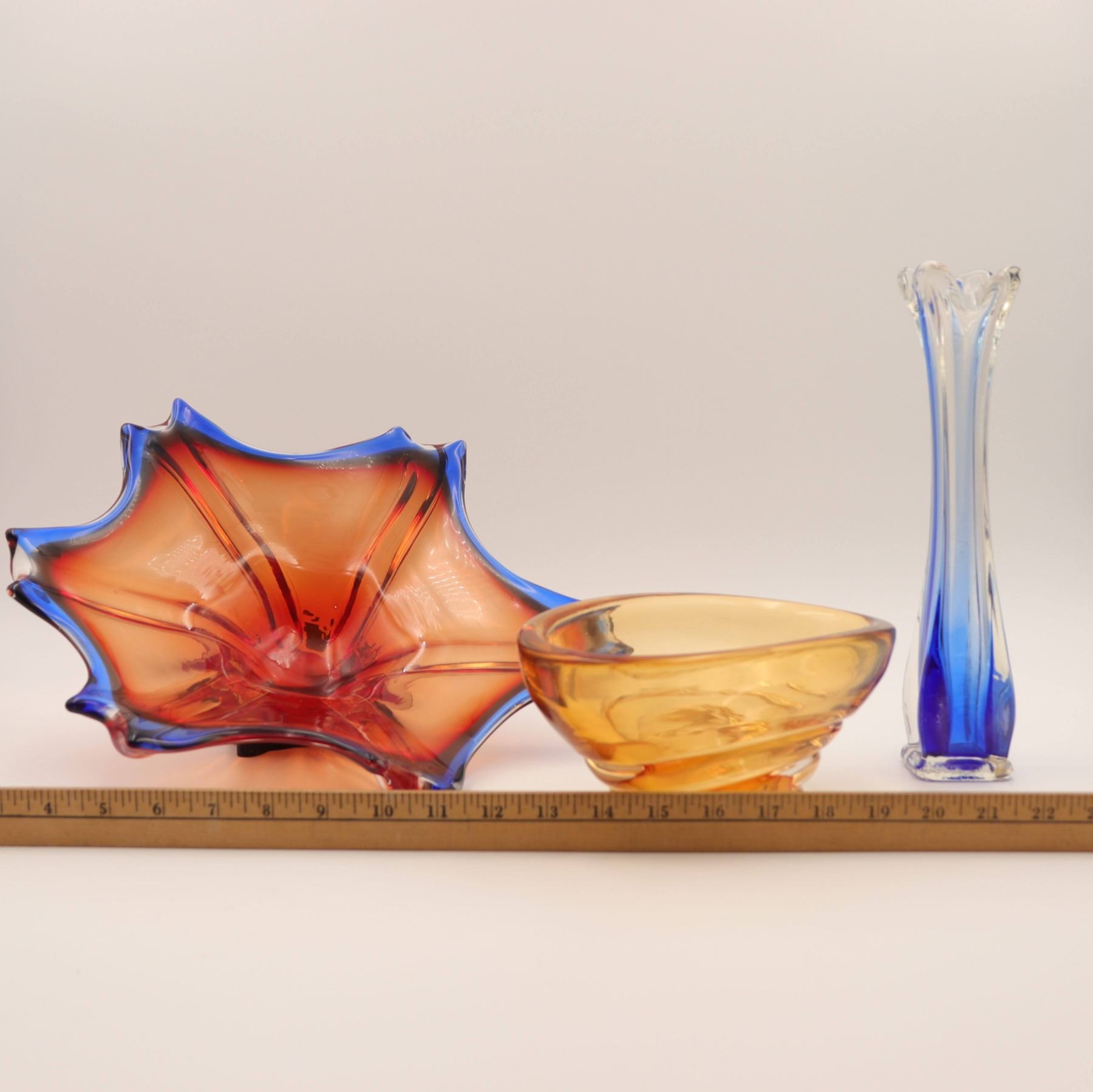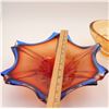 4 in total. Blue and red stat pulled platter, tall vase, Heavy yellow bowl, beige footed dish with ruffles