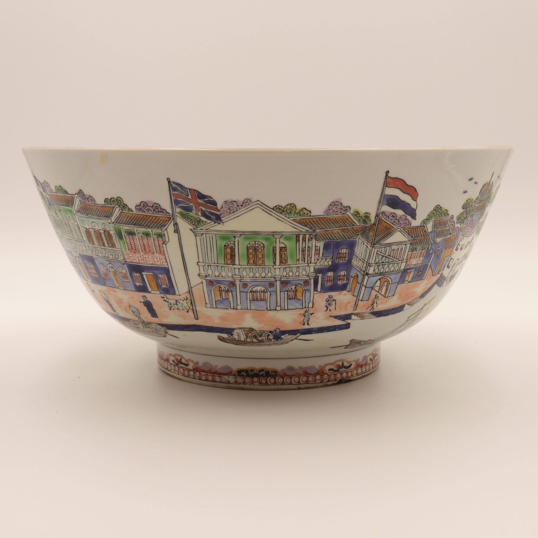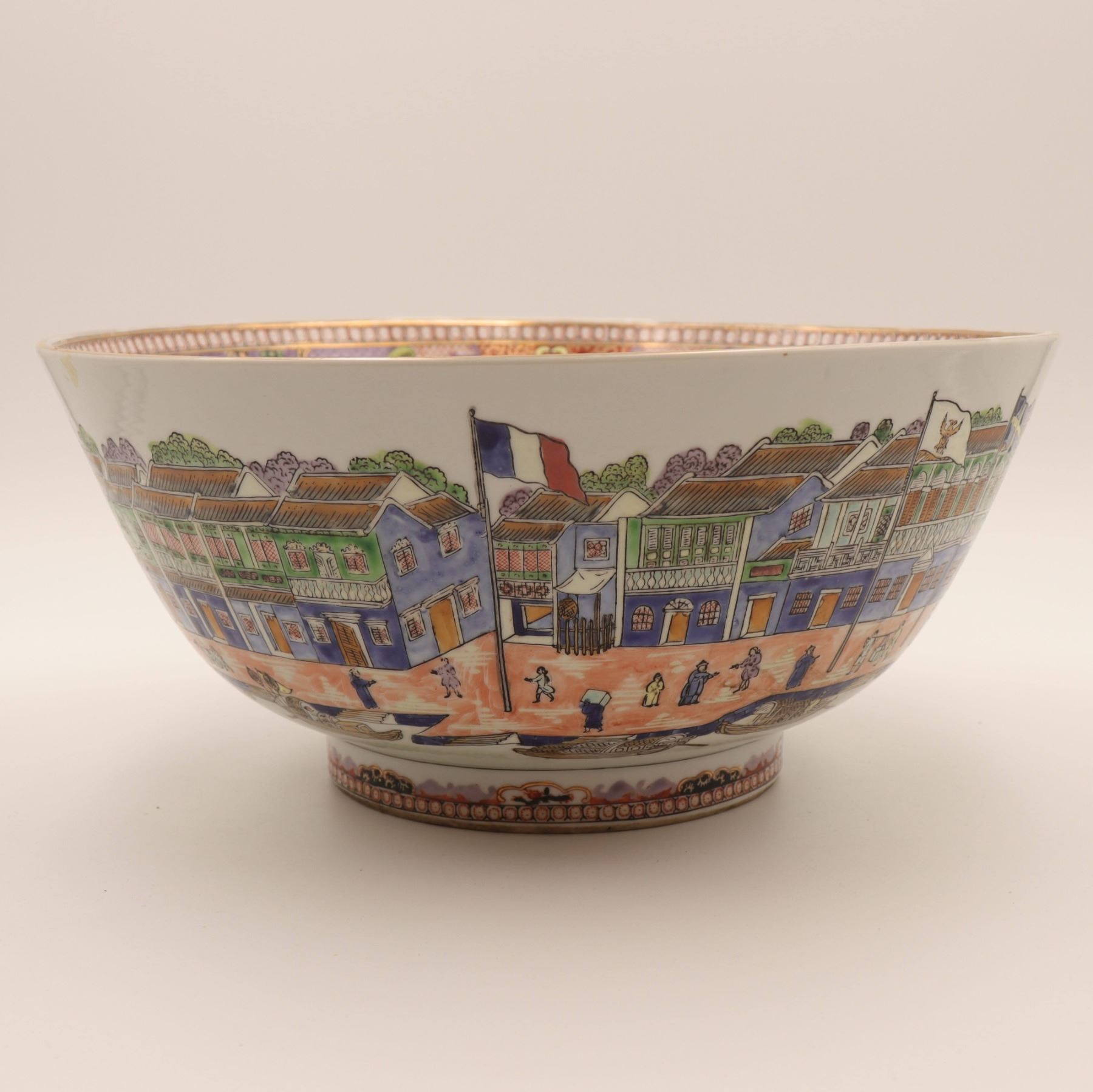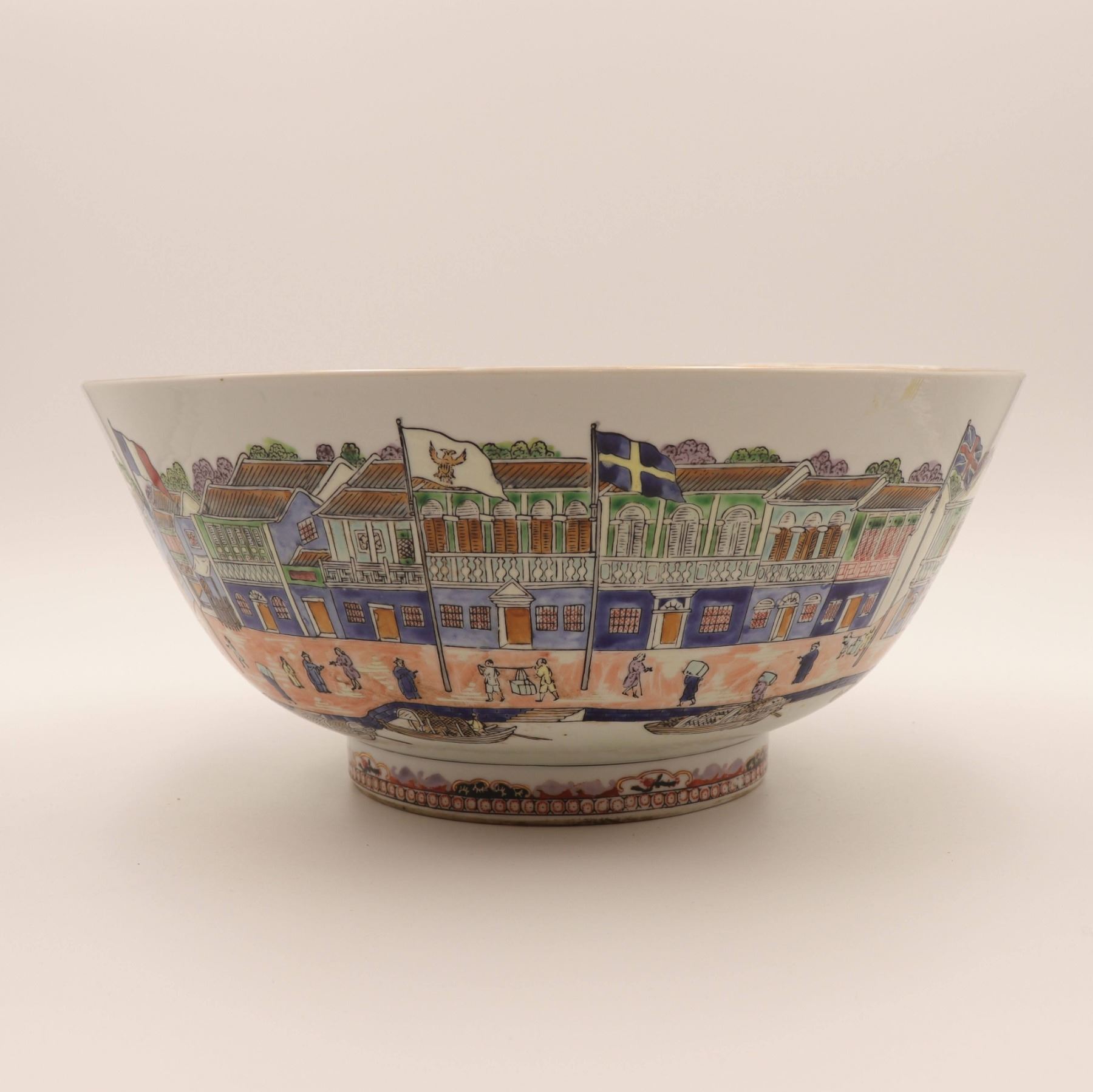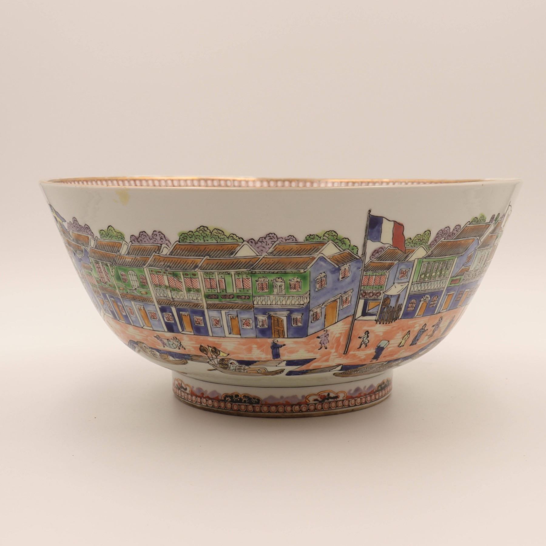 Large Chinese Export porcelain punch bowl with enamel polychrome colors and gilding, depicting the hongs at Canton and the flags of Britain, Denmark, Holland and France. The shoreline is crowded with people and Chinese chop boats. The inside is decorated with an elaborate border with the flag of Britain flying beside its hong and junks in the harbor.