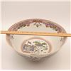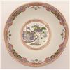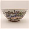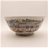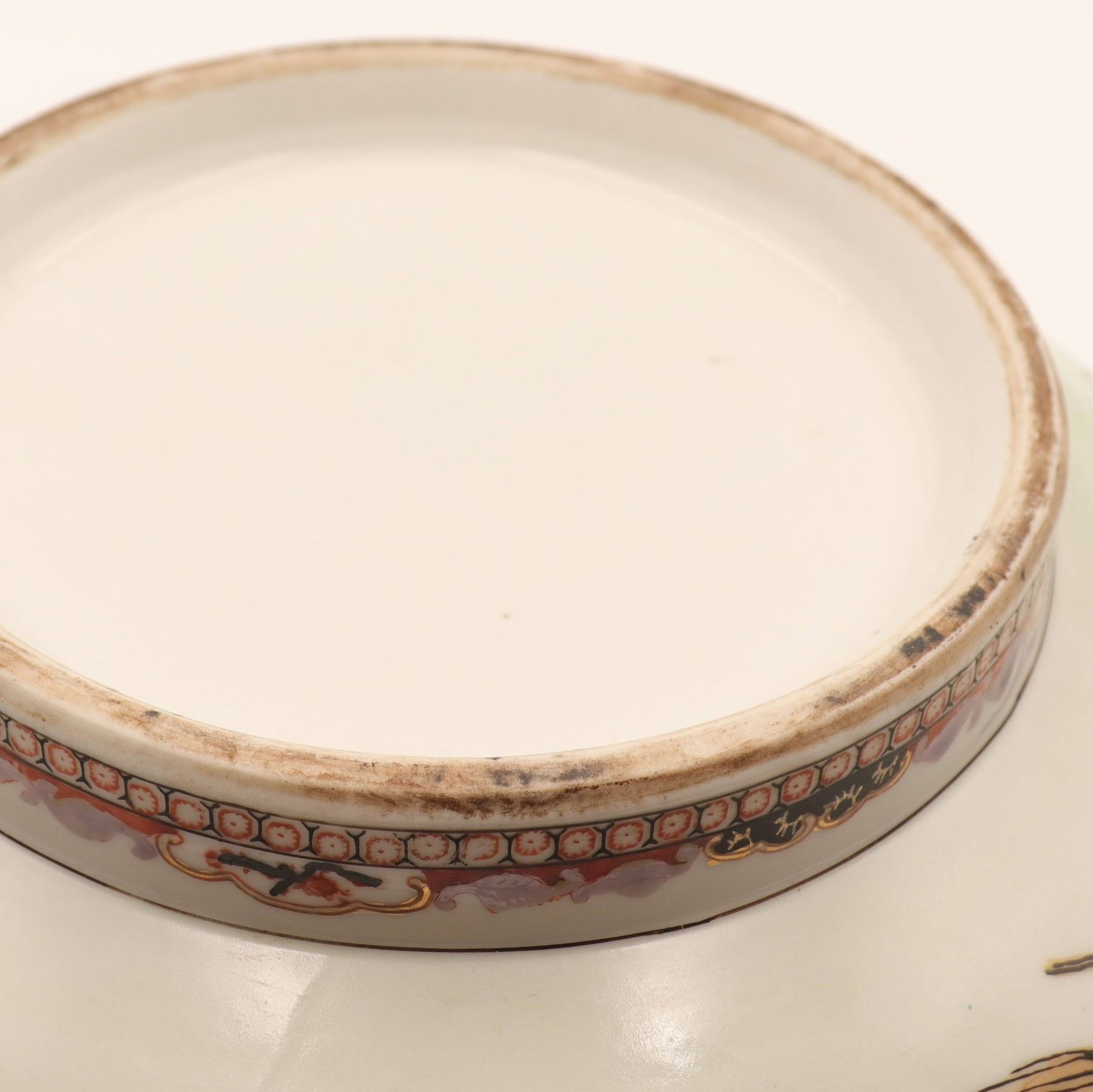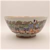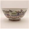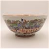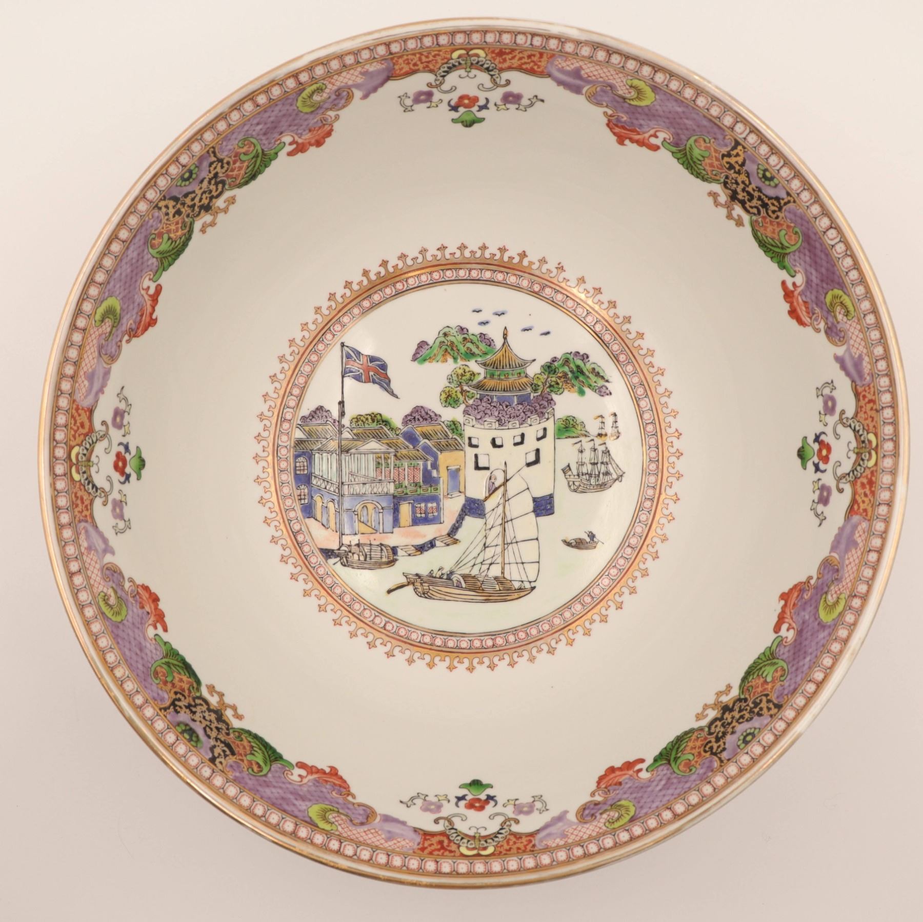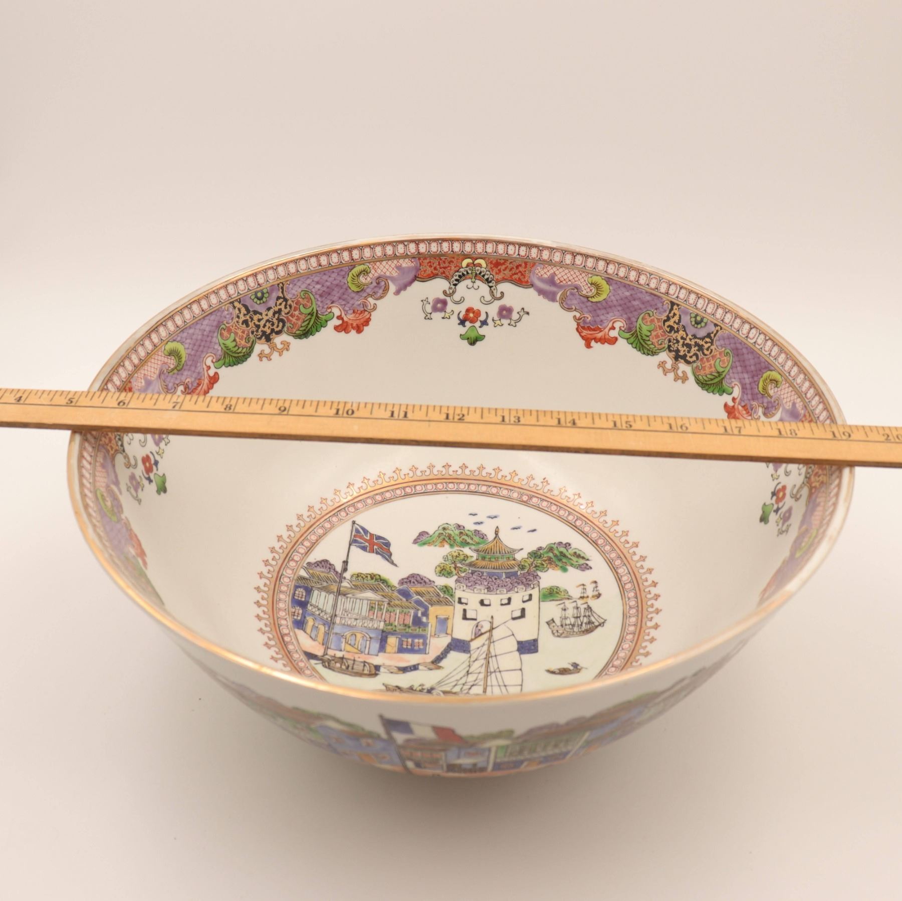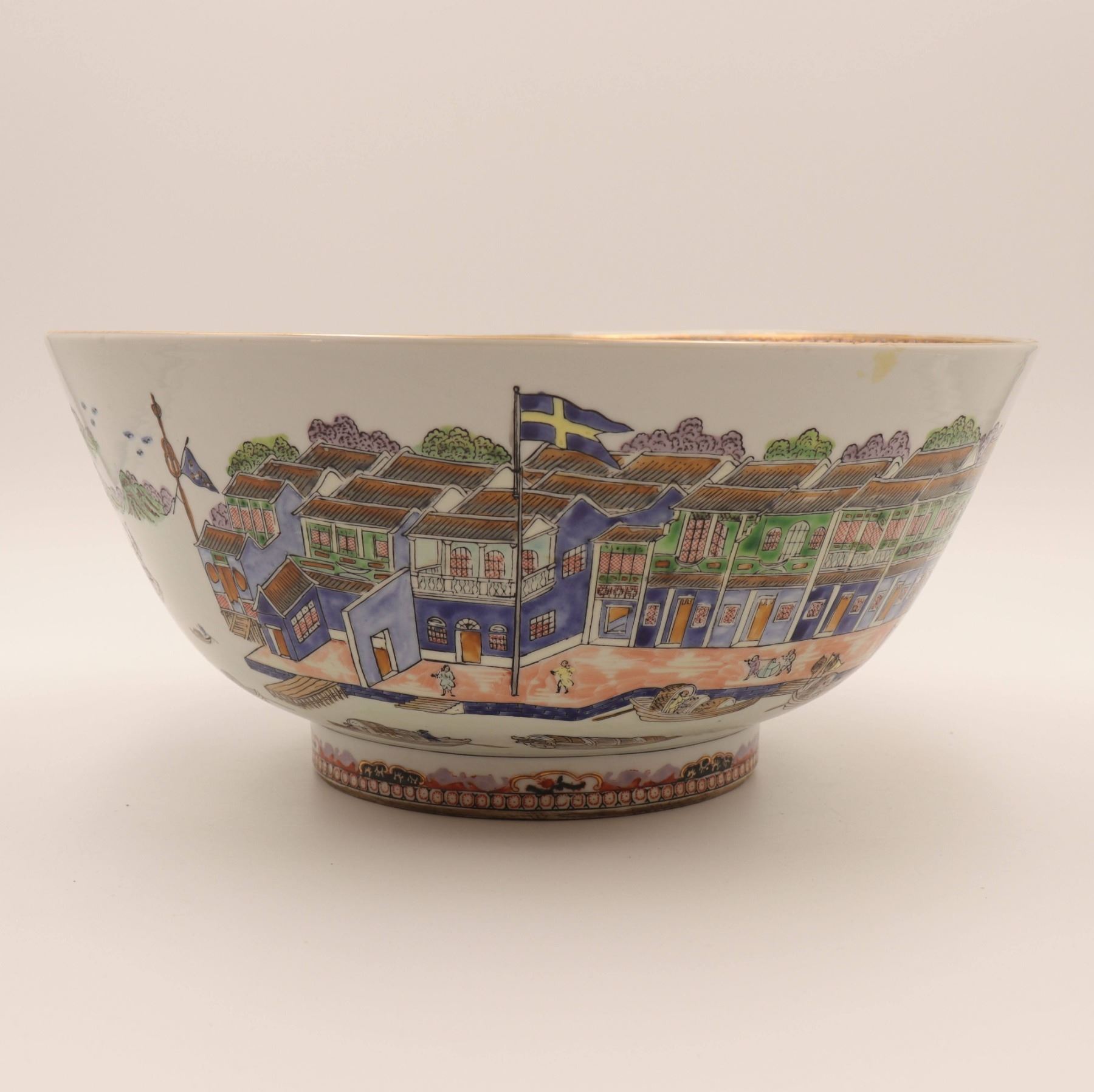 Large Chinese Export porcelain punch bowl with enamel polychrome colors and gilding, depicting the hongs at Canton and the flags of Britain, Denmark, Holland and France. The shoreline is crowded with people and Chinese chop boats. The inside is decorated with an elaborate border with the flag of Britain flying beside its hong and junks in the harbor.