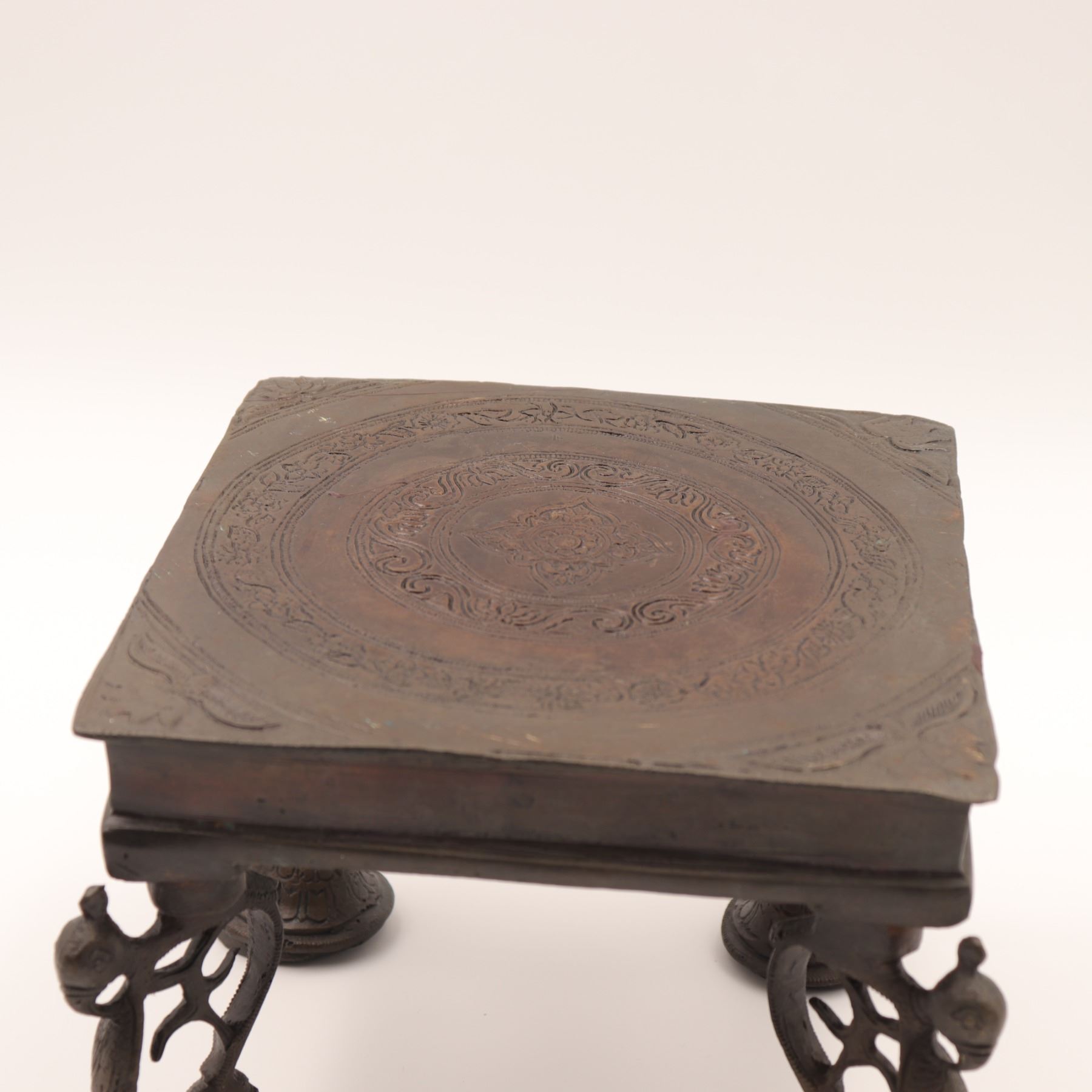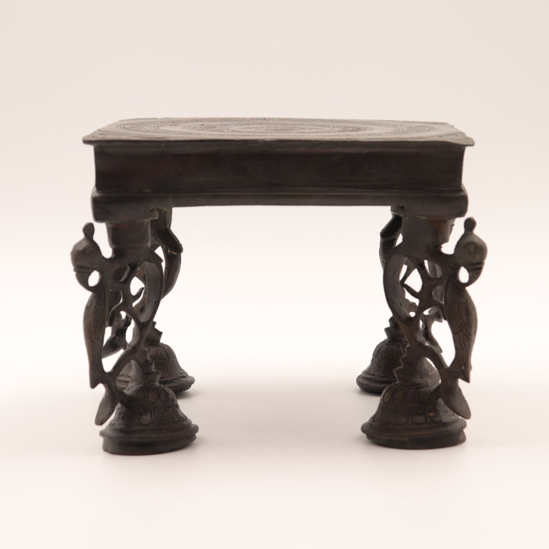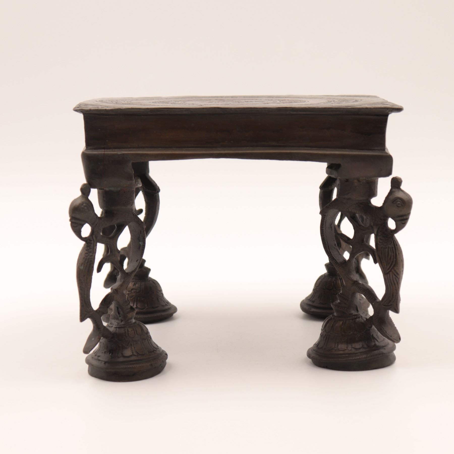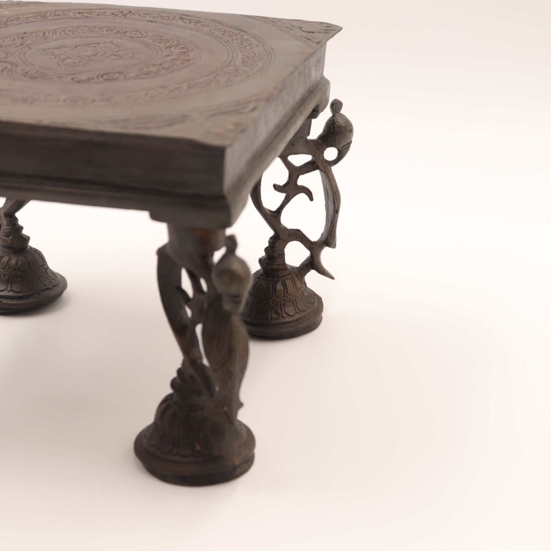 Cast-brass low ritual stand, likely for puja or as a deity/platform stand, rectangular top supported on four sculptural legs, each formed as an openwork peacock with stylised head and long tail, rising from bell-shaped lotus bases. The thick, slightly dished rectangular top is finely engraved with concentric bands of scrolling foliage and geometric borders around a central circular medallion. Dark brown patina overall. Probably North or South India, mid–20th century, made in solid cast brass with hand-chased detailing, intended for supporting ritual objects, lamps or small icons, and now also suitable as a display stand. Condition: overall good, solid condition with honest age wear; surface with scattered small nicks, light scratches and casting imperfections, particularly along the underside and edges; patina uneven with areas of lighter brass showing on some high points; minor bending irregularities consistent with hand casting; stand sits essentially level and stable; no obvious cracks, breaks or repairs observed. Height approx. 5 3/4 in.; top approx. 7 1/2 in. x 5 1/2 in.