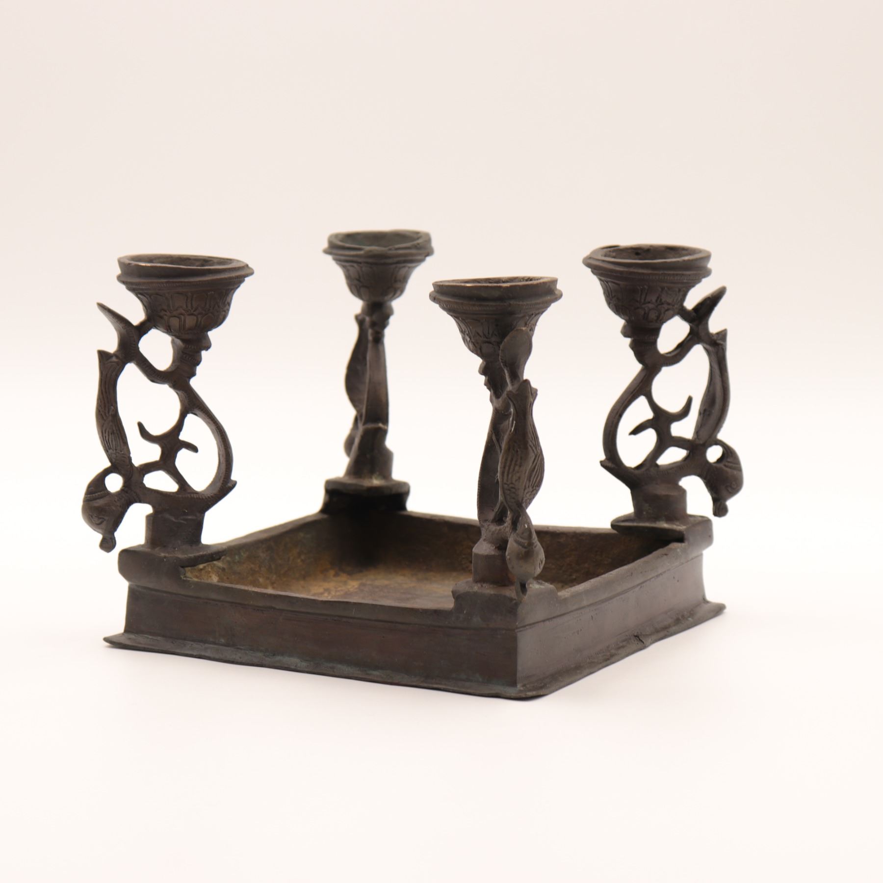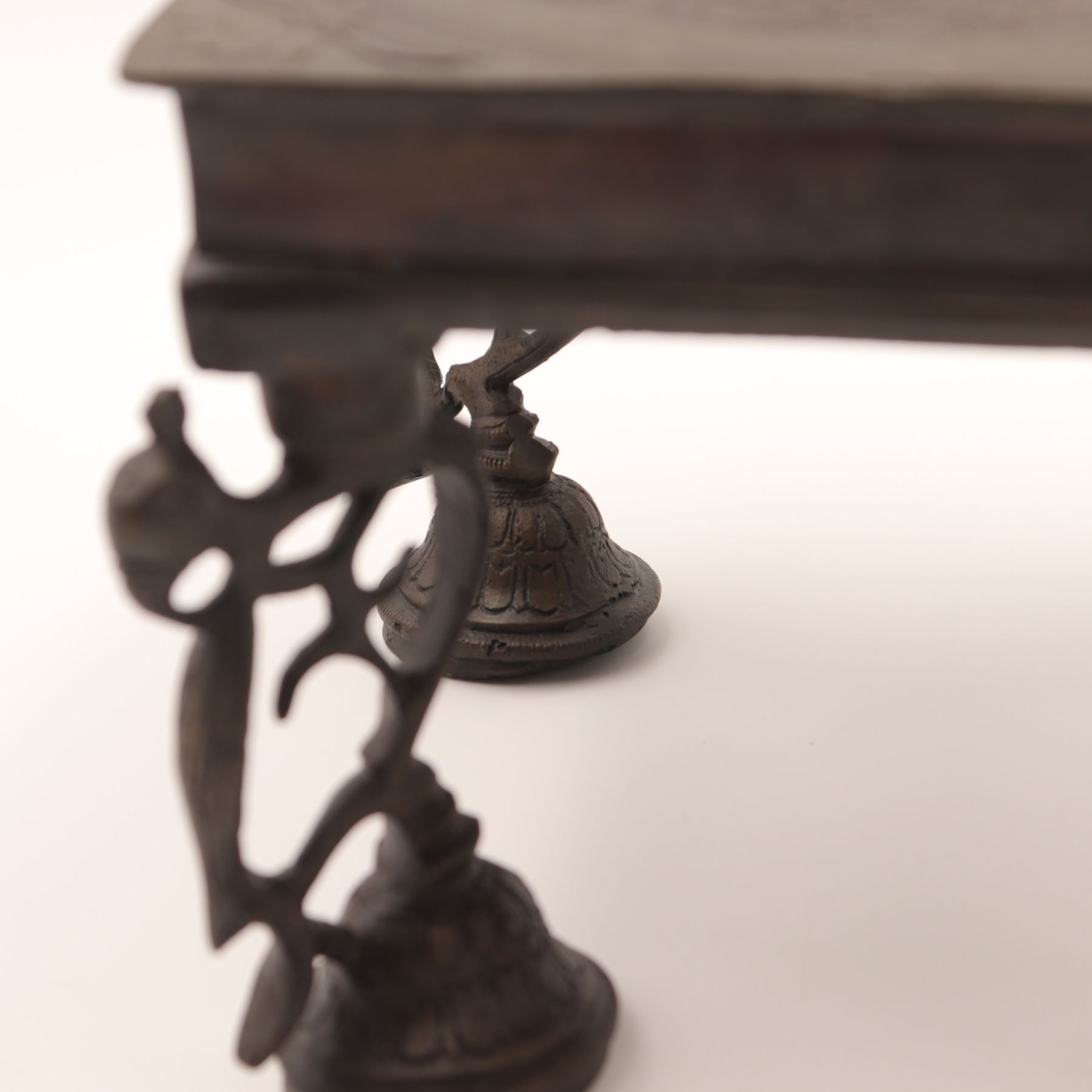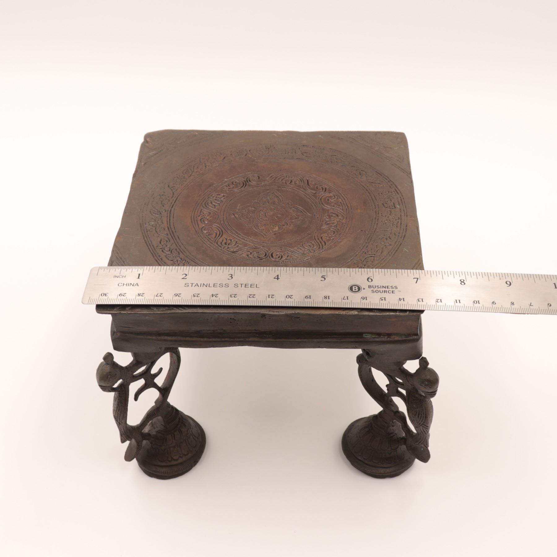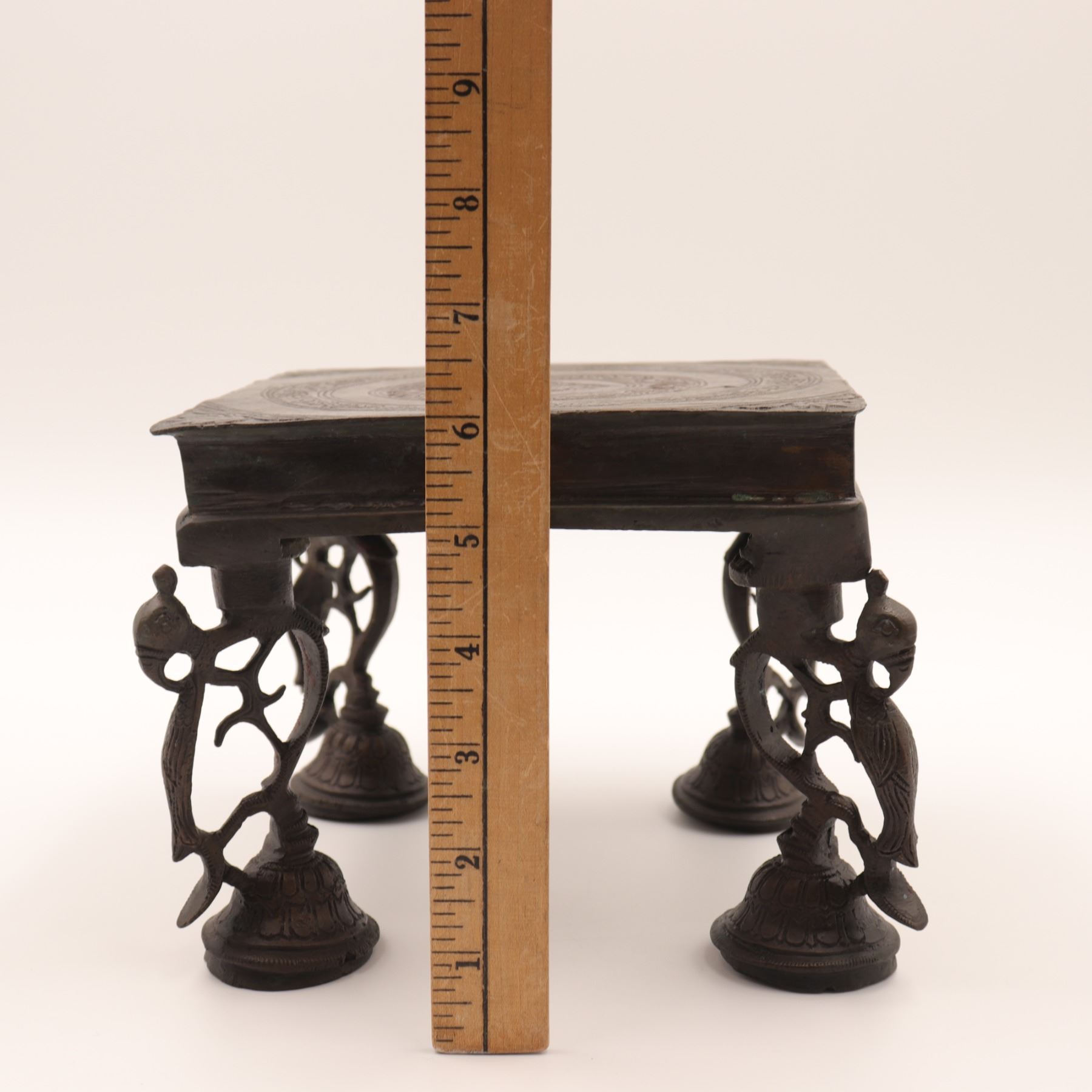 Cast-brass low ritual stand, likely for puja or as a deity/platform stand, rectangular top supported on four sculptural legs, each formed as an openwork peacock with stylised head and long tail, rising from bell-shaped lotus bases. The thick, slightly dished rectangular top is finely engraved with concentric bands of scrolling foliage and geometric borders around a central circular medallion. Dark brown patina overall. Probably North or South India, mid–20th century, made in solid cast brass with hand-chased detailing, intended for supporting ritual objects, lamps or small icons, and now also suitable as a display stand. Condition: overall good, solid condition with honest age wear; surface with scattered small nicks, light scratches and casting imperfections, particularly along the underside and edges; patina uneven with areas of lighter brass showing on some high points; minor bending irregularities consistent with hand casting; stand sits essentially level and stable; no obvious cracks, breaks or repairs observed. Height approx. 5 3/4 in.; top approx. 7 1/2 in. x 5 1/2 in.