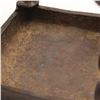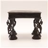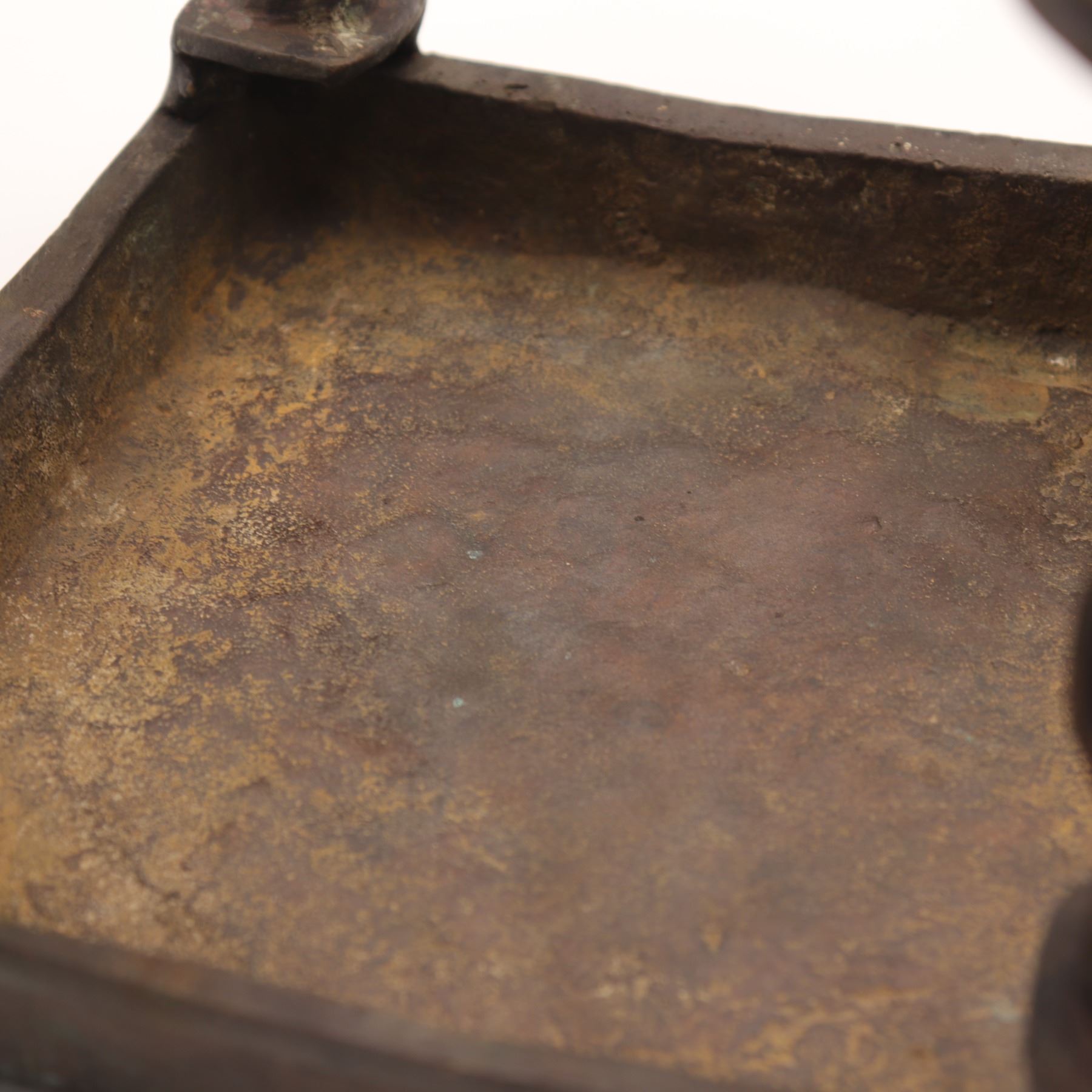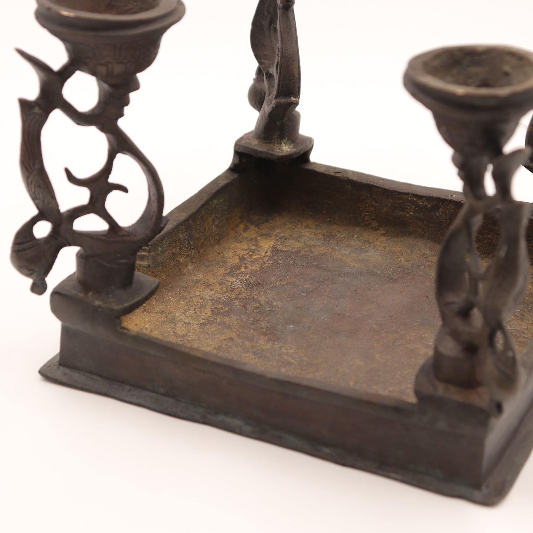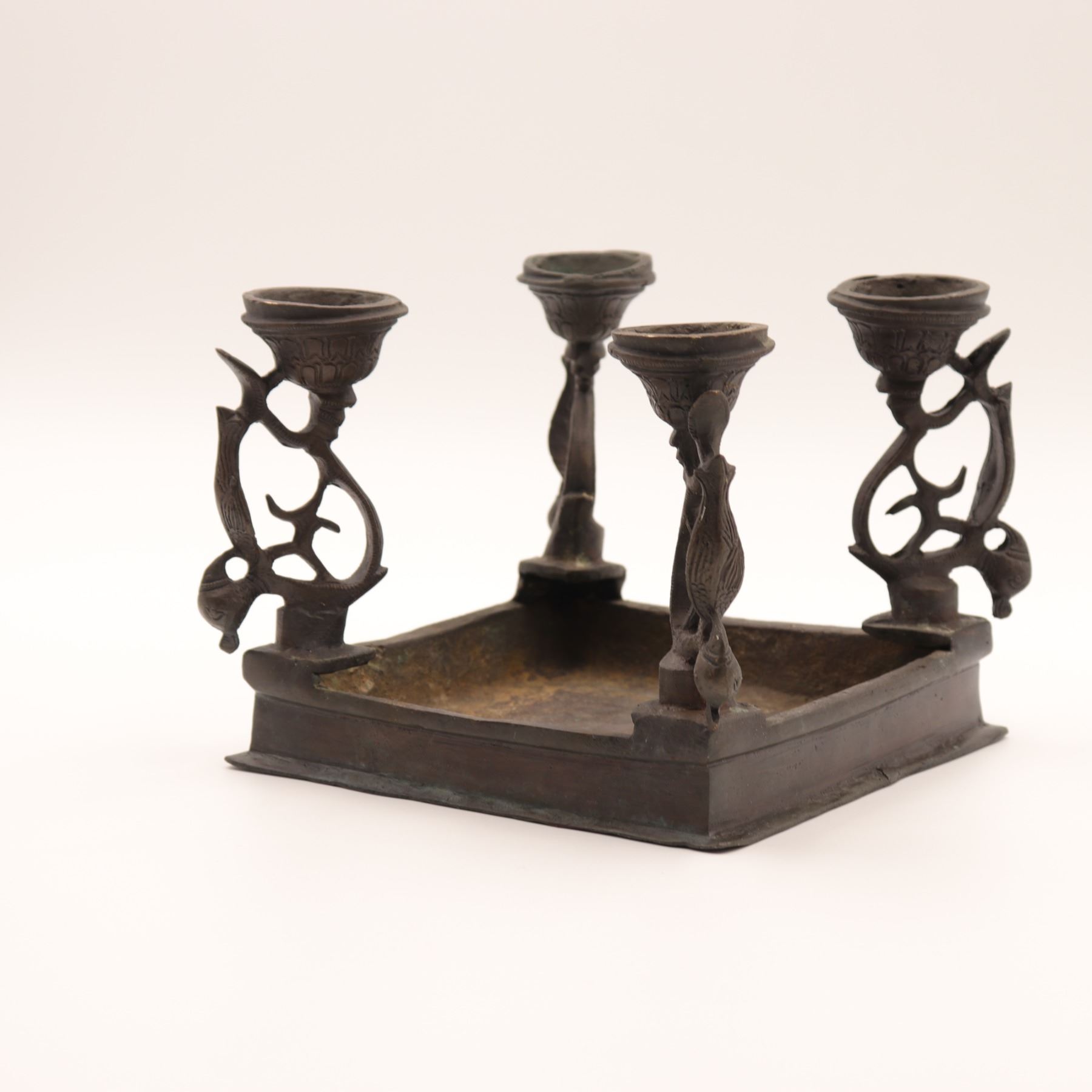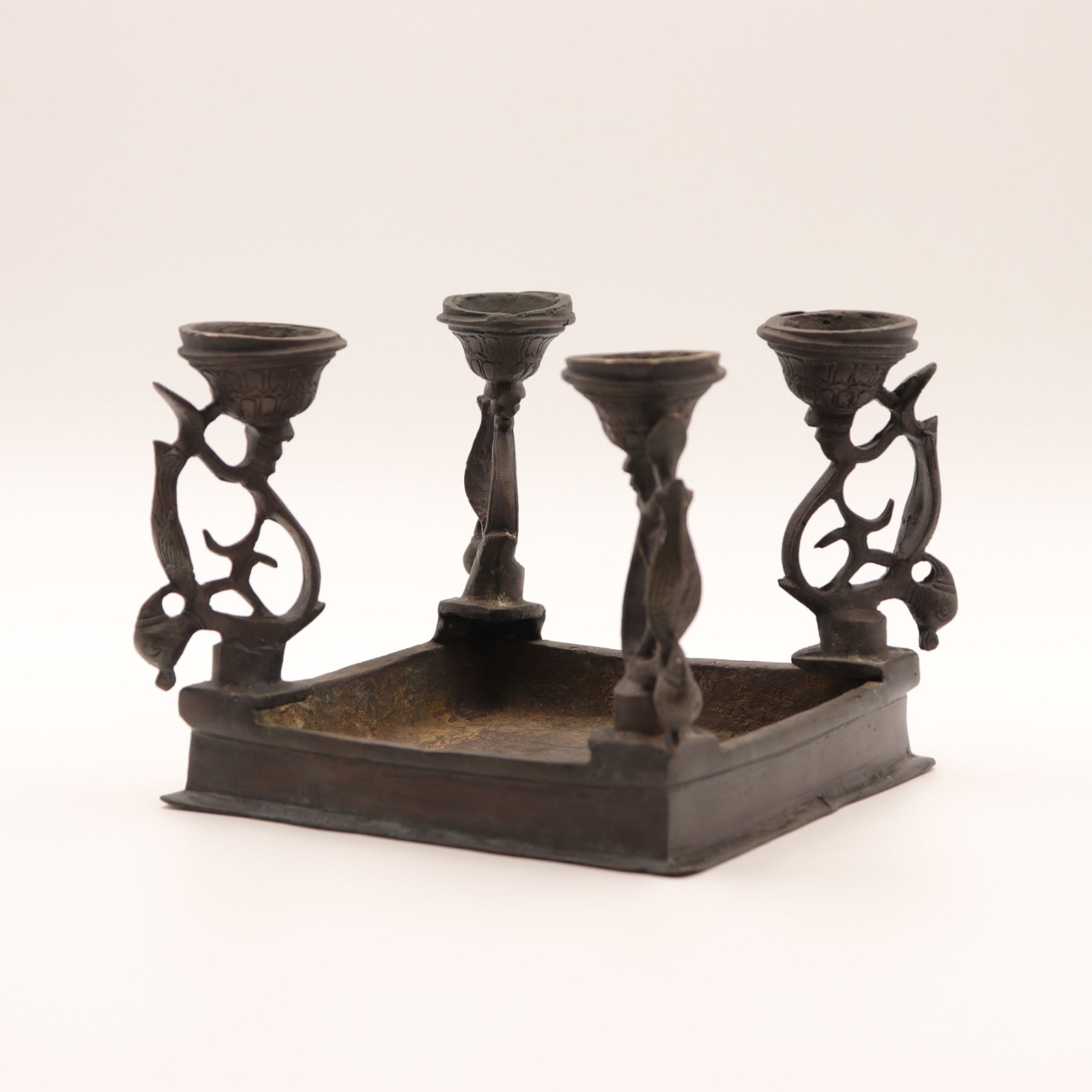 Cast-brass low ritual stand, likely for puja or as a deity/platform stand, rectangular top supported on four sculptural legs, each formed as an openwork peacock with stylised head and long tail, rising from bell-shaped lotus bases. The thick, slightly dished rectangular top is finely engraved with concentric bands of scrolling foliage and geometric borders around a central circular medallion. Dark brown patina overall. Probably North or South India, mid–20th century, made in solid cast brass with hand-chased detailing, intended for supporting ritual objects, lamps or small icons, and now also suitable as a display stand. Condition: overall good, solid condition with honest age wear; surface with scattered small nicks, light scratches and casting imperfections, particularly along the underside and edges; patina uneven with areas of lighter brass showing on some high points; minor bending irregularities consistent with hand casting; stand sits essentially level and stable; no obvious cracks, breaks or repairs observed. Height approx. 5 3/4 in.; top approx. 7 1/2 in. x 5 1/2 in.