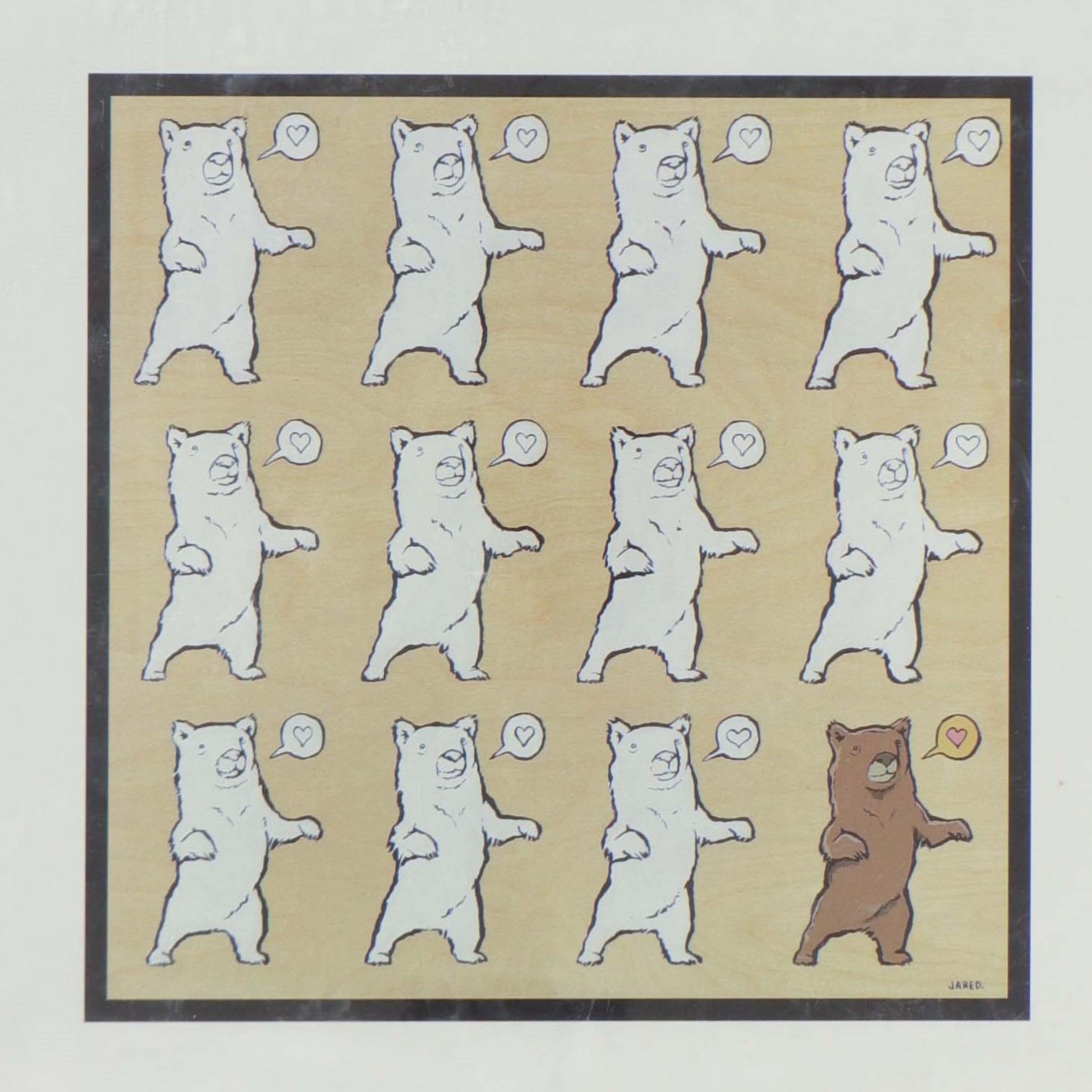 Medium: inkjet print on paper (unframed within protective wrap). Size: ~49 × 33 cm. A contemporary graphic work featuring a repeated grid of stylized white bears with one offsetting dark bear, playing on visual rhythm, variation, and the viewer’s recognition of pattern. The title It Bears Repeating adds a witty textual pun to the formal repetition. Jared Robinson is a Canadian contemporary printmaker and designer whose work frequently explores repetition, humour, and the boundaries between fine art and graphic design. His art engages with pop culture while retaining a minimalist, poster-like quality, making it well-suited both for gallery presentation and interior décor. Robinson has been included in regional printmaking exhibitions and his works circulate through contemporary Canadian art fairs and university print workshops.
