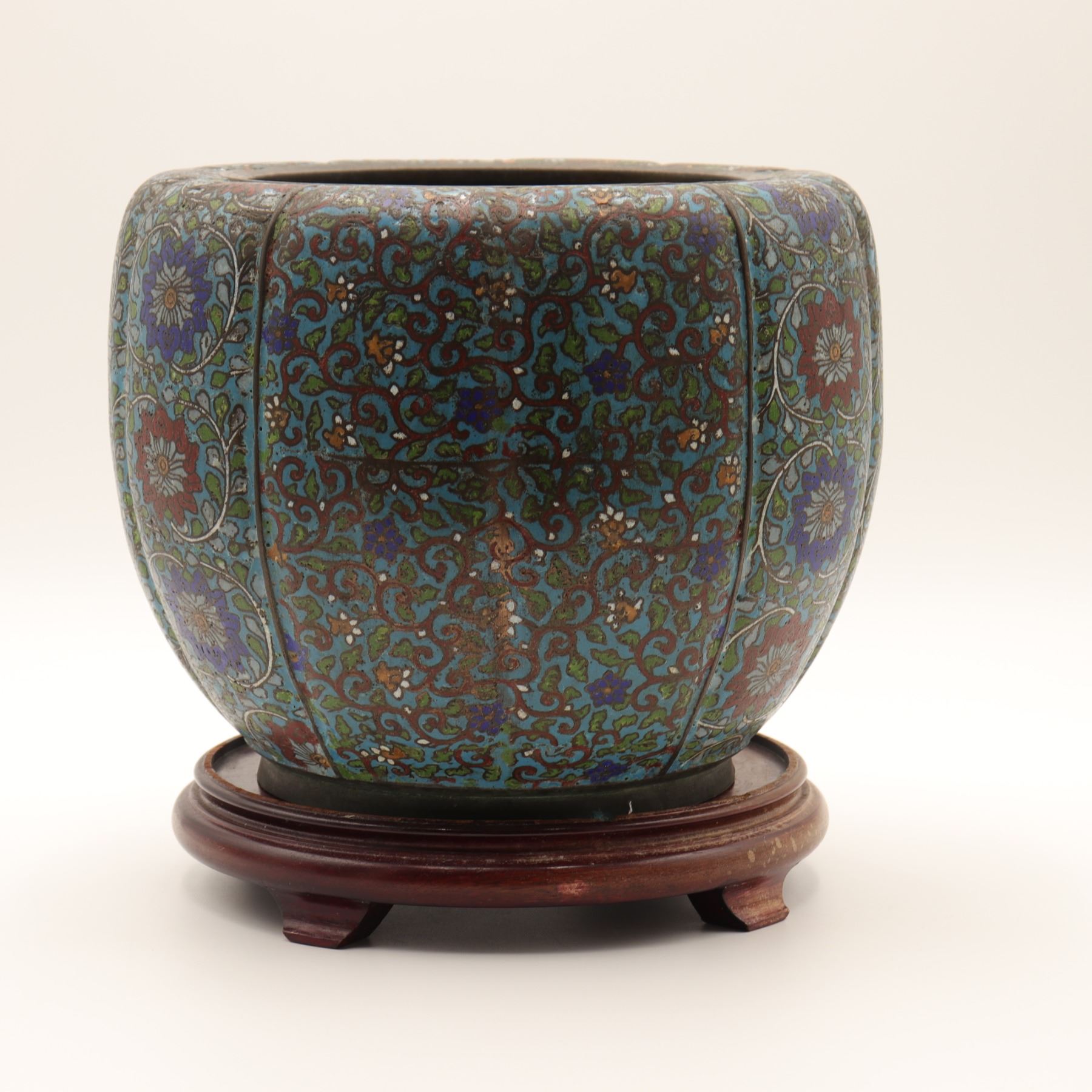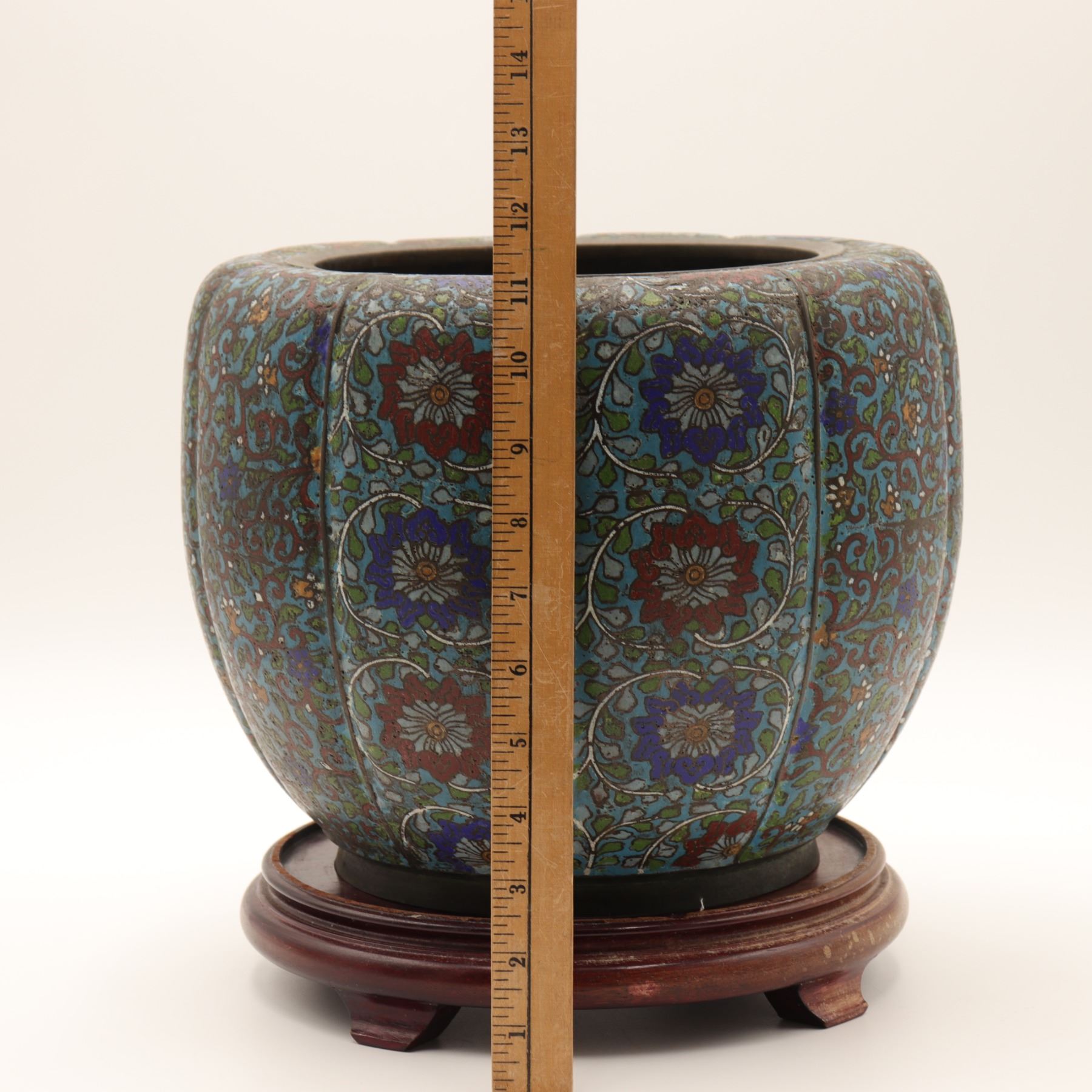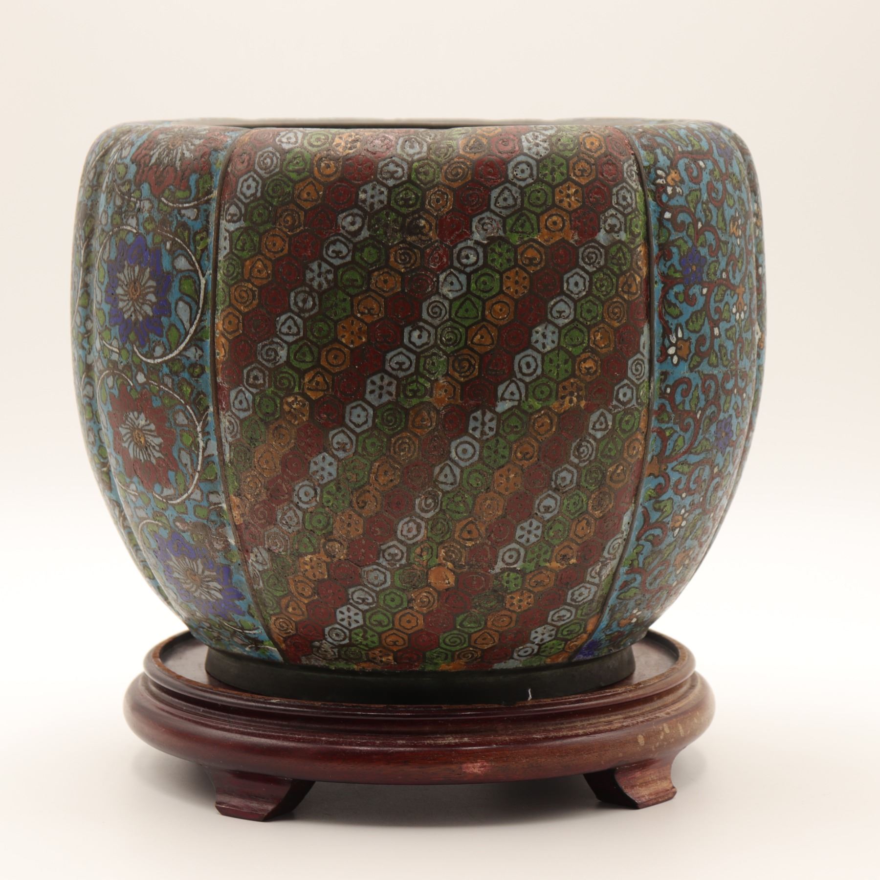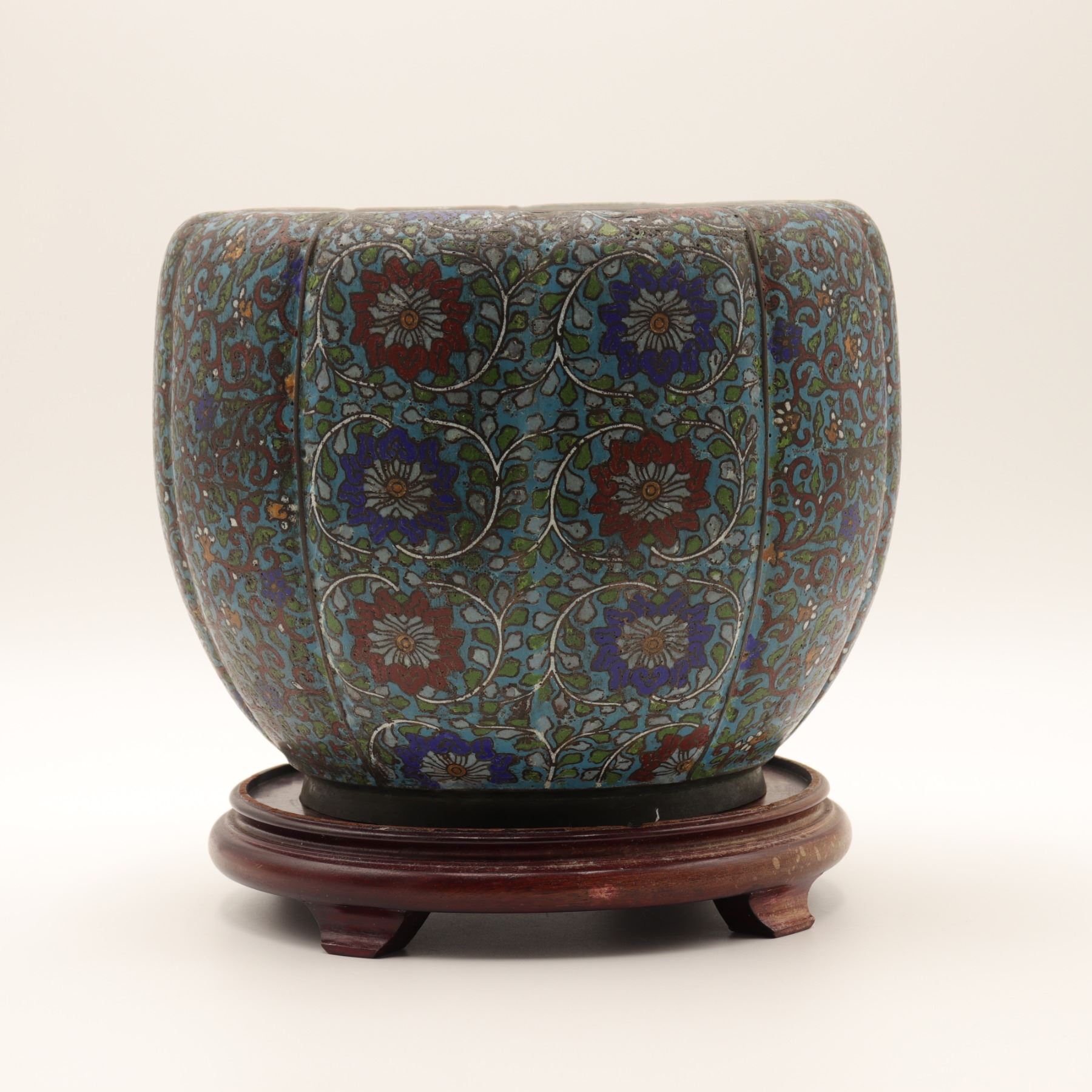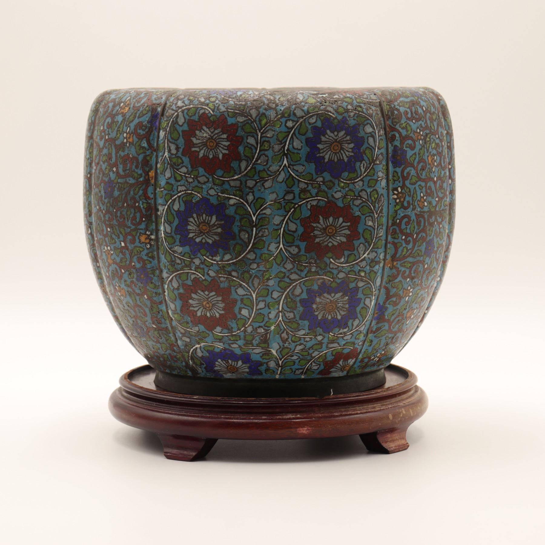 Substantial Middle Eastern cloisonné enamel on metal vessel of lobed form, likely intended as an incense burner or brazier, now suitable as a small jardinière or flower pot, decorated in alternating panels of dense floral scrollwork and hexagonal millefiori-style diaper in rich enamels of turquoise, red, blue, green and white. Raised on a separate carved hardwood stand with four bracket feet. Condition: enamel with scattered areas of wear, small nicks and minor losses at high points and along some panel edges; interior with oxidation and soiling, and missing its original metal insert; stand with scuffs and small edge chips consistent with use. Overall height with stand approx. 11 in., vessel height approx. 8 1/2 in., diameter approx. 11 in.