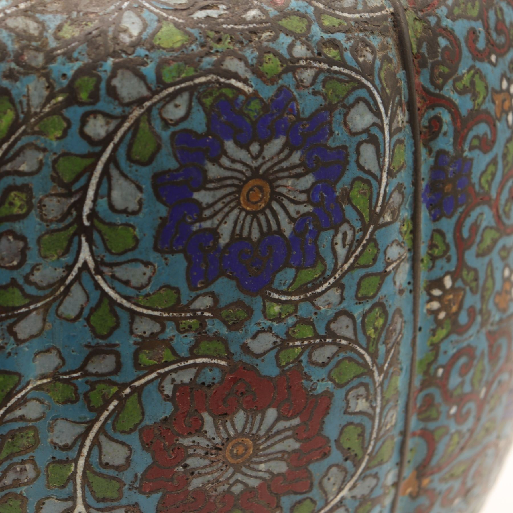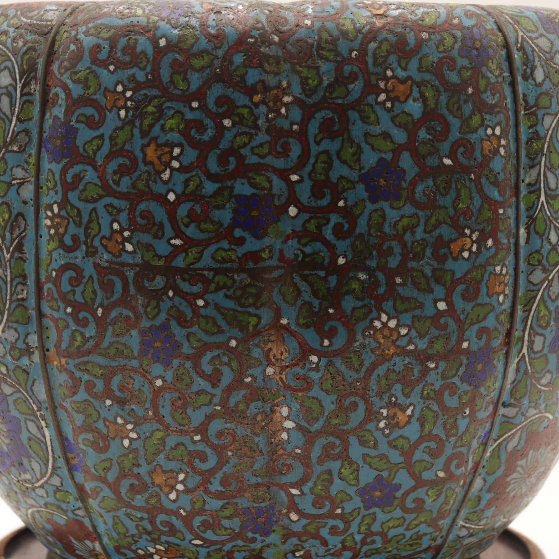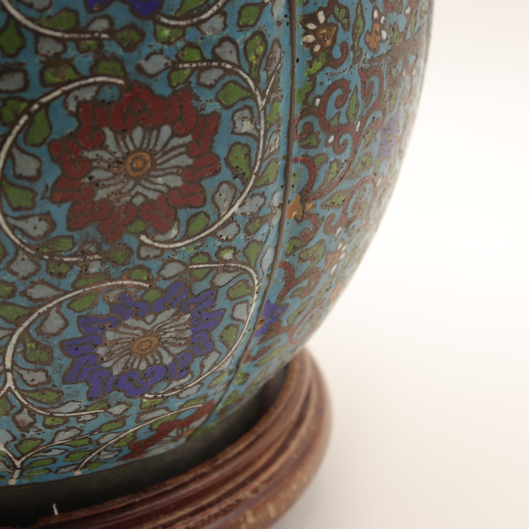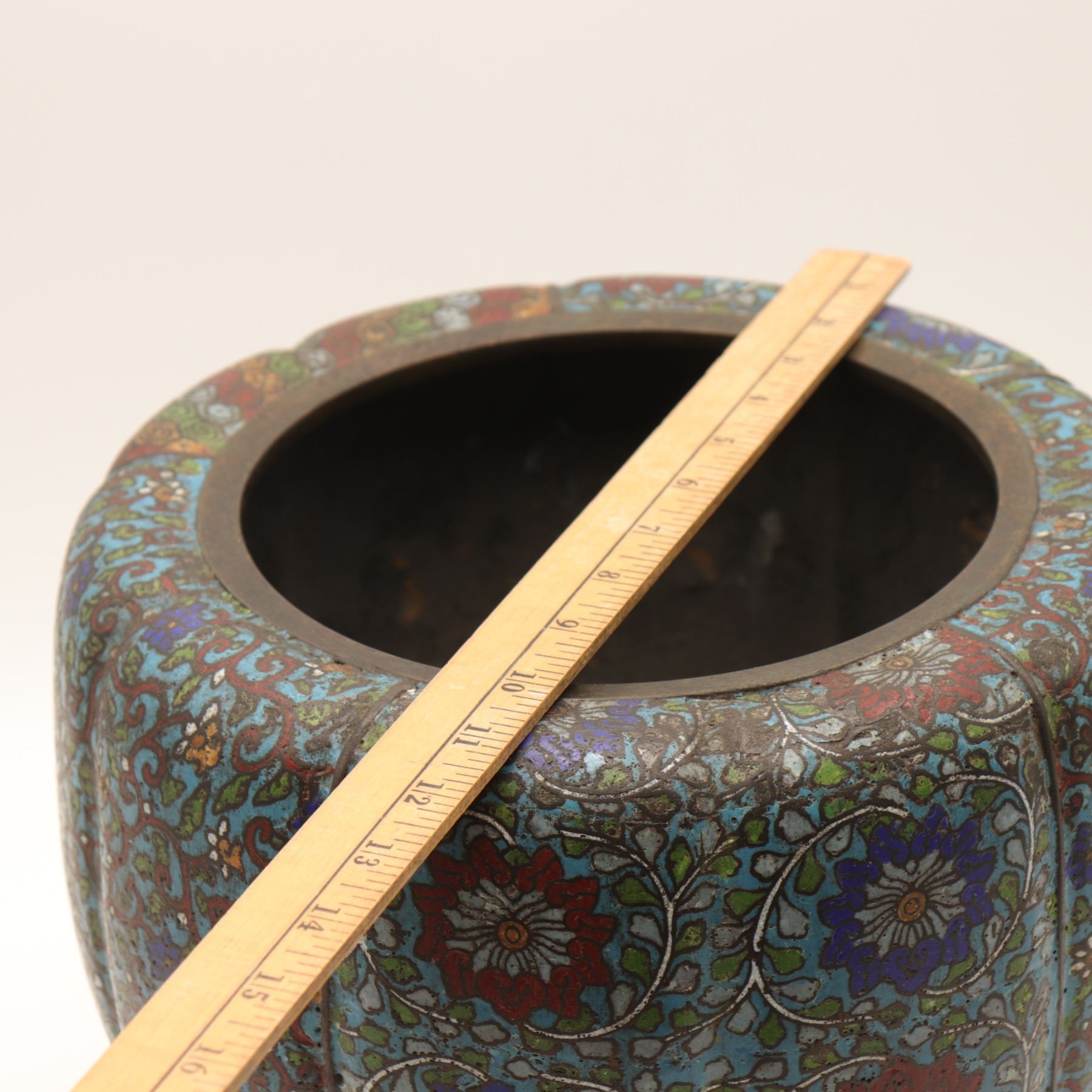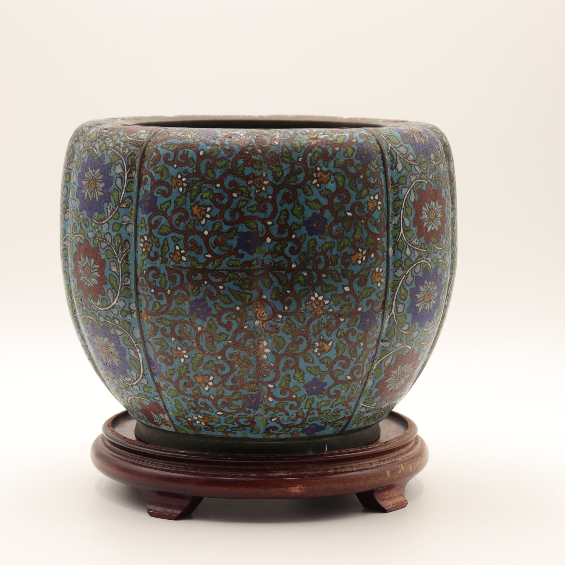 Substantial Middle Eastern cloisonné enamel on metal vessel of lobed form, likely intended as an incense burner or brazier, now suitable as a small jardinière or flower pot, decorated in alternating panels of dense floral scrollwork and hexagonal millefiori-style diaper in rich enamels of turquoise, red, blue, green and white. Raised on a separate carved hardwood stand with four bracket feet. Condition: enamel with scattered areas of wear, small nicks and minor losses at high points and along some panel edges; interior with oxidation and soiling, and missing its original metal insert; stand with scuffs and small edge chips consistent with use. Overall height with stand approx. 11 in., vessel height approx. 8 1/2 in., diameter approx. 11 in.