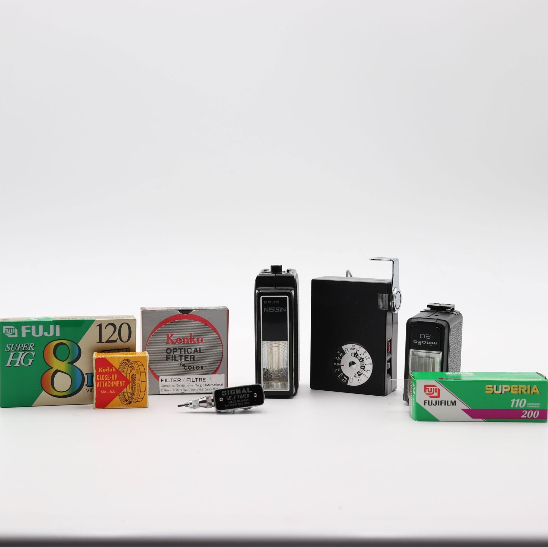 AG-1B flashbulbs; Kenko optical filter; Fuji 8mm video cassette; Kodak self timer)