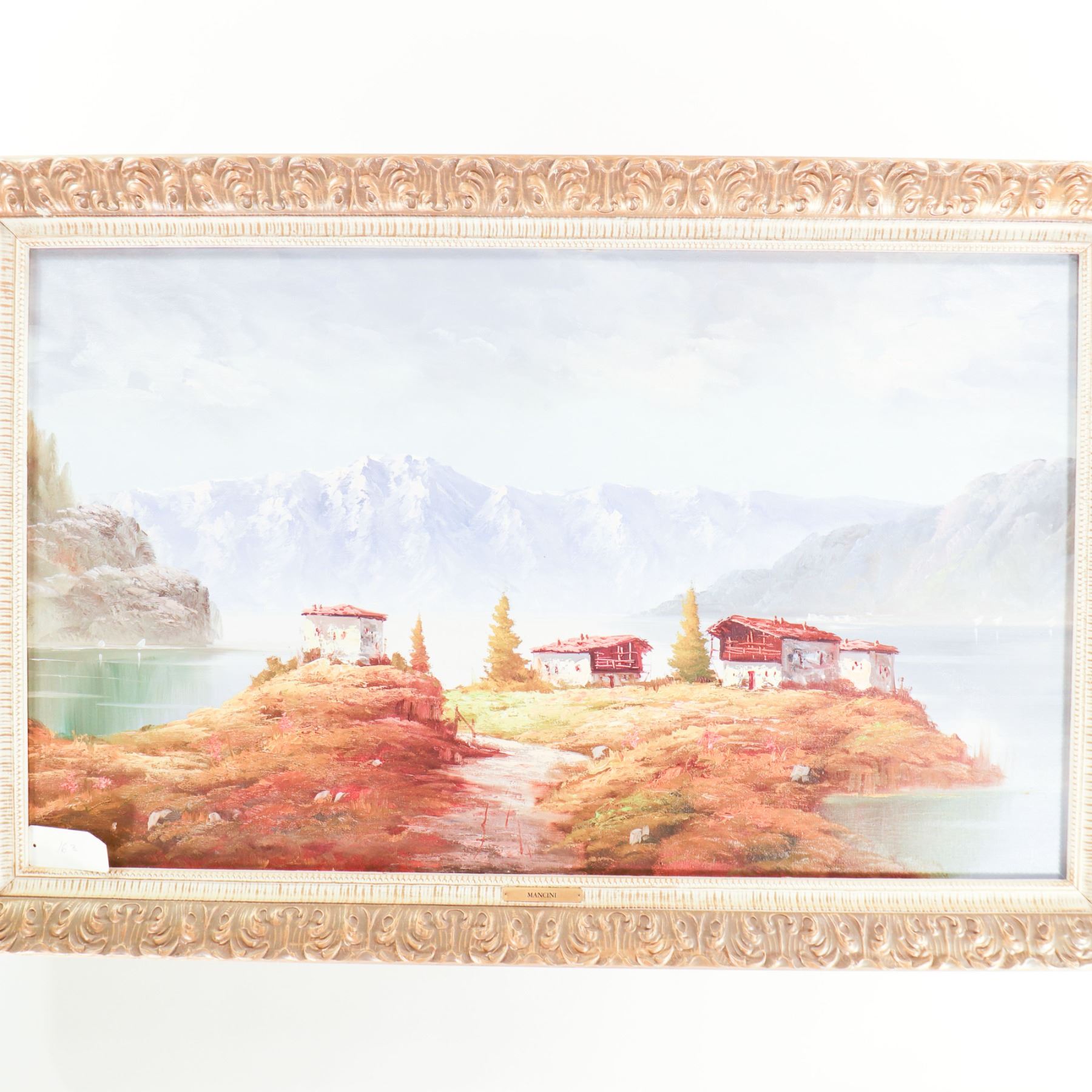 Mancini, Alpine Lake Landscape with Chalets, Oil on Canvas