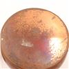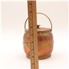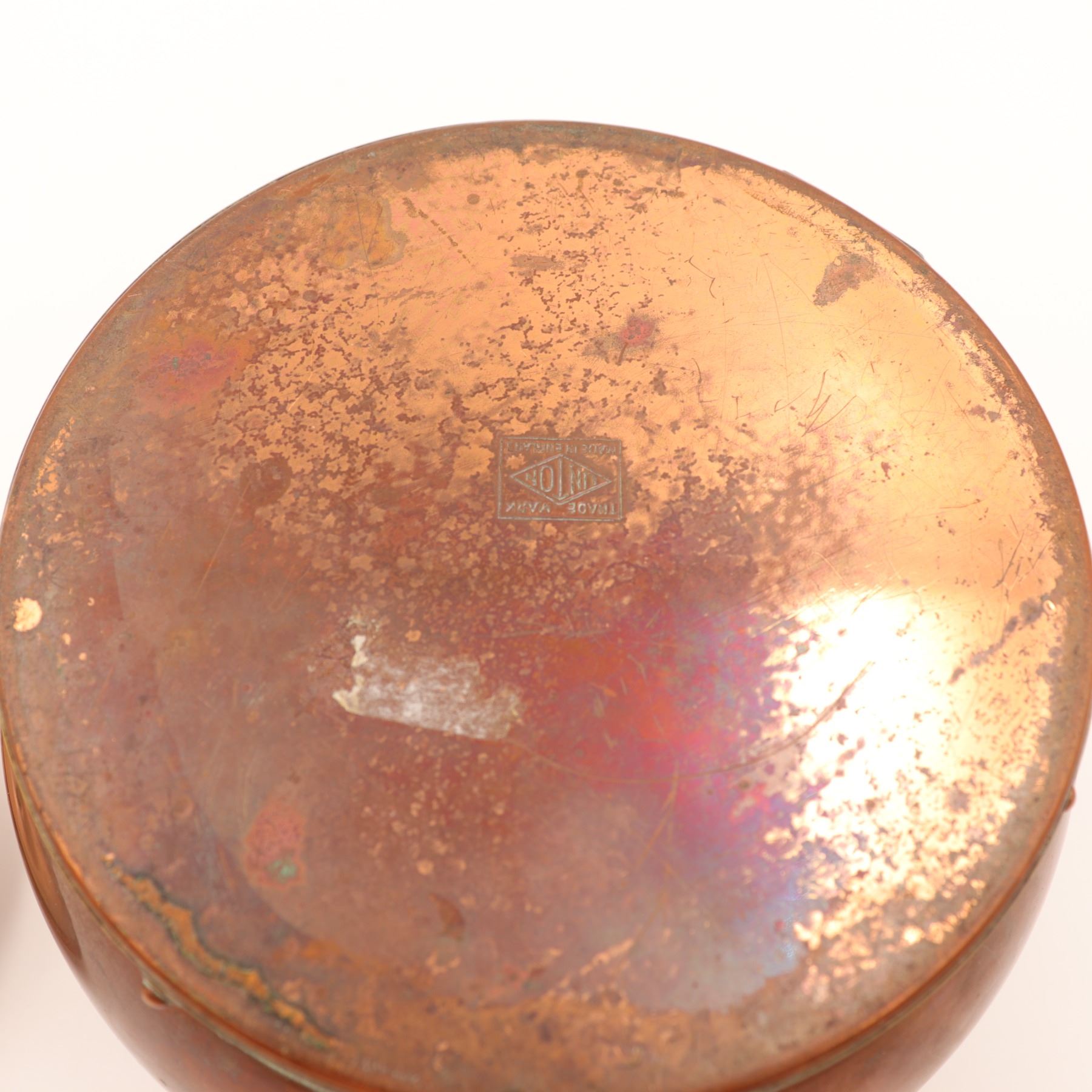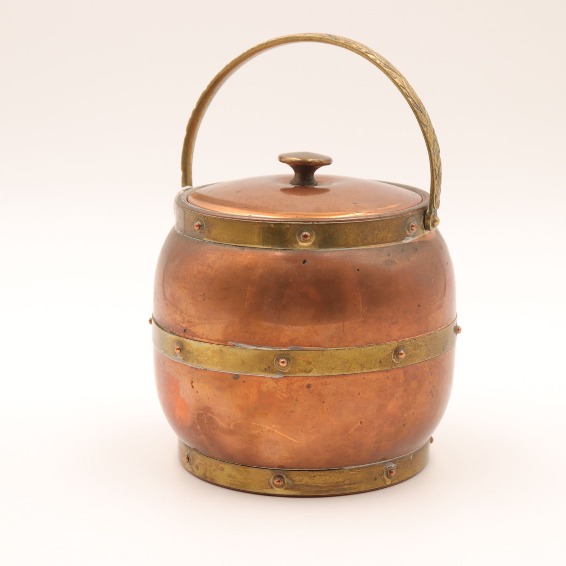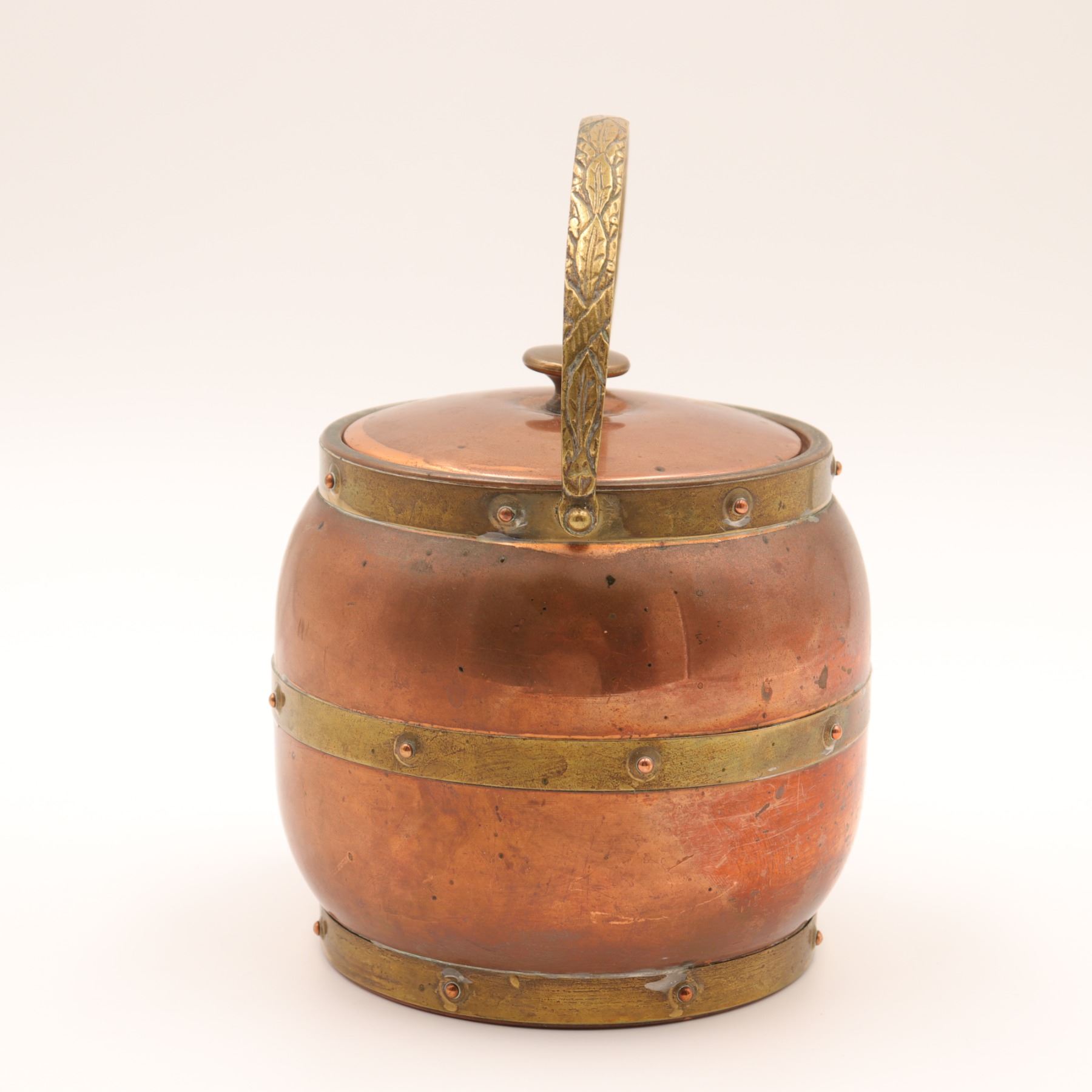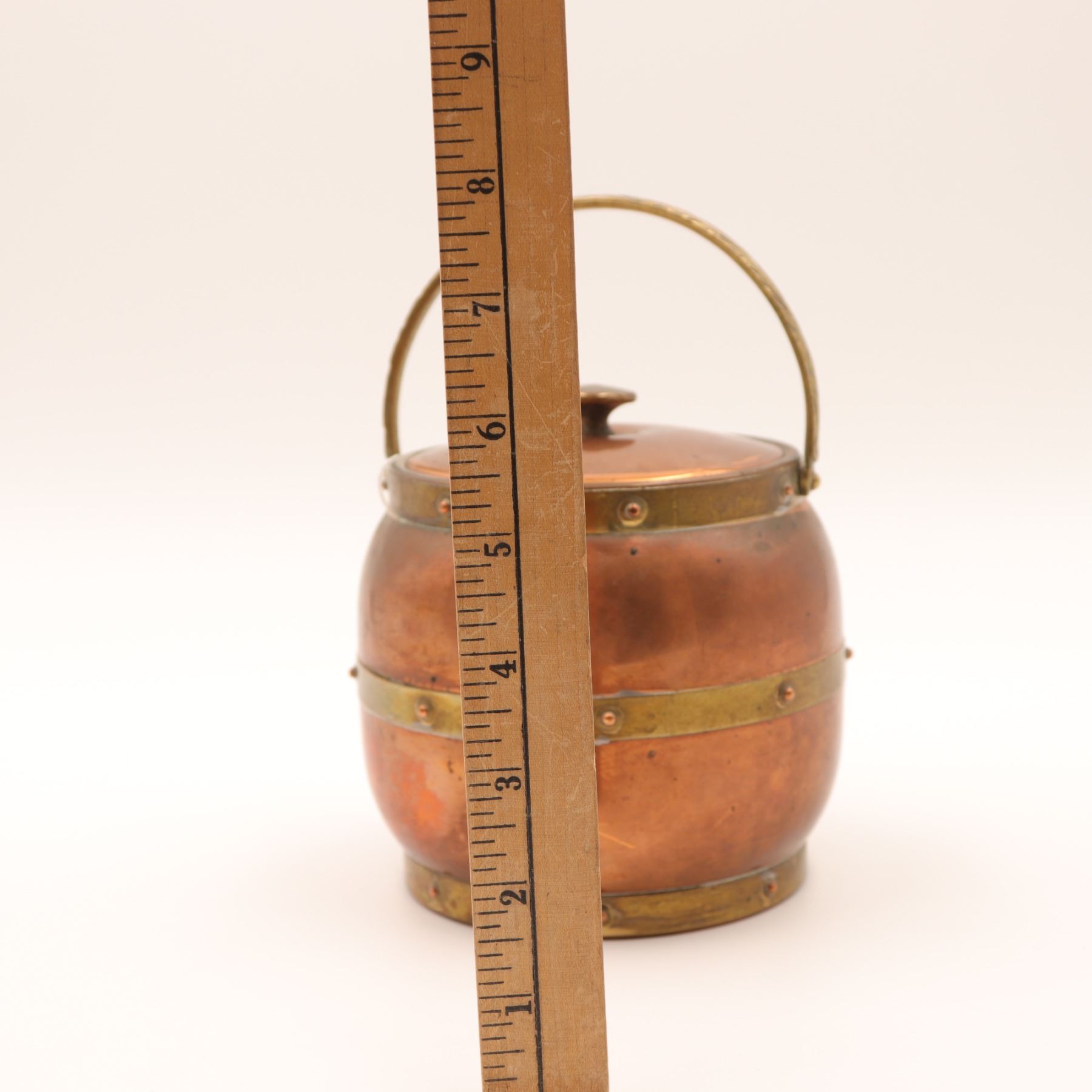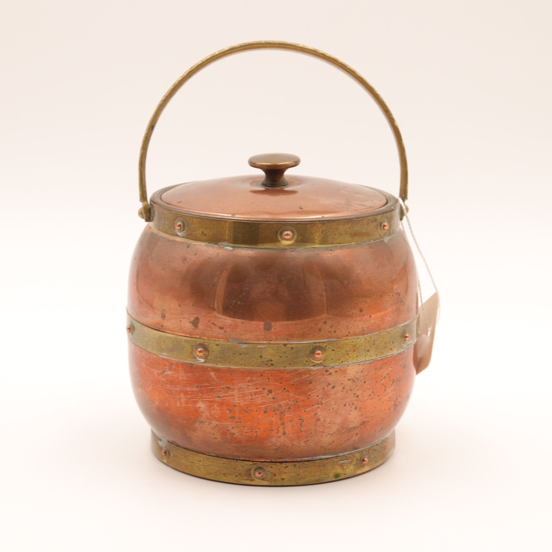 Barrel-form lidded ice bucket in polished copper with brass banding, the body constructed as a coopered barrel with two broad brass straps secured by domed rivet heads and matching brass foot and rim bands. The domed copper lid has a turned knop finial, and the bucket is fitted with a pivoting brass swing handle. Interior retains the original clear removable glass liner, sized to drop neatly within the metal shell. The underside of the base stamped with a diamond-form maker’s mark “TRADEMARK / LINTON / MADE IN ENGLAND”, identifying the maker as Linton. A handsome piece of mid-century English cocktail service, ideal for a home bar. Condition: copper body with overall surface wear, scattered small dents and scratches, and areas of spotting and tarnish consistent with age and use; brass bands and handle with oxidation and patina, some rubbing and minor verdigris around rivets; lid fits well, knob secure; glass liner present and free of cracks or chips, with light internal scratching and clouding from use; base with more pronounced surface wear and toning around the stamped mark. Height to top of lid approx. 6 1/2 in.; height to top of raised handle approx. 9 in.; diameter approx. 5 3/4 in.