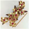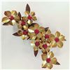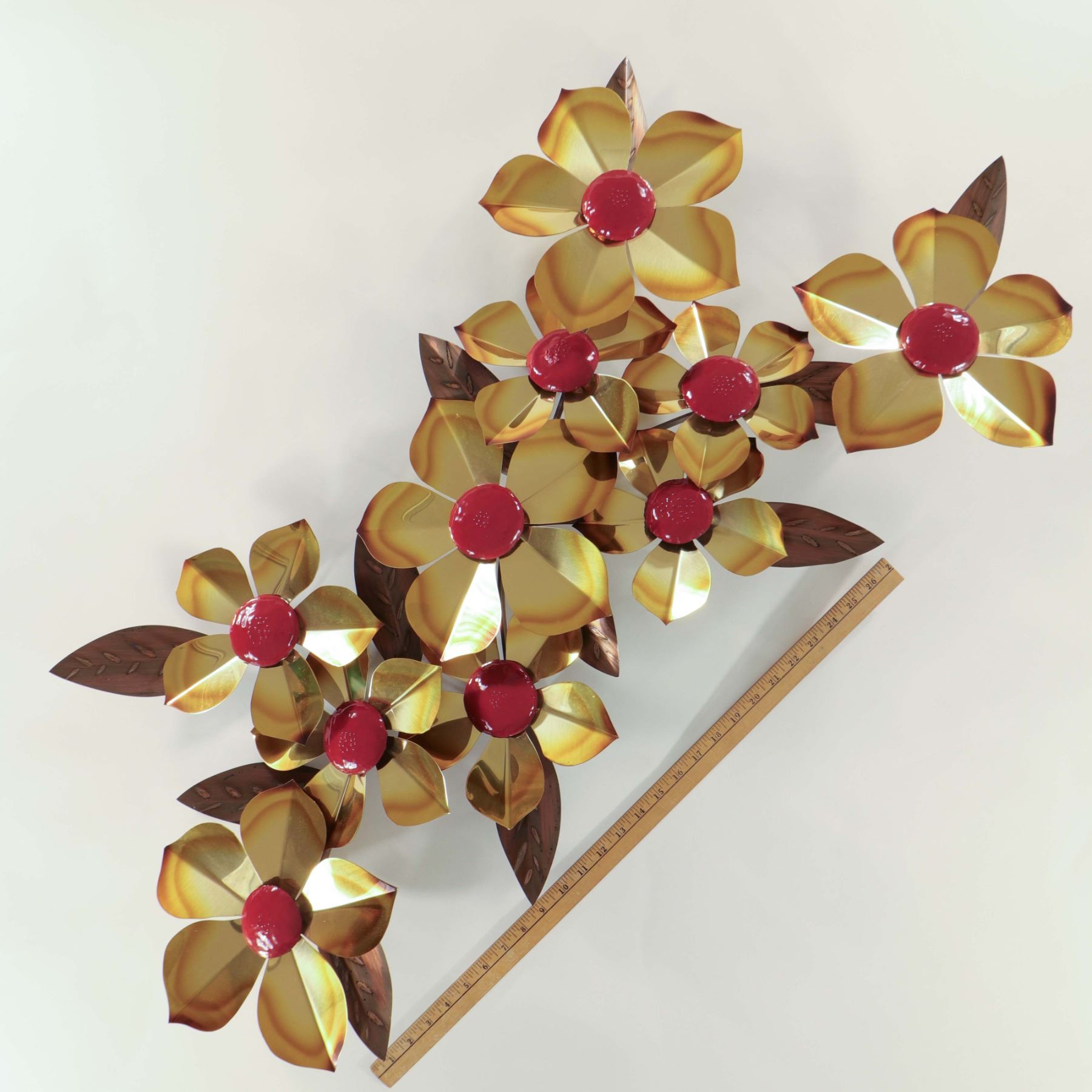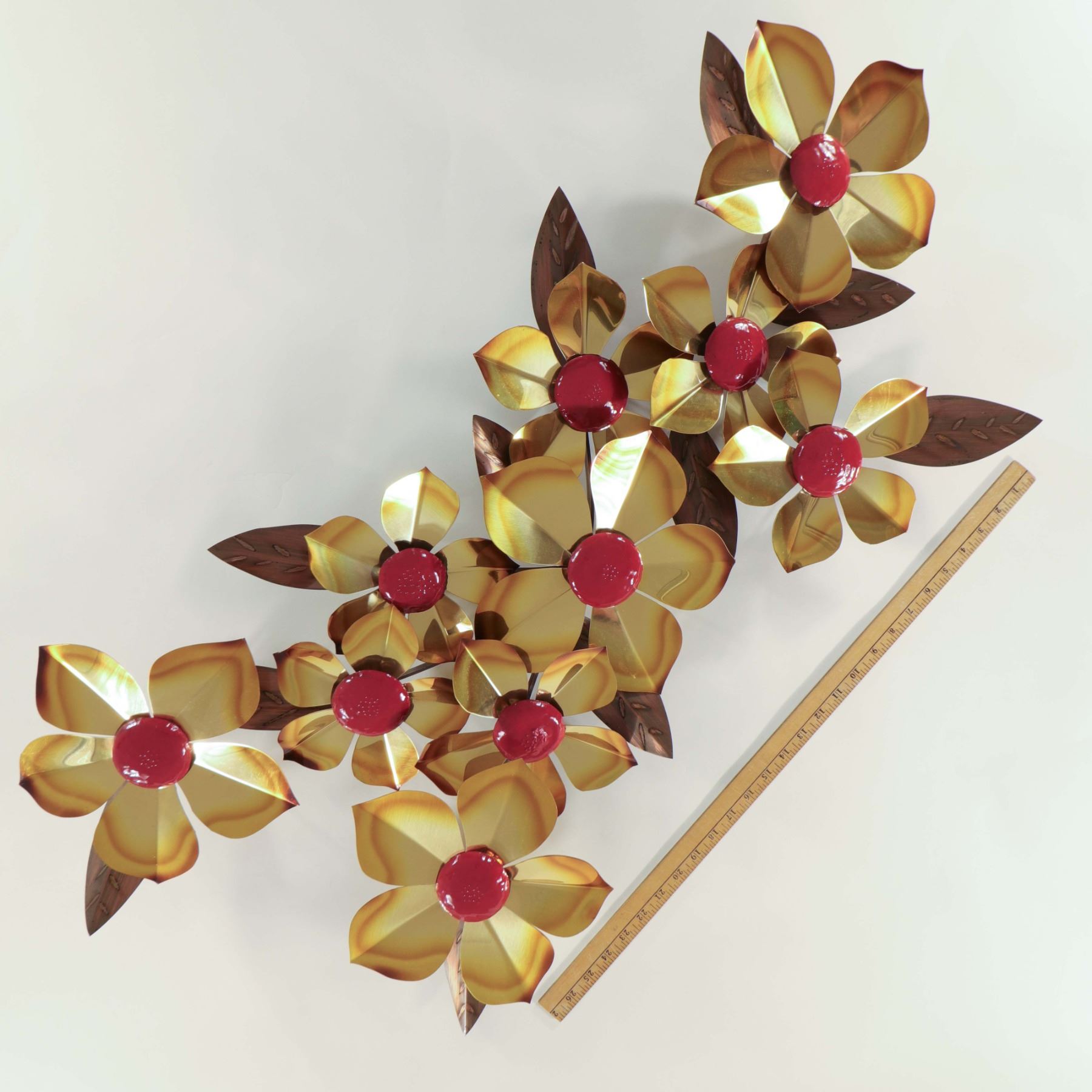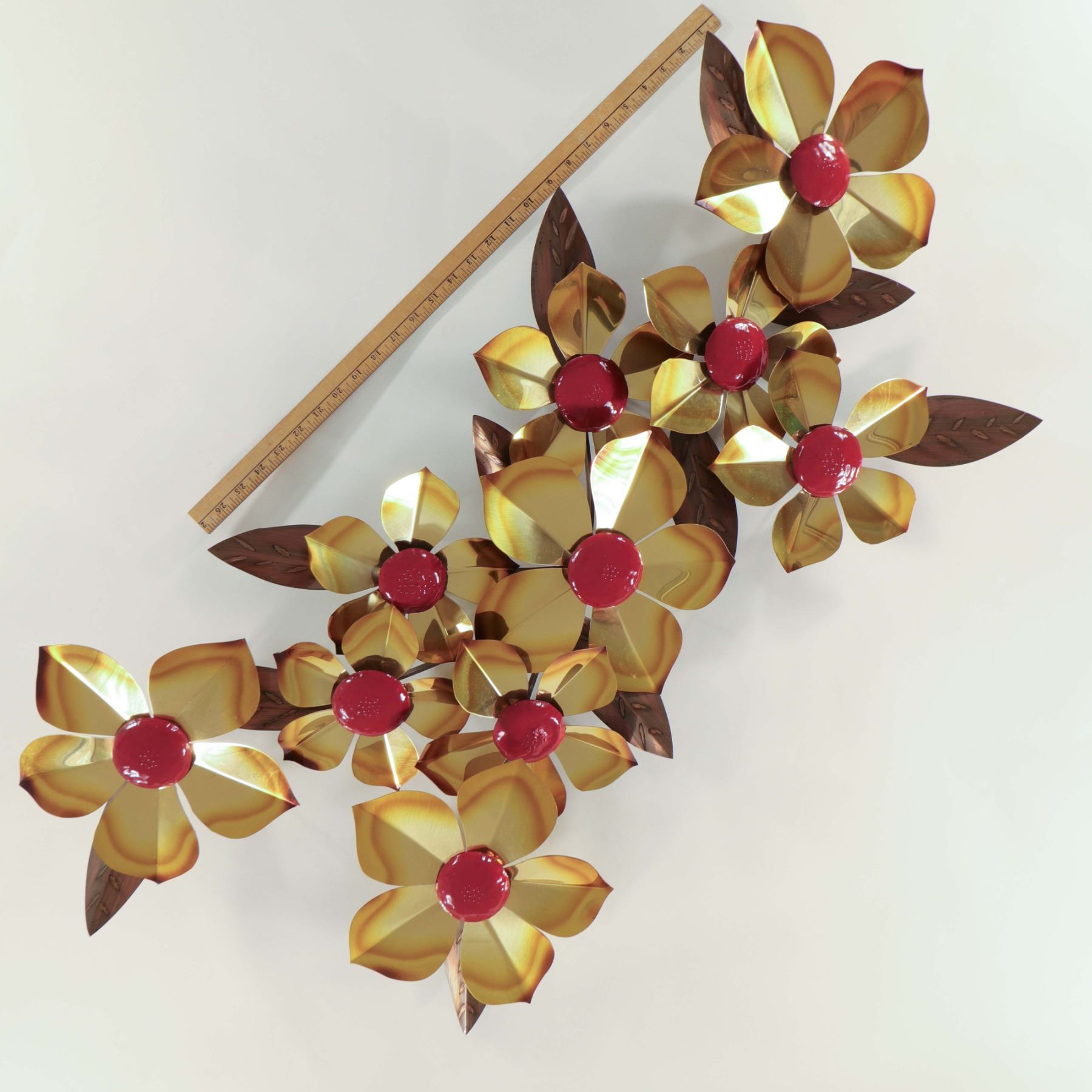 A striking mid-20th century Canadian wall-mounted floral sculpture, crafted by Torch Art Ltd., Edmonton, Alberta (label present). The piece is executed in welded and torch-cut metal, featuring stylized flowers with golden-brass petals and bold red enamel centers, accented by copper-toned leaves. The composition is mounted on a welded metal frame, designed to be hung on the wall as a statement piece. Measuring approx. 38 in. (96 cm) in length, this work exemplifies the Brutalist and Mid-Century Modern decorative style popular in the 1960s–1970s, echoing the aesthetics of Curtis Jere and similar North American studio metal artists. Dimensions: Approx. 38 in. long x 22 in high. Maker: Torch Art Ltd., Edmonton (active mid-20th century). Condition: Very good vintage condition, with light surface wear and patina consistent with age.