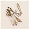 A grouping of 7 antique silver spoons alongside two small silver items (a thimble-like cap and a fluted silver handle). The spoons include examples with English hallmarks (partial visible, including duty marks and maker’s initials), as well as continental silver marks. Styles include fiddle pattern and plain handles, some monogrammed. Together they present a charming mixed lot for collectors or silver dealers.