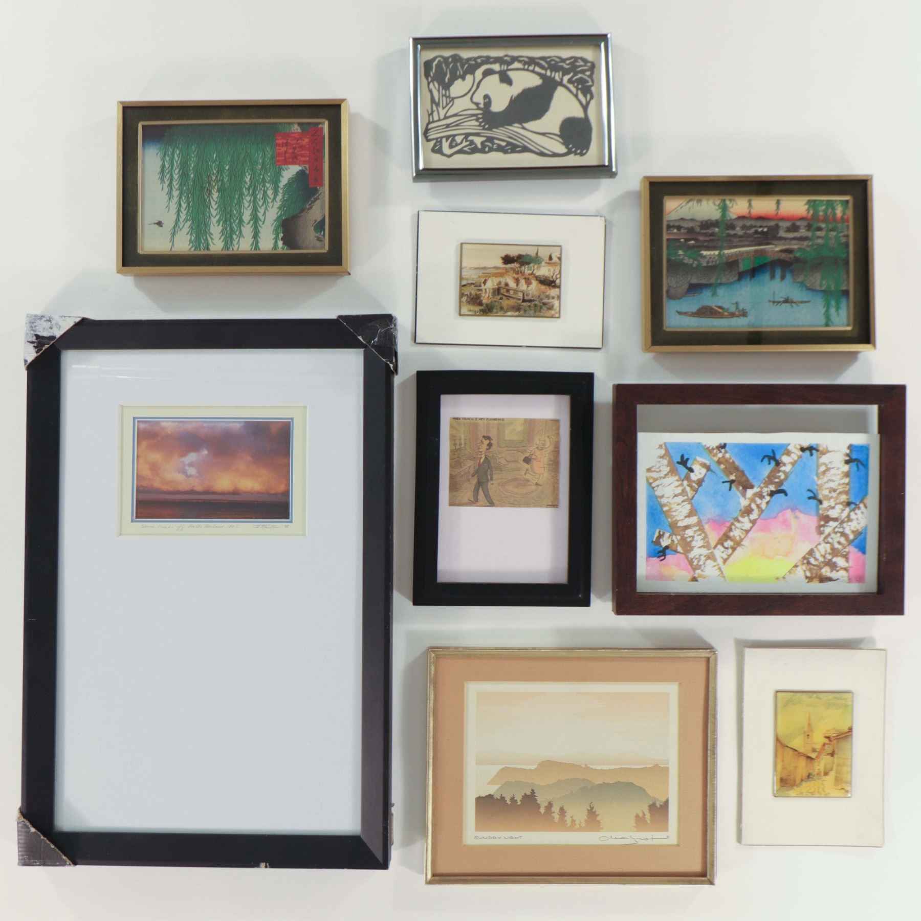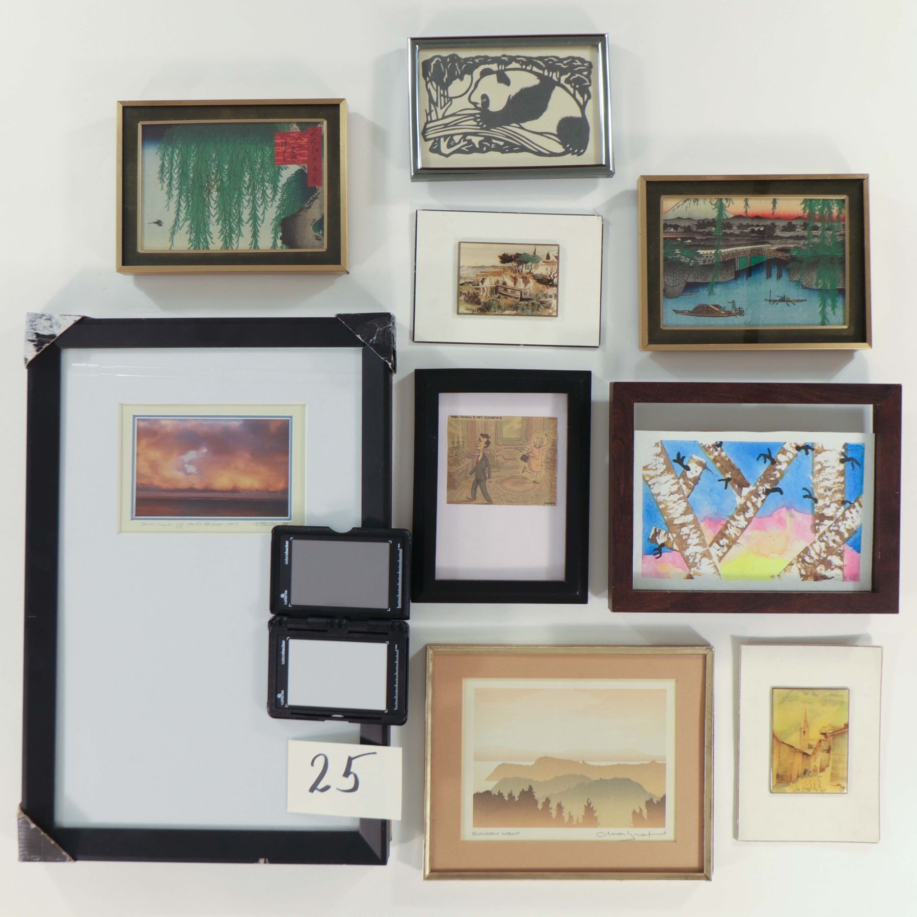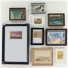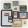 Contents: nine small framed items incl. a Christopher Pratt reproduction print (*Evening Light*), one small original Canadian watercolour (birches with birds, monogrammed), and seven decorative mounted/calendar prints.
