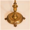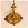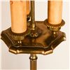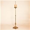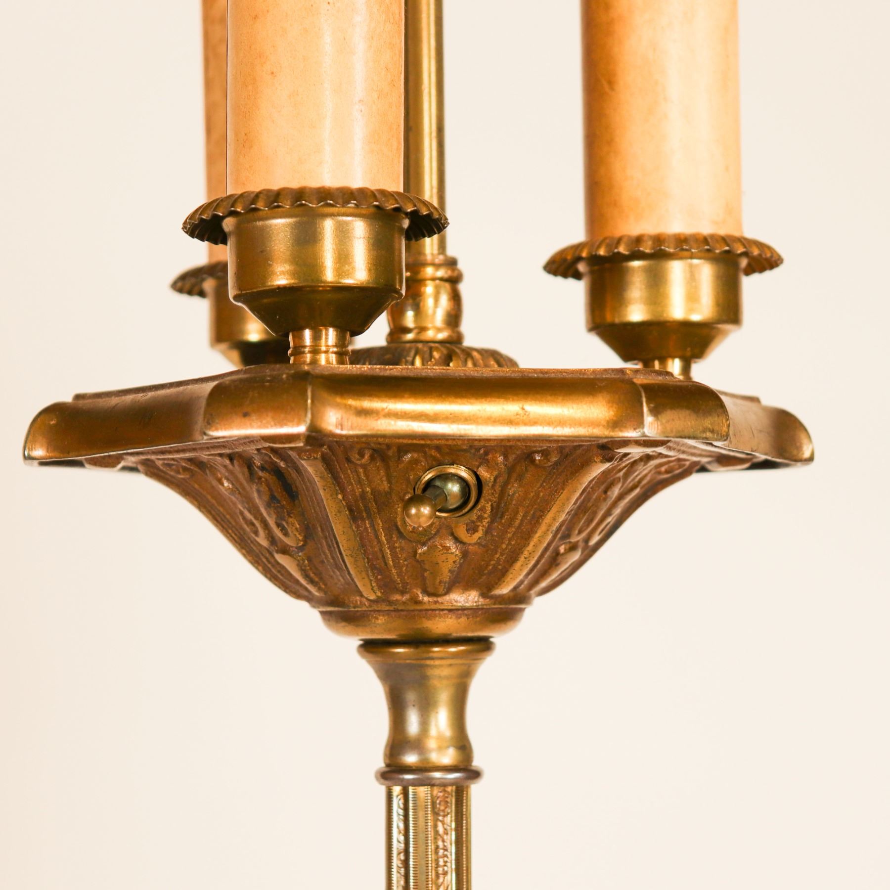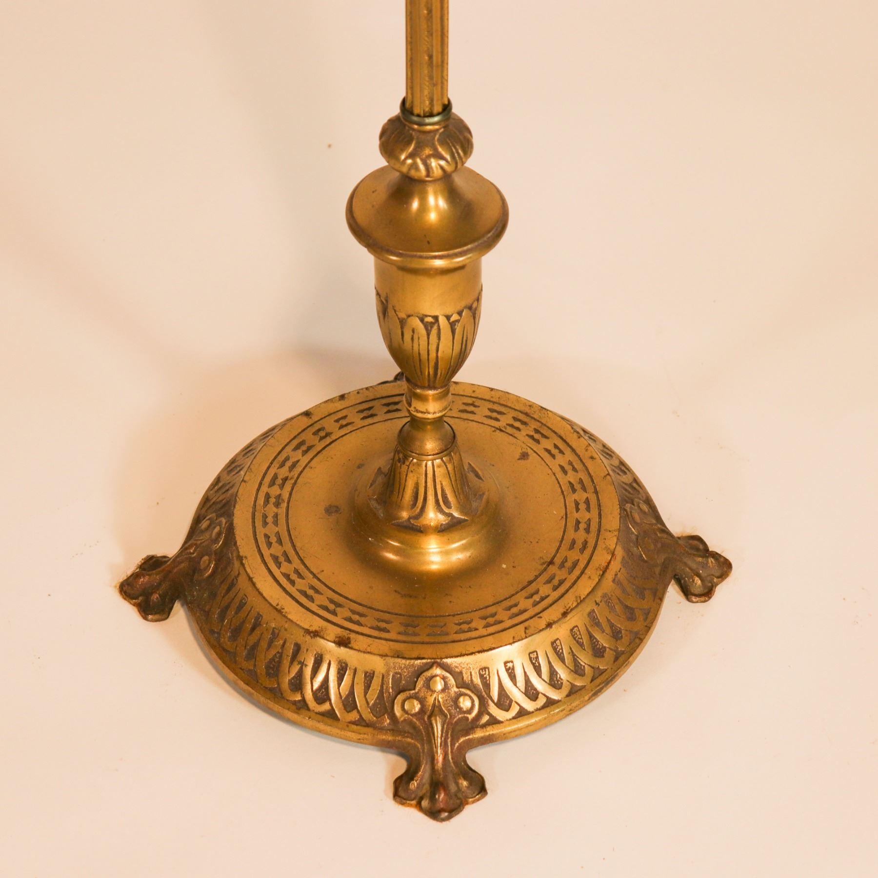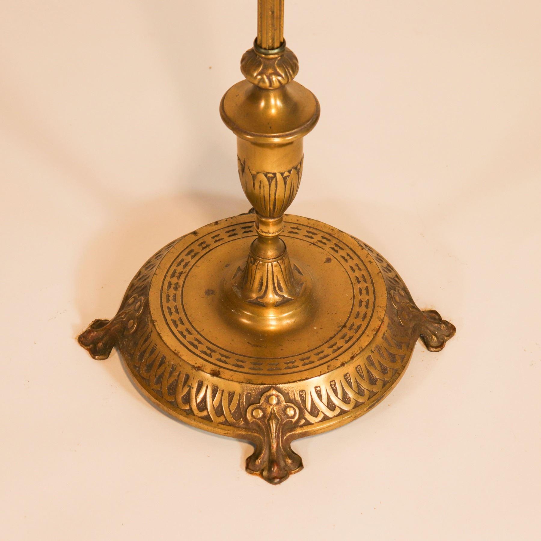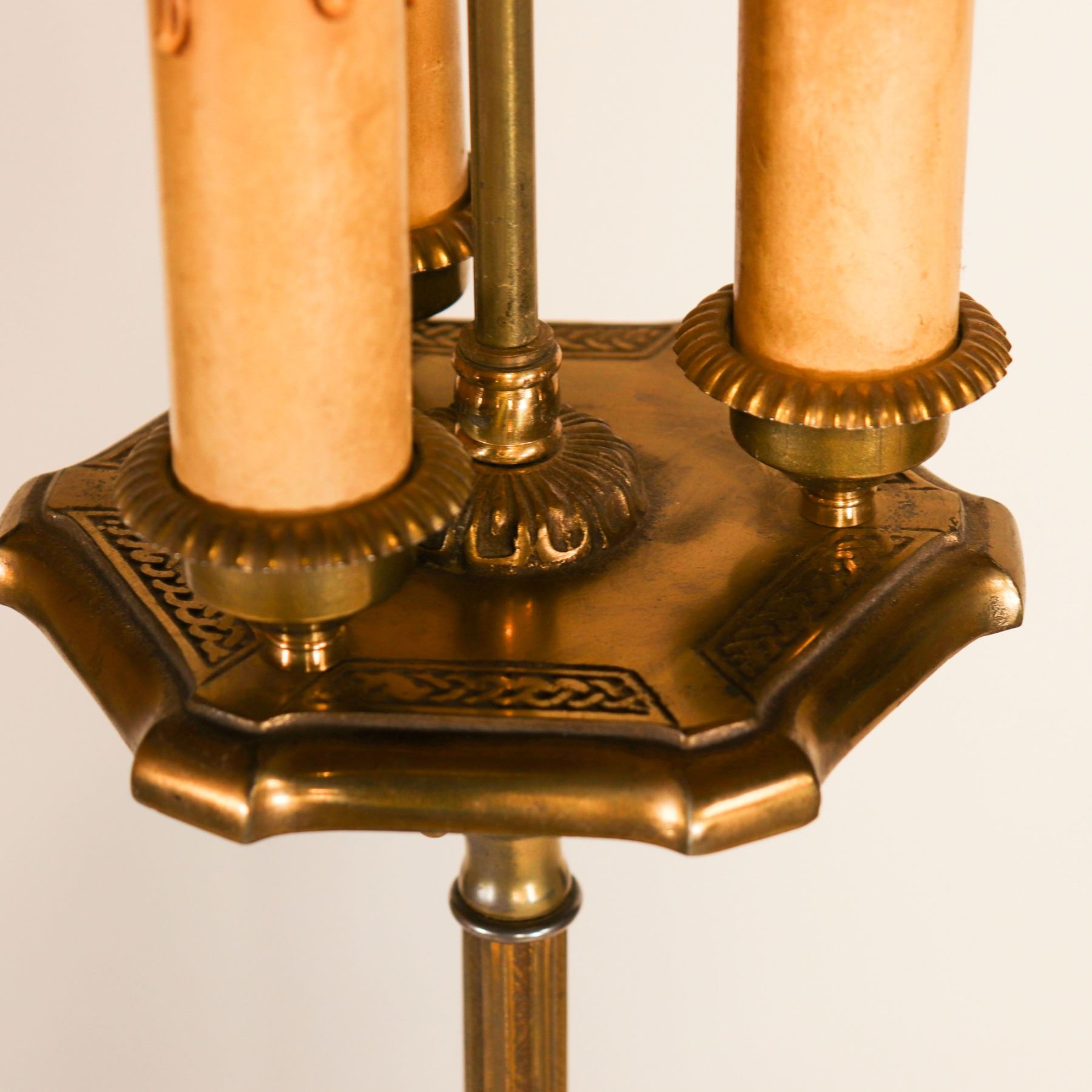 Tall brass floor lamp with three candle-form lights, the cluster set on an octagonal tray-form platform with engraved border and molded rim, above a flared, cast foliate collar and reeded standard. The upper section surmounted by an adjustable center rod for a shade or reflector (not present). Turned lower column over a shaped urn and circular plinth, all raised on a domed, decorated base with stylized leaf and gadroon motifs and four small pad feet. Likely brass-plated metal with warm original patina, early 20th century, in a restrained neoclassical / Colonial Revival style. Reported to be in working condition at time of cataloging; includes existing candle sleeves and wiring.