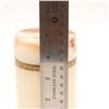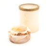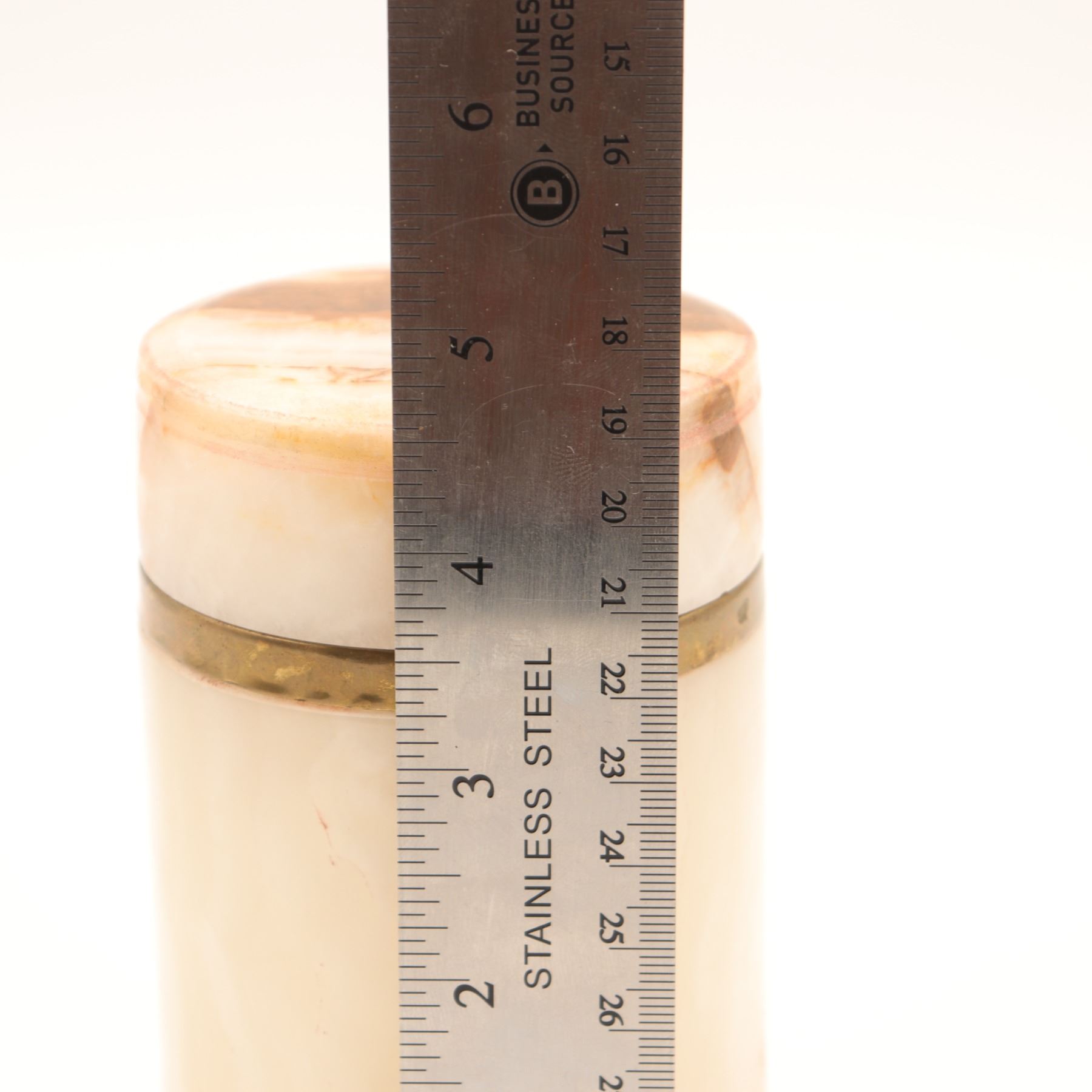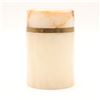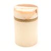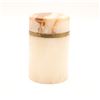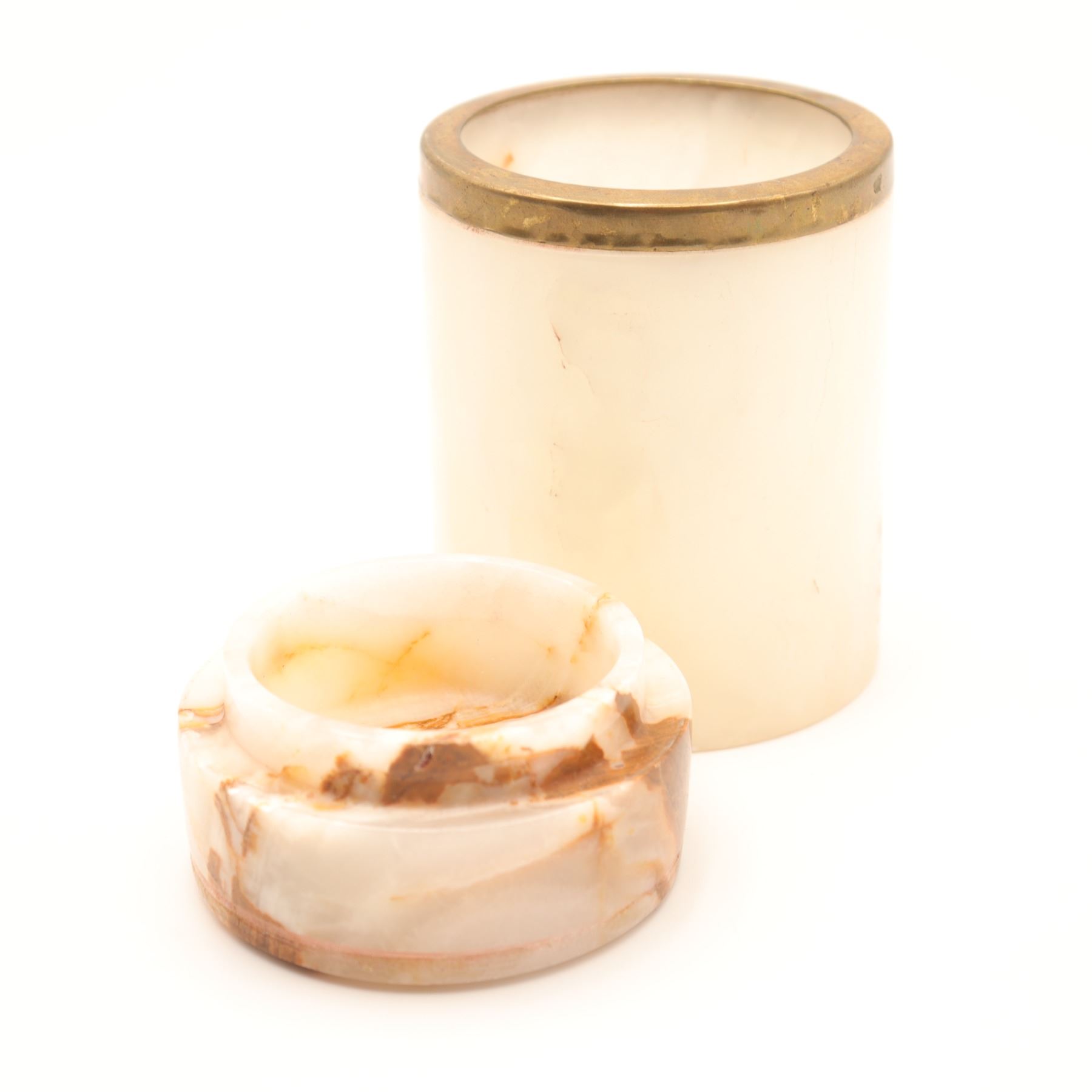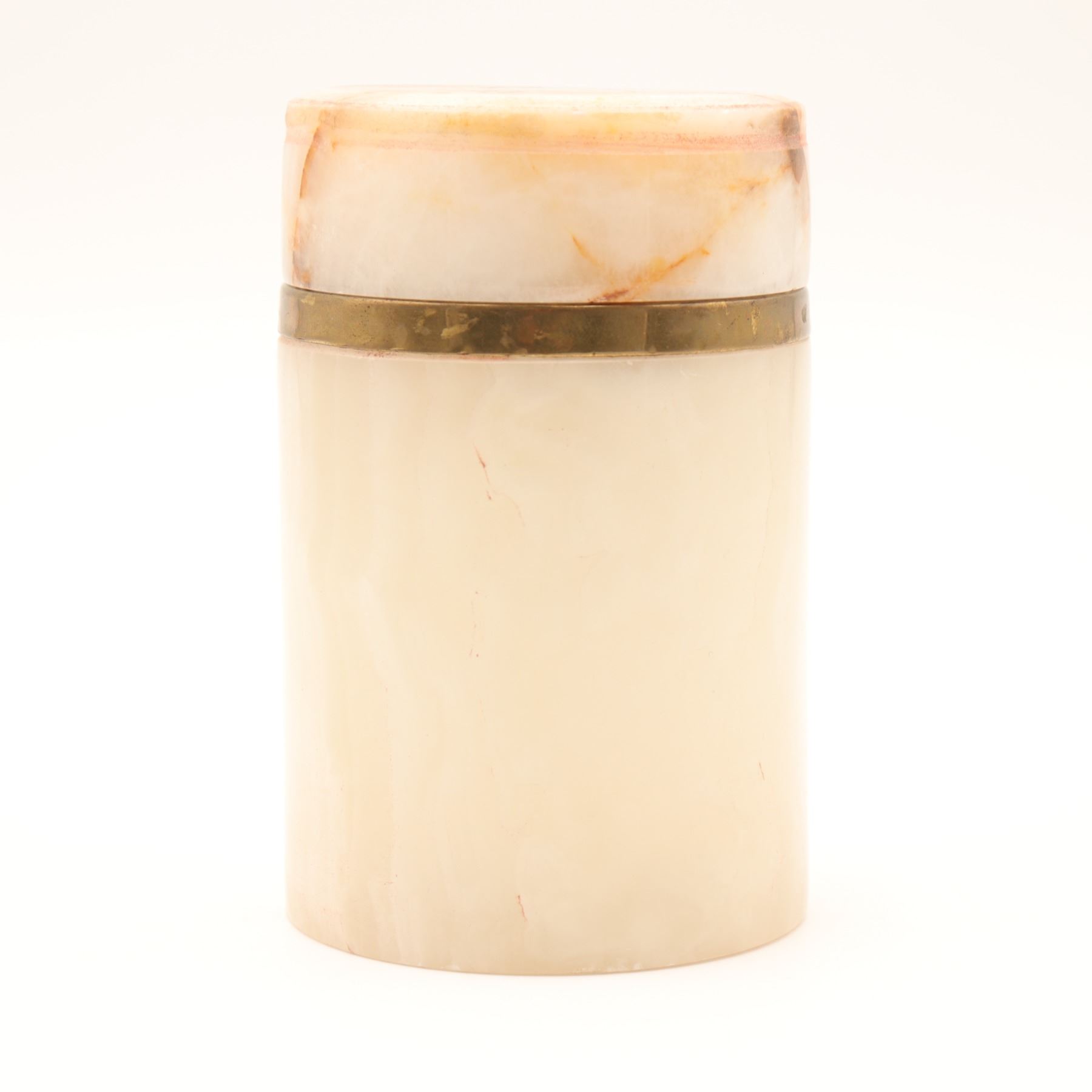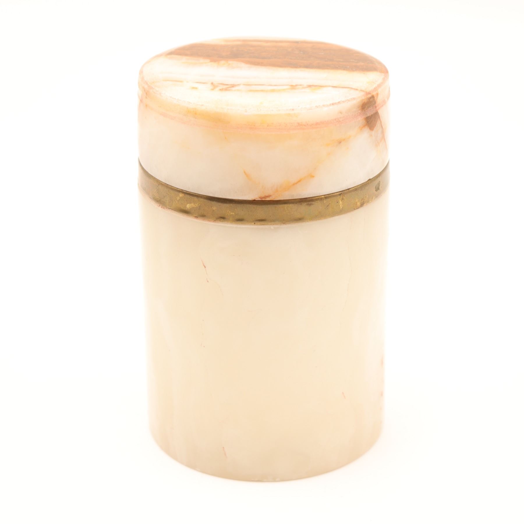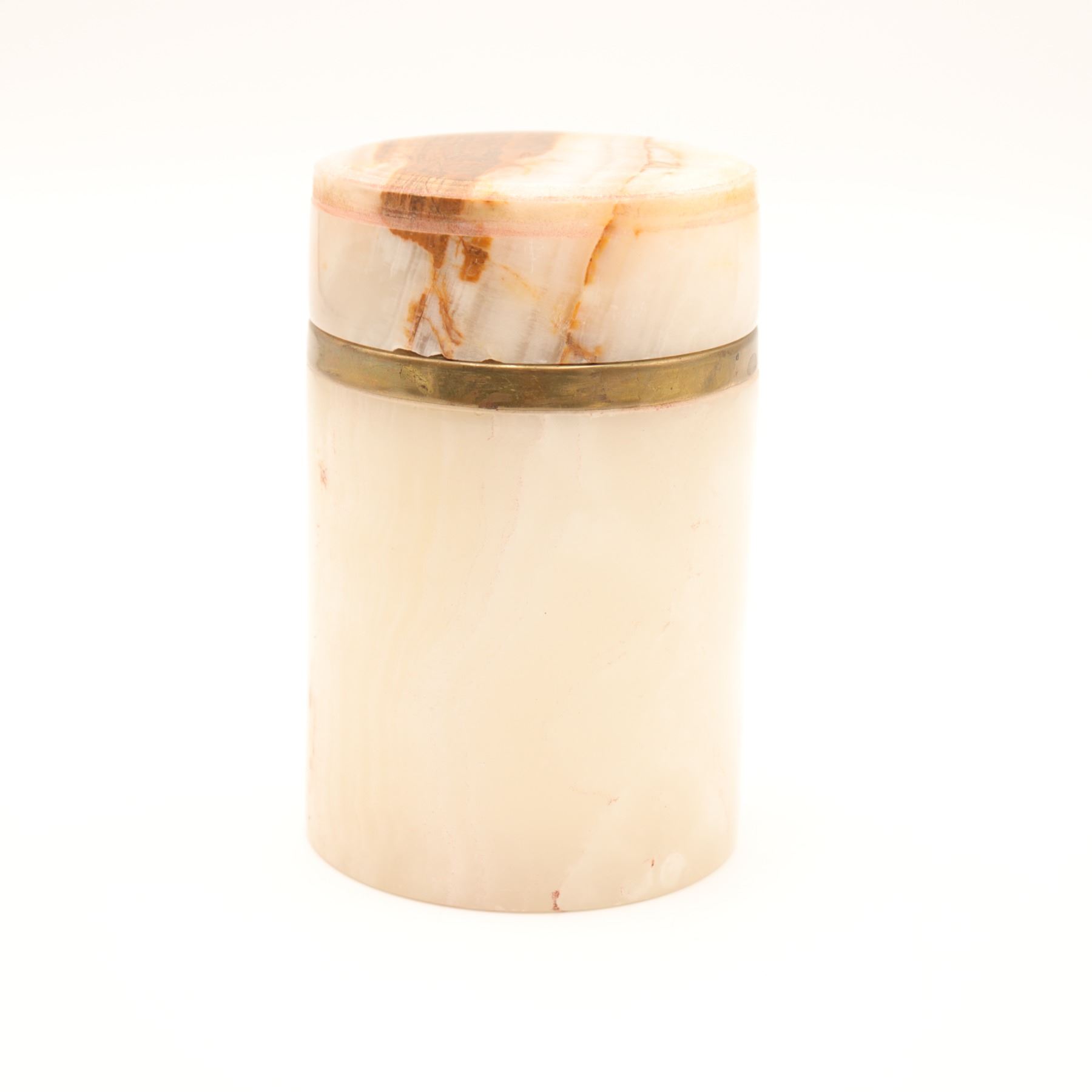 Cylindrical carved onyx and brass-lipped lidded canister, mid–late 20th century. The body in translucent cream-toned onyx with warm russet and honey veining, fitted at the mouth with a simple brass collar, the flat circular lid carved from matching stone with pronounced veining and a shallow, dish-form underside. Likely intended as a small vanity or desk canister for cotton, cigarettes, or trinkets; attractive natural stone patterning and minimalist, modernist profile.