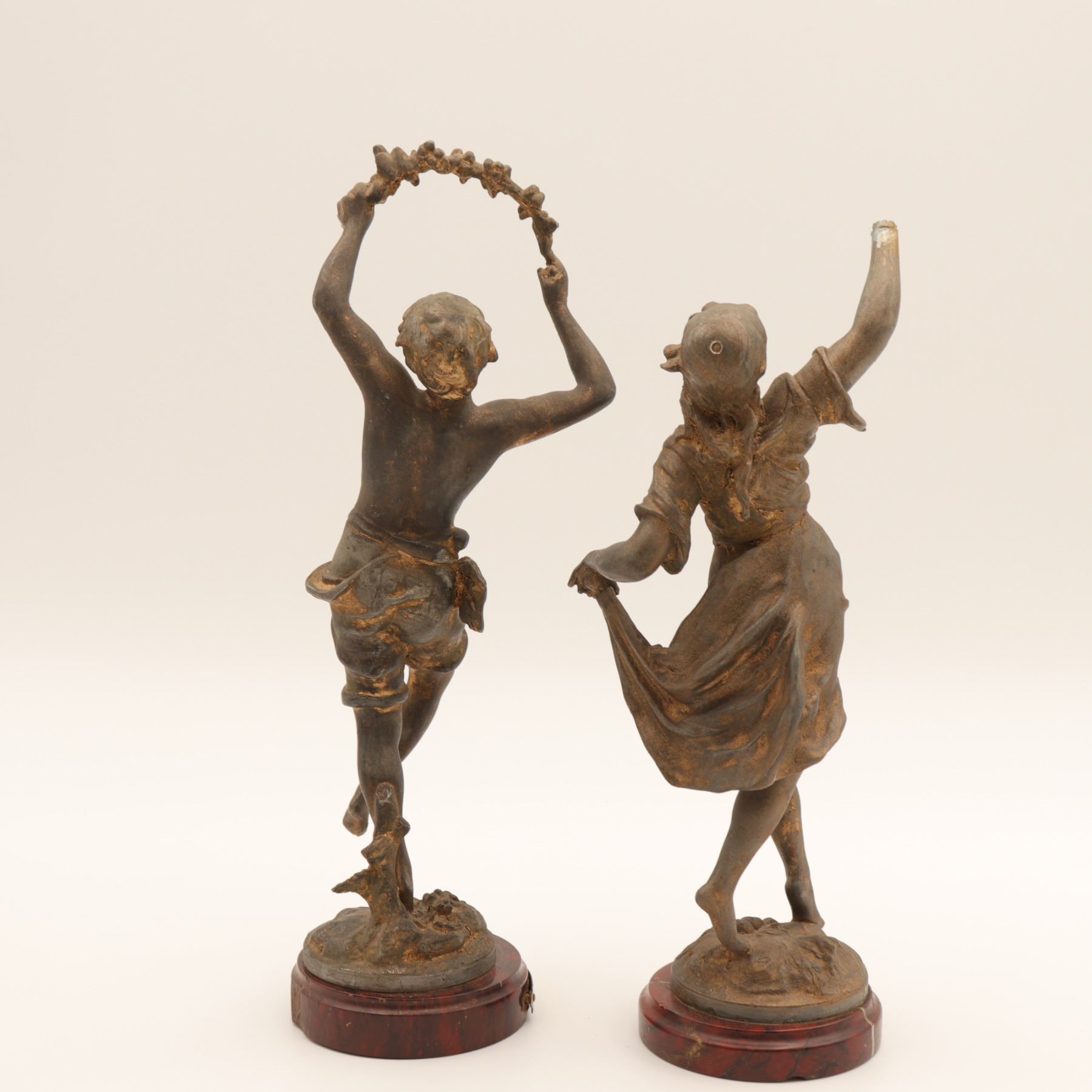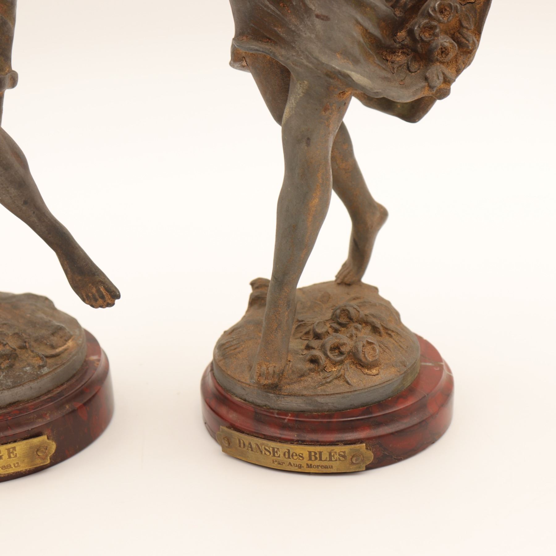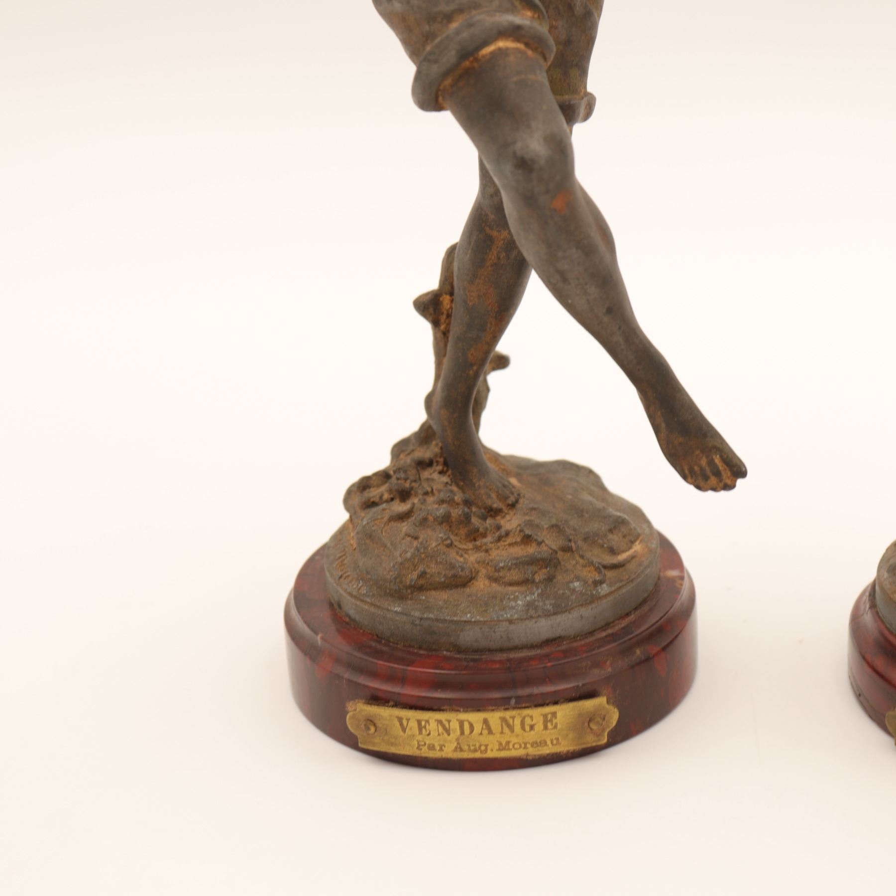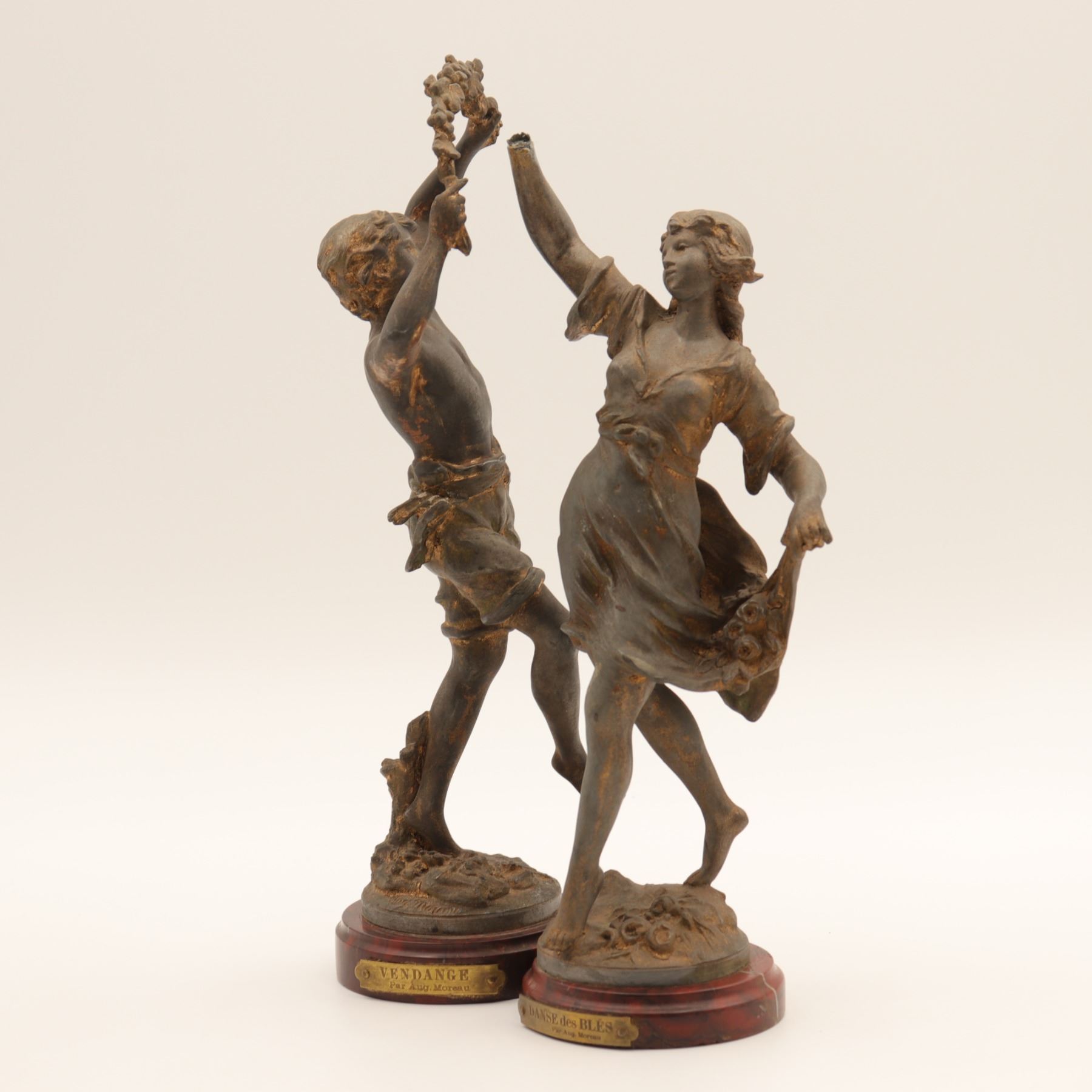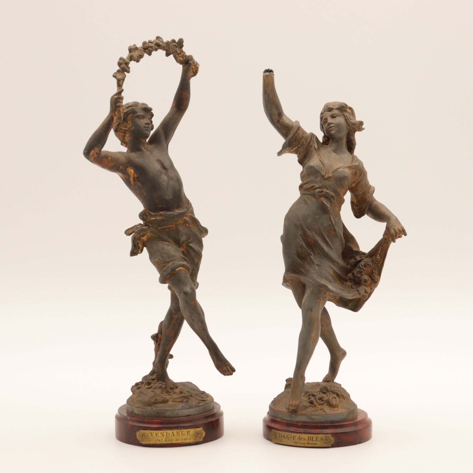 Pair of French spelter figures after Auguste Moreau, titled Vendange and Danse des Blés, each mounted on a simulated marble circular base with brass title plaque “VENDANGE Par Aug. Moreau” and “DANSE des BLÉS Par Aug. Moreau”. The male figure modelled dancing with a garland of grapes, the female figure dancing with her skirt filled with wheat. Dark patinated finish with remnants of gilt highlights. Both figures signed in-cast on the base. Condition: structurally sound but with notable wear and losses to finish; scattered rubbing, oxidation and small casting flaws; the female figure lacking part of her raised hand (missing palm) and with some roughness at extremities; bases with small chips and wear to faux-marble finish. Approximate height 13 1/2 in.