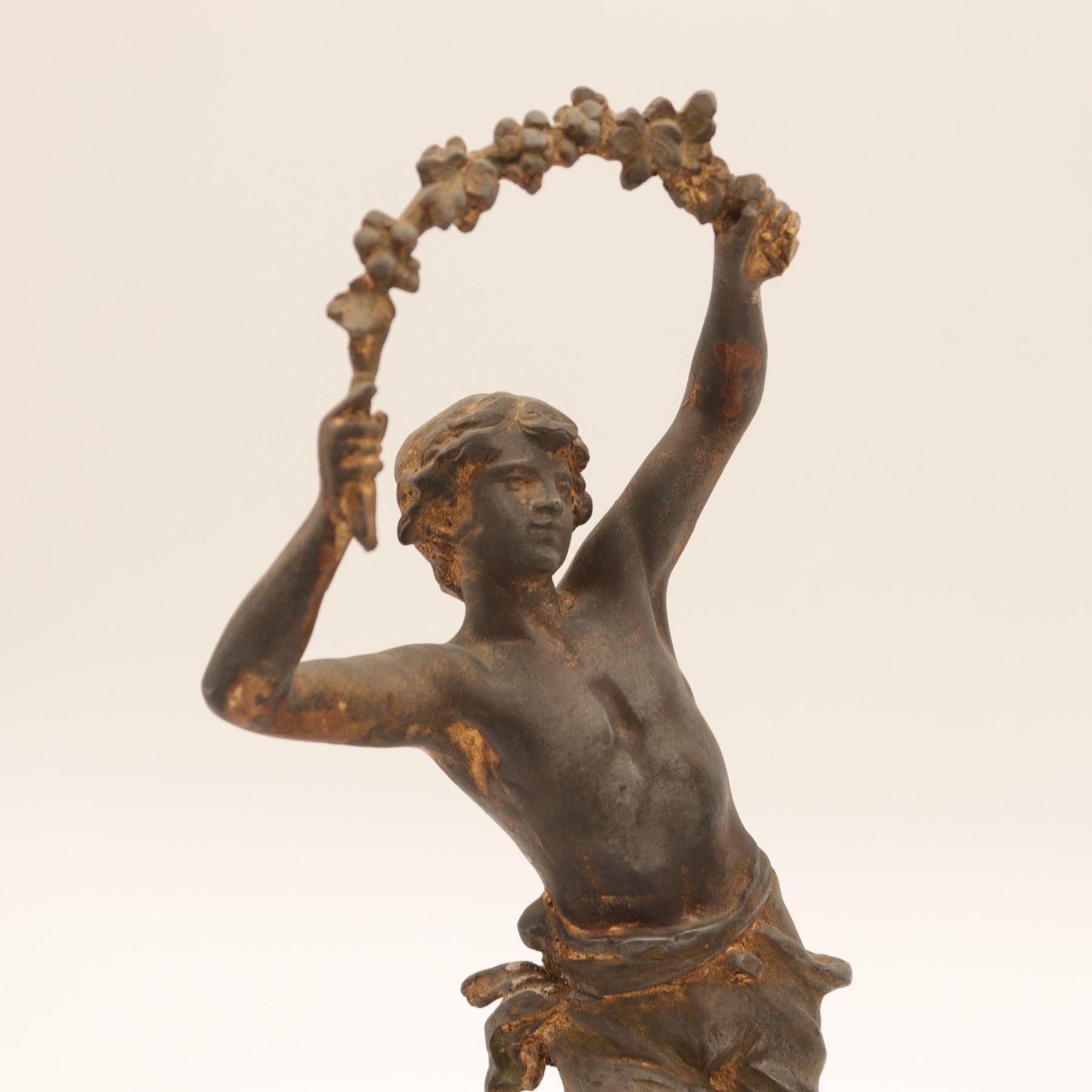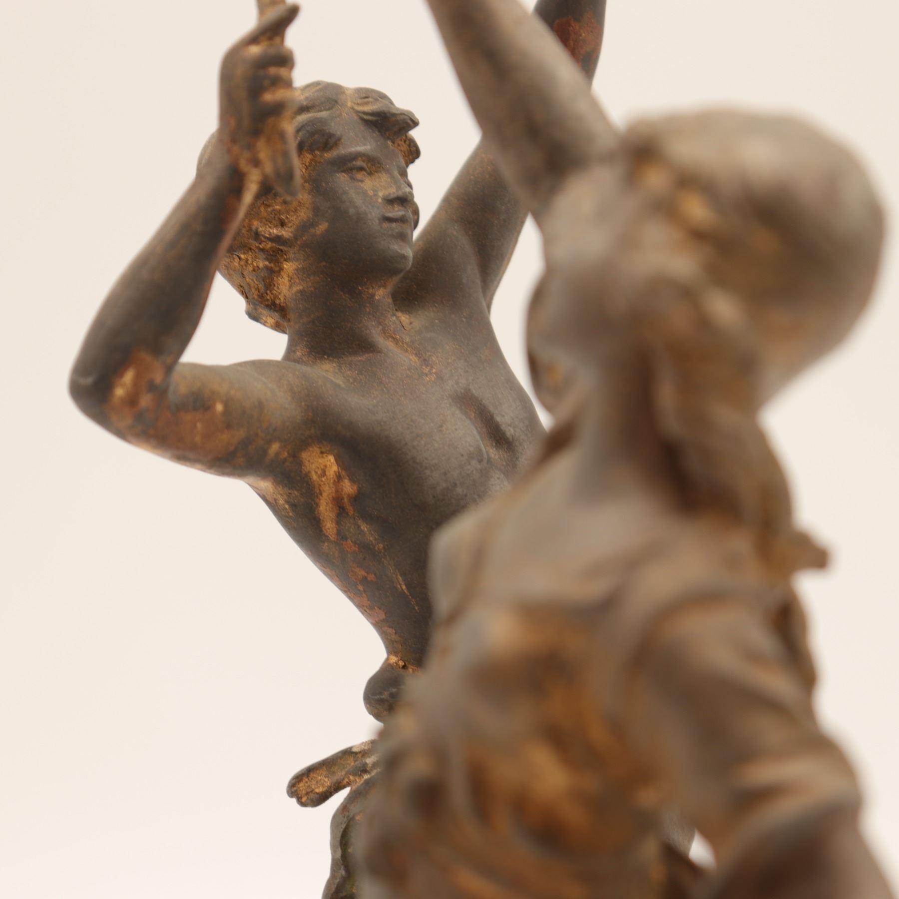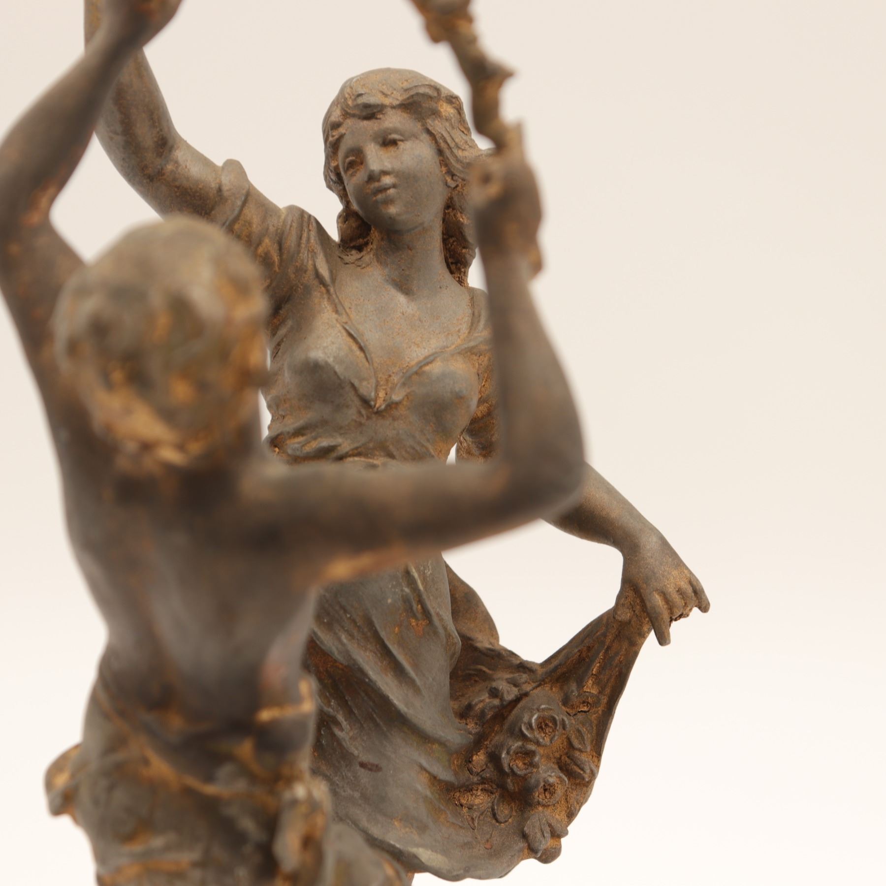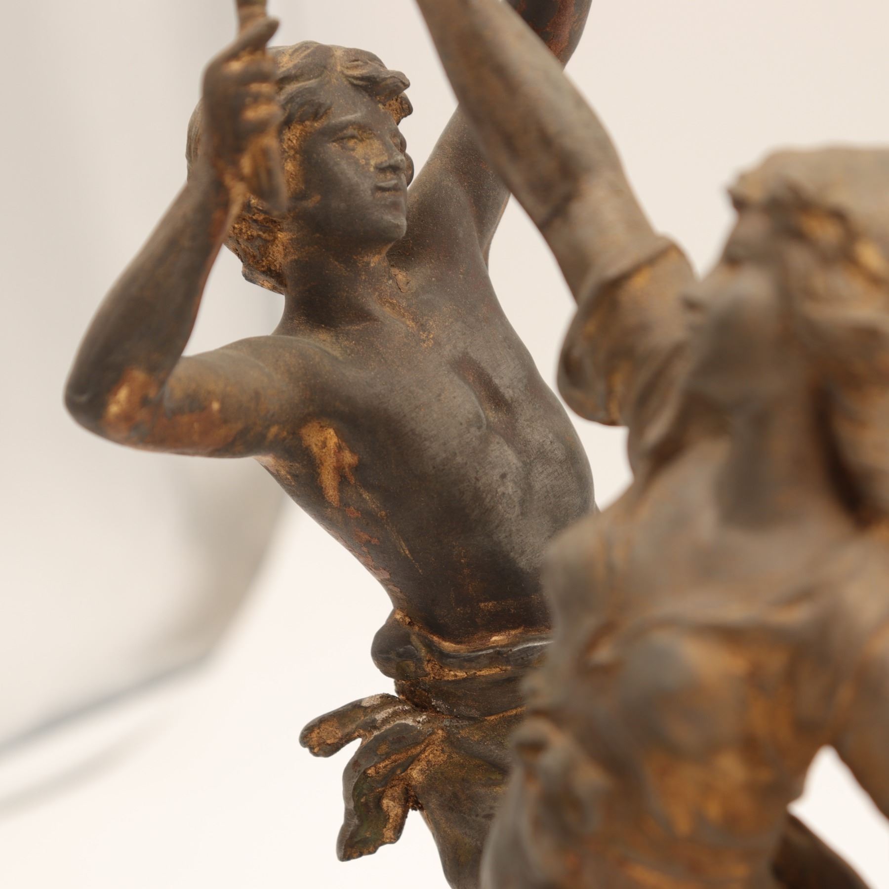 Pair of French spelter figures after Auguste Moreau, titled Vendange and Danse des Blés, each mounted on a simulated marble circular base with brass title plaque “VENDANGE Par Aug. Moreau” and “DANSE des BLÉS Par Aug. Moreau”. The male figure modelled dancing with a garland of grapes, the female figure dancing with her skirt filled with wheat. Dark patinated finish with remnants of gilt highlights. Both figures signed in-cast on the base. Condition: structurally sound but with notable wear and losses to finish; scattered rubbing, oxidation and small casting flaws; the female figure lacking part of her raised hand (missing palm) and with some roughness at extremities; bases with small chips and wear to faux-marble finish. Approximate height 13 1/2 in.