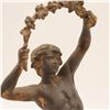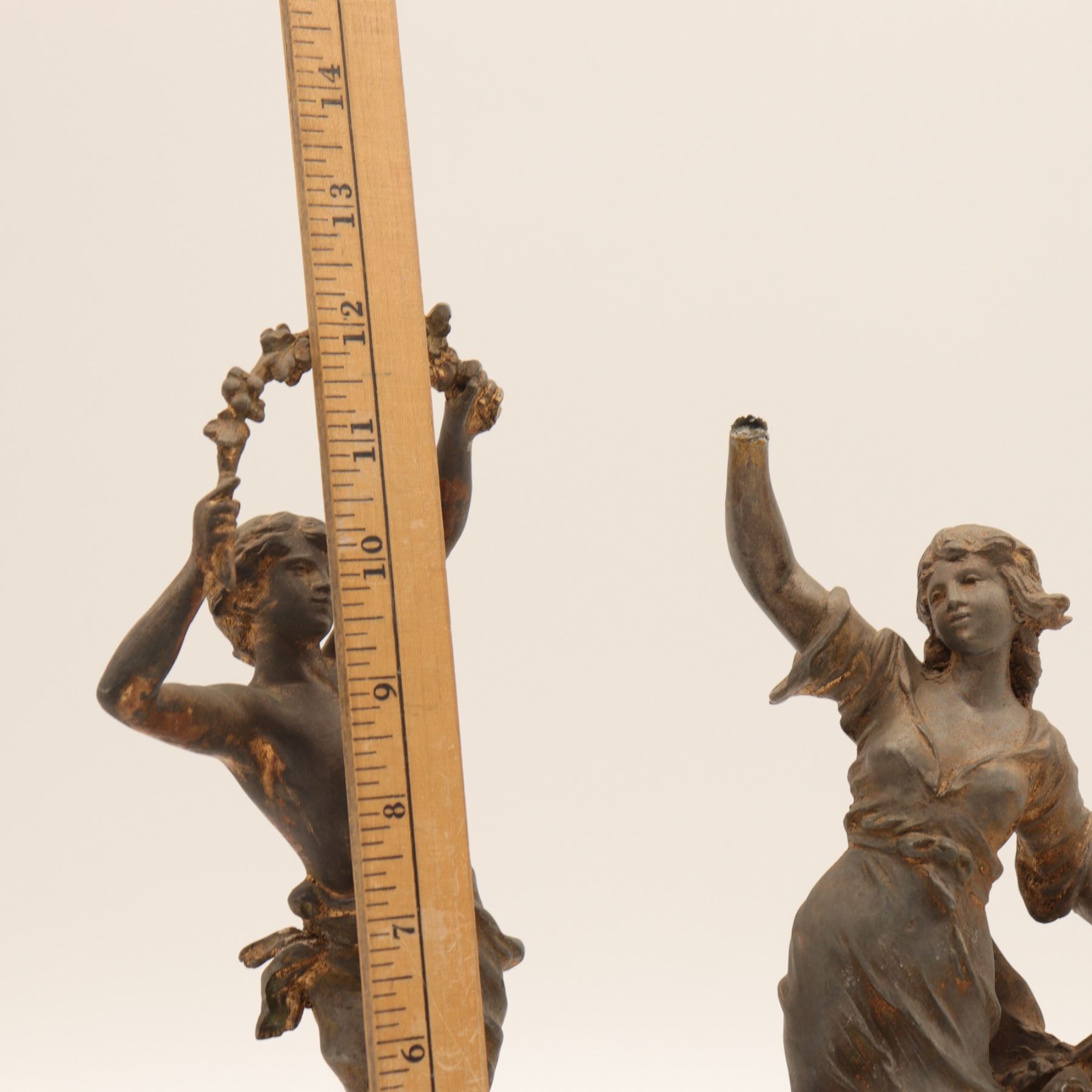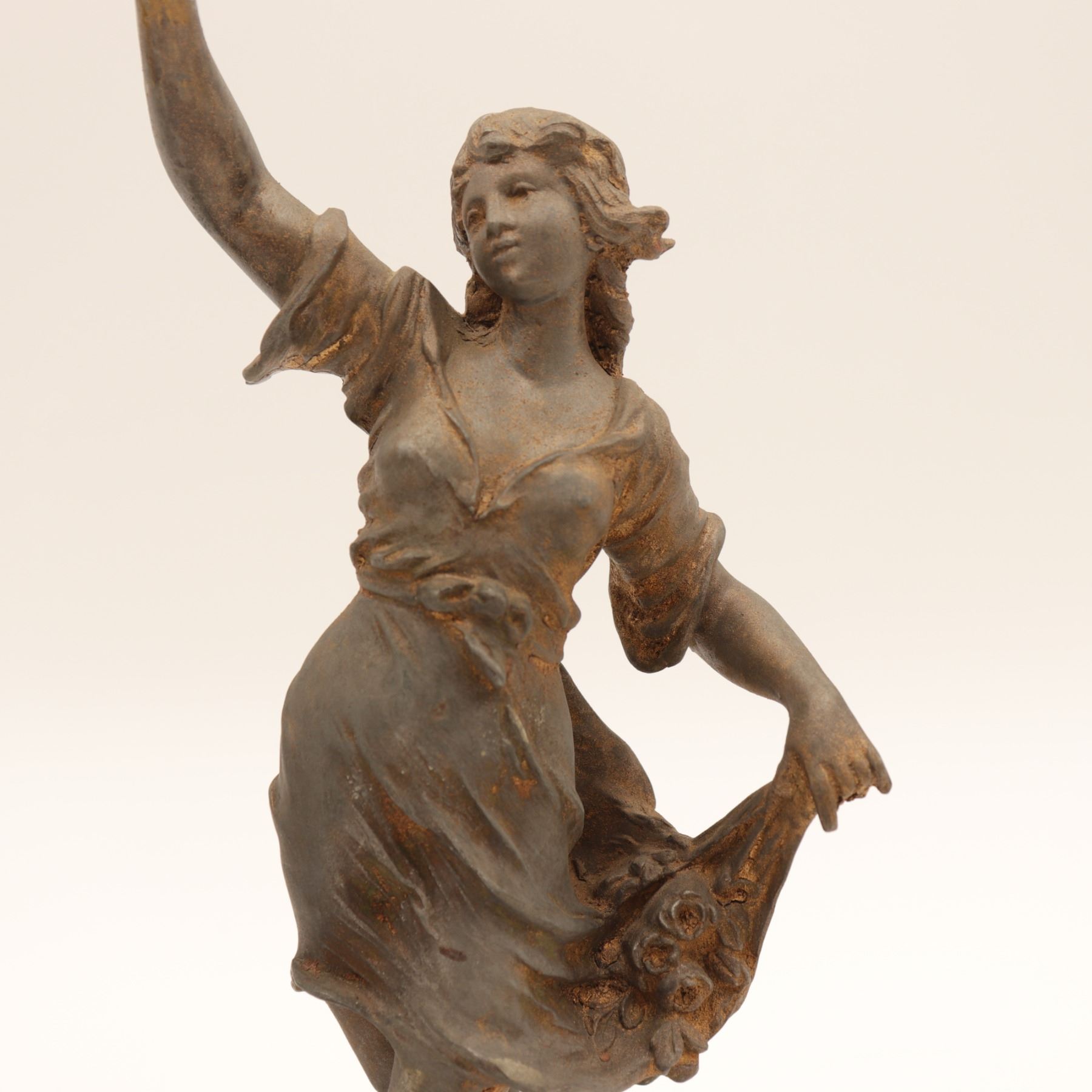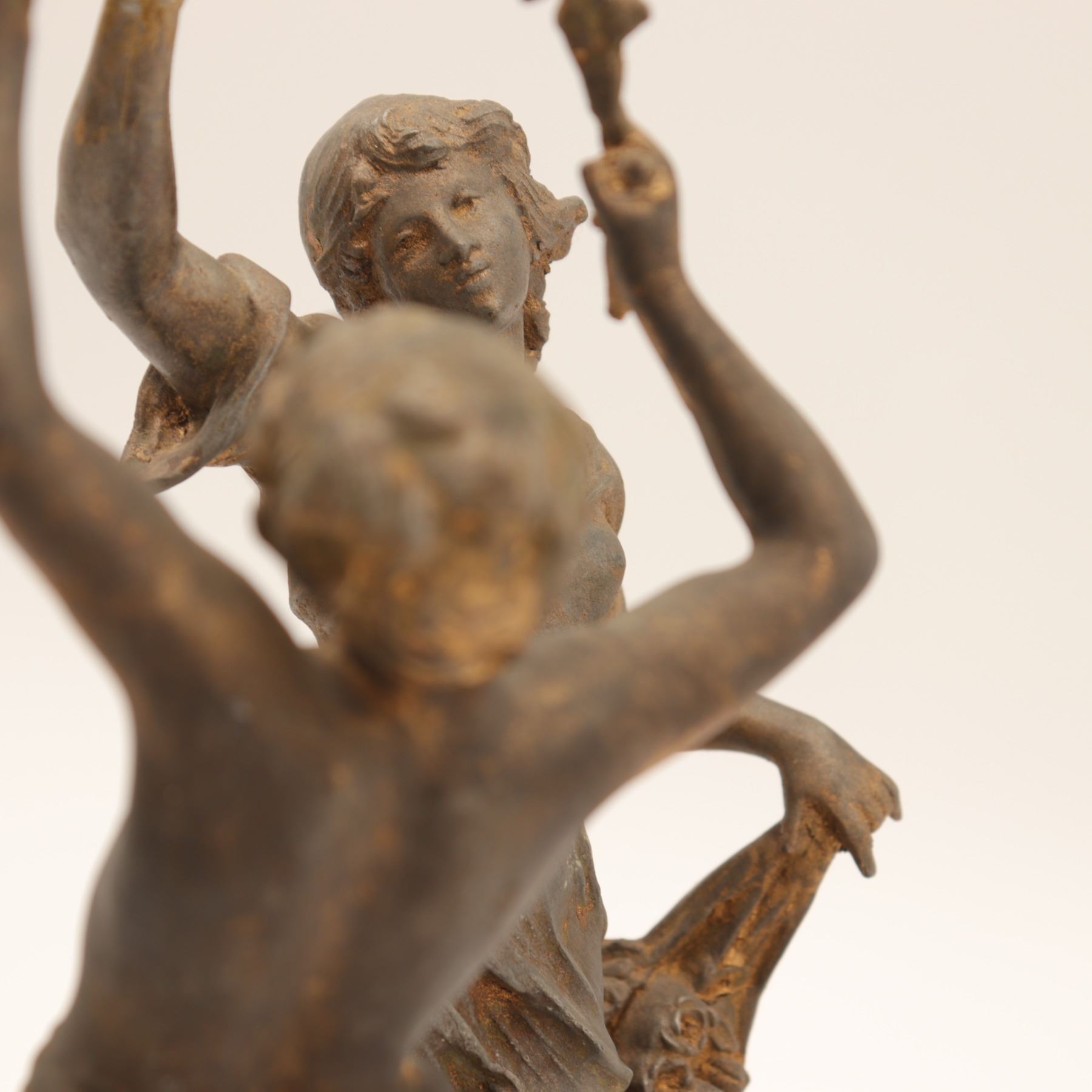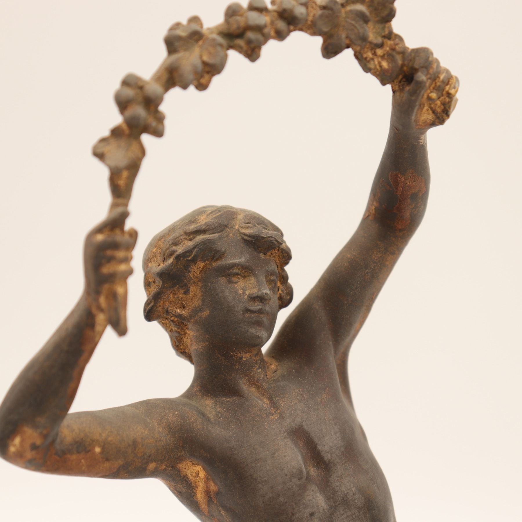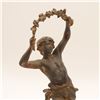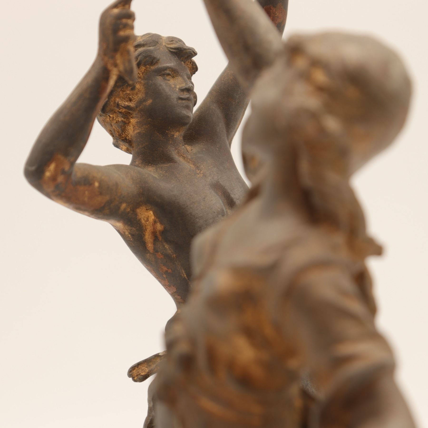 Pair of French spelter figures after Auguste Moreau, titled Vendange and Danse des Blés, each mounted on a simulated marble circular base with brass title plaque “VENDANGE Par Aug. Moreau” and “DANSE des BLÉS Par Aug. Moreau”. The male figure modelled dancing with a garland of grapes, the female figure dancing with her skirt filled with wheat. Dark patinated finish with remnants of gilt highlights. Both figures signed in-cast on the base. Condition: structurally sound but with notable wear and losses to finish; scattered rubbing, oxidation and small casting flaws; the female figure lacking part of her raised hand (missing palm) and with some roughness at extremities; bases with small chips and wear to faux-marble finish. Approximate height 13 1/2 in.