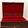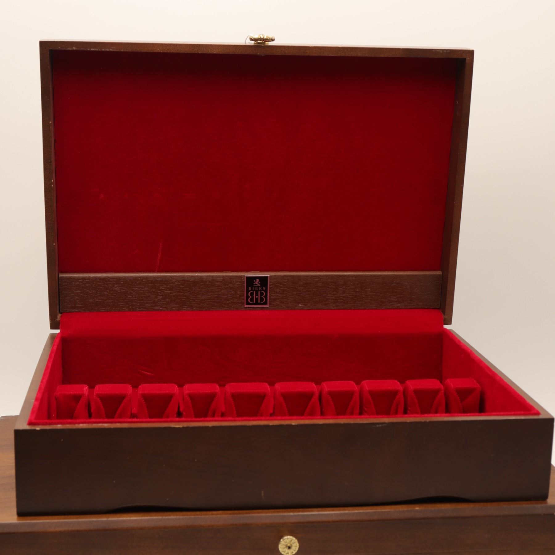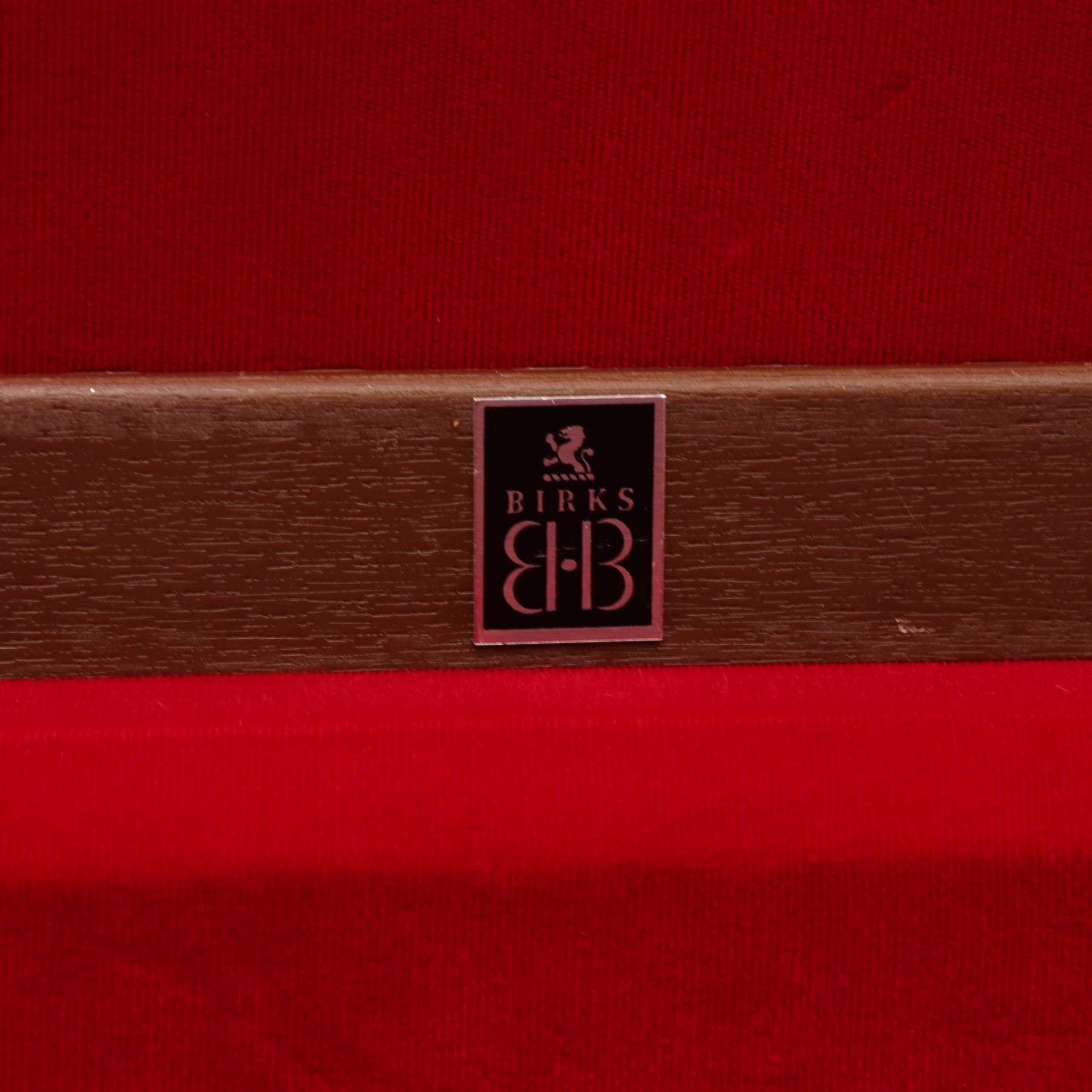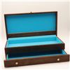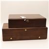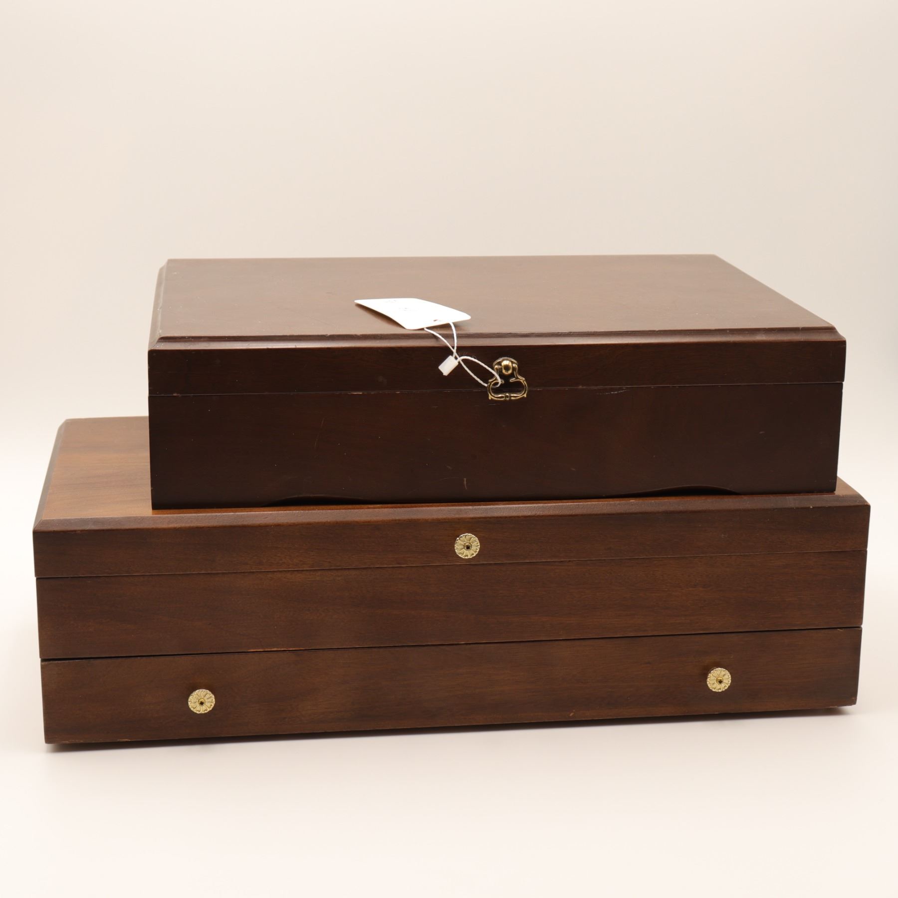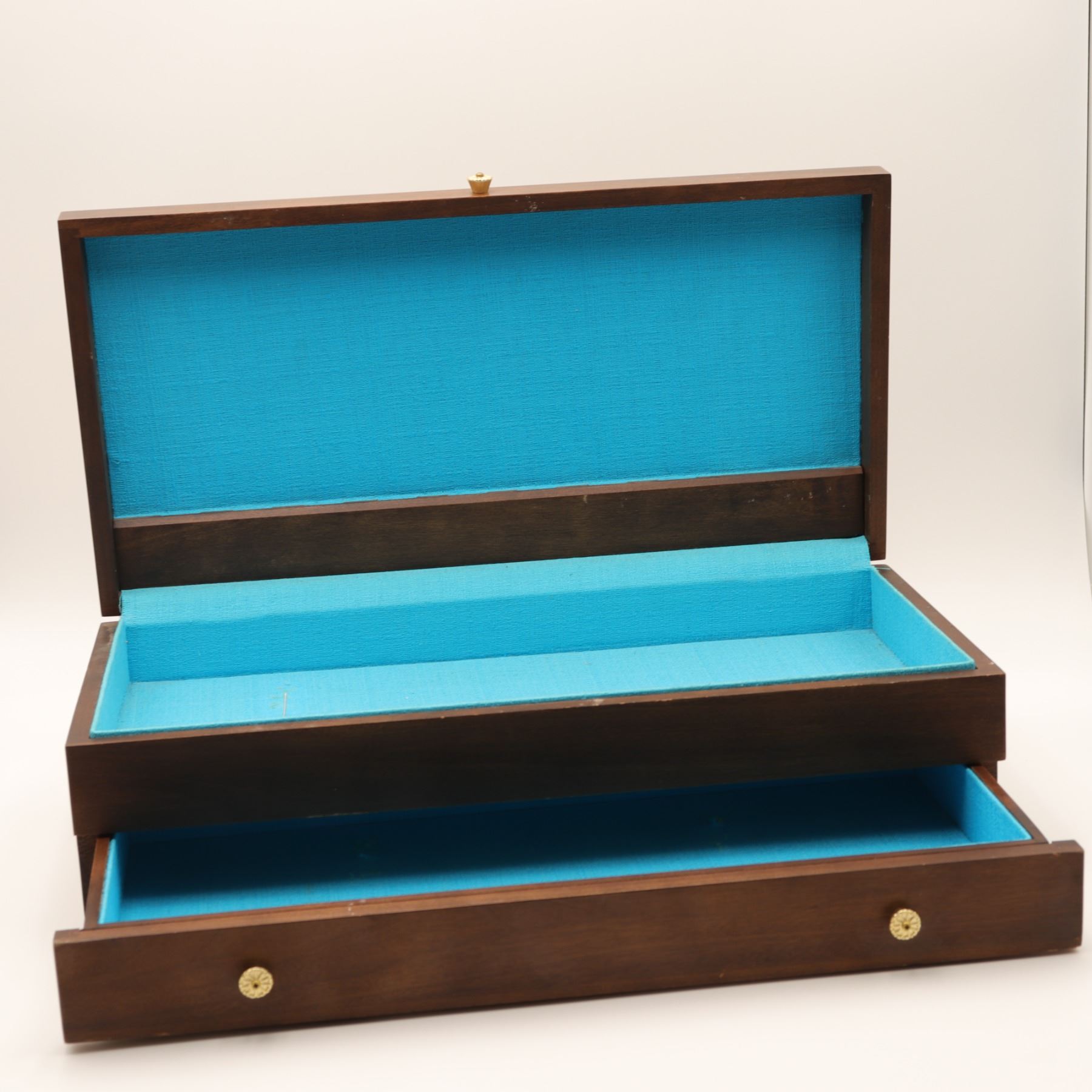 Pair of Birks dark-stained wooden presentation / flatware boxes, mid–late 20th century, likely Canadian. The larger long rectangular box with hinged lid and full-width pull-out drawer, fitted with bright turquoise textile-lined interior for flatware or serving pieces, front set with three small circular brass mounts. The slightly smaller companion box with shaped front edge, hinged lid and small brass latch, similarly lined, both interiors undivided and suitable for repurposing as storage or display.