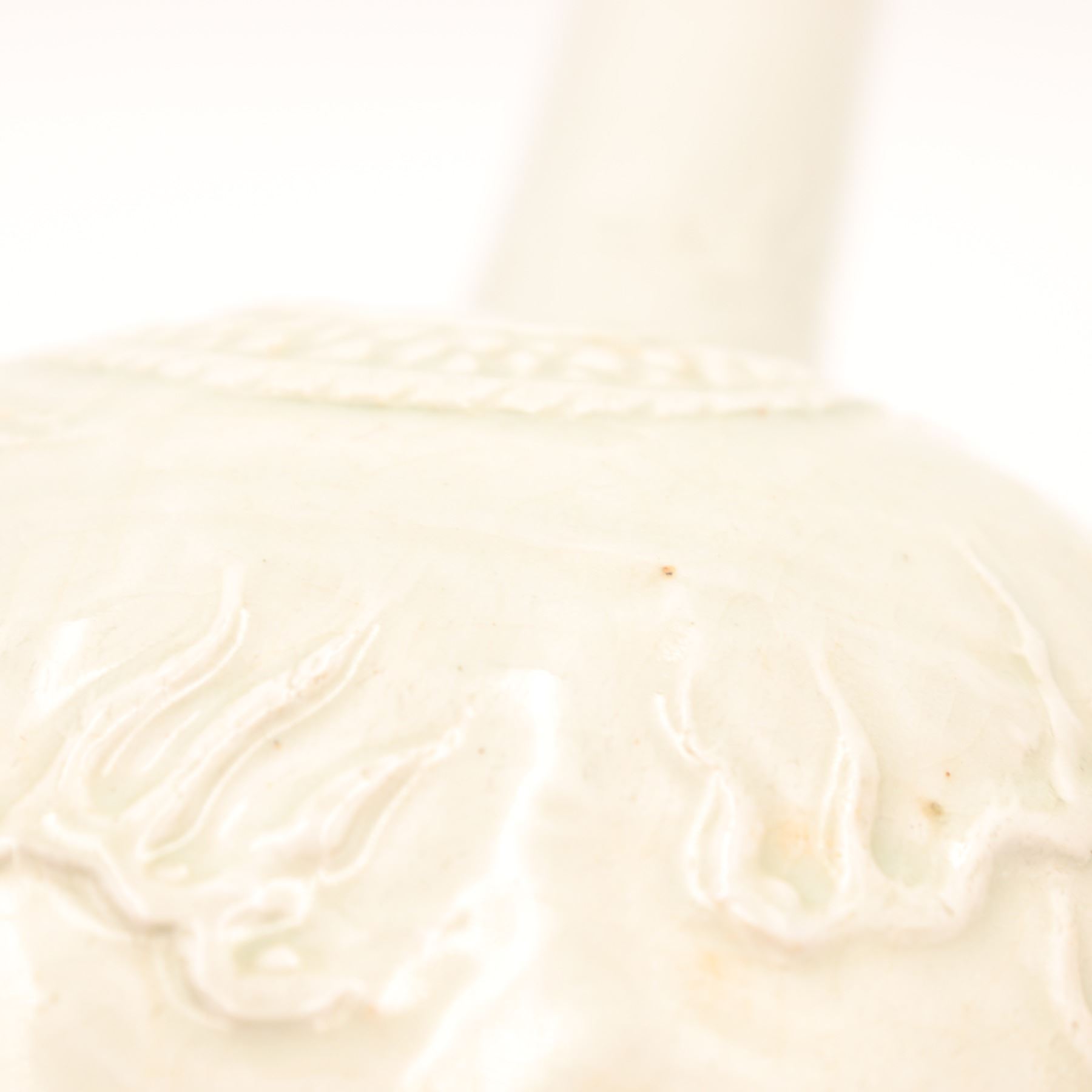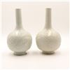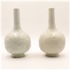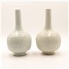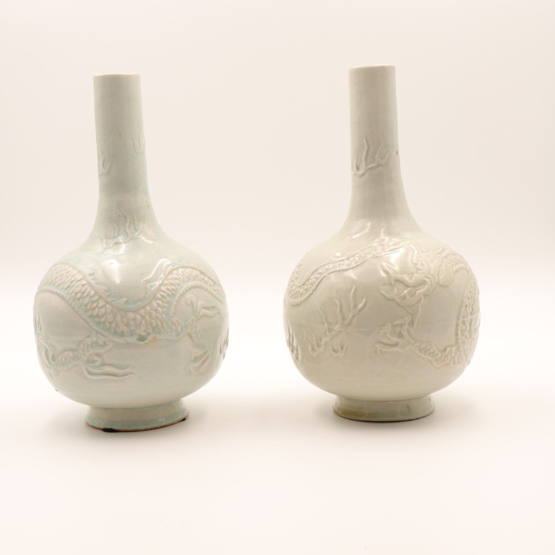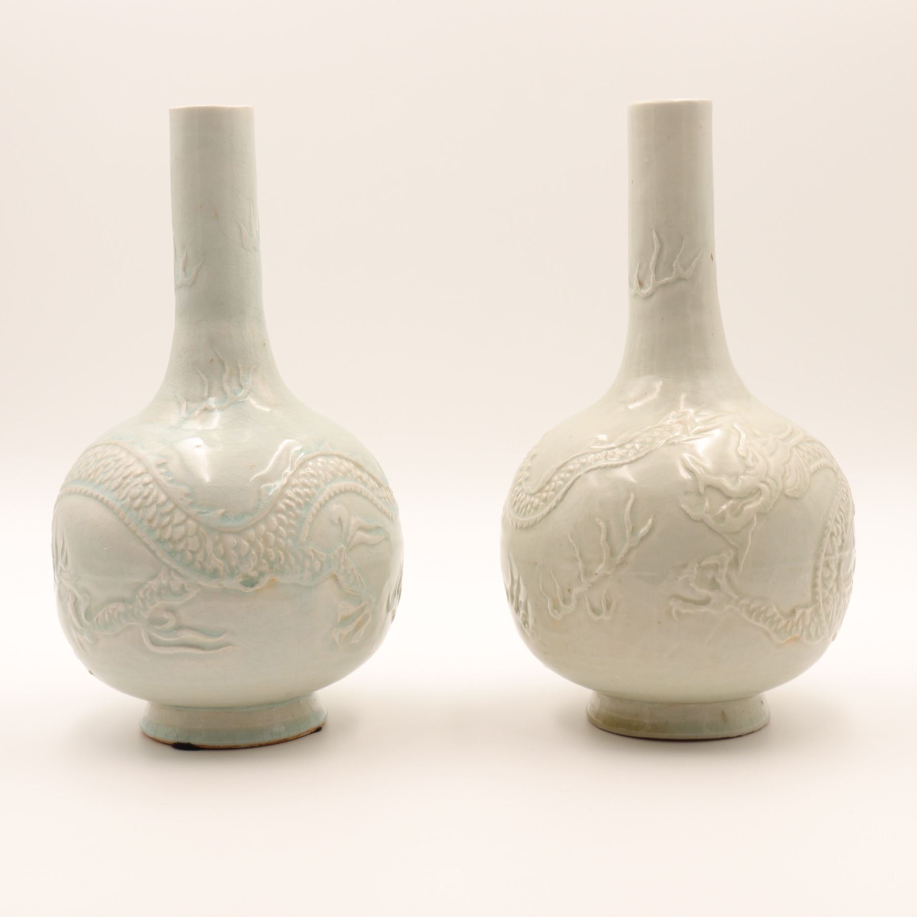 A pair of tall Chinese porcelain bottle vases, each with rounded body and long cylindrical neck, the sides moulded in relief with a sinuous dragon among cloud scrolls, all under a very pale blue celadon glaze with intentional overall crackle. The unglazed foot rings show iron-red firing residue. A striking decorative pair in the tradition of late Qing and Republic-period dragon vases.