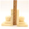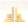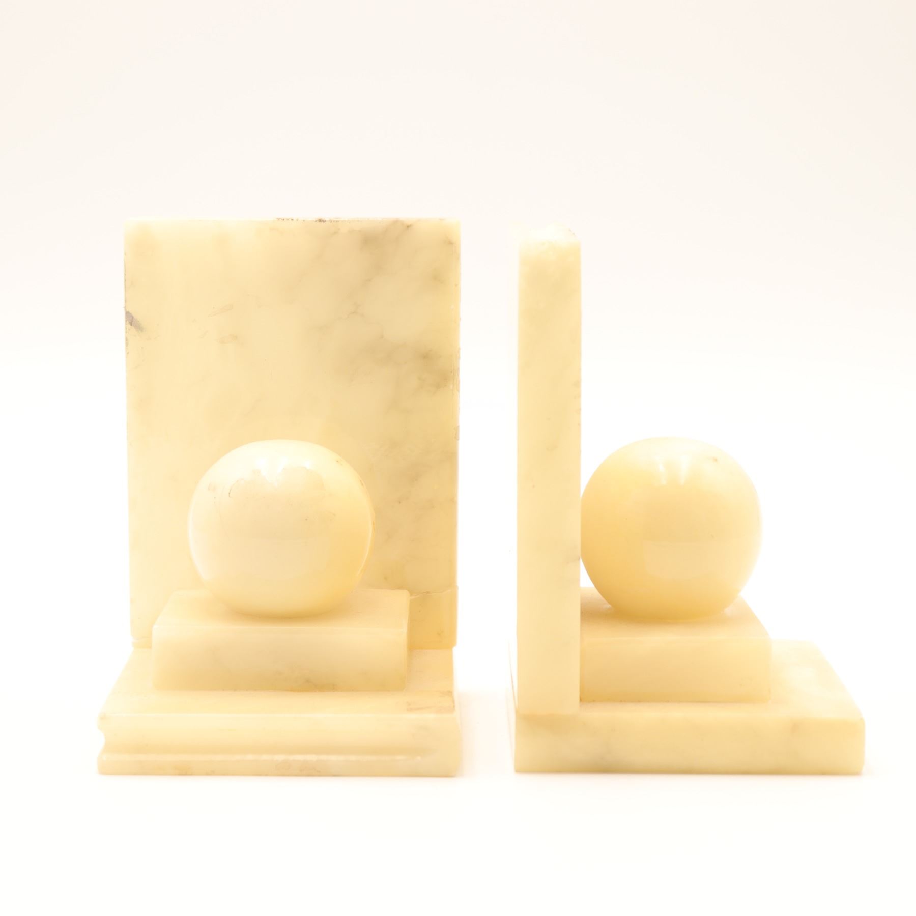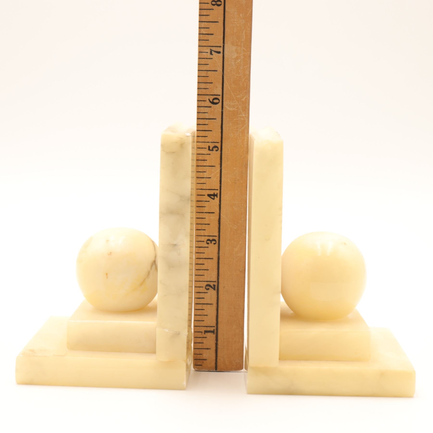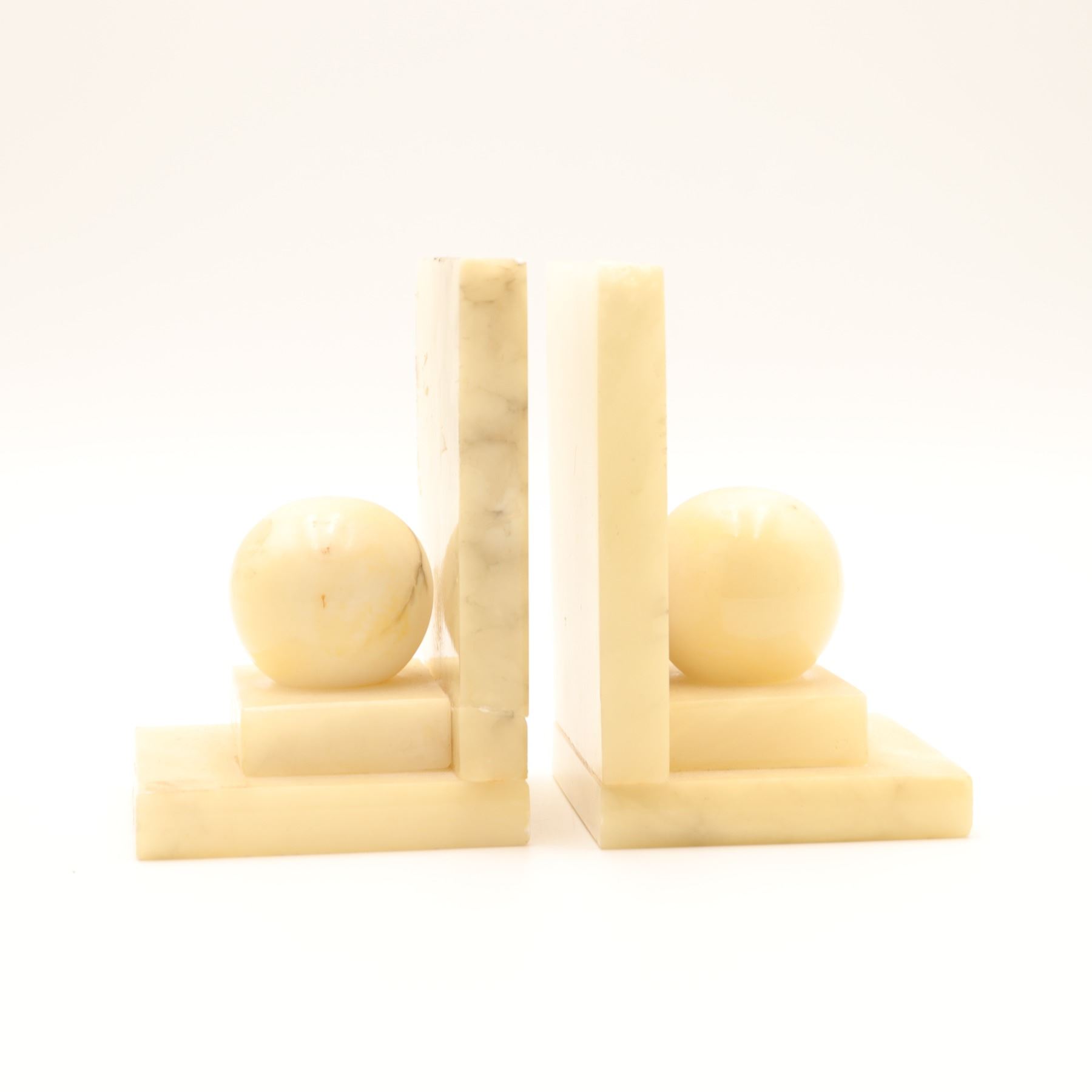 Pair of cream-coloured onyx stone bookends, mid-20th century, each of stepped rectangular base surmounted by a vertical back plate and a polished stone sphere, creating a simple geometric architectural form. Approx. 5 1/2 in. high. Natural veining and colour variation, minor edge nicks and light surface wear consistent with age and use.