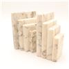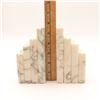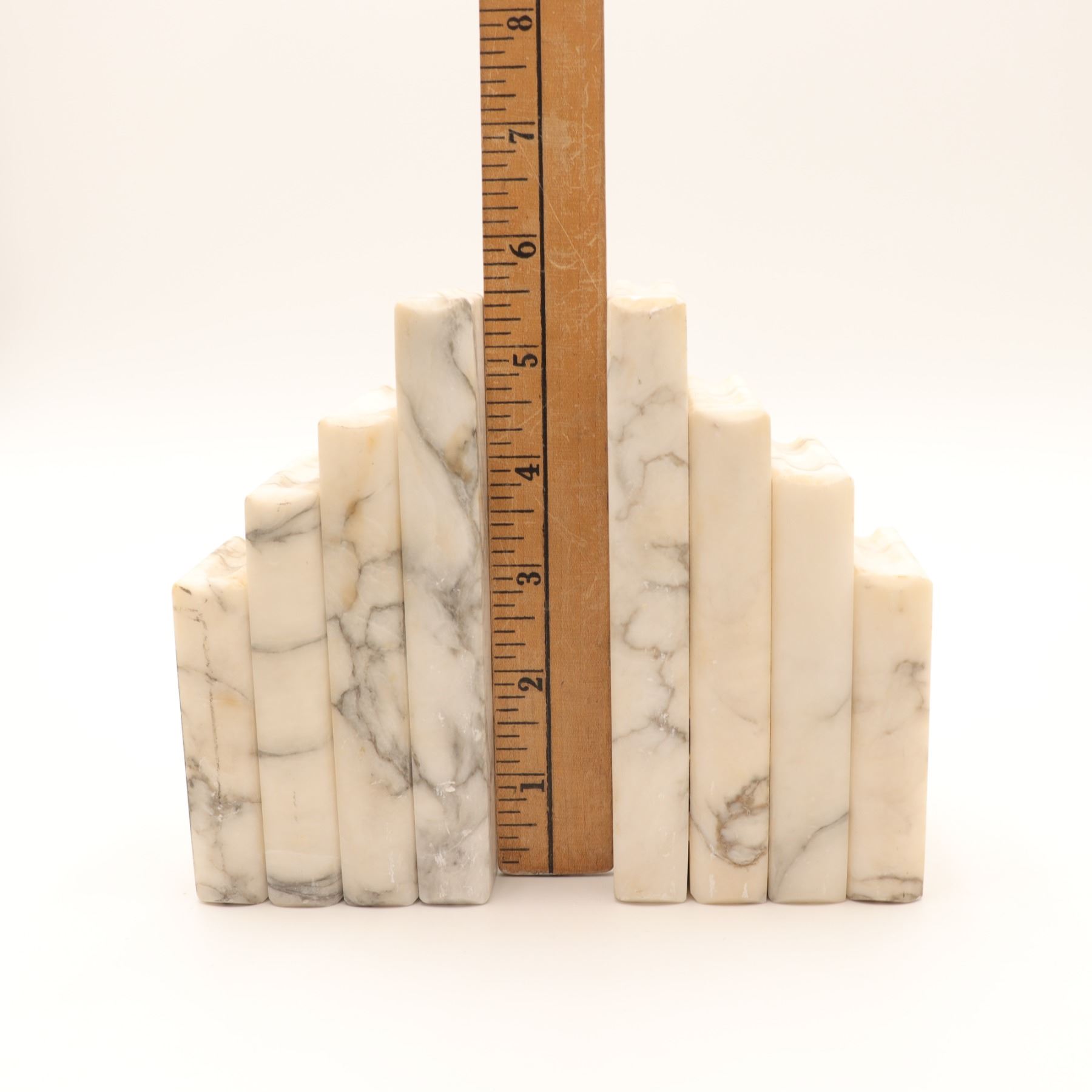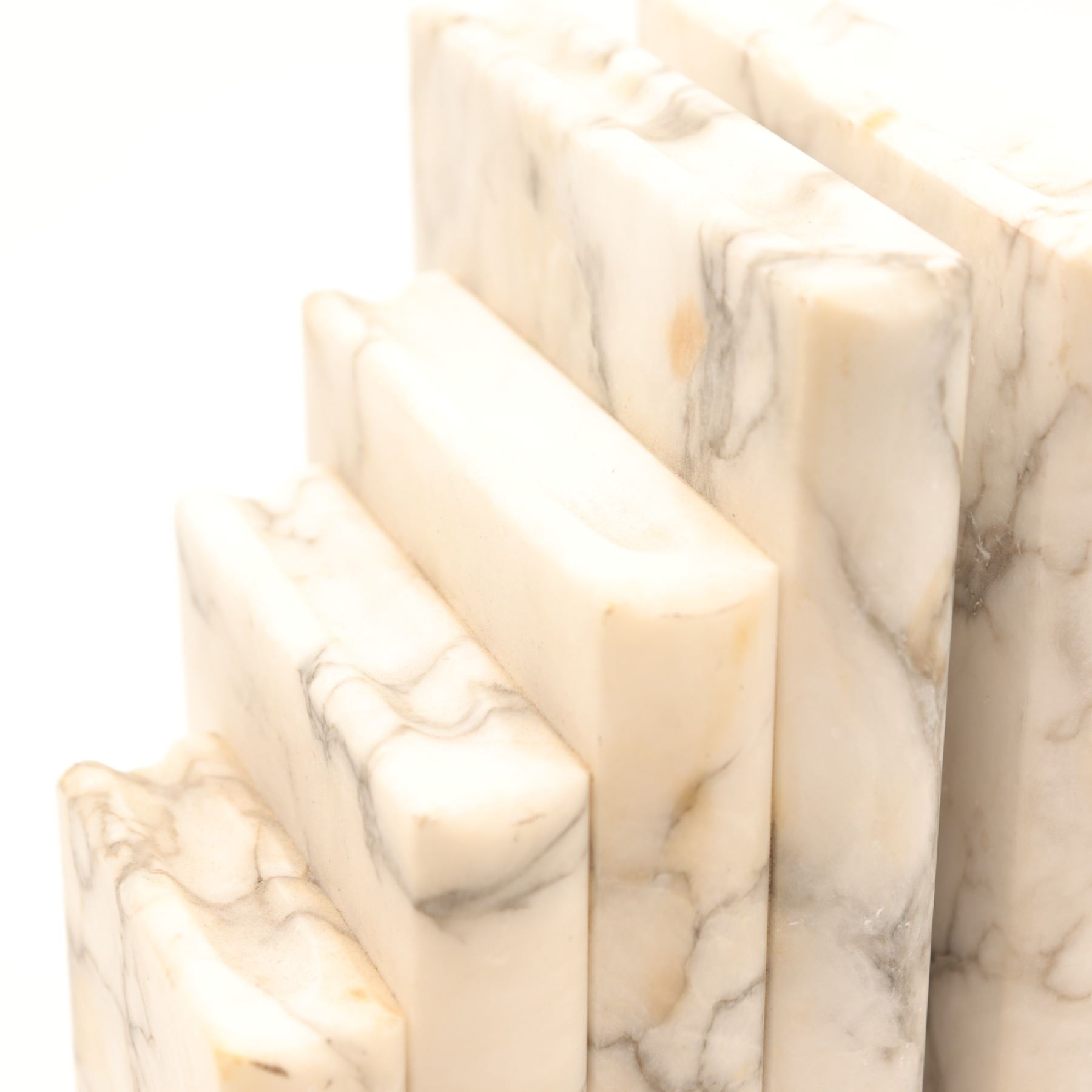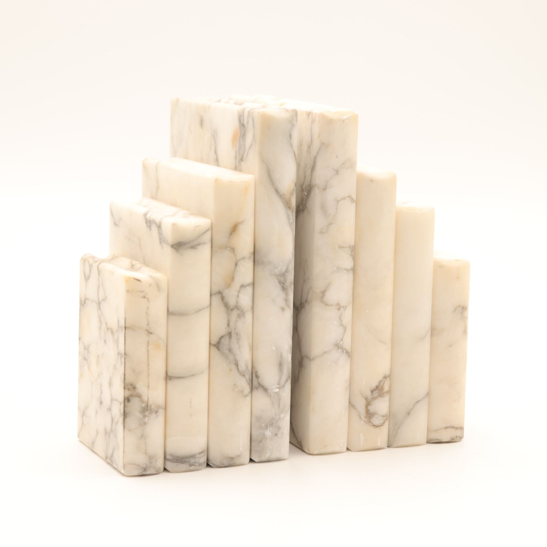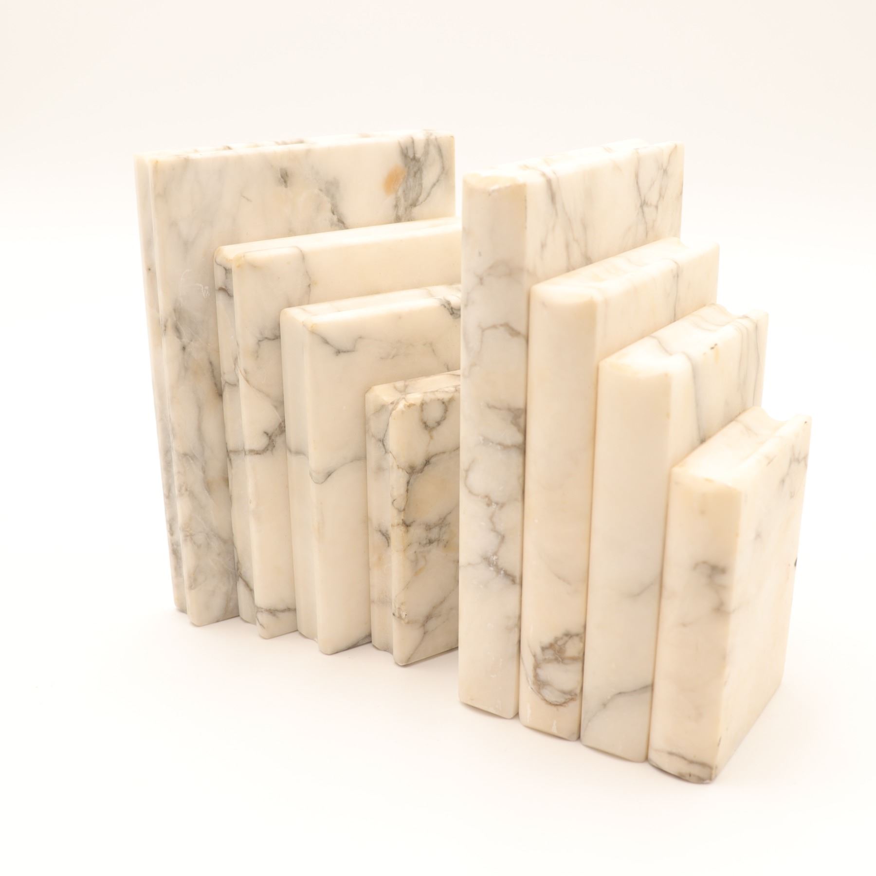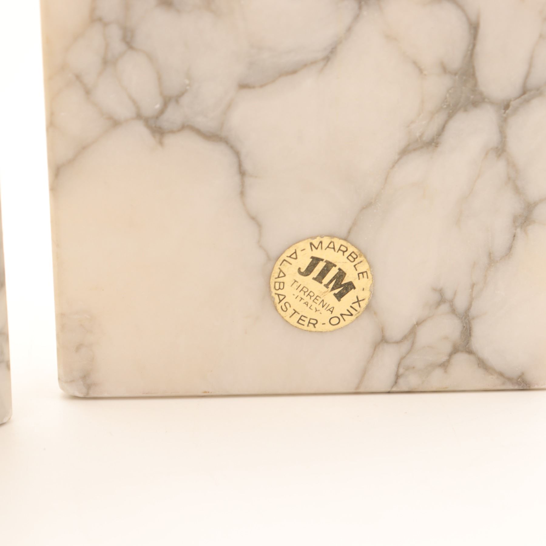 A pair of carved Italian alabaster bookends in stepped book-spine form, the stone displaying attractive grey veining and a smooth polished finish. Retaining the original Tirrenia workshop label for JIM, known for quality stonework in alabaster, marble, and onyx. Solid and weighty, ideal for display or functional use. Very good condition with no chips or cracks.