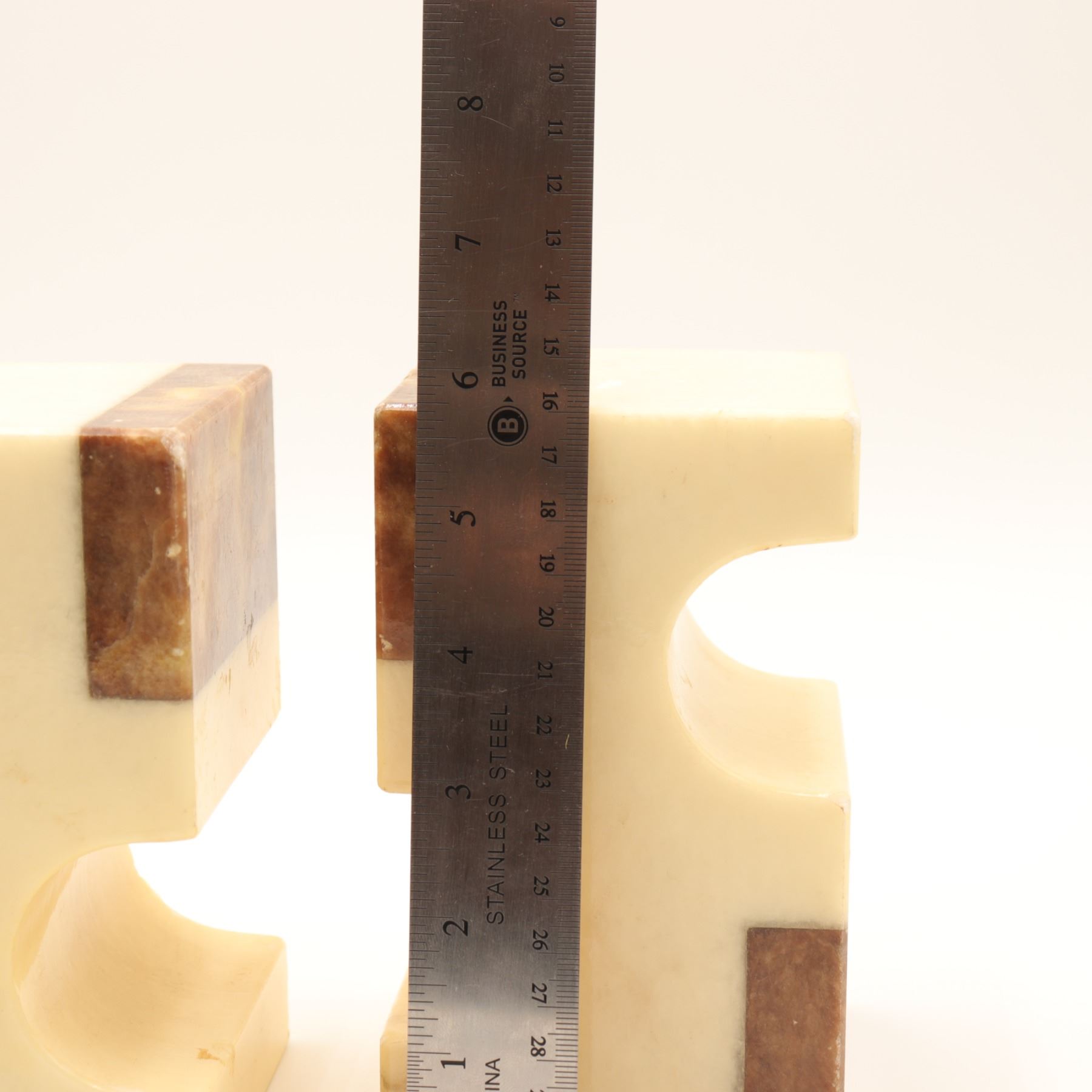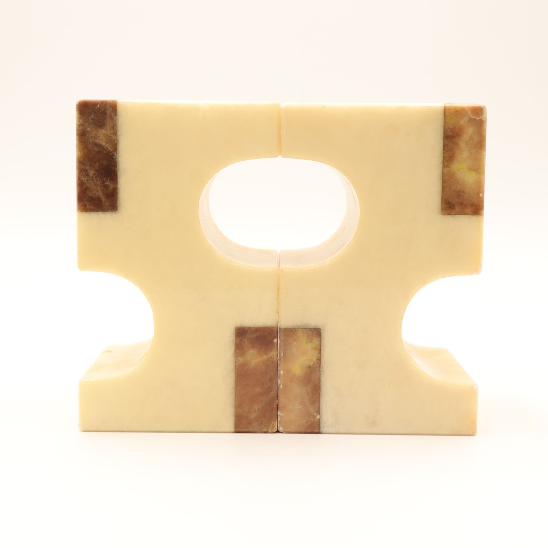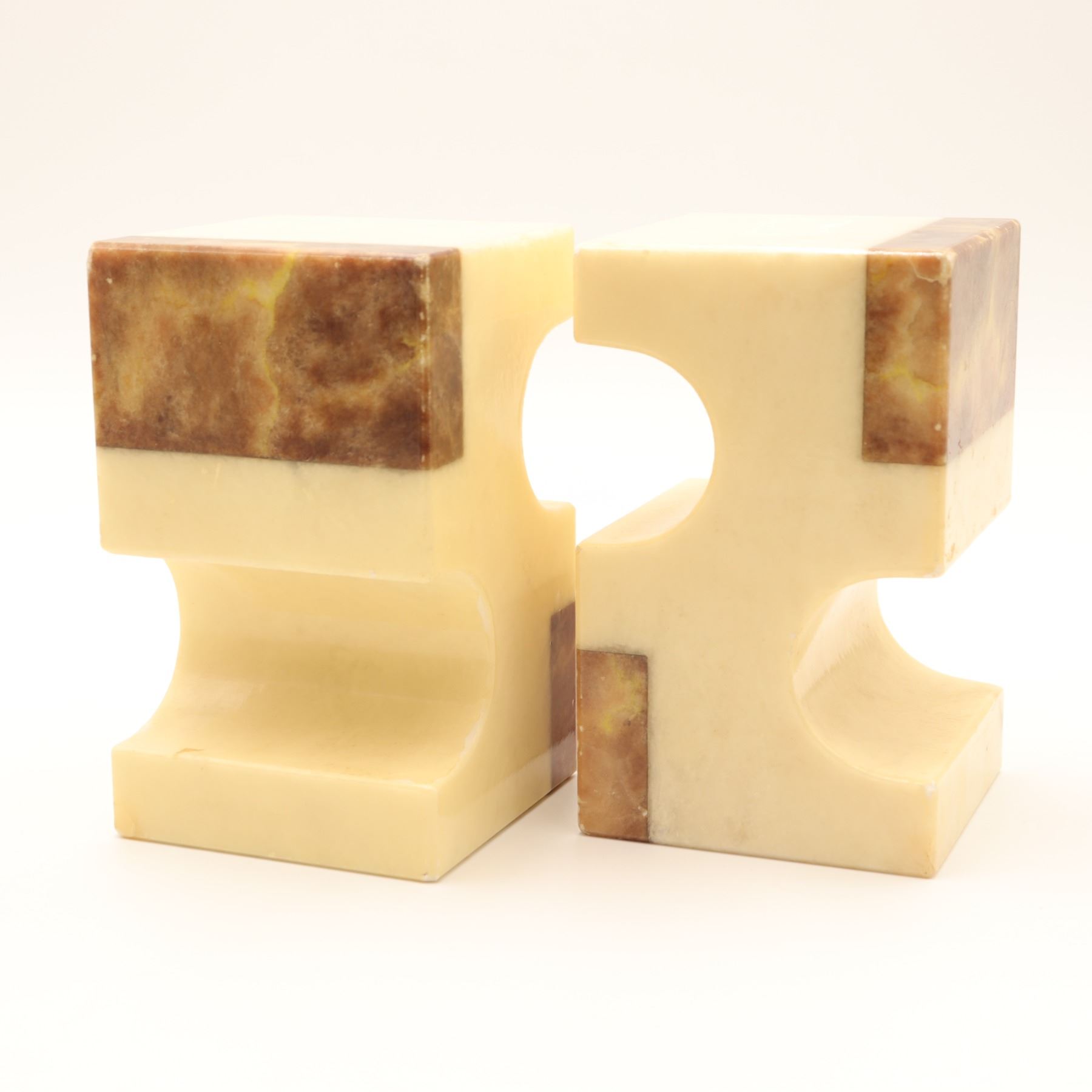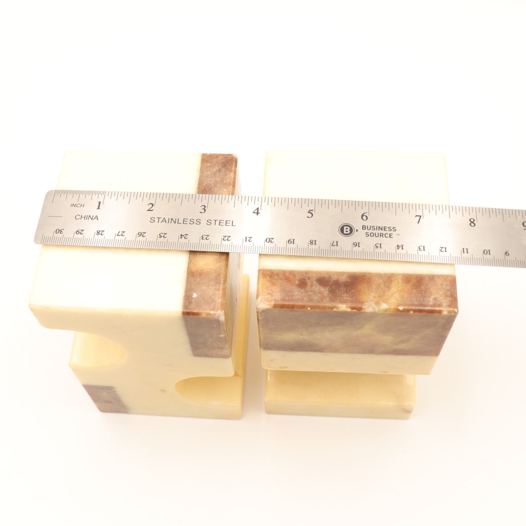 Pair of modern stone bookends, probably marble or onyx, each of squared profile with opposing cut-out curves, the cream-coloured stone inset with contrasting brown stone panels at top and bottom. Approx. 6 3/4 in. high. General light surface wear, small edge nicks and natural veining; overall good decorative condition.