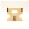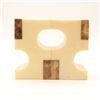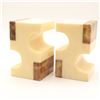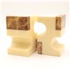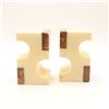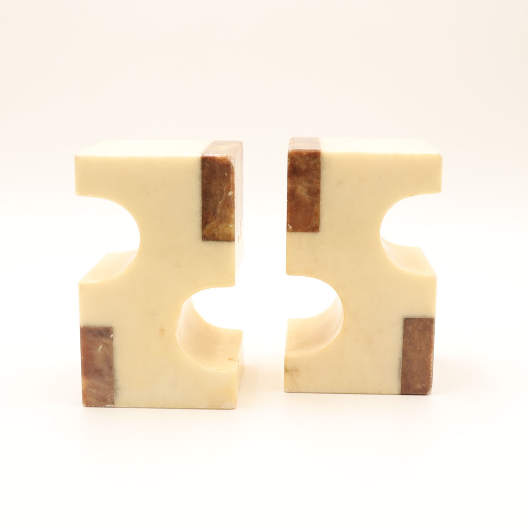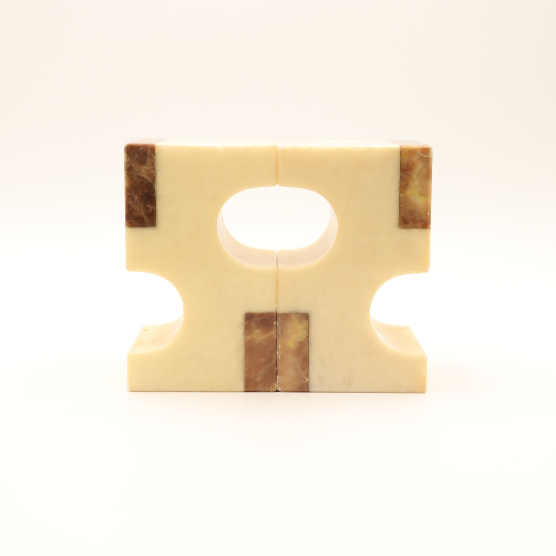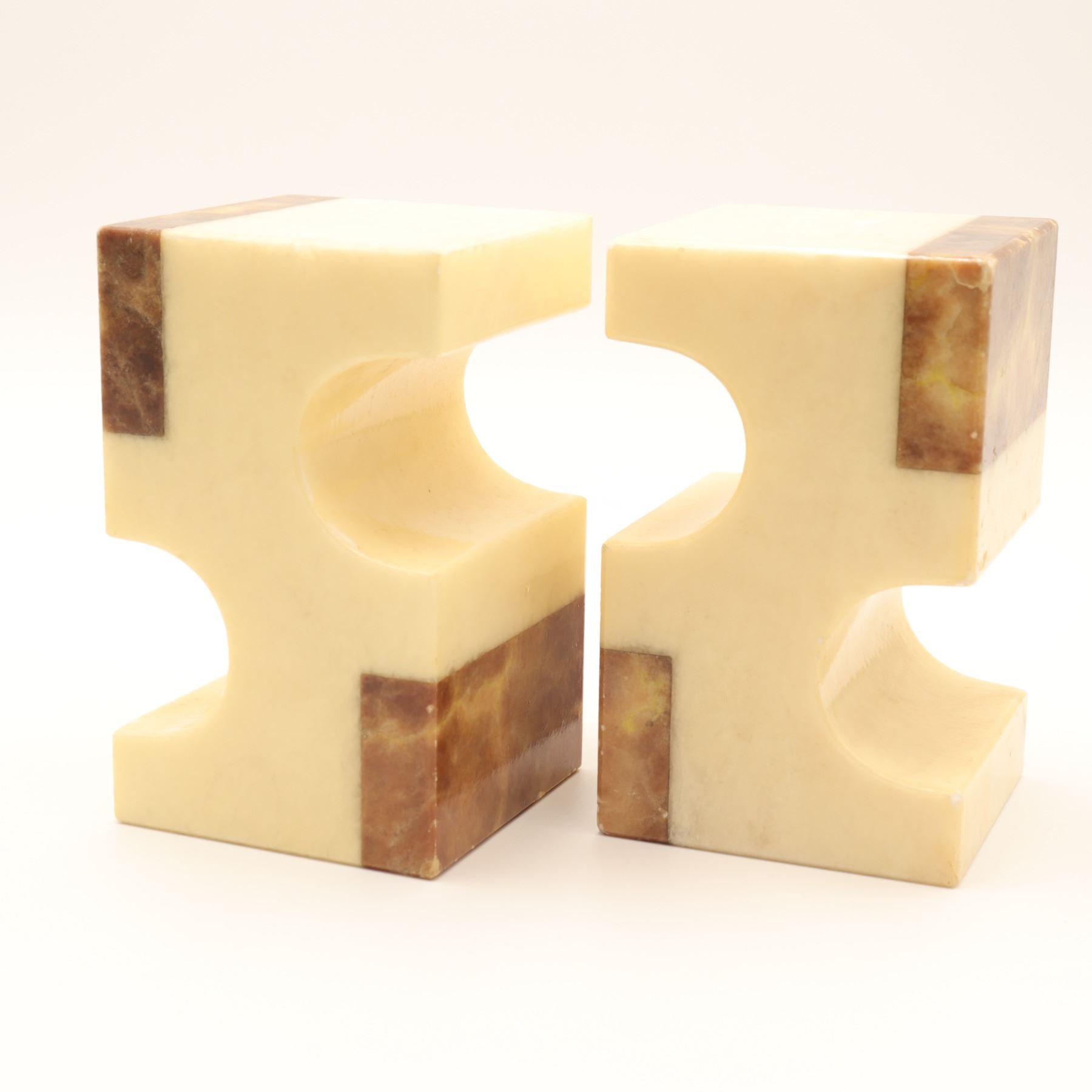 Pair of modern stone bookends, probably marble or onyx, each of squared profile with opposing cut-out curves, the cream-coloured stone inset with contrasting brown stone panels at top and bottom. Approx. 6 3/4 in. high. General light surface wear, small edge nicks and natural veining; overall good decorative condition.