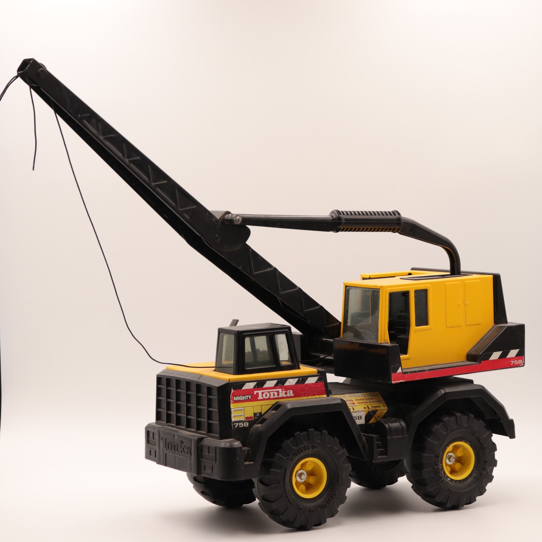 Tonka Mighty Crane (No. 758) – articulated boom crane with extendable arm and rotating cab, black/yellow with red stripe detailing. Tonka Turbo-Diesel Loader – front loader with liftable bucket and heavy-duty tires, yellow cab with red “Turbo Diesel” decal.