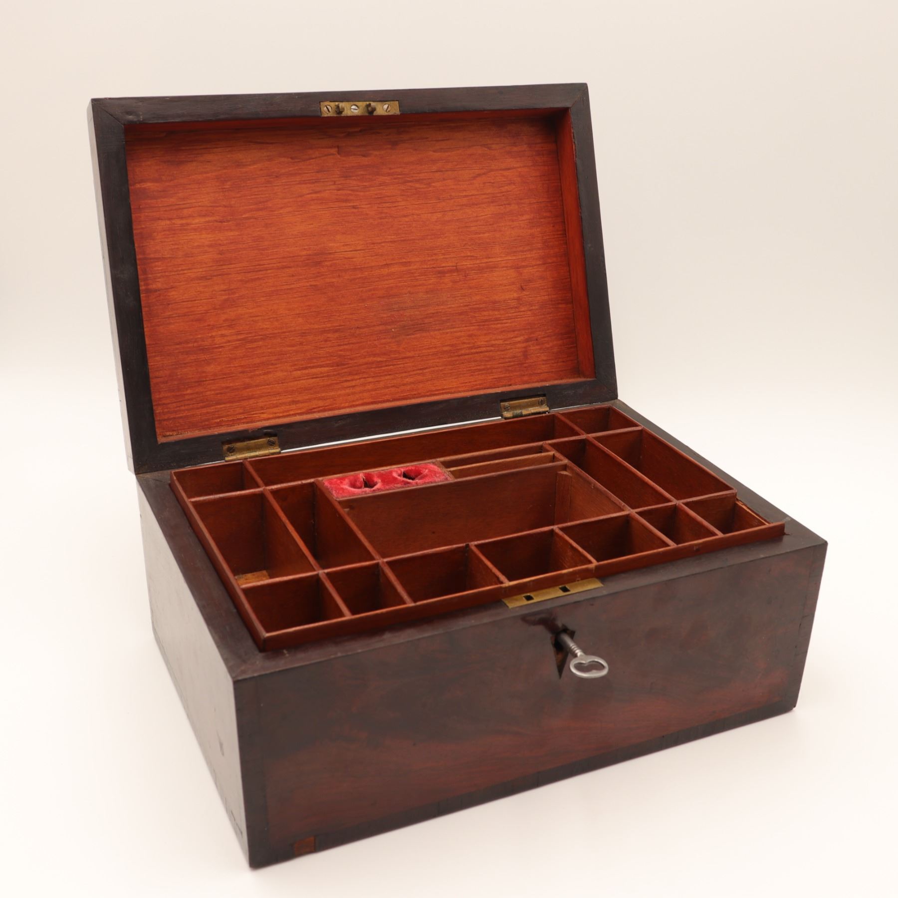 Pair of wooden storage boxes, comprising: a late 19th–early 20th century mahogany document or jewellery box, the rectangular case with plain exterior and hinged lid opening to a fitted interior tray divided into numerous small compartments with a central well and a narrow red-velvet lined section, brass hinges and lock, together with a steel key; and a smaller mid-20th century plain hardwood rectangular box with dovetail corners and hinged lid, likely for stationery or general storage. Larger box approx. 15 1/4 in. wide; smaller box approx. 13 in. wide. Both with surface scratches, minor bruises and general wear consistent with age and use; the larger box with small veneer losses and repairs to lid corners, interior velvet worn, but overall presentable and usable.