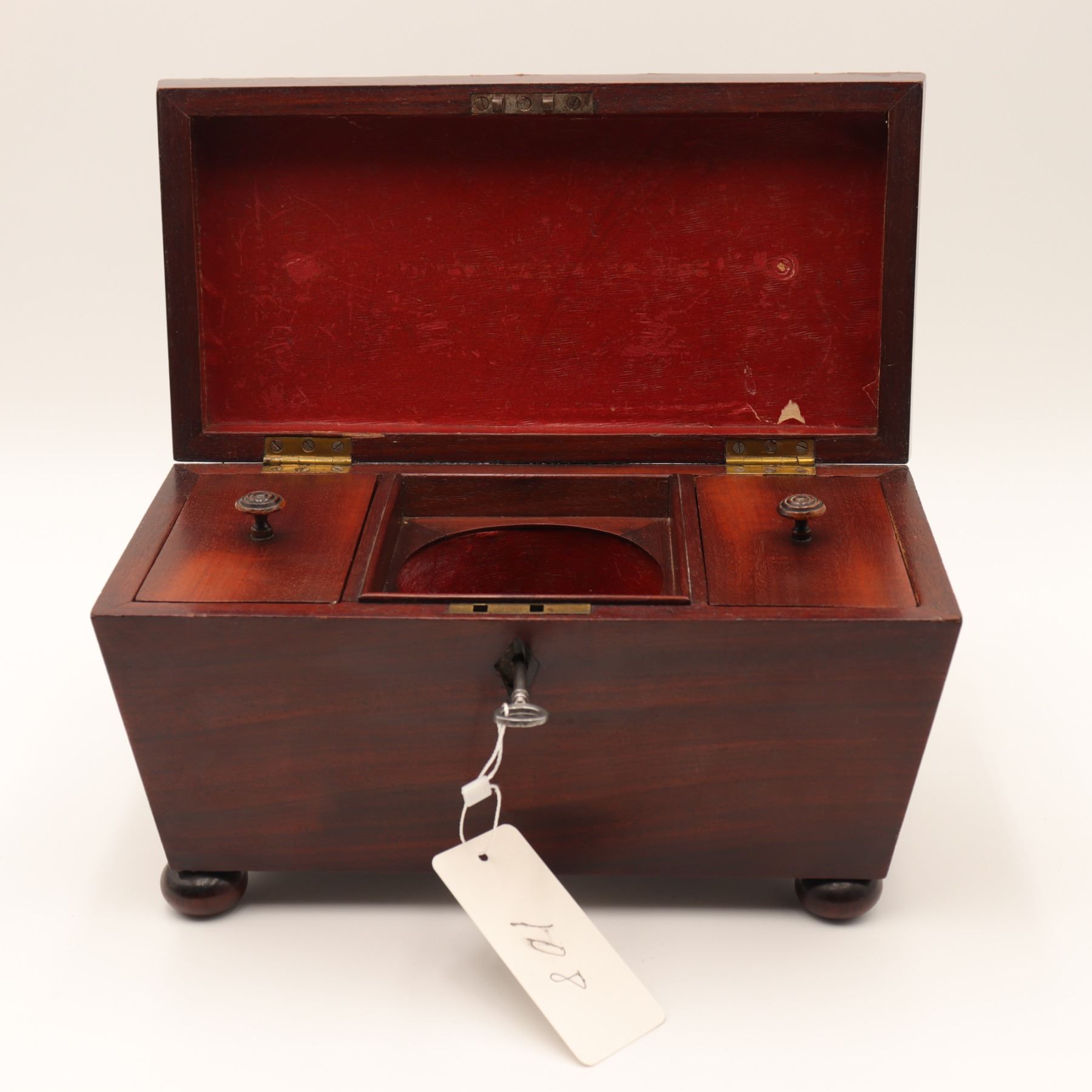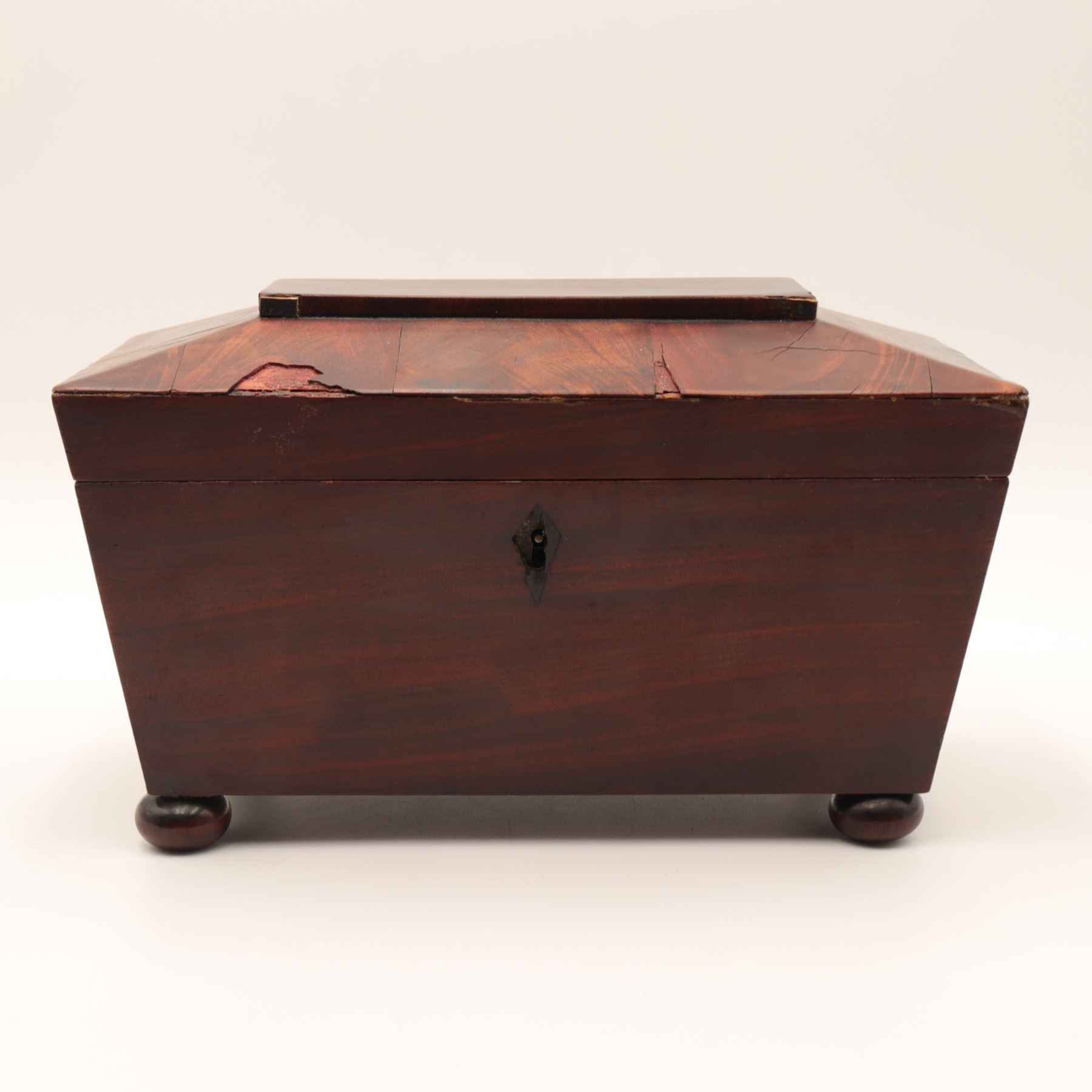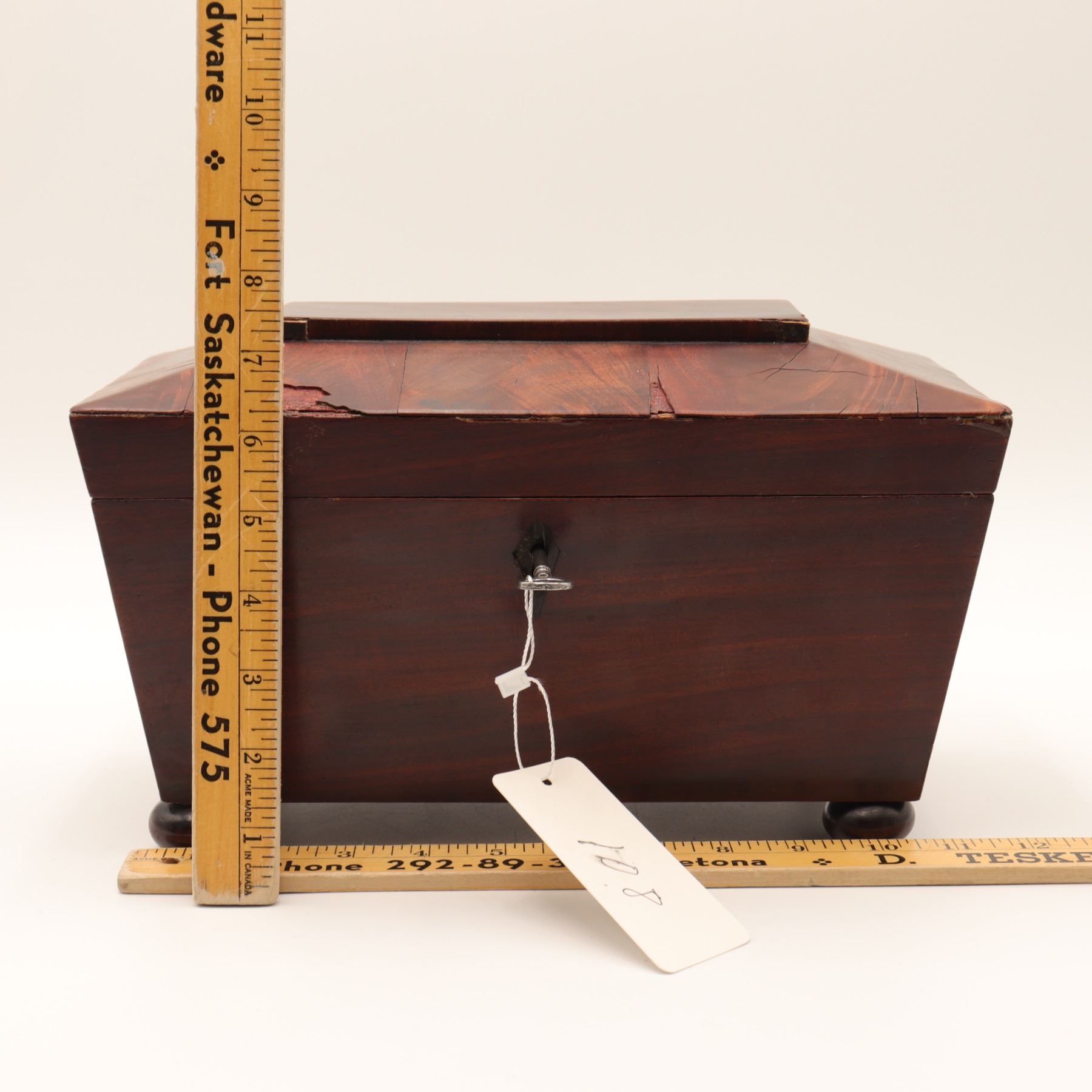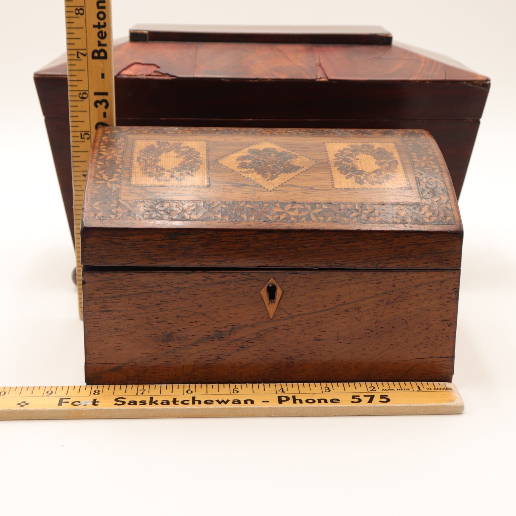 Pair of Wooden Boxes, Including Mahogany Tea Caddy and Inlaid Domed Box