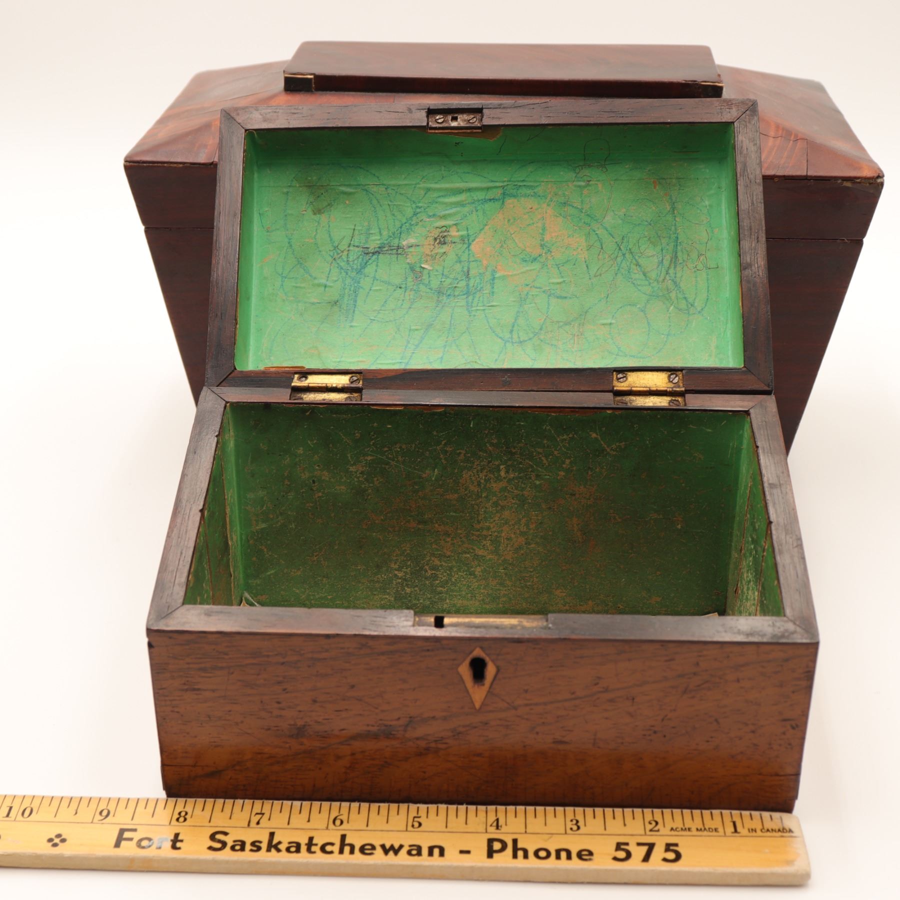 Pair of wooden boxes, comprising a larger mahogany veneered tea caddy or storage box with shaped domed lid and bun feet, the interior with twin covered compartments flanking a central circular well, and a smaller inlaid wooden box with domed lid, likely late 19th–early 20th century, the latter with geometric parquetry panels and green painted interior. Both with age-appropriate wear including scratches, small losses and interior marks; the larger with veneer losses and lifting to the lid, the smaller with interior scuffing and an absent key.