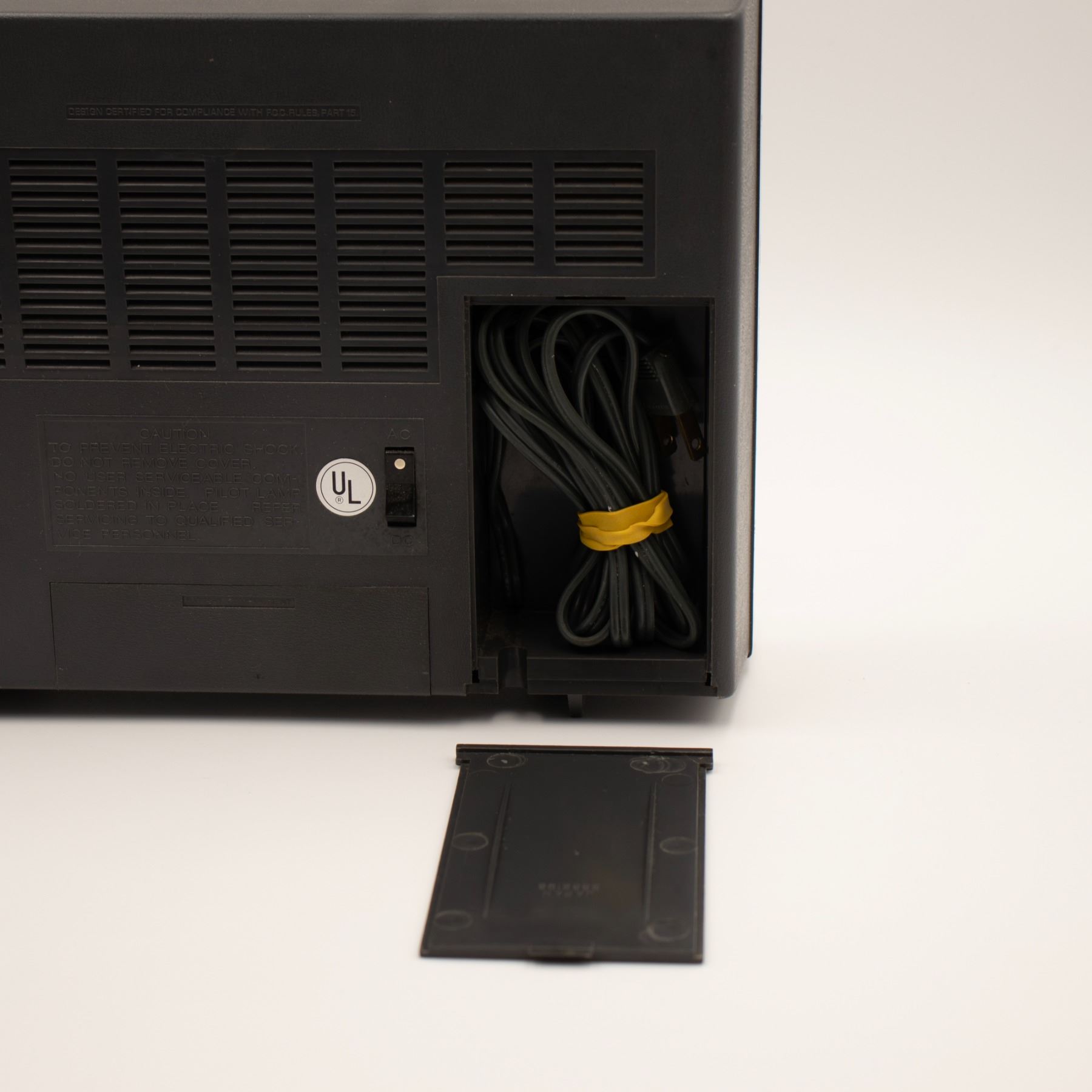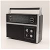 Vintage radio. Working at the time of cataloging. Powered by batteries and has a cord. Extendable antenna