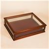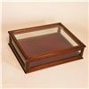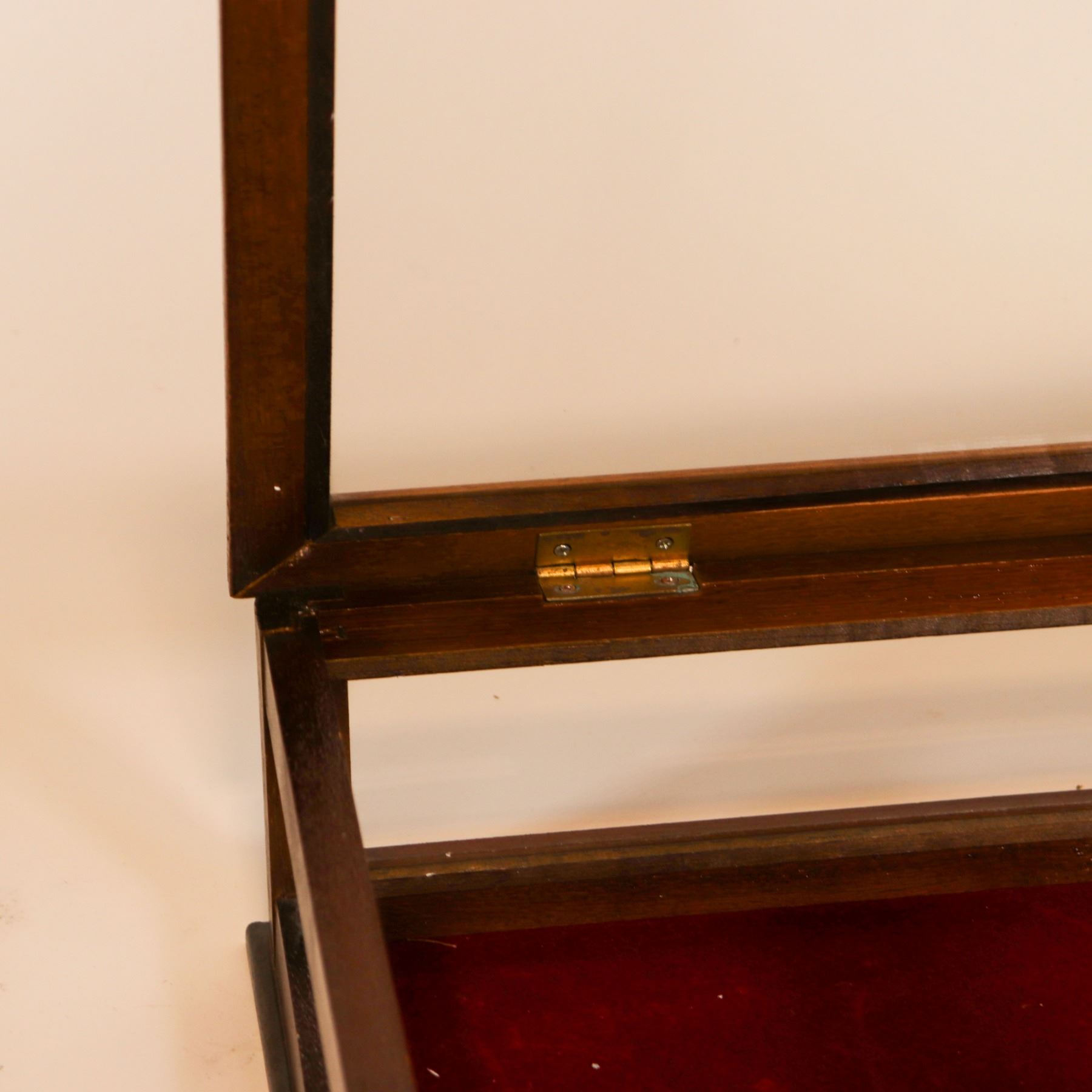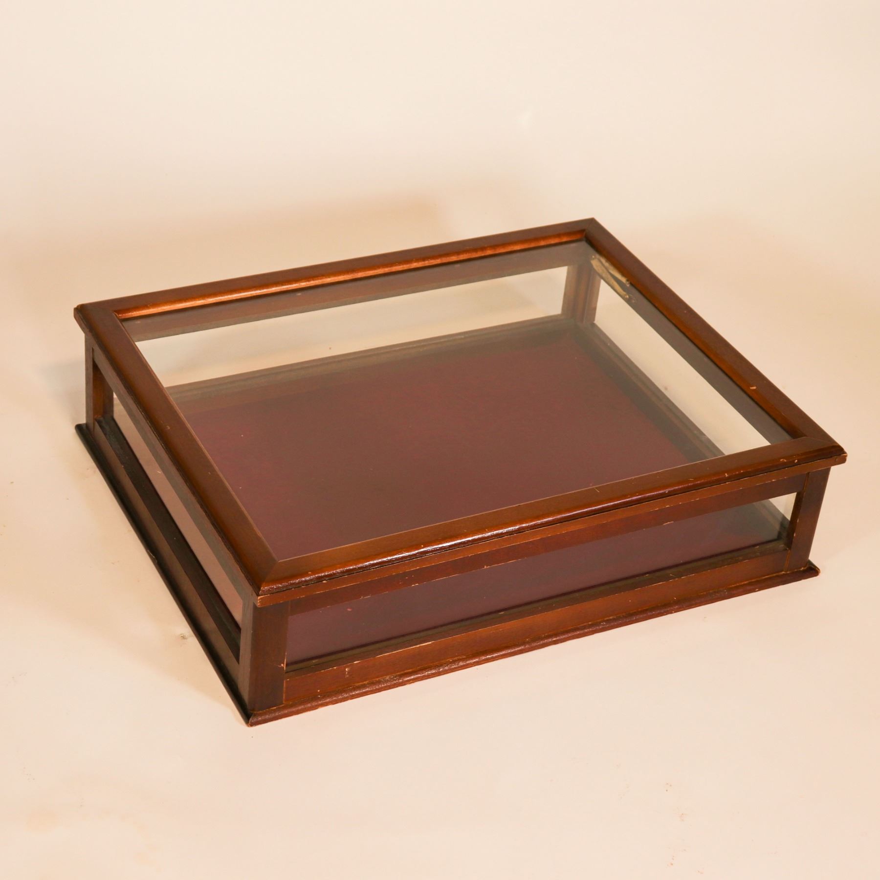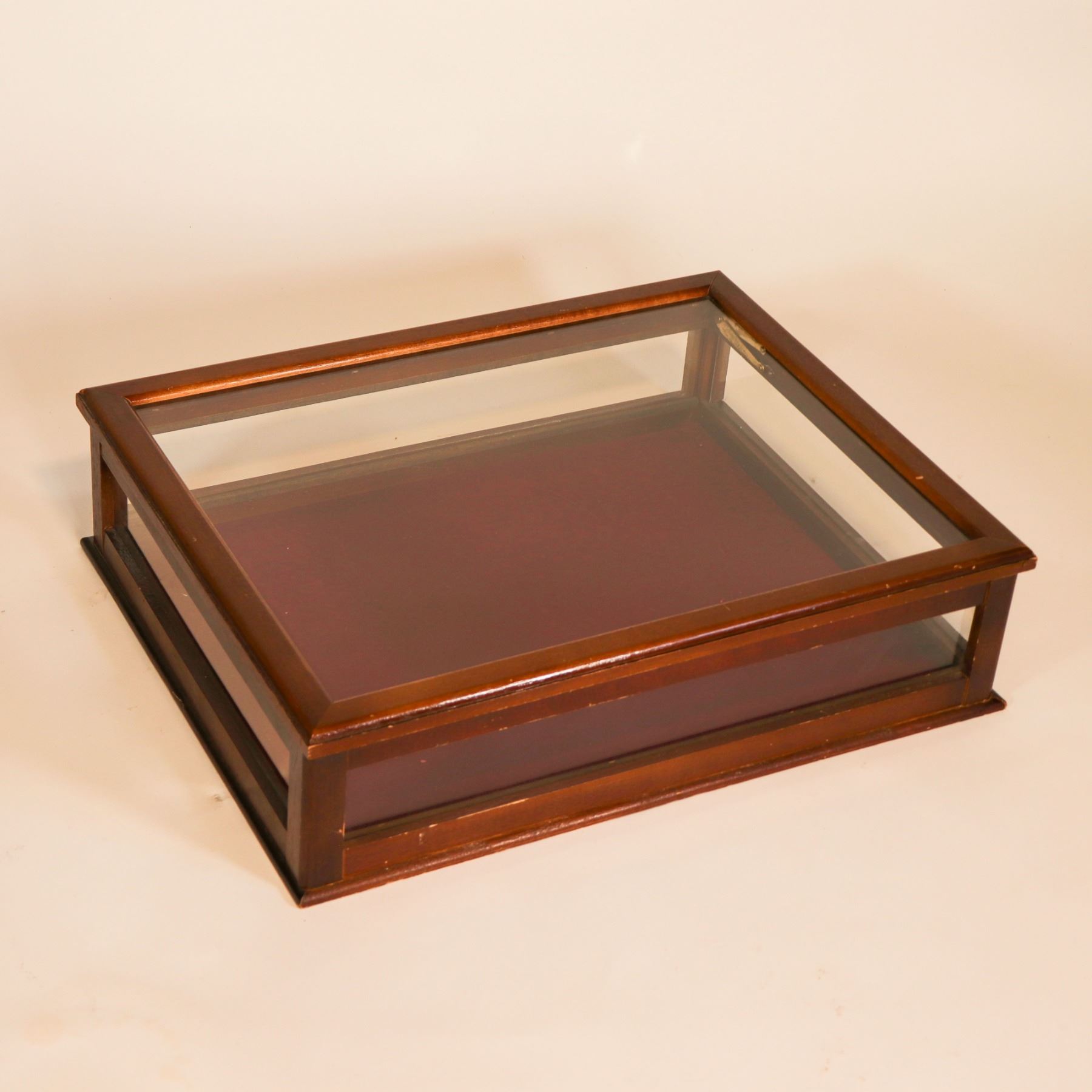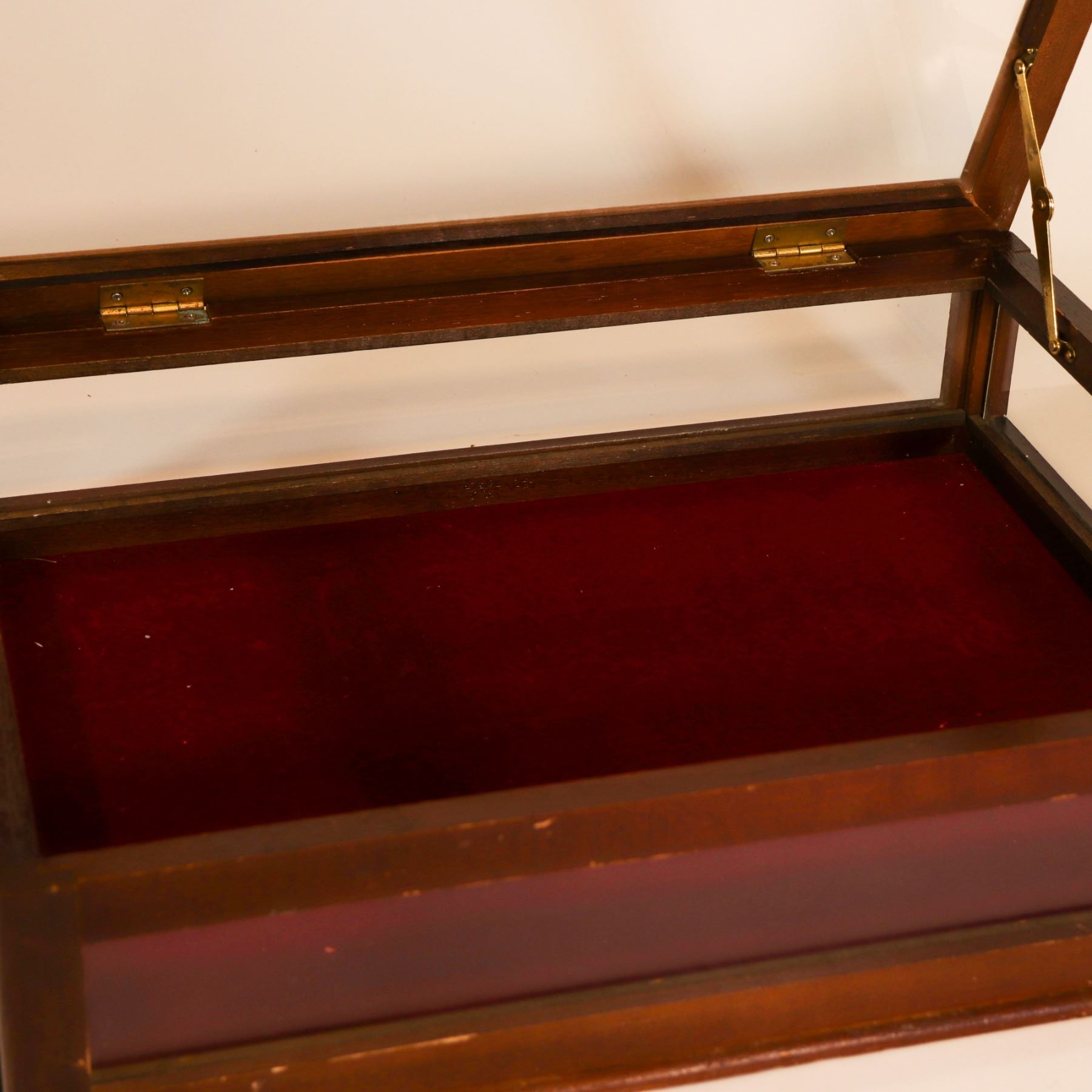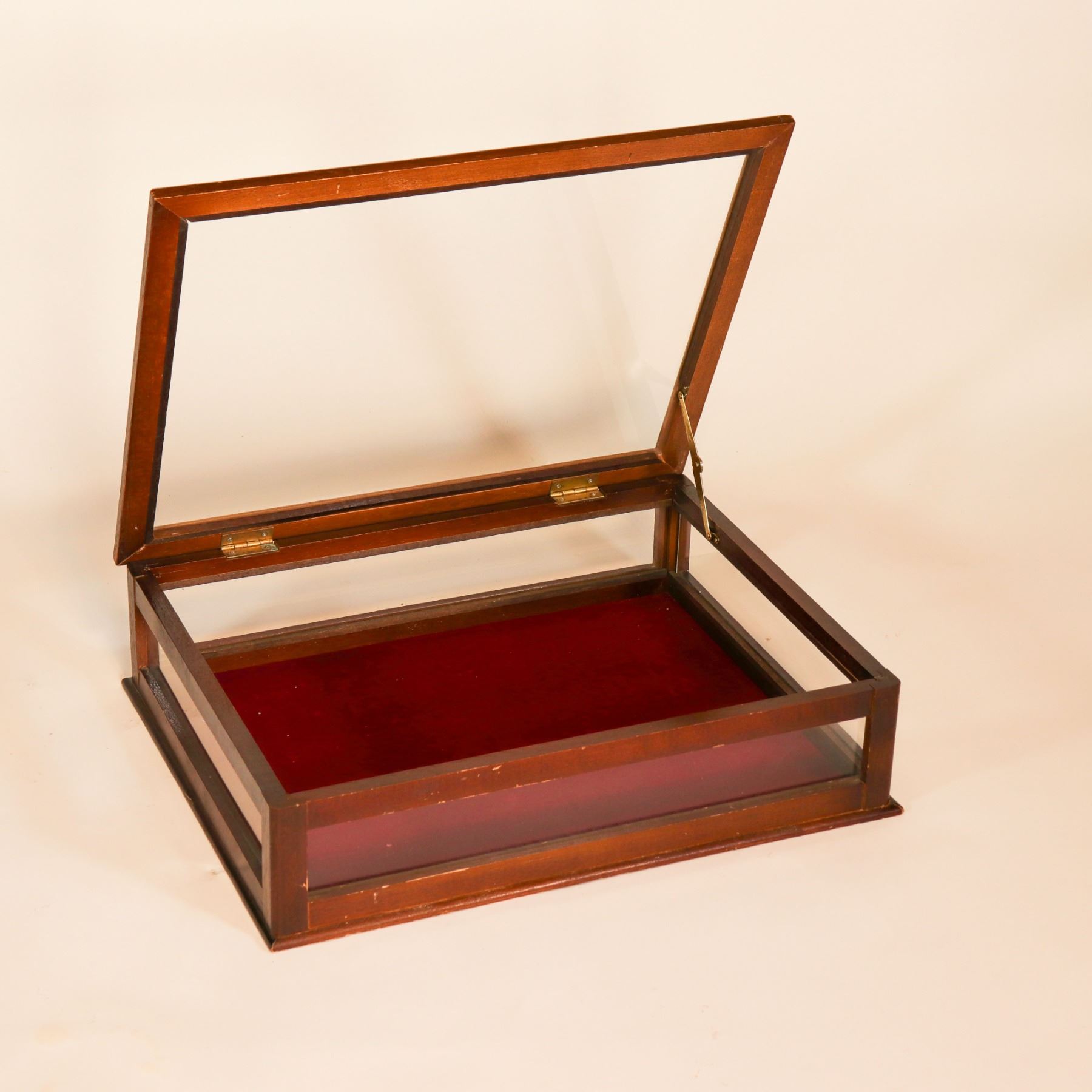 Rectangular tabletop display case, late 20th century, the low wooden frame finished in a medium brown stain and fitted with glass panels to the top and all four sides, the hinged glazed lid opening on brass hinges and stay to a single compartment lined in red fabric / felt, ideal for medals, collectibles or jewelry display. Approx. 23 in. wide, 18 in. deep, 4 in. high.