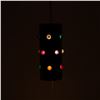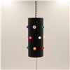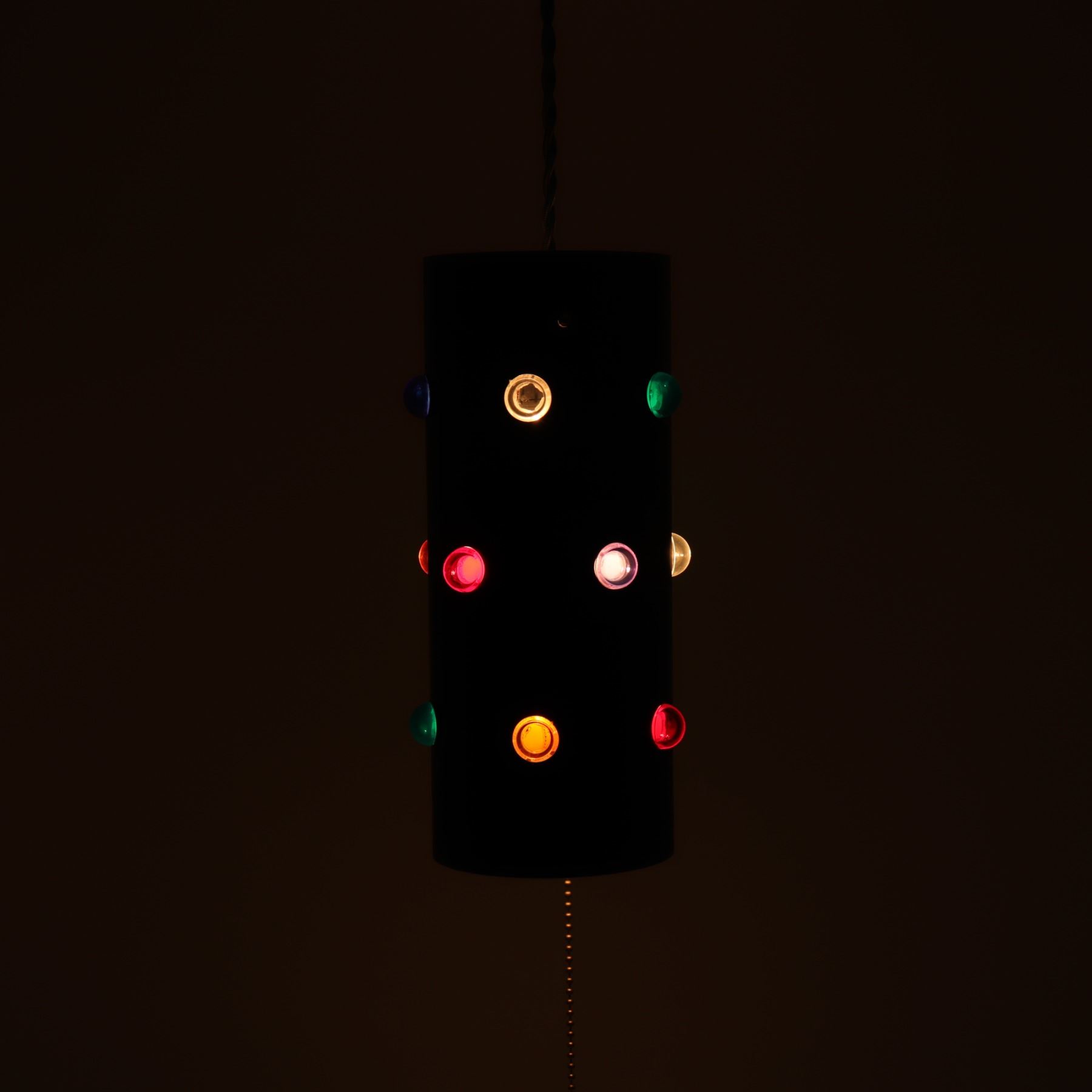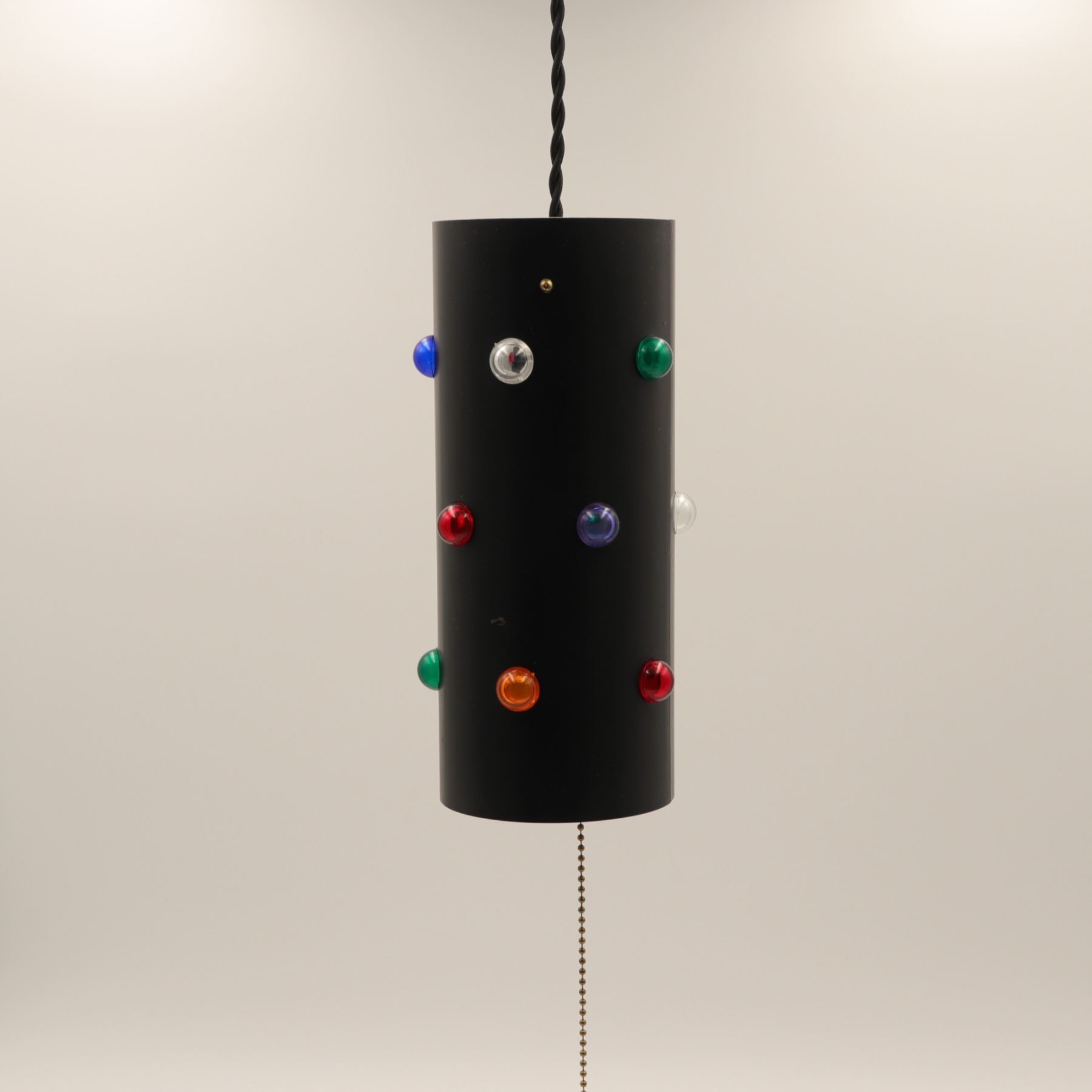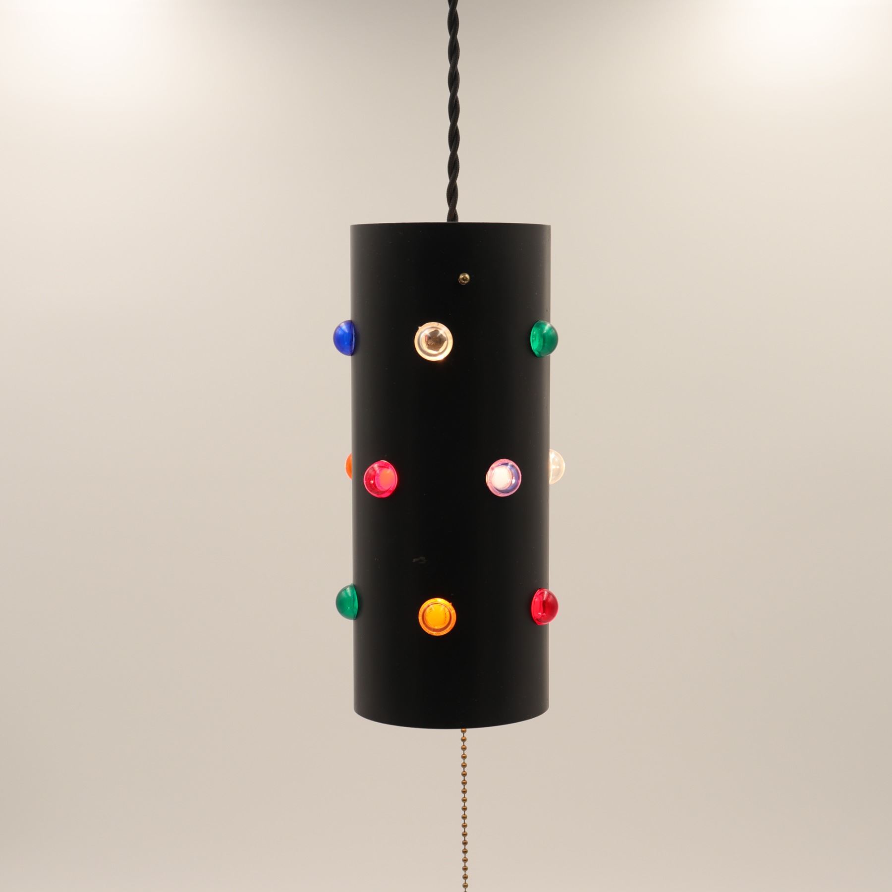 Mid-century modern pull-down pendant lamp with cylindrical black shade accented by multicolored inset glass cabochons. Recently rewired and restored, fitted with pull-chain control. A striking retro statement light.