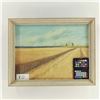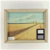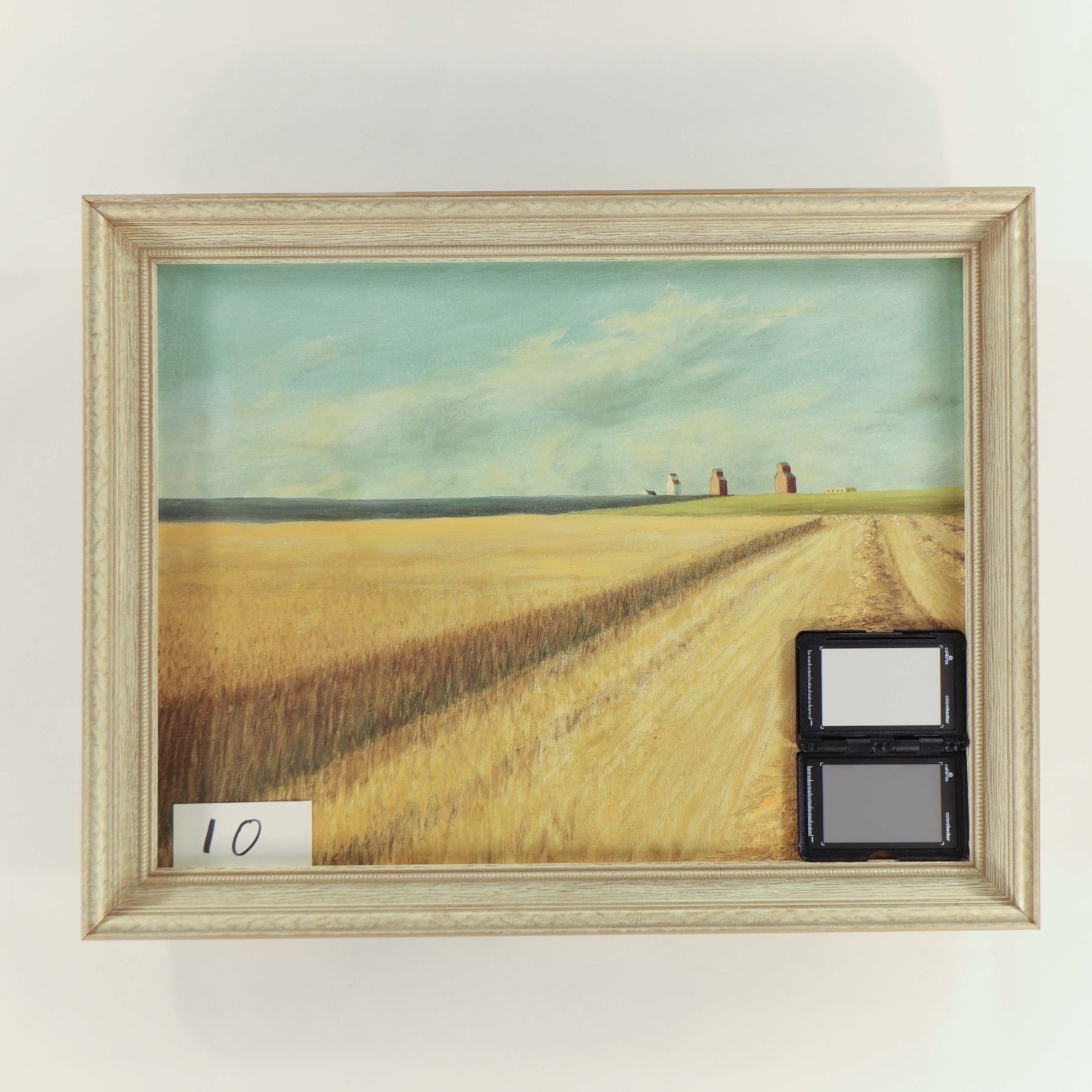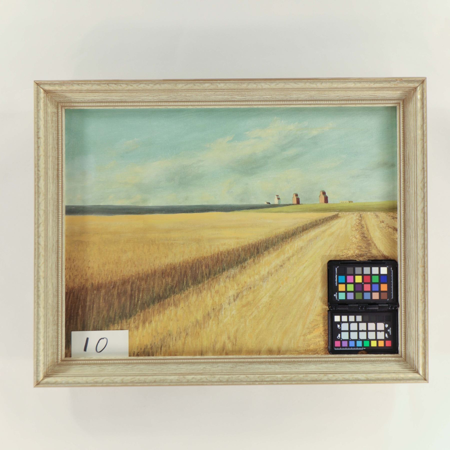Medium: oil on canvas; signed ‘Reuben’ (reverse note: 76 Cardiff Drive NW); framed 69 × 54 cm; image 49 × 60 cm. Subject: wheat field and three prairie grain elevators under wide sky. Context: Canadian prairie school aesthetic; Alberta/Saskatchewan artist mid‑late 20th c.