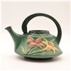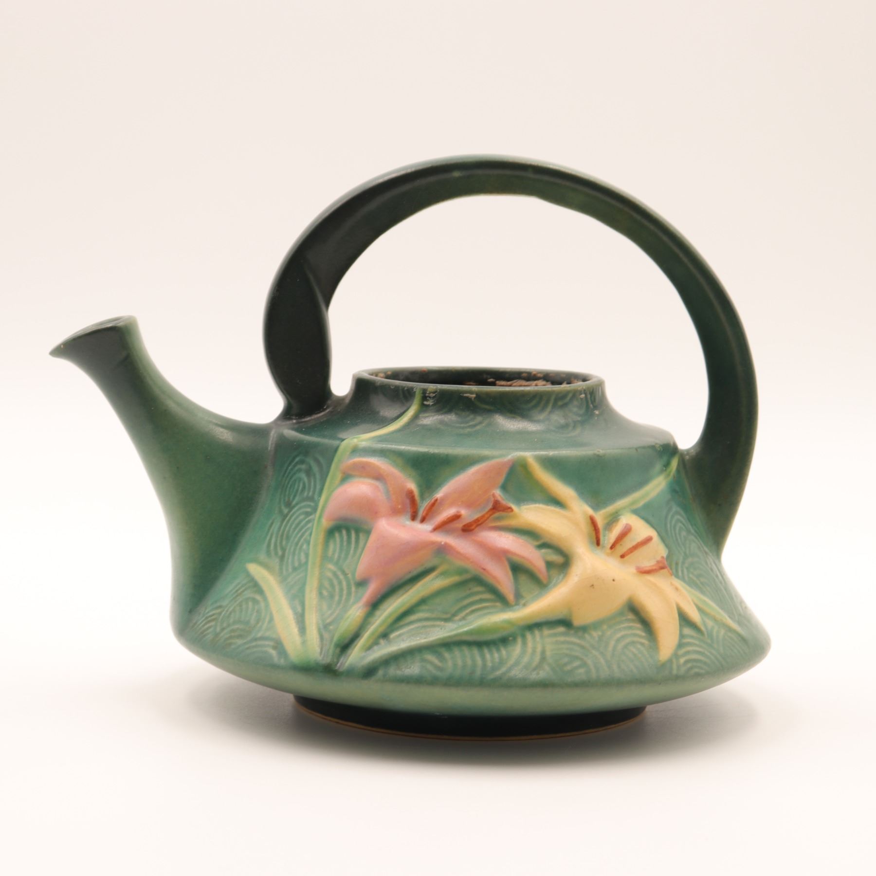 American art pottery watering can by Roseville, in the “Zephyr Lily” pattern, moulded with pink and yellow lilies and leaves on a green ground, the circular strap handle rising over a flaring body with short spout. Base impressed 7T. A classic mid-century Roseville form.