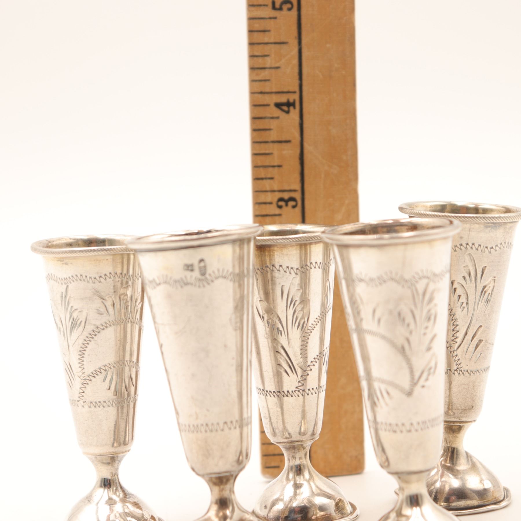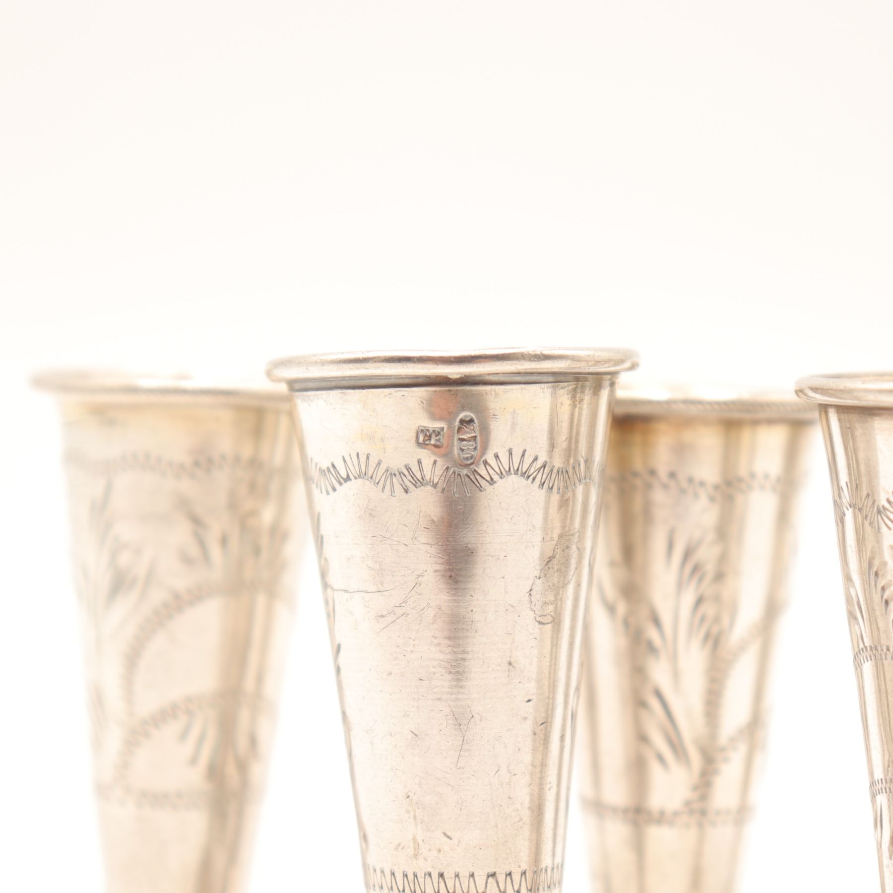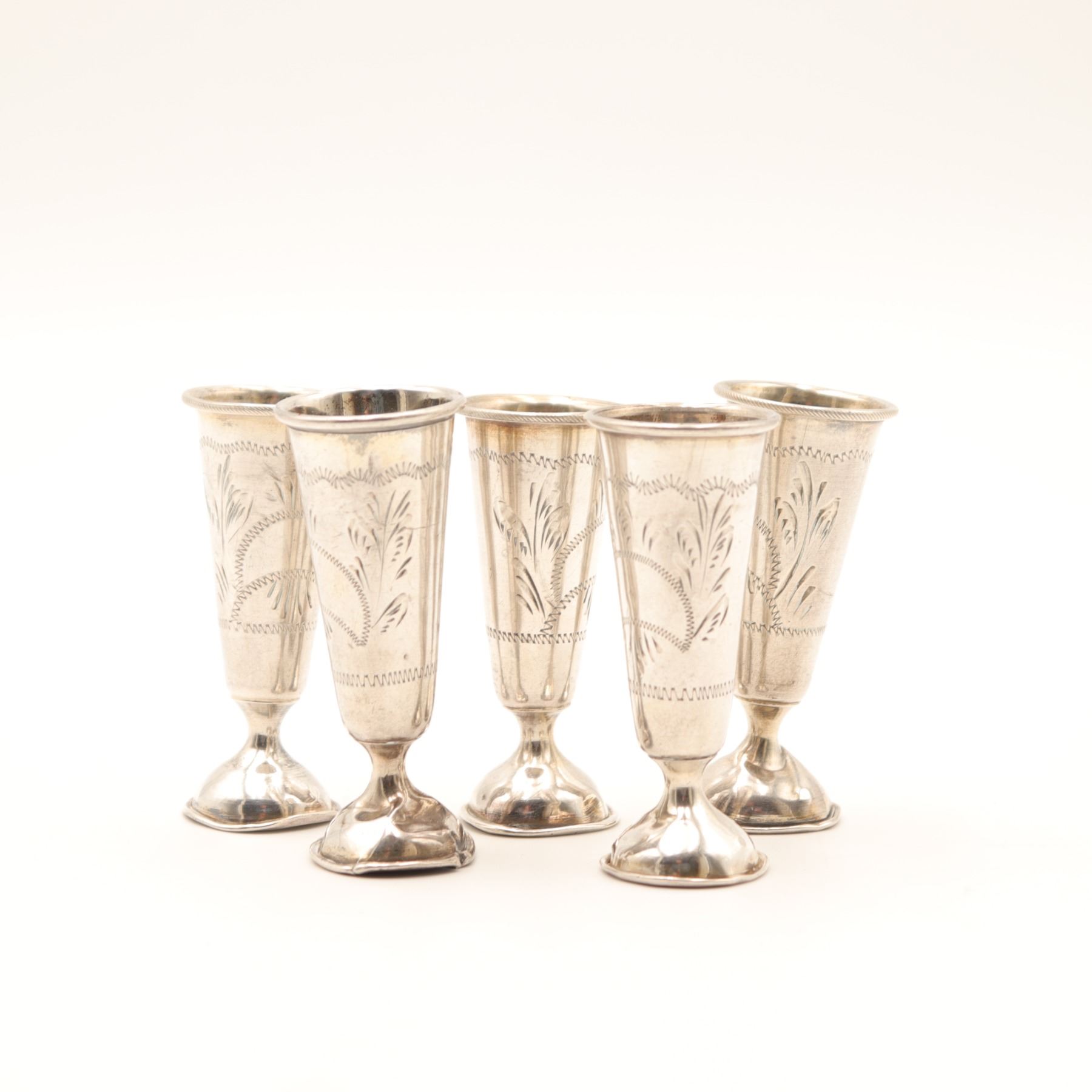 Set of five Russian 84 silver miniature cups, late 19th–early 20th century, each of tall tapering form on a small domed foot, the bodies finely engraved with stylized foliate sprays within zig-zag and beaded borders, plain everted rims, interiors richly fire-gilt. Each bearing Russian “84” silver standard mark and additional town/assayer marks (illegible), .875 fineness. Of a type used for liqueur or small Kiddush cups. Total weight approx. 107.27 g.