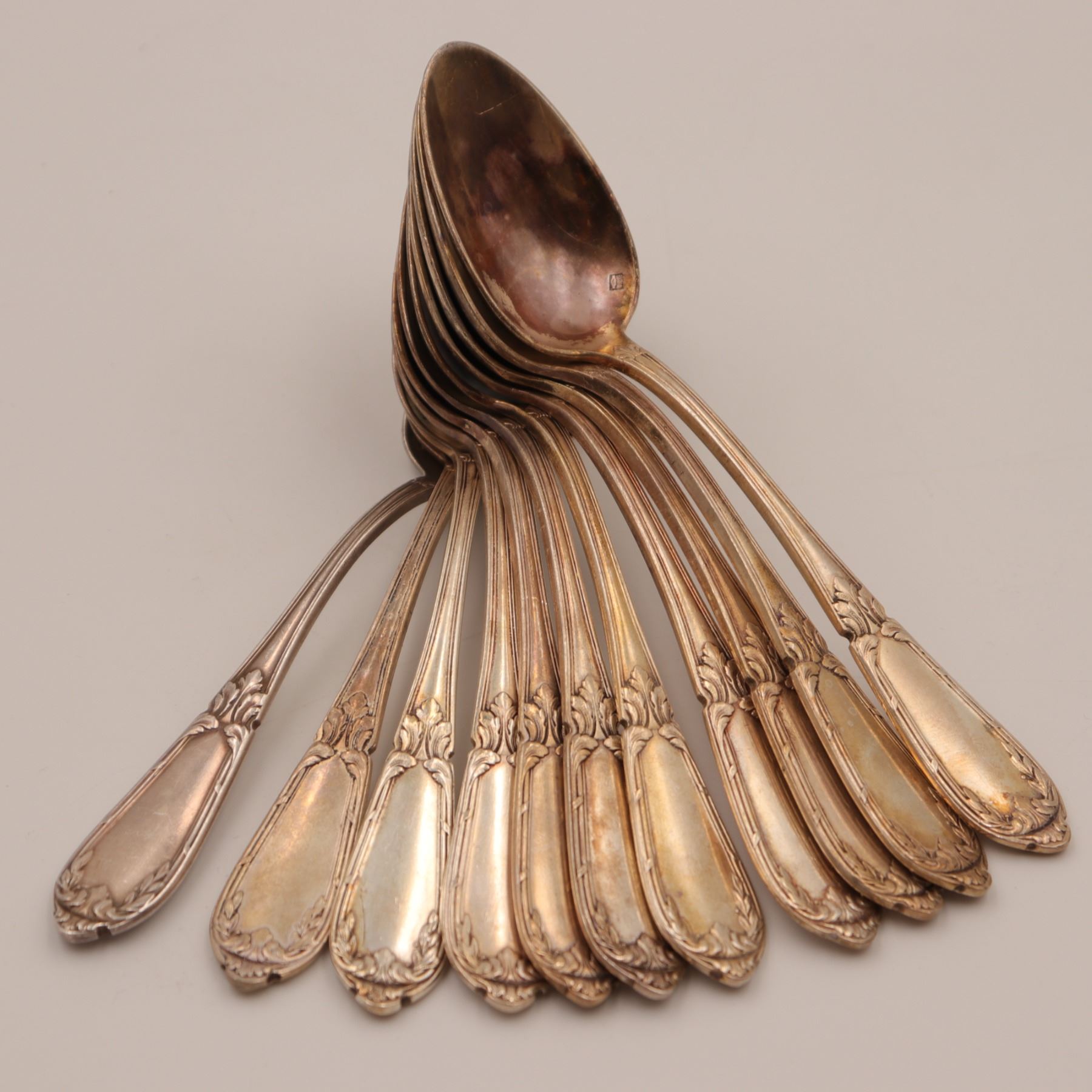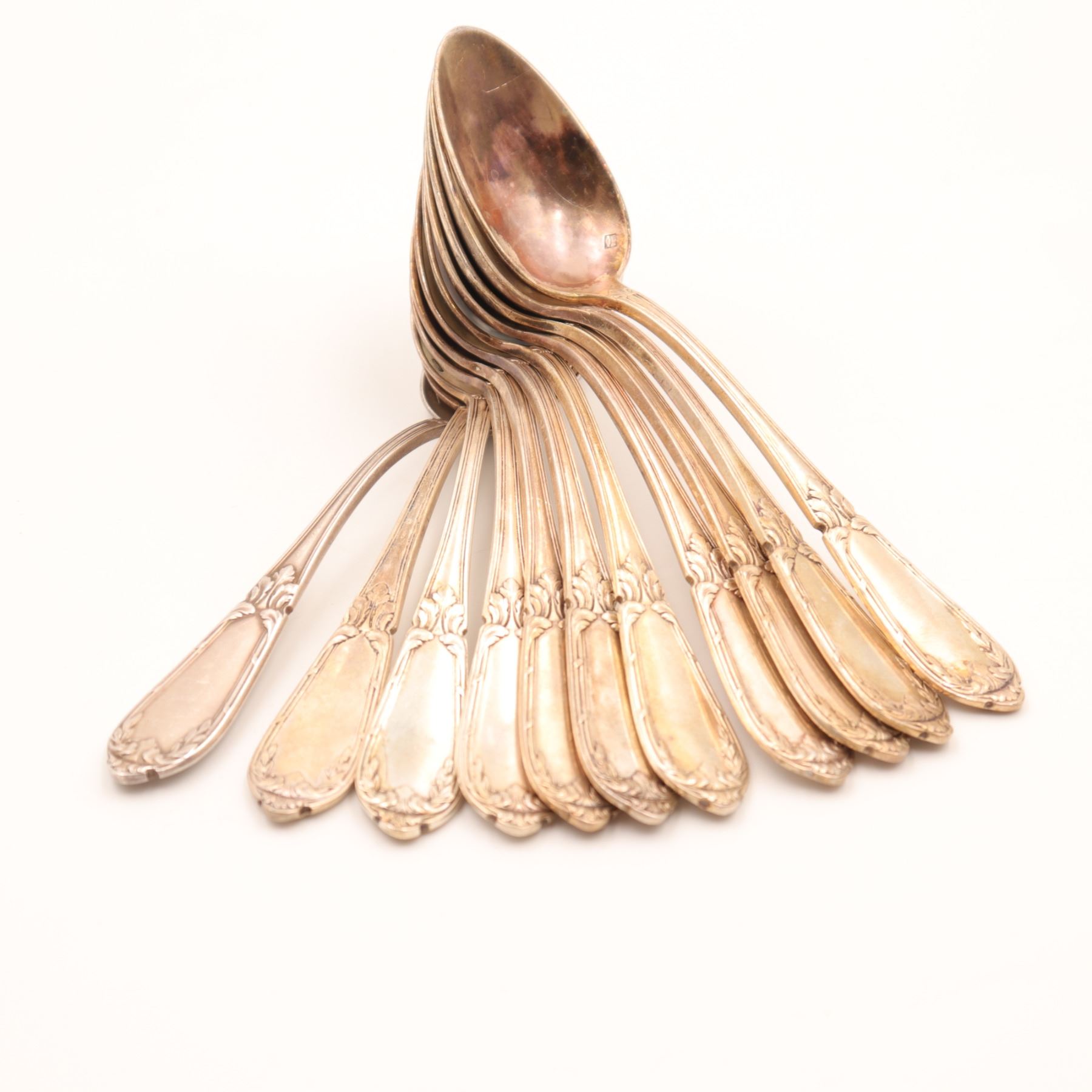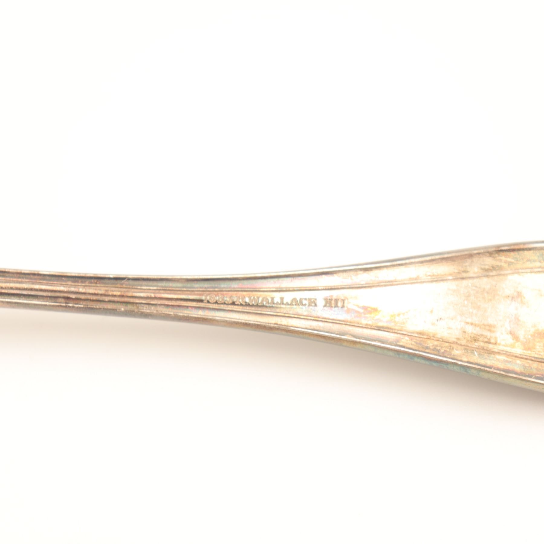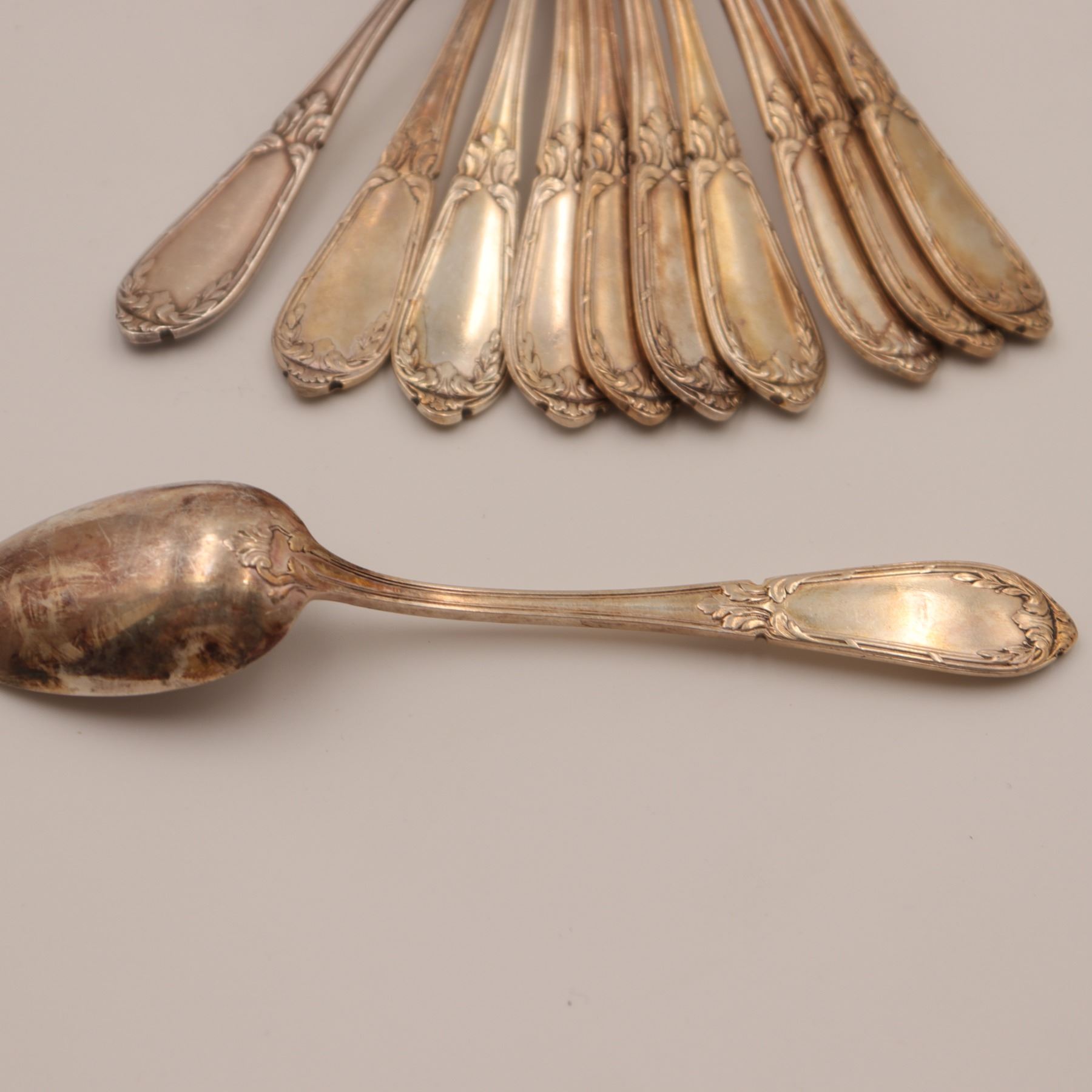 A fine combined flatware service consisting of: 12 Silver-Plated Forks by R.W. Wallace – American, patented 1898, in a late Victorian pattern. Each piece bears the Wallace hallmark, representing quality American silverplate craftsmanship. 1 French Silver-Plated Teaspoons – Early 20th century (c.1900–1930), marked “METAL ALLIAGES BLANC” with the handshake hallmark and “12 GR” plating standard. Handles decorated in an Art Nouveau foliate motif with framed cartouche. Together this lot represents an attractive 23-piece service blending American and French silverplate, ideal for entertaining or for collectors of fine antique flatware.