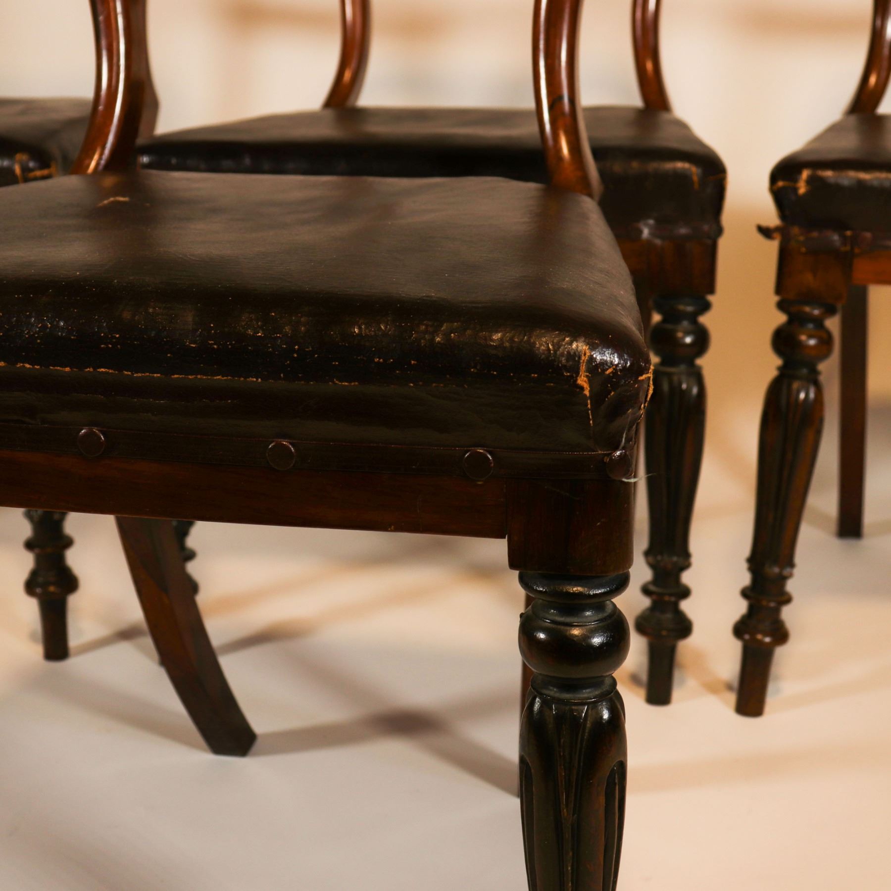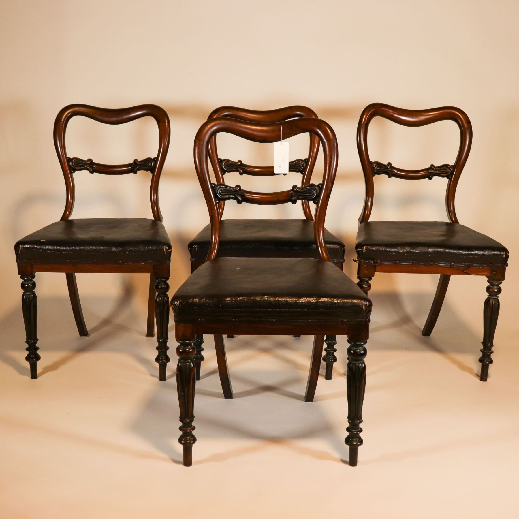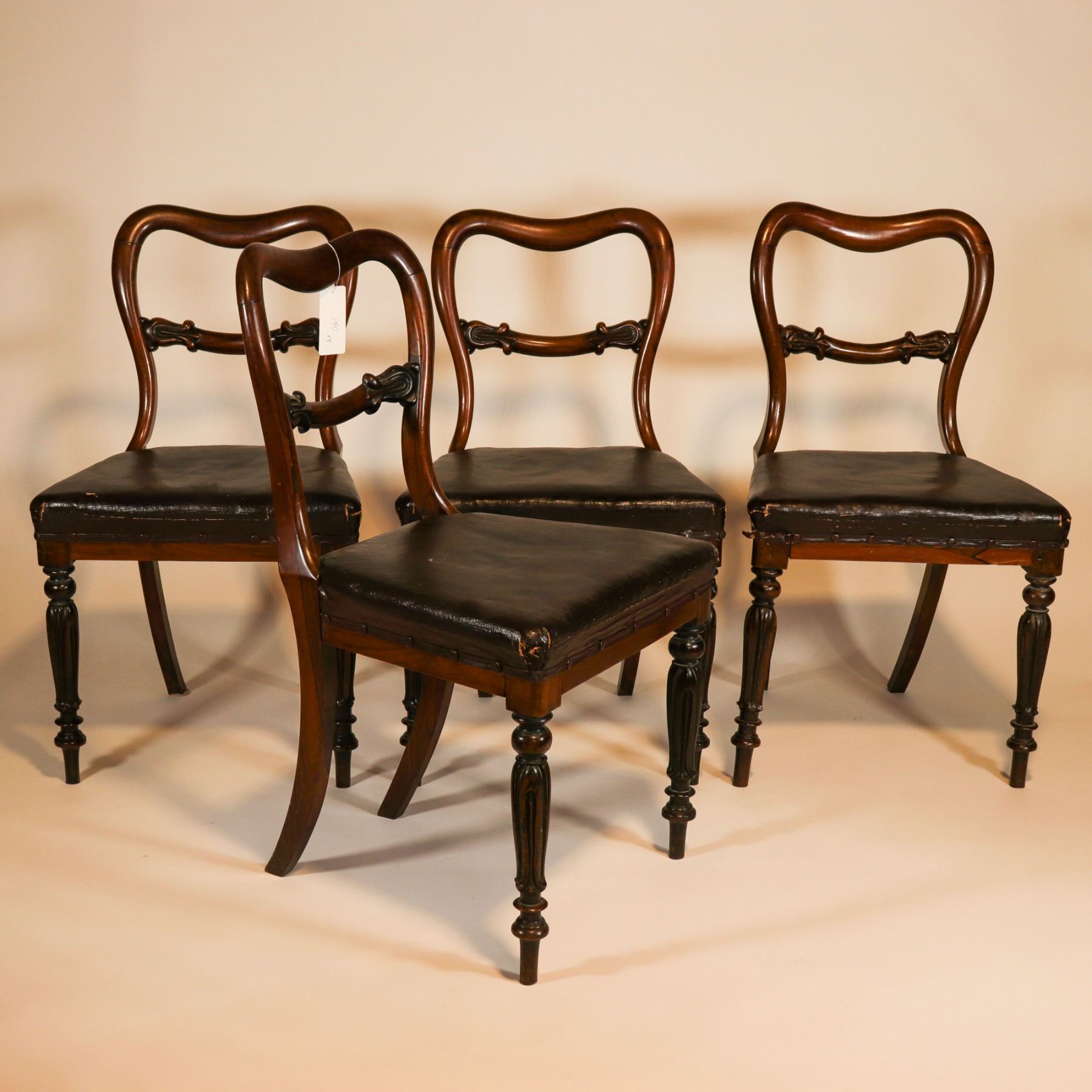 Set of four Victorian balloon-back side chairs, late 19th century, each with a shaped balloon back above a pair of scroll-carved horizontal splats, over a square seat upholstered in dark leather or leathercloth, raised on turned and reeded front legs and splayed rear legs. Warm medium-brown finish with ebonized details to the carved splats and legs. Several joints are loose and some chairs will require regluing and tightening; sold as a restoration group. Approx. 33 in. high, 18–19 in. wide; seat height approx. 17–18 in.